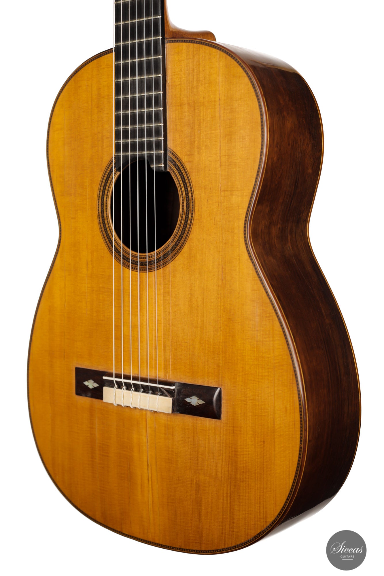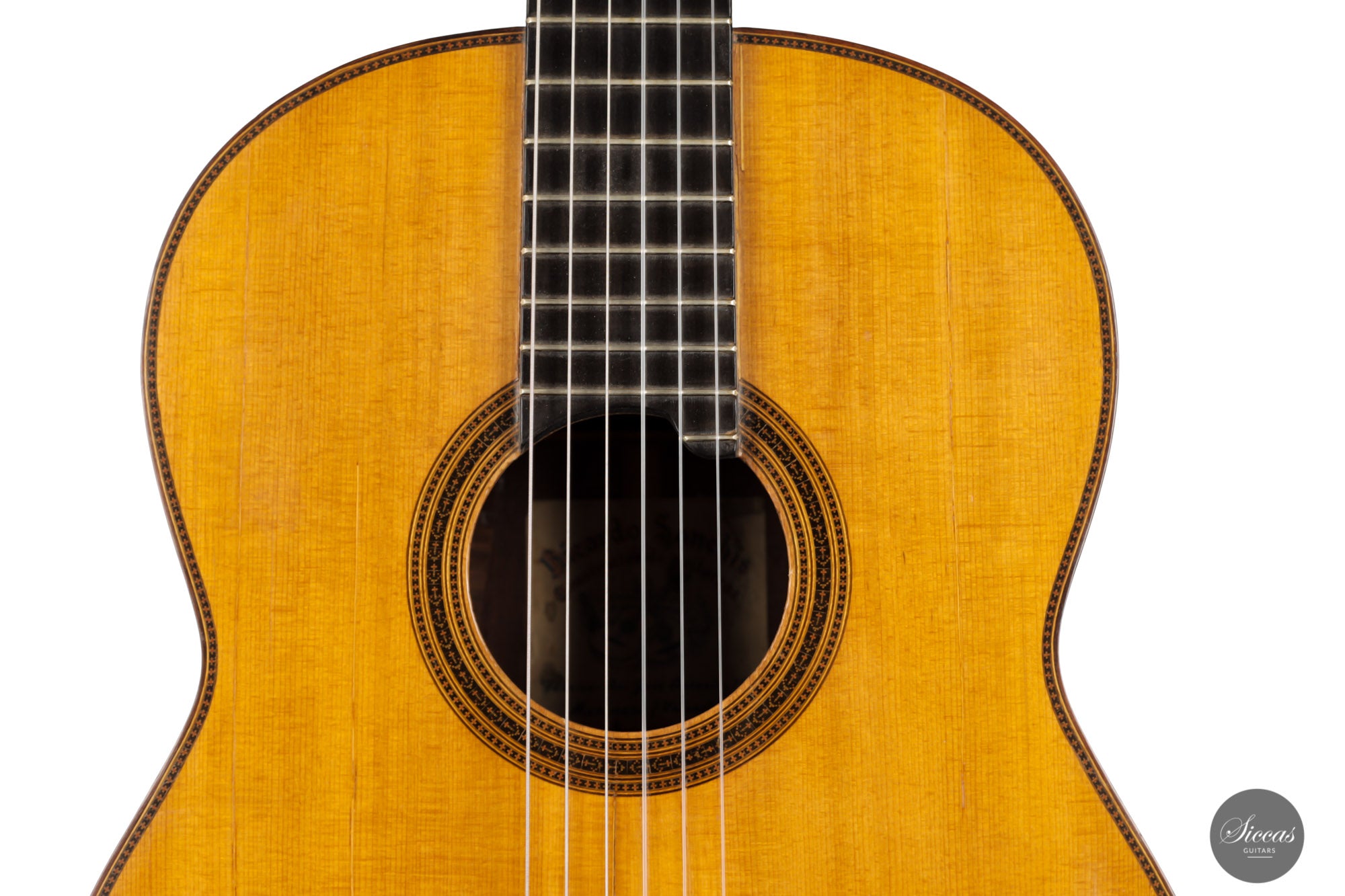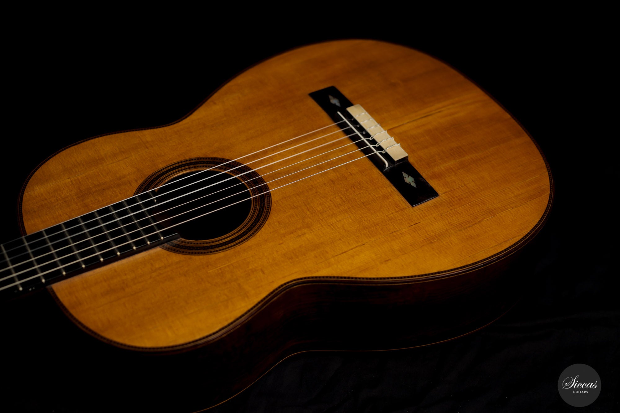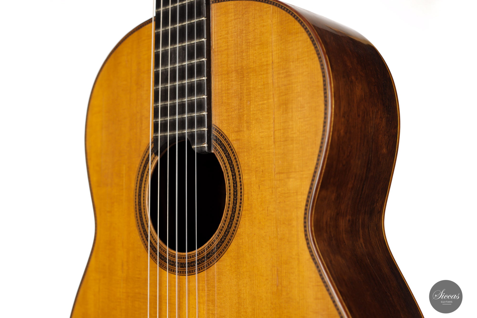 Diese Gitarre wurde von Ricardo Sanchis Nacher (1881-1960) gebaut und ist historisch gesehen hochinteressant, da sie gleichartig ist mit der letzten Gitarre, die Agustin Barrios von Ricardo Sanchis Nacher erwarb. Es ist ein wunderbares Instrument, das durch seine Ausgeglichenheit, einem schönen spanischen Ton, gute Bässe und Volumen charakterisiert ist. Die Gitarre wurde zwischen 1930 und 1940 gebaut. Sie hat eine Fichtendecke und der Boden sowie die Zargen sind aus feinstem Palisander. Der Kopf und der Steg sind mit Perlmutteinlagen verziert und eine reichlich verzierte Rosette ziert das Schallloch. Die Gitarre wurde sehr gut restauriert, sodass sein Ursprünglichkeit erhalten werden konnte. Die Mechaniken sind von Rubner.