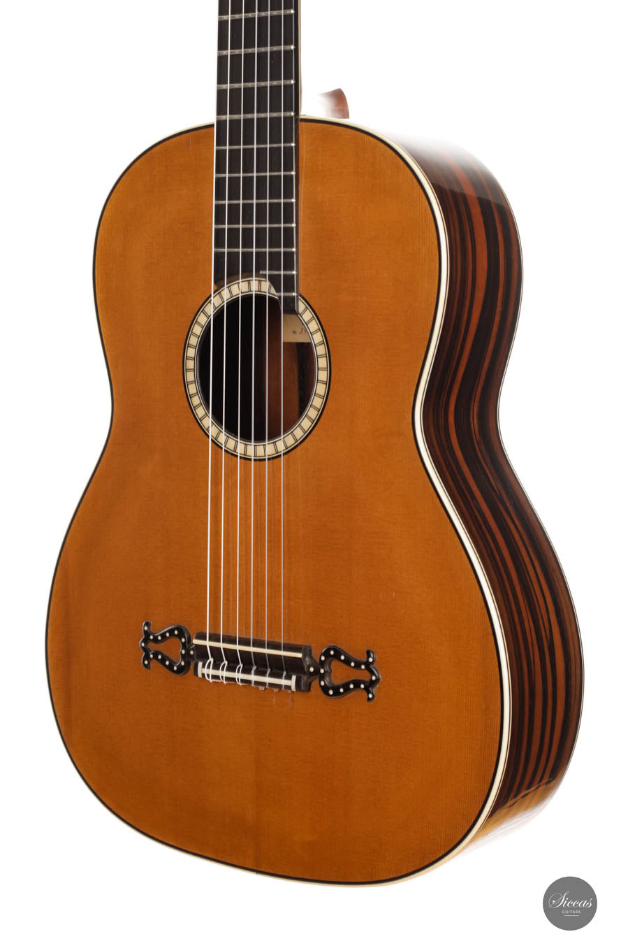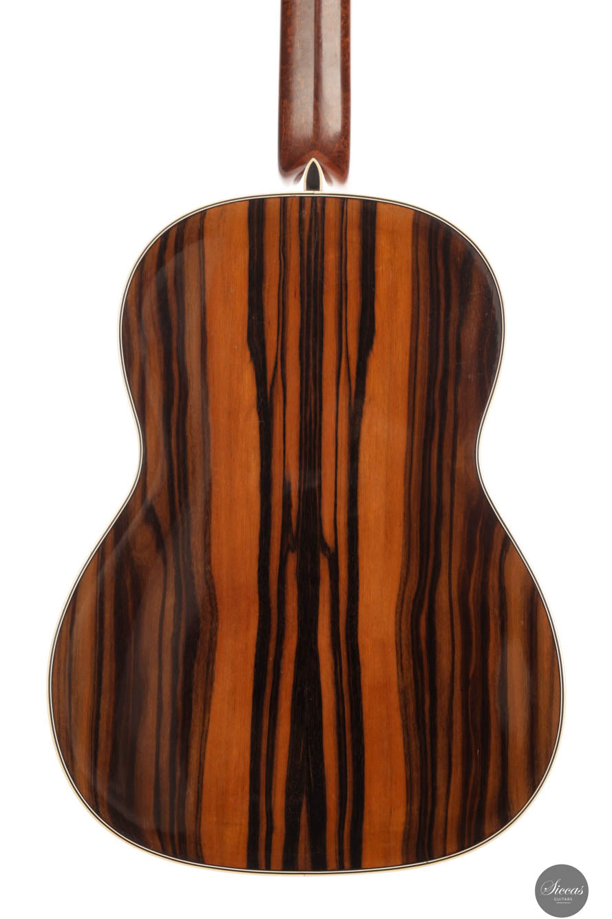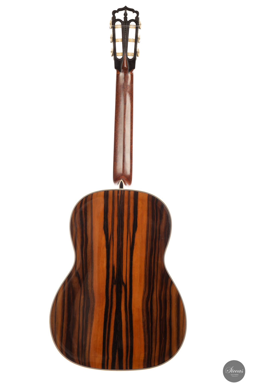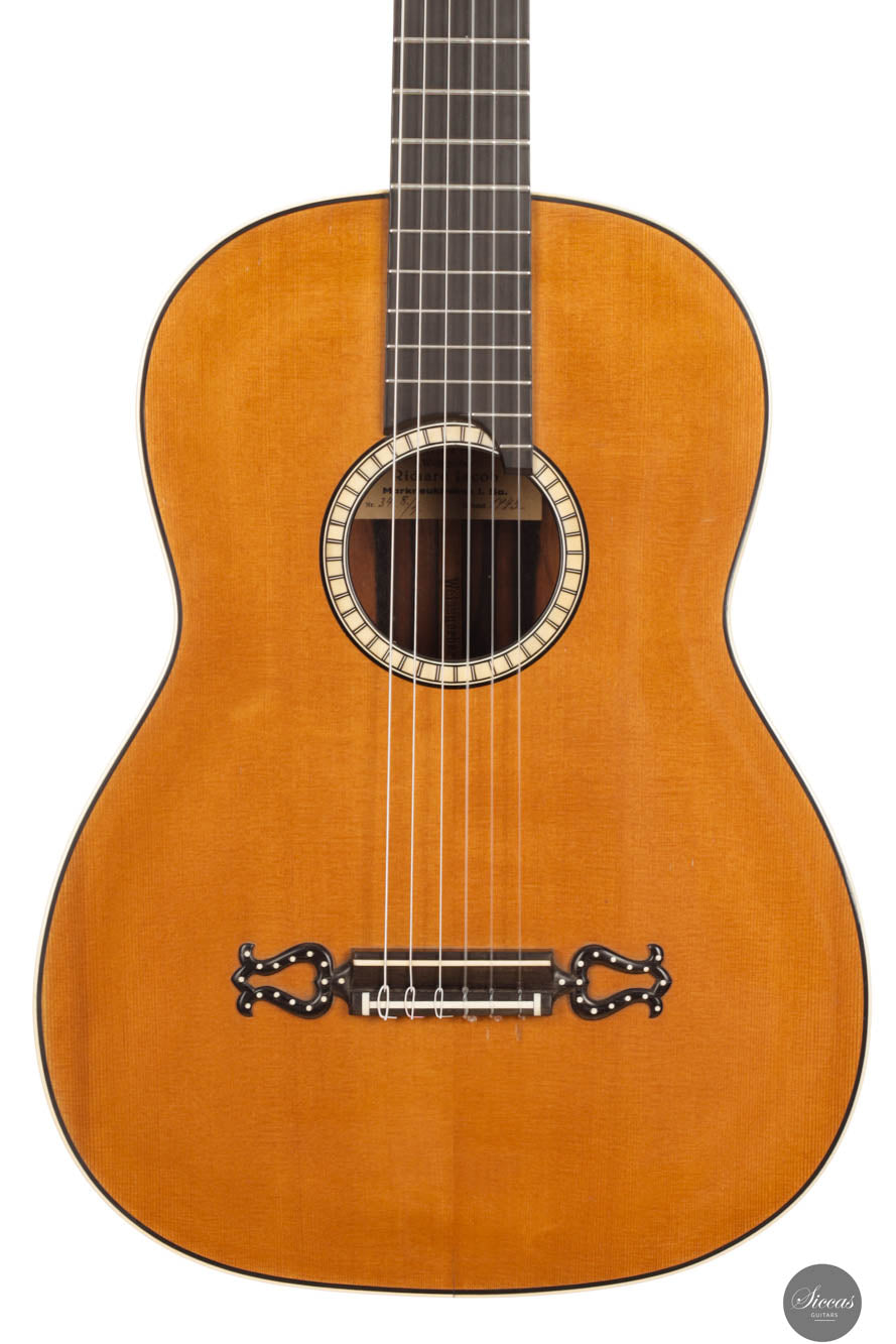 Der Macassar-Ebenholz Boden und Zargen, gepaart mit einer resonanten Fichtendecke, verleihen dieser Gitarre einen reichen, ausgewogenen Klang, der mit Wärme und Klarheit über alle Register hinweg klingt. Der Klang ist nuanciert und dynamisch und bietet eine breite Palette, die Weissgerbers akustisches Können widerspiegelt. Gut erhalten und strukturell intakt, bietet diese Gitarre nicht nur ein bemerkenswertes Spielerlebnis, sondern steht auch als Zeugnis für das bleibende Erbe der Handwerkskunst von Richard Jacob Weissgerber – ein zeitloses Stück Gitarrenbaugeschichte.