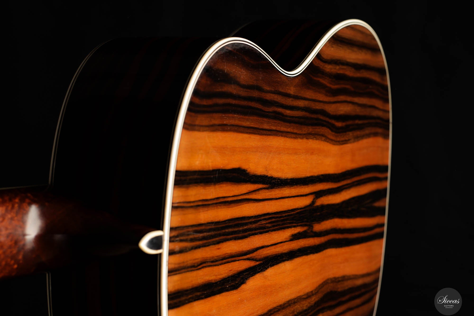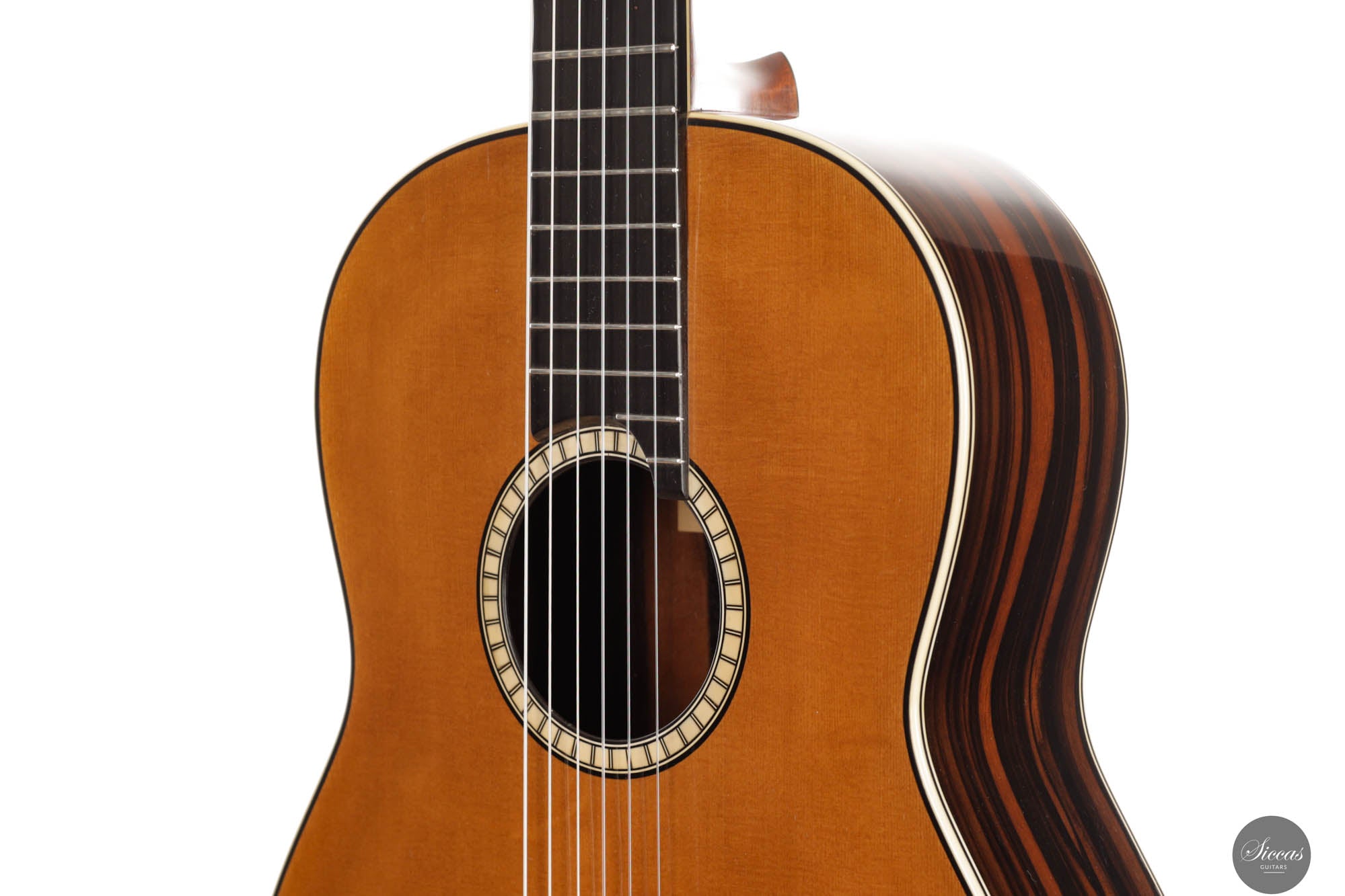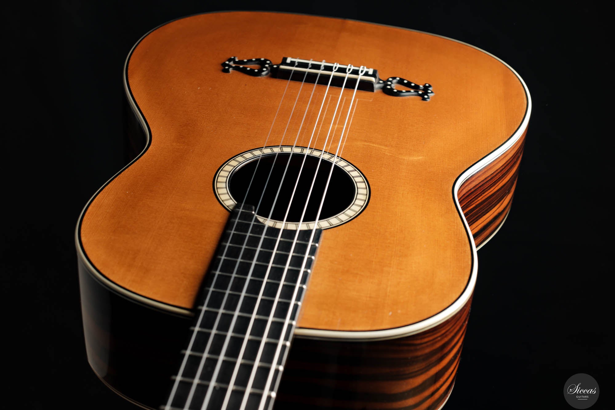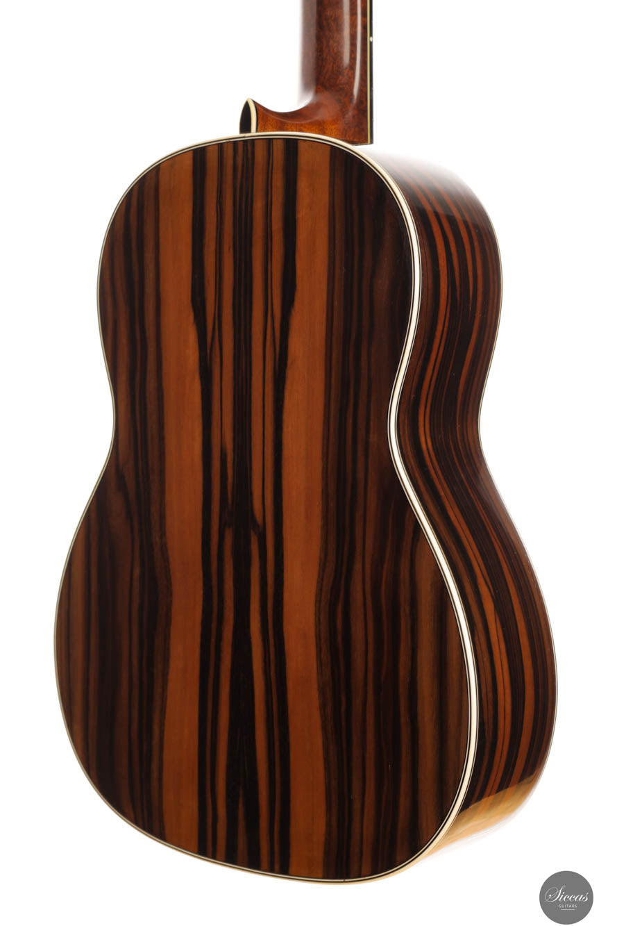 Der Macassar-Ebenholz Boden und Zargen, gepaart mit einer resonanten Fichtendecke, verleihen dieser Gitarre einen reichen, ausgewogenen Klang, der mit Wärme und Klarheit über alle Register hinweg klingt. Der Klang ist nuanciert und dynamisch und bietet eine breite Palette, die Weissgerbers akustisches Können widerspiegelt. Gut erhalten und strukturell intakt, bietet diese Gitarre nicht nur ein bemerkenswertes Spielerlebnis, sondern steht auch als Zeugnis für das bleibende Erbe der Handwerkskunst von Richard Jacob Weissgerber – ein zeitloses Stück Gitarrenbaugeschichte.