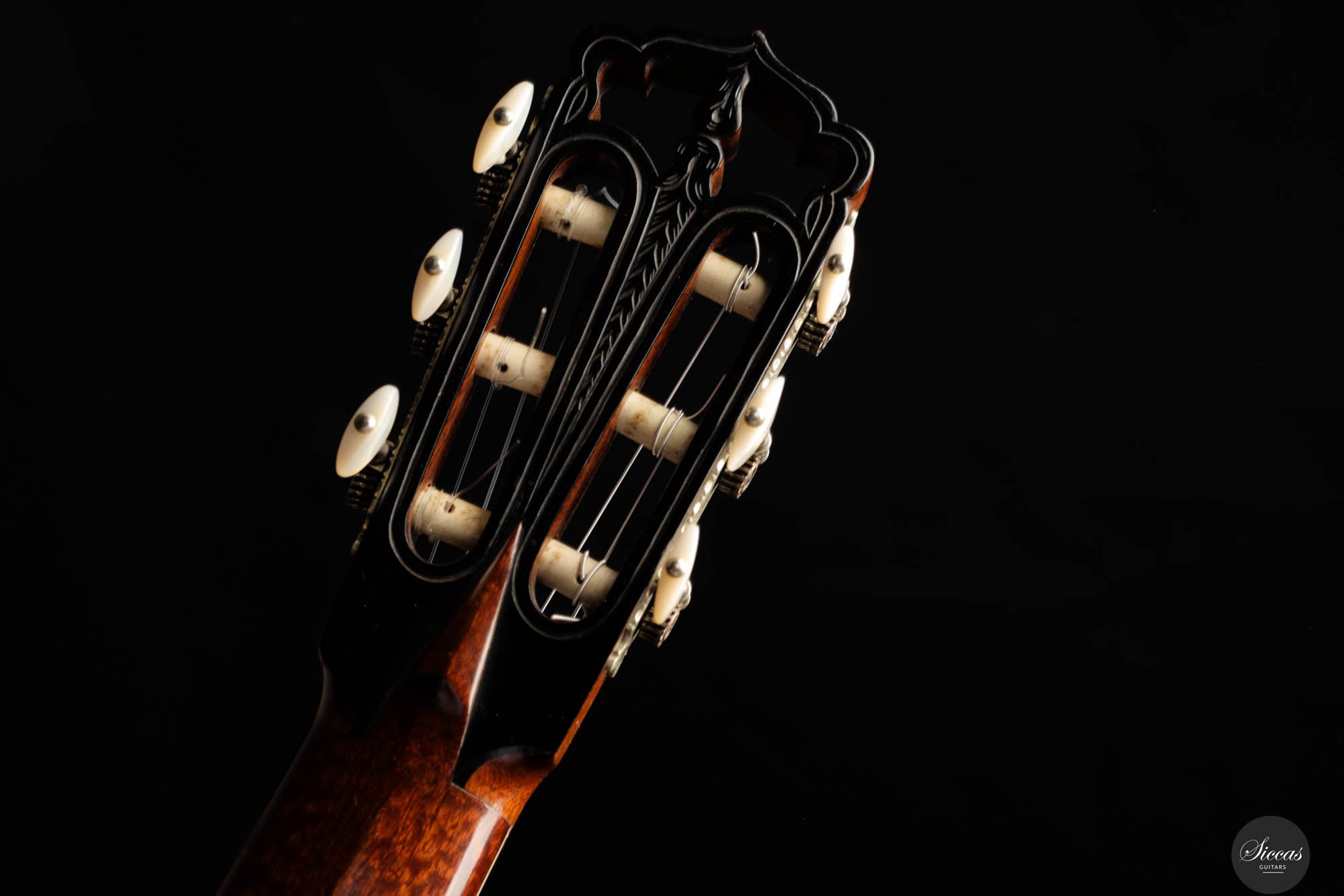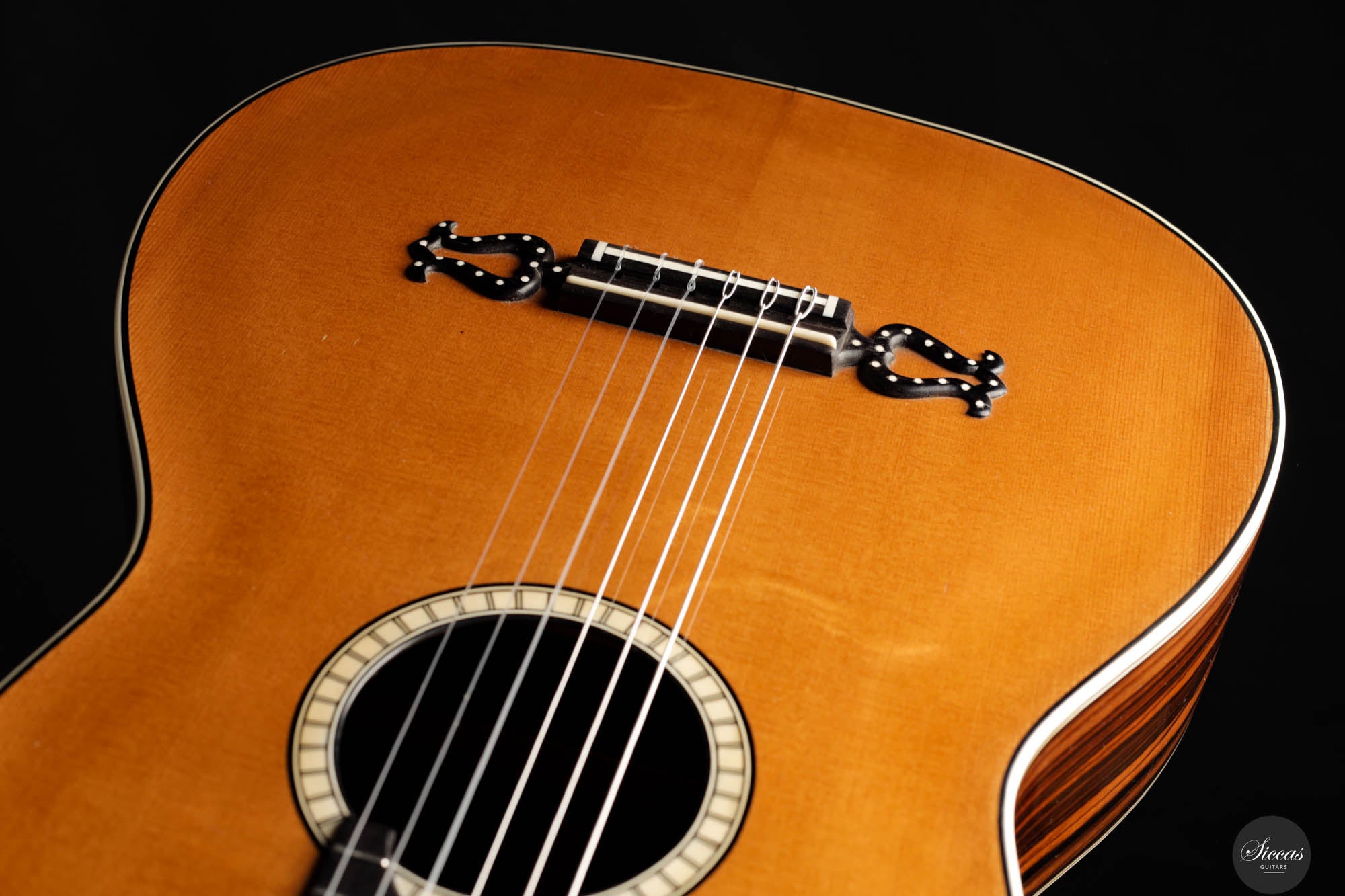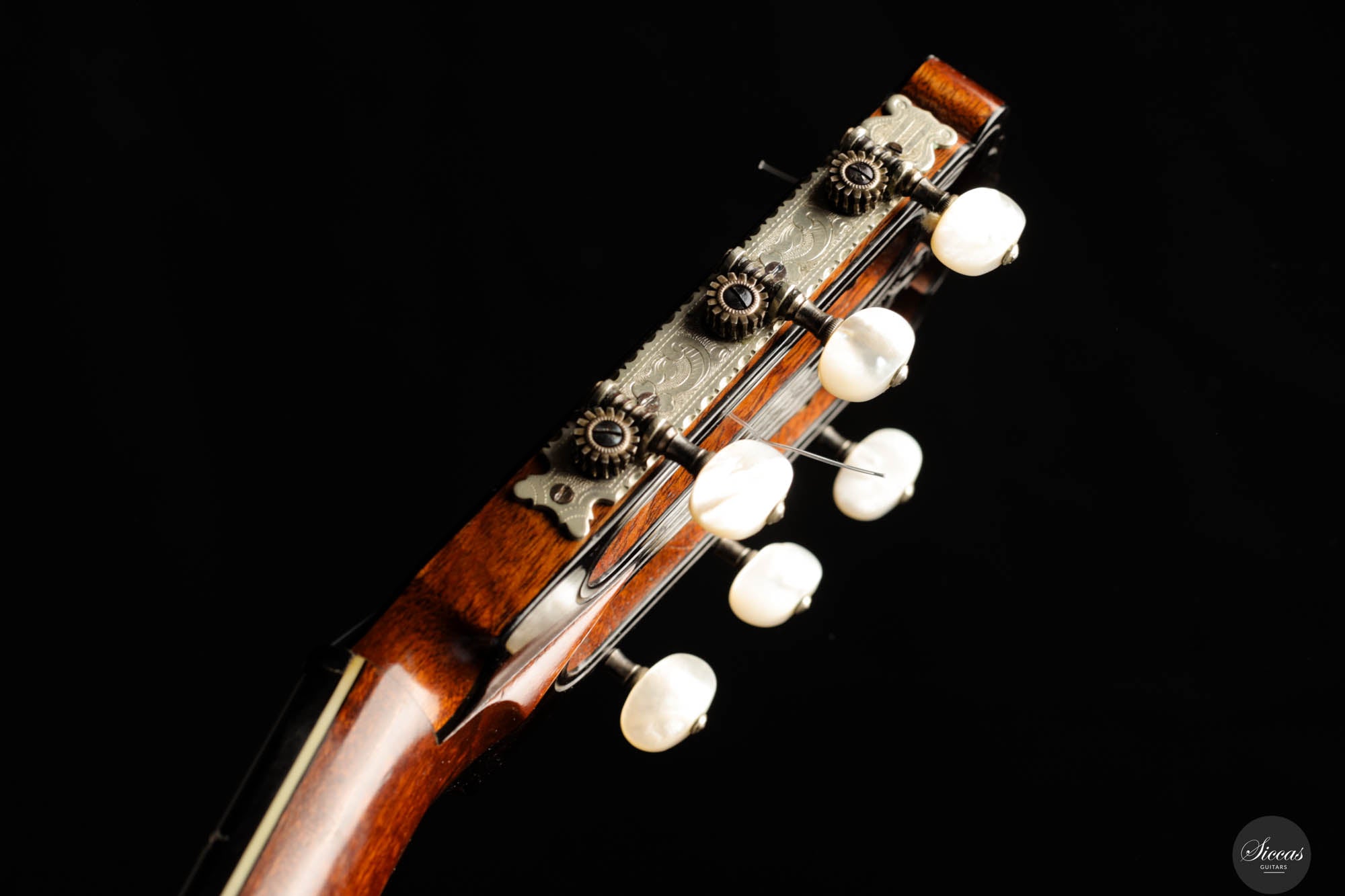 Diese Gitarre von 1943 ist ein Meisterwerk akribischer Handwerkskunst und eleganten Designs. Weissgerbers Hingabe zum Detail zeigt sich in jeder Komponente. Vom kunstvoll geschnitzten Kopf, der auf beiden Seiten verziert ist, über das aufwendig gearbeitete Schwalbenschwanzverbindung am Hals-Kopf-Übergang bis hin zum Steg mit seinen verzierten Flügeln – sie verkörpert eine nahtlose Verschmelzung von Funktionalität und Kunstfertigkeit. Die Ästhetik der Gitarre wird durch ein beeindruckendes Zusammenspiel kontrastreicher Elemente weiter hervorgehoben: die weißen Intarsien gegen den dunklen Ebenholzsteg, die weißen Galalith-Bindings gegen die zarten Ebenholz-Einlagen, und schließlich eine minimalistische, doch elegante Rosette, die den visuellen Reiz des Instruments zusammenführt und seinen raffinierten Charakter unterstreicht.