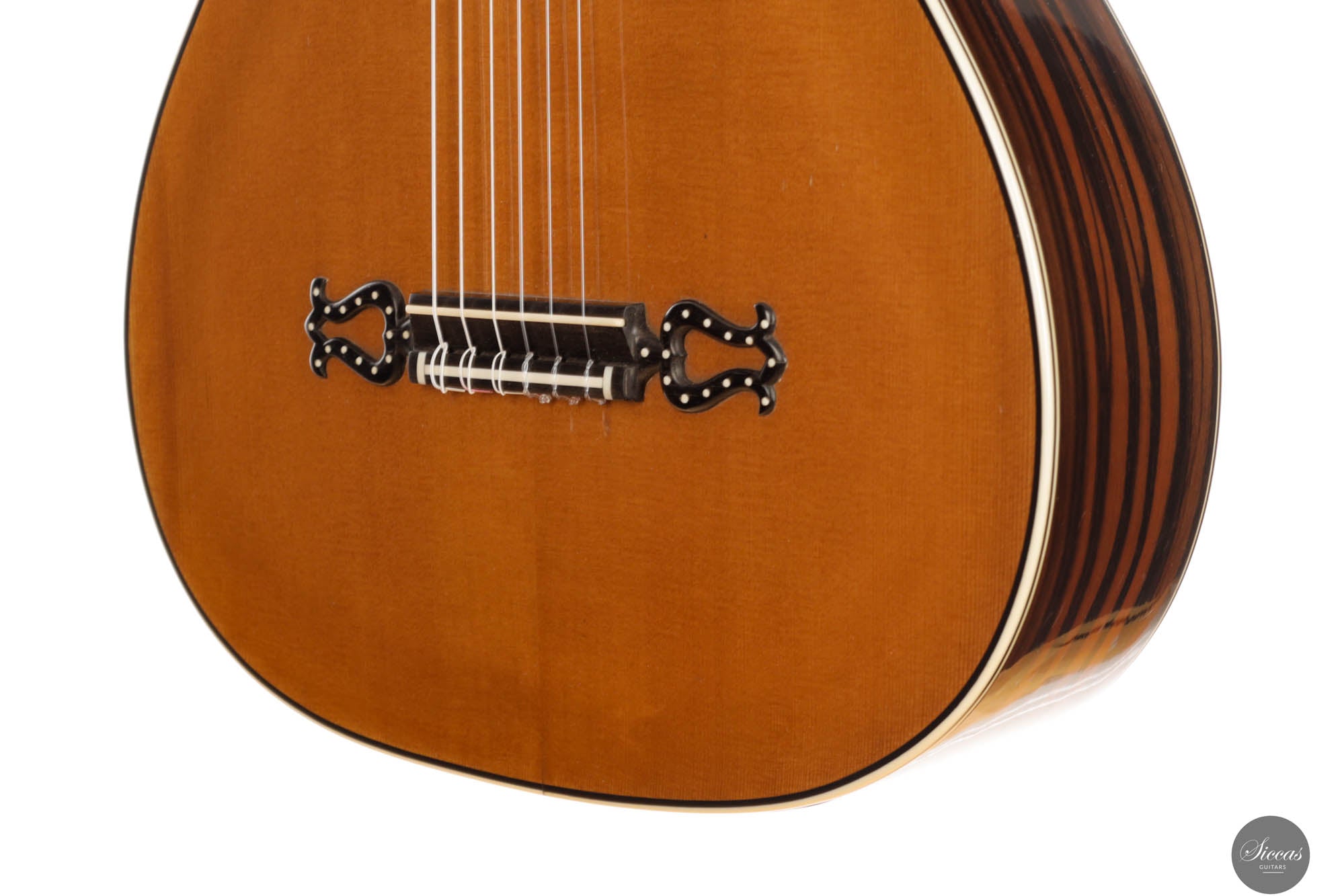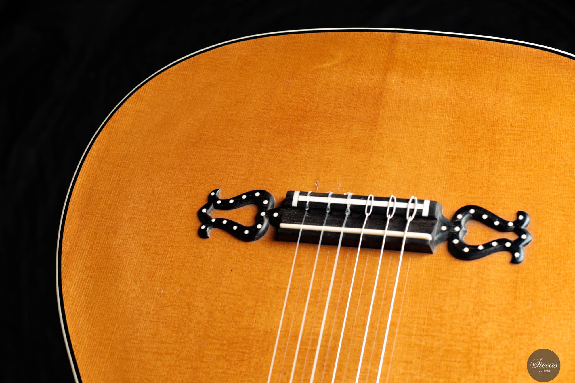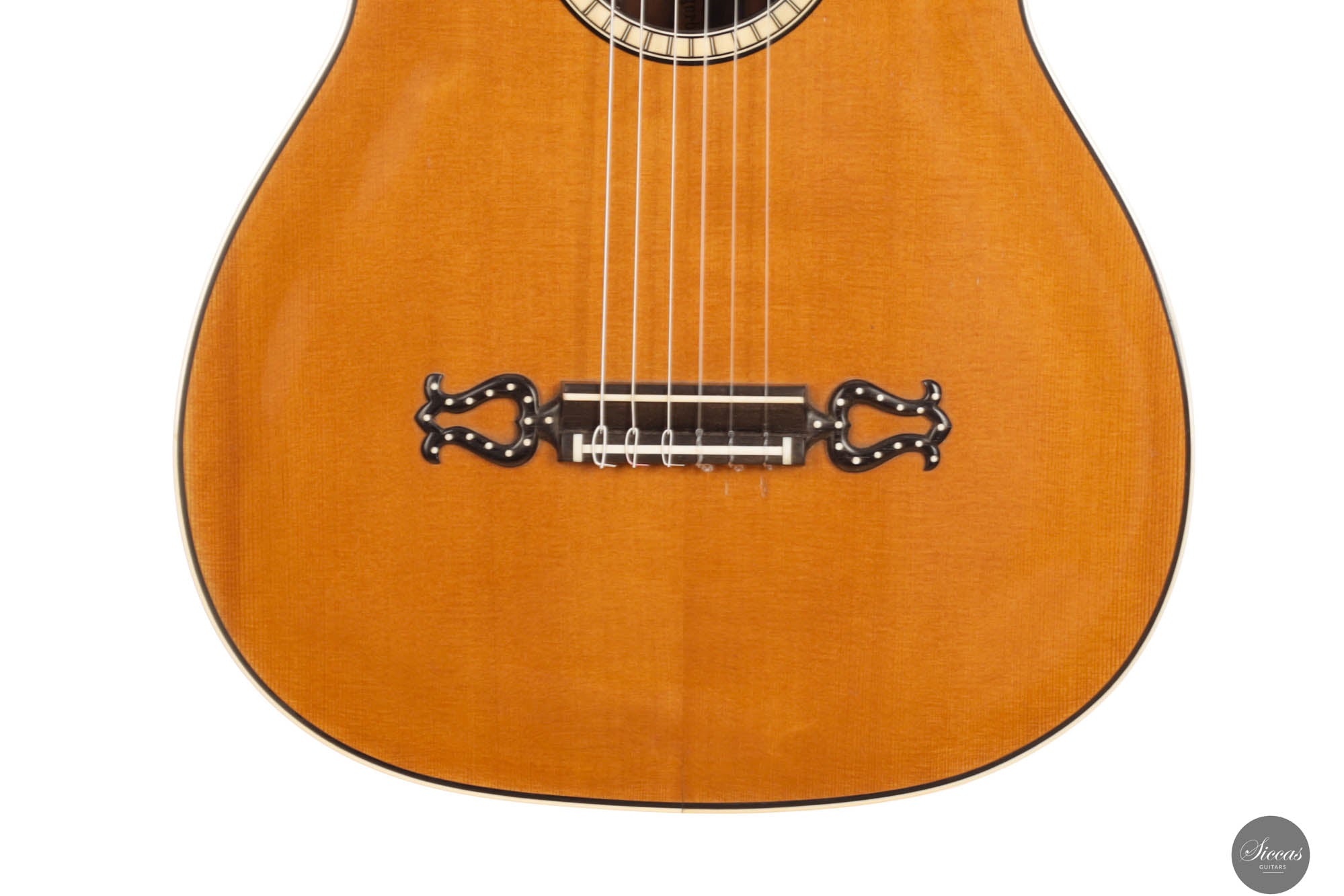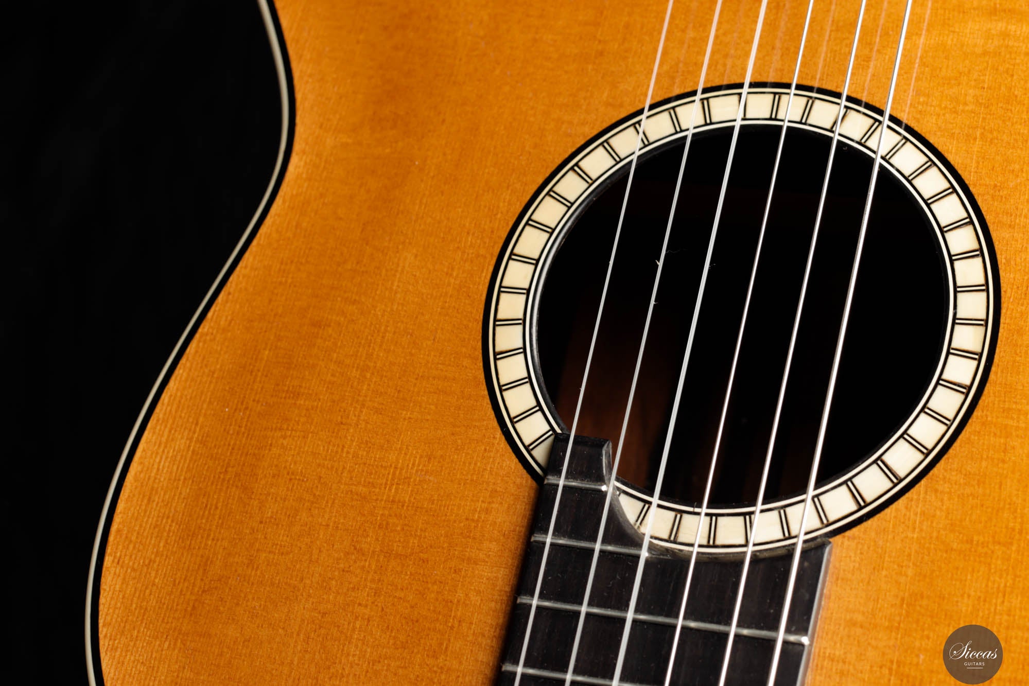 Diese Gitarre von 1943 ist ein Meisterwerk akribischer Handwerkskunst und eleganten Designs. Weissgerbers Hingabe zum Detail zeigt sich in jeder Komponente. Vom kunstvoll geschnitzten Kopf, der auf beiden Seiten verziert ist, über das aufwendig gearbeitete Schwalbenschwanzverbindung am Hals-Kopf-Übergang bis hin zum Steg mit seinen verzierten Flügeln – sie verkörpert eine nahtlose Verschmelzung von Funktionalität und Kunstfertigkeit. Die Ästhetik der Gitarre wird durch ein beeindruckendes Zusammenspiel kontrastreicher Elemente weiter hervorgehoben: die weißen Intarsien gegen den dunklen Ebenholzsteg, die weißen Galalith-Bindings gegen die zarten Ebenholz-Einlagen, und schließlich eine minimalistische, doch elegante Rosette, die den visuellen Reiz des Instruments zusammenführt und seinen raffinierten Charakter unterstreicht.