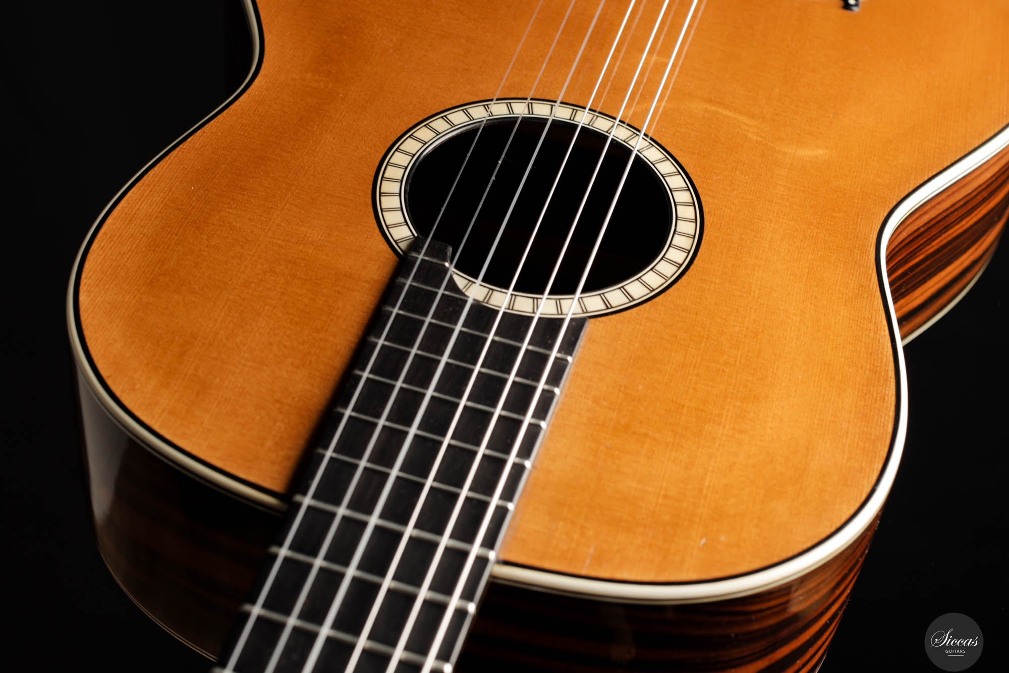 Die klassische Gitarre mit ihren weichen Nylonsaiten und ihrem charakteristischen Timbre ist zum Symbol der Kammermusik, der spanischen Tradition und des Konzertrepertoires geworden. Ihre moderne Form prägte Antonio de Torres im 19. Jahrhundert, indem er den Standard für Korpus, Fächerbeleistung und die 65-Zentimeter-Mensur setzte, die bis heute verwendet werden. Instrumente dieser Kategorie eröffnen eine reiche Palette von den feinen romantischen Miniaturen Tárregas bis zu den majestätischen Konzerten Rodrigos. Hier finden Sie Gitarren, die historische Kontinuität bewahren und zugleich zu neuen Interpretationen anregen.