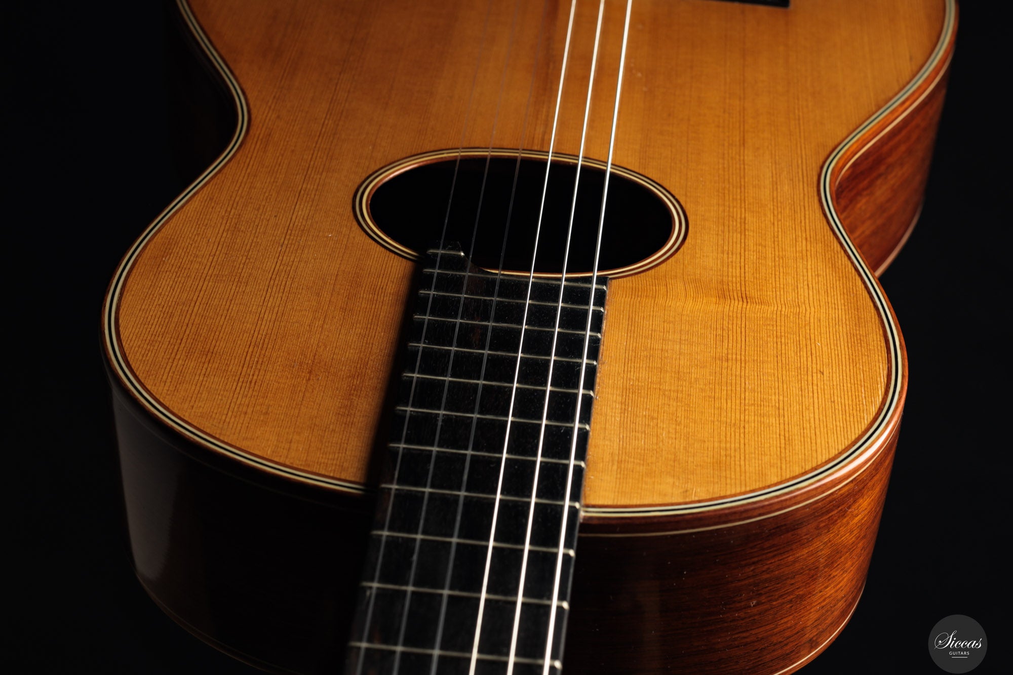 Klanglich bietet die Gitarre einen dunklen, runden Grundcharakter mit warmen Bässen und klaren, singenden Höhen. Der vergrößerte Resonanraum und die klanglich fein abgestimmte Konstruktion ermöglichen sowohl eine subtile Ansprache als auch klangliche Präsenz. Sie reagiert unmittelbar auf den Anschlag, unterstützt dynamische Phrasierung und bietet eine bemerkenswerte Ausgewogenheit über alle Register hinweg. Auch in leisen Passagen bleibt der Ton präsent und tragfähig.