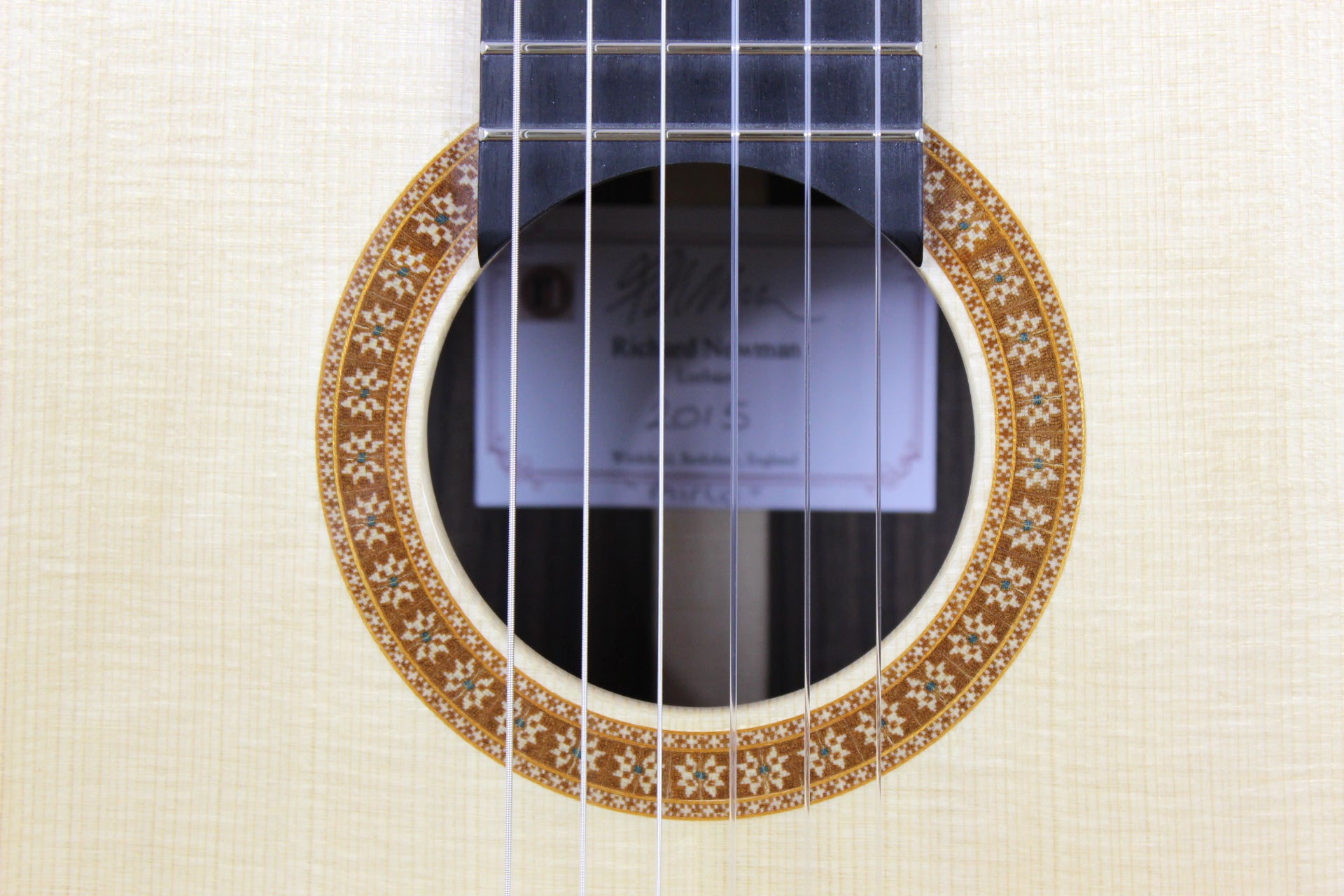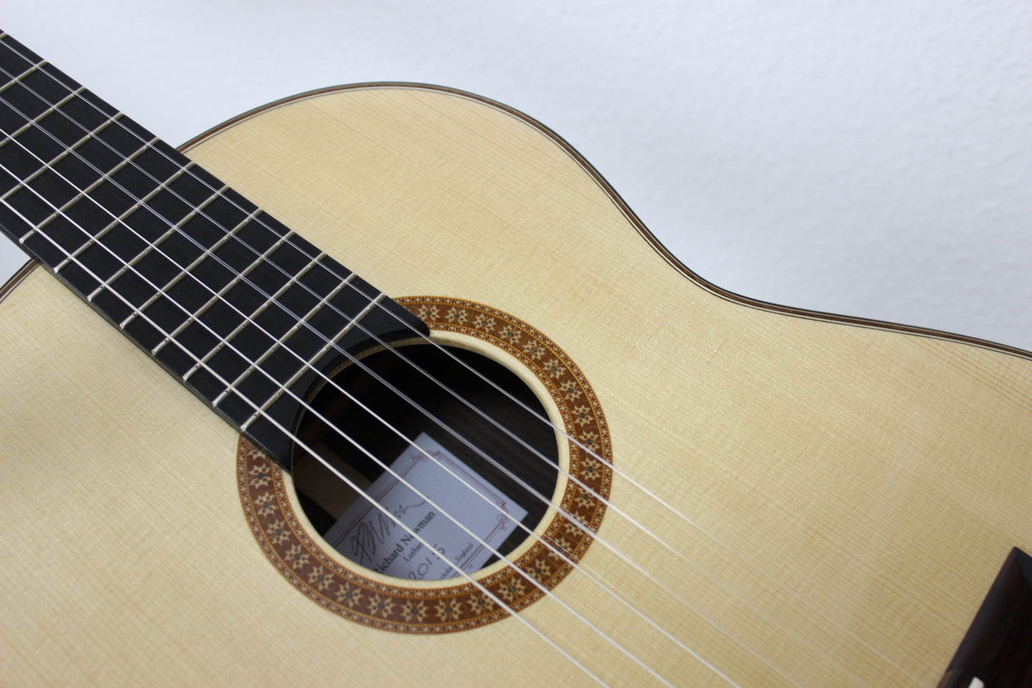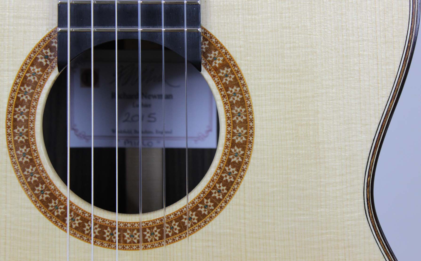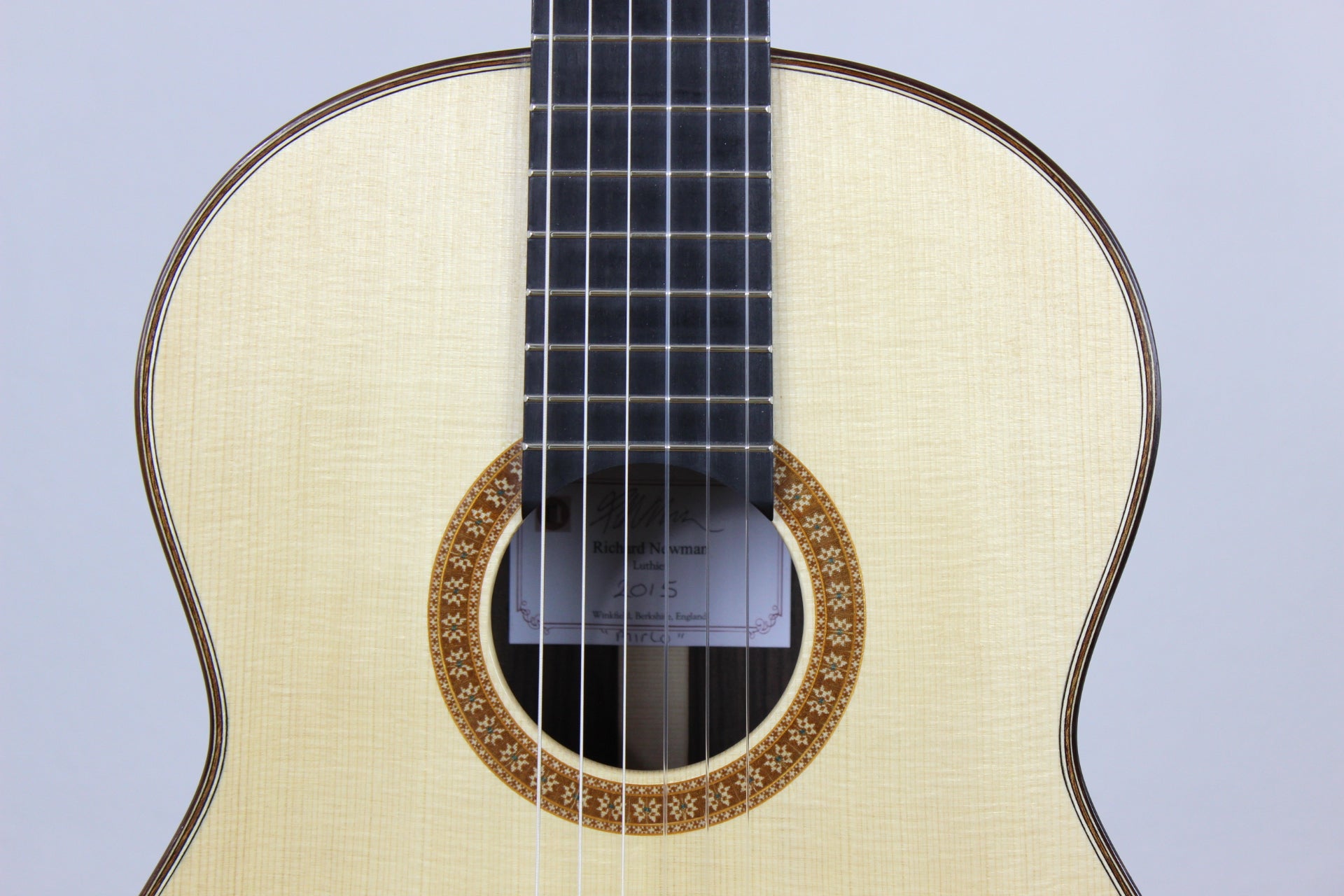 Richard Newman was born in 1964 and studied classical guitar in the mid 90's under Richard Wright (now head of guitar at the Yehudi Menuhin school of music). He learnt much about tone production from his studies and set out to find a good guitar with a traditional "old world sound". Failing to find the desirable instrument, Richard enthusiastically decided, as he had worked with wood for many years as a tree surgeon, to try to build his own guitar. Richard built a handful of guitars, and with much encouragement from players, left his job and enrolled in a full time guitar making course at the London Guildhall University in 2001. After completing the course, Richard set up a workshop in Ascot, Berkshire, where he builds around twelve guitars a year. Richard builds using very little machinery, concentrating on using traditional hand tools and glues, as he feels it is important to be in touch with the materials while maintaining control over his work. Richard has also received a lot of guidance and advice from professional players and other makers over the years. He also studied many master guitars, which has helped him evolve as a maker and produce well balanced guitars with a low body resonance and fine projection. Richard continues creating guitars with the same passion and enthusiasm as that very first build. This guitar is named "Mirlo" and has a european spruce top, back and sides are made of Indian rosewood.