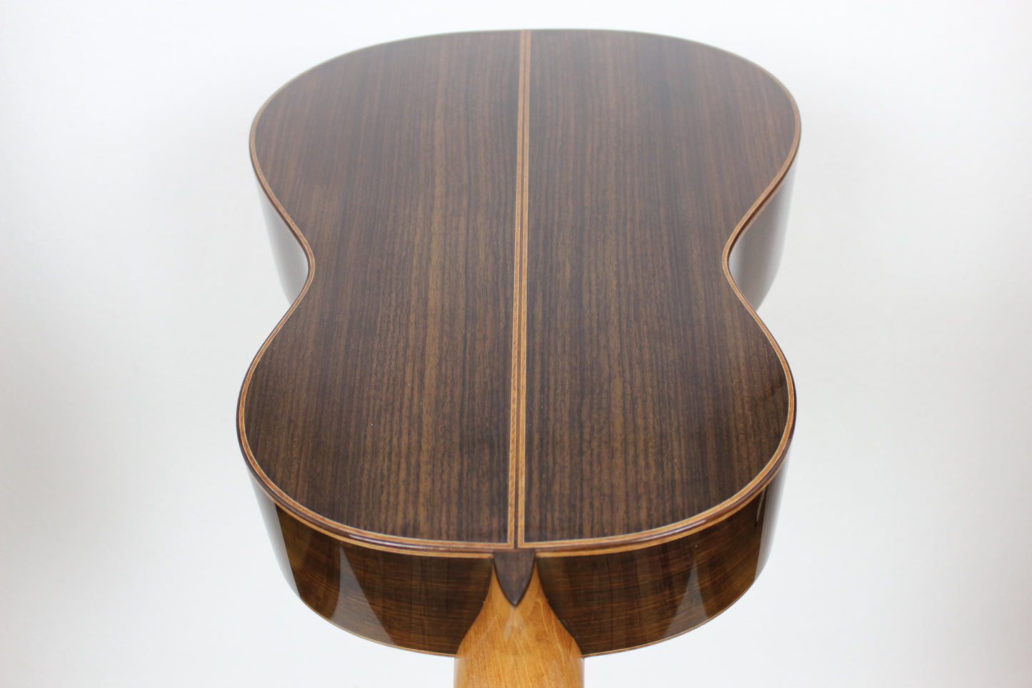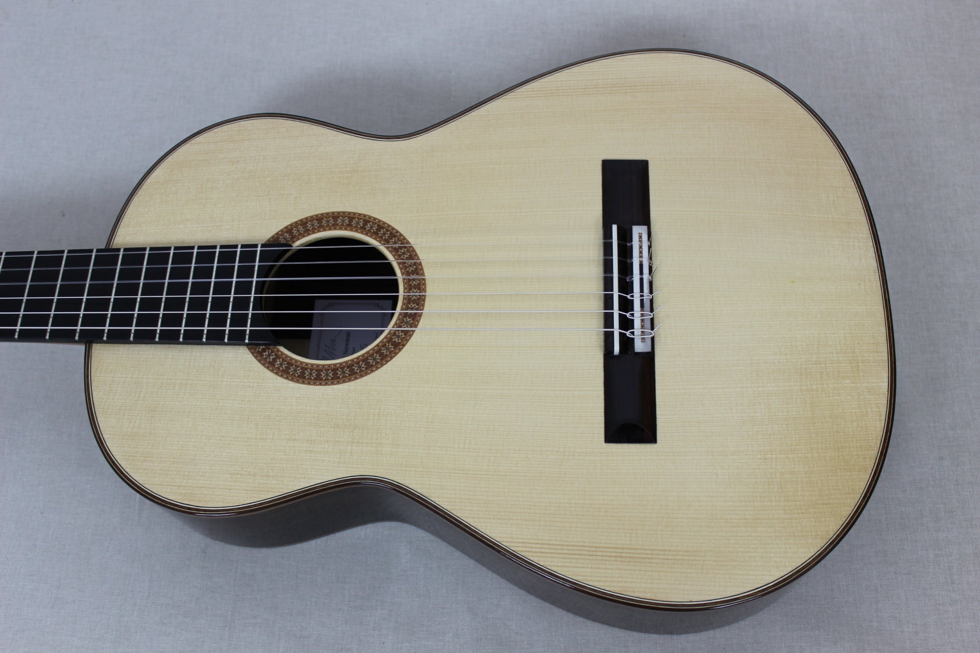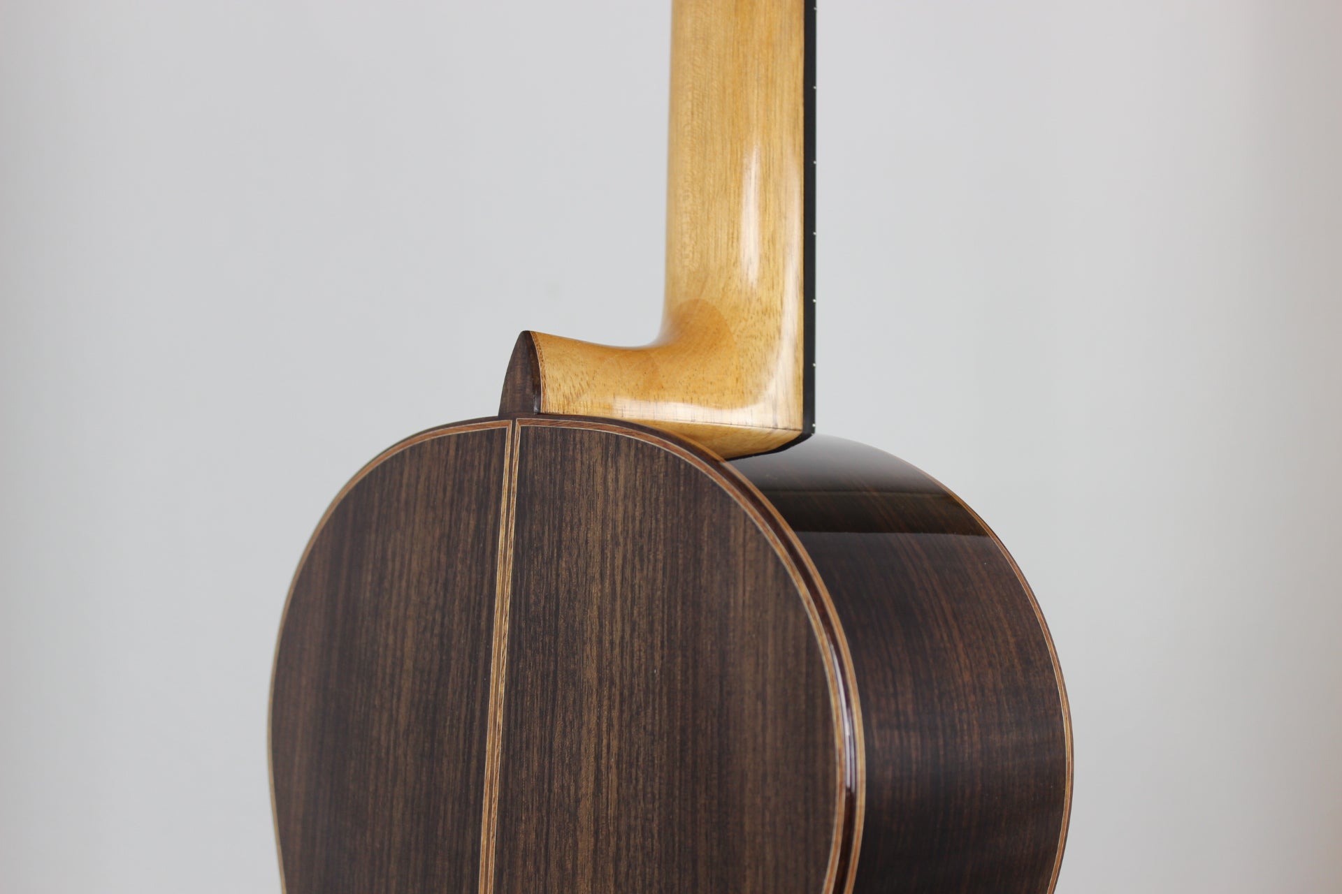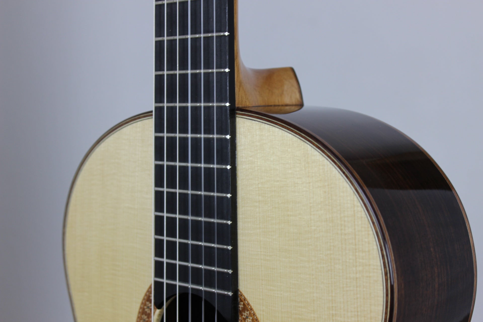 Richard Newman was born in 1964 and studied classical guitar in the mid 90's under Richard Wright (now head of guitar at the Yehudi Menuhin school of music). He learnt much about tone production from his studies and set out to find a good guitar with a traditional "old world sound". Failing to find the desirable instrument, Richard enthusiastically decided, as he had worked with wood for many years as a tree surgeon, to try to build his own guitar. Richard built a handful of guitars, and with much encouragement from players, left his job and enrolled in a full time guitar making course at the London Guildhall University in 2001. After completing the course, Richard set up a workshop in Ascot, Berkshire, where he builds around twelve guitars a year. Richard builds using very little machinery, concentrating on using traditional hand tools and glues, as he feels it is important to be in touch with the materials while maintaining control over his work. Richard has also received a lot of guidance and advice from professional players and other makers over the years. He also studied many master guitars, which has helped him evolve as a maker and produce well balanced guitars with a low body resonance and fine projection. Richard continues creating guitars with the same passion and enthusiasm as that very first build. This guitar is named "Mirlo" and has a european spruce top, back and sides are made of Indian rosewood.