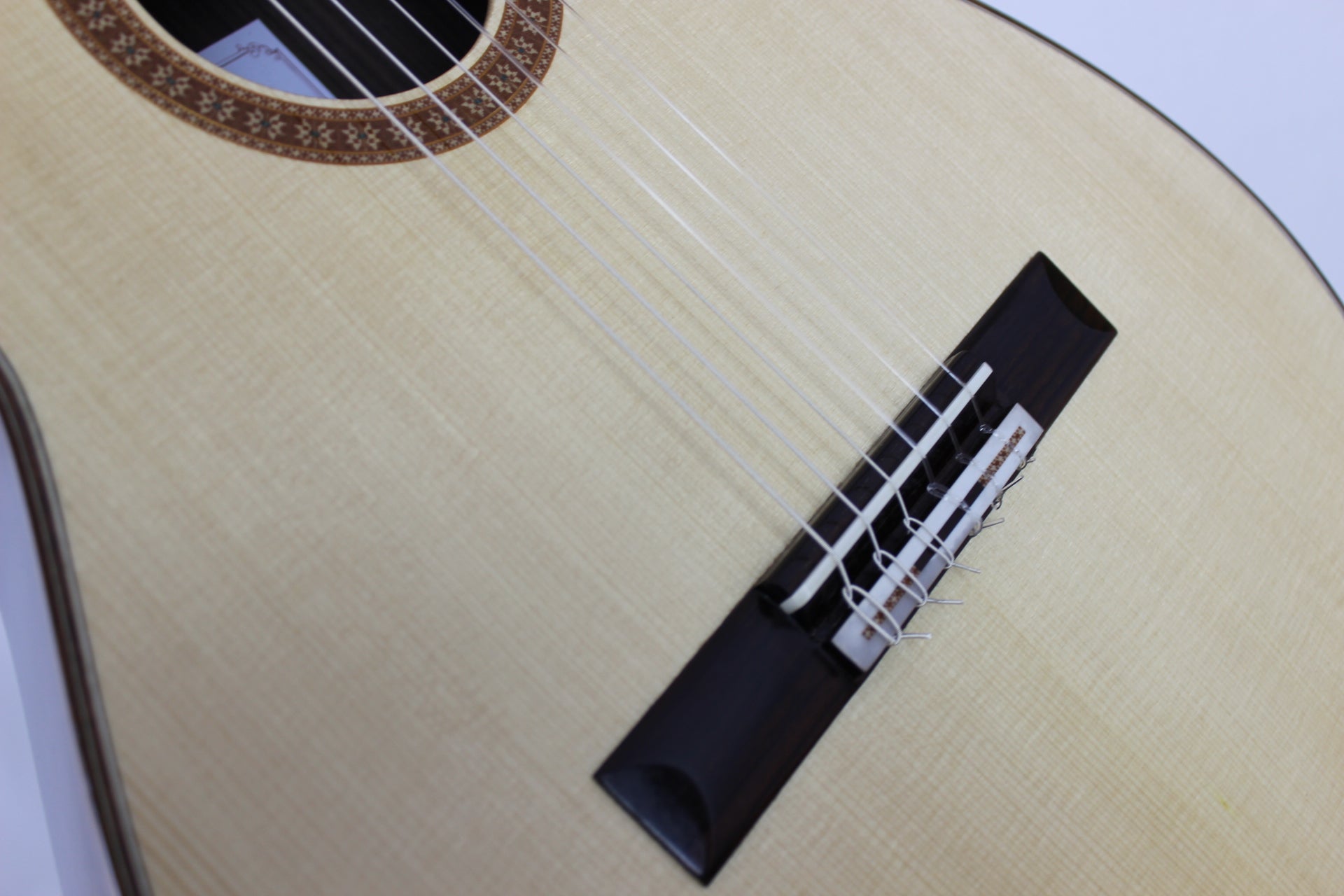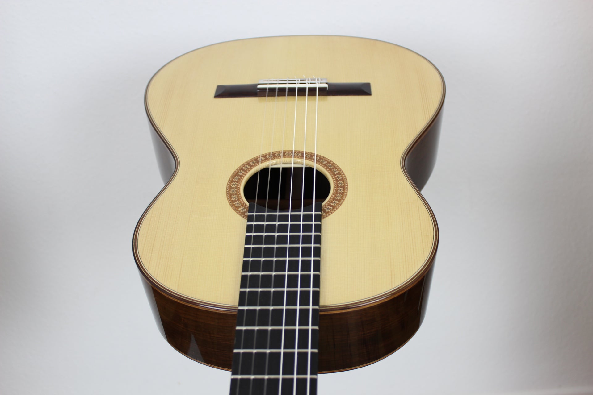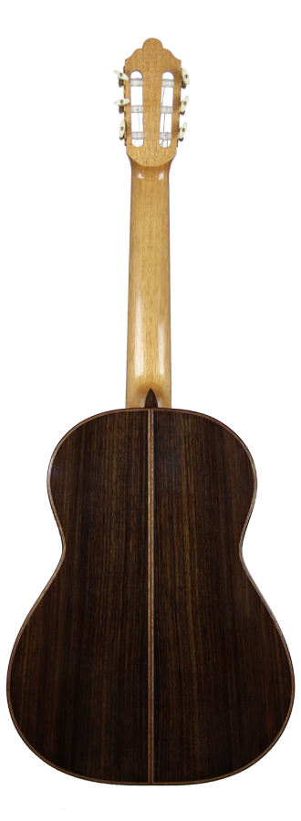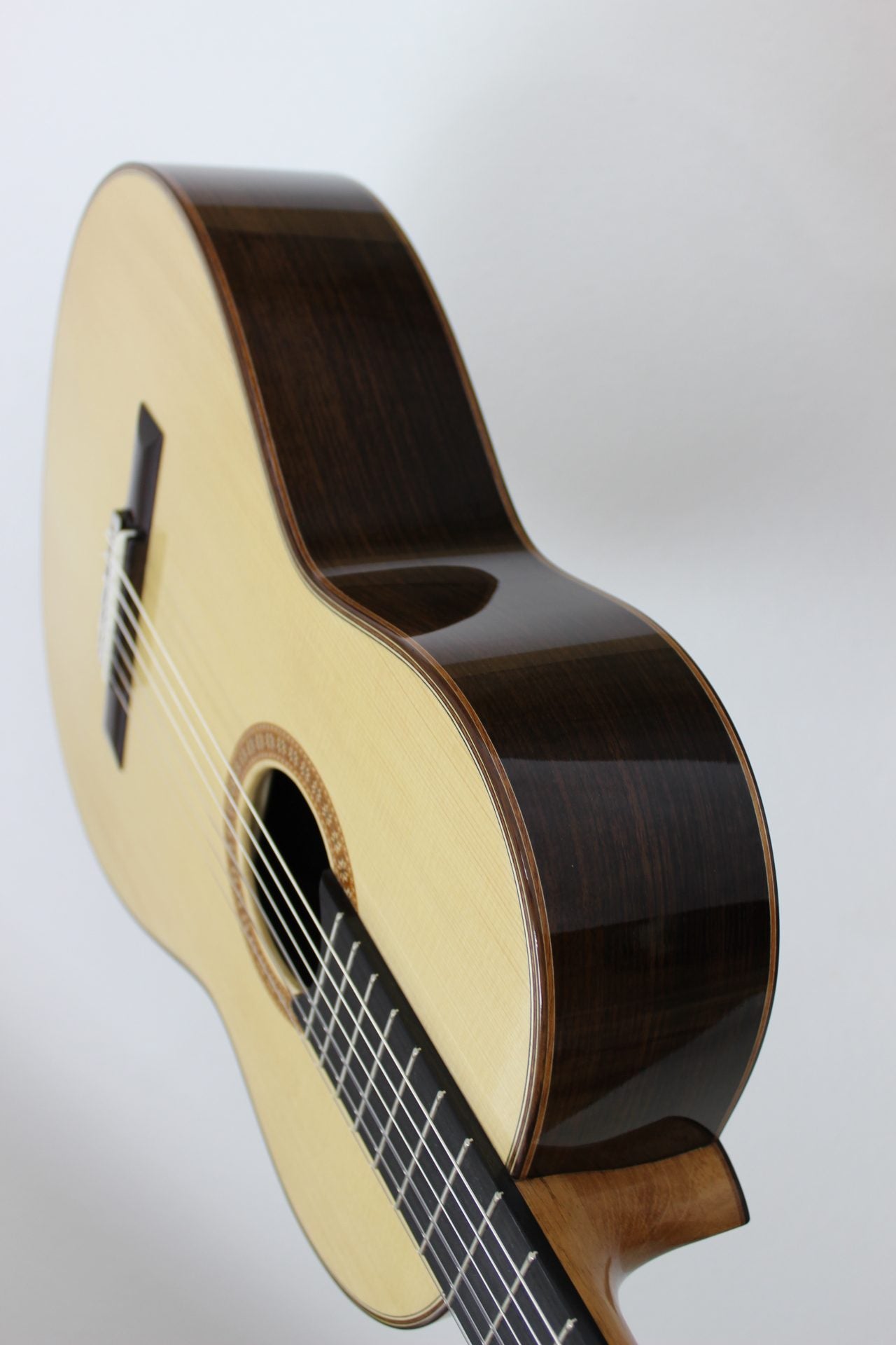 Richard Newman was born in 1964 and studied classical guitar in the mid 90's under Richard Wright (now head of guitar at the Yehudi Menuhin school of music). He learnt much about tone production from his studies and set out to find a good guitar with a traditional "old world sound". Failing to find the desirable instrument, Richard enthusiastically decided, as he had worked with wood for many years as a tree surgeon, to try to build his own guitar. Richard built a handful of guitars, and with much encouragement from players, left his job and enrolled in a full time guitar making course at the London Guildhall University in 2001. After completing the course, Richard set up a workshop in Ascot, Berkshire, where he builds around twelve guitars a year. Richard builds using very little machinery, concentrating on using traditional hand tools and glues, as he feels it is important to be in touch with the materials while maintaining control over his work. Richard has also received a lot of guidance and advice from professional players and other makers over the years. He also studied many master guitars, which has helped him evolve as a maker and produce well balanced guitars with a low body resonance and fine projection. Richard continues creating guitars with the same passion and enthusiasm as that very first build. This guitar is named "Mirlo" and has a european spruce top, back and sides are made of Indian rosewood.
