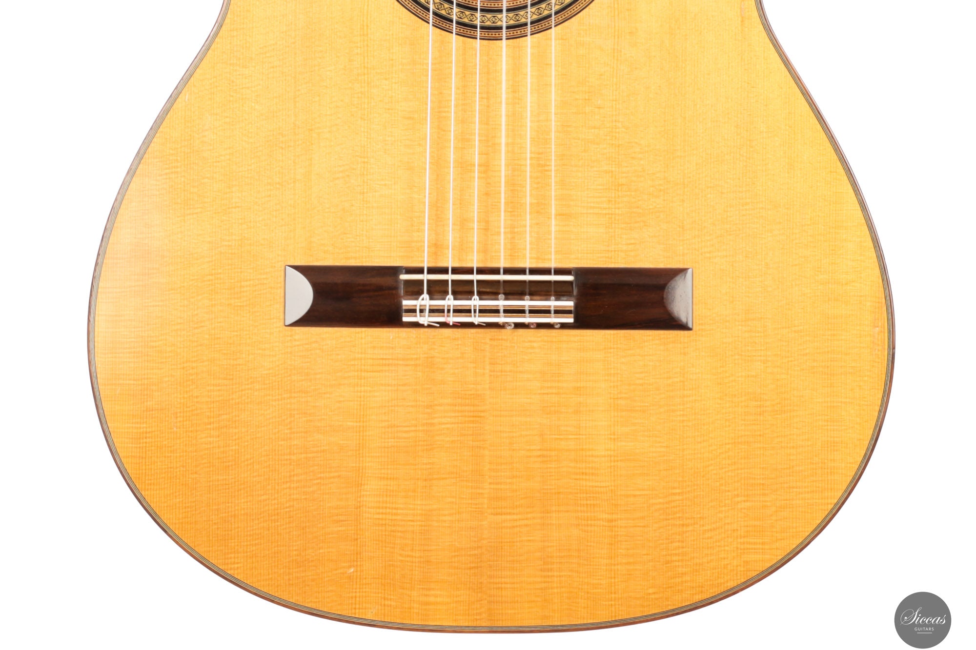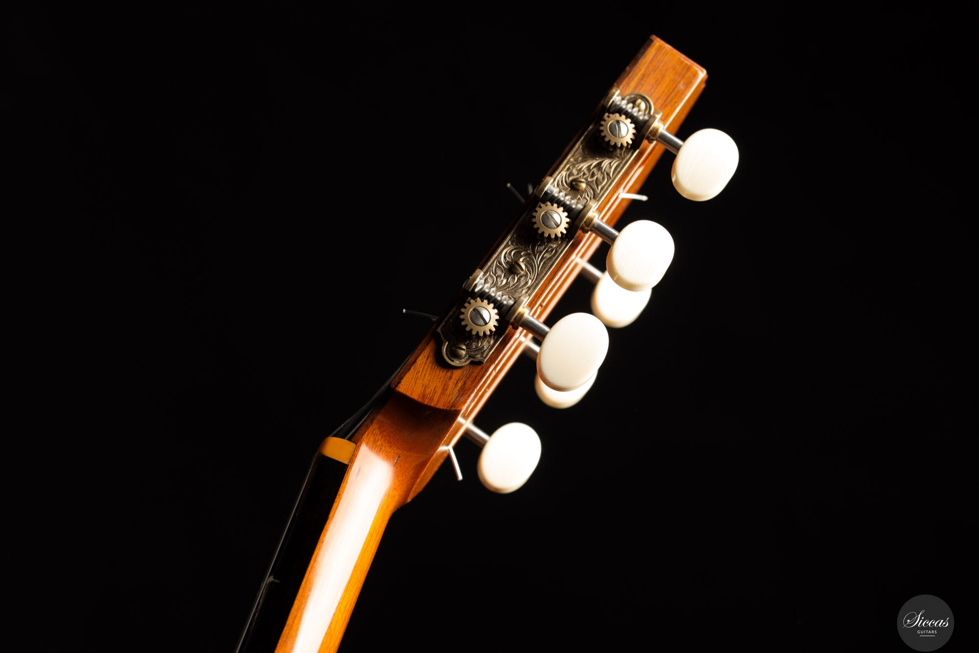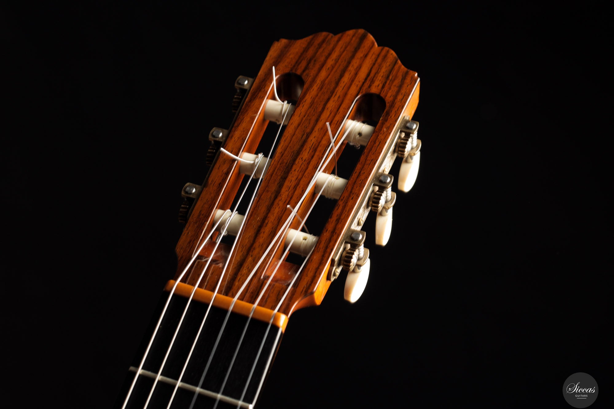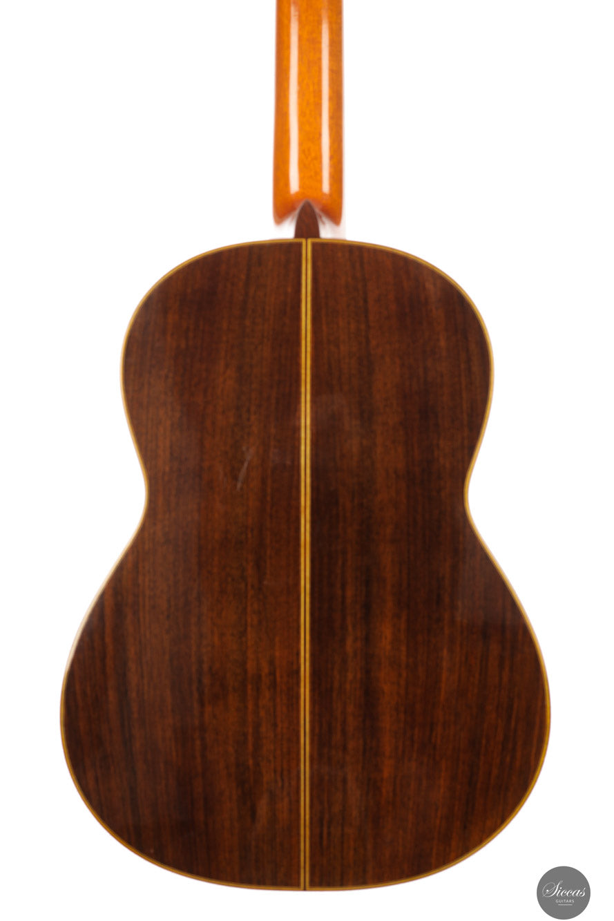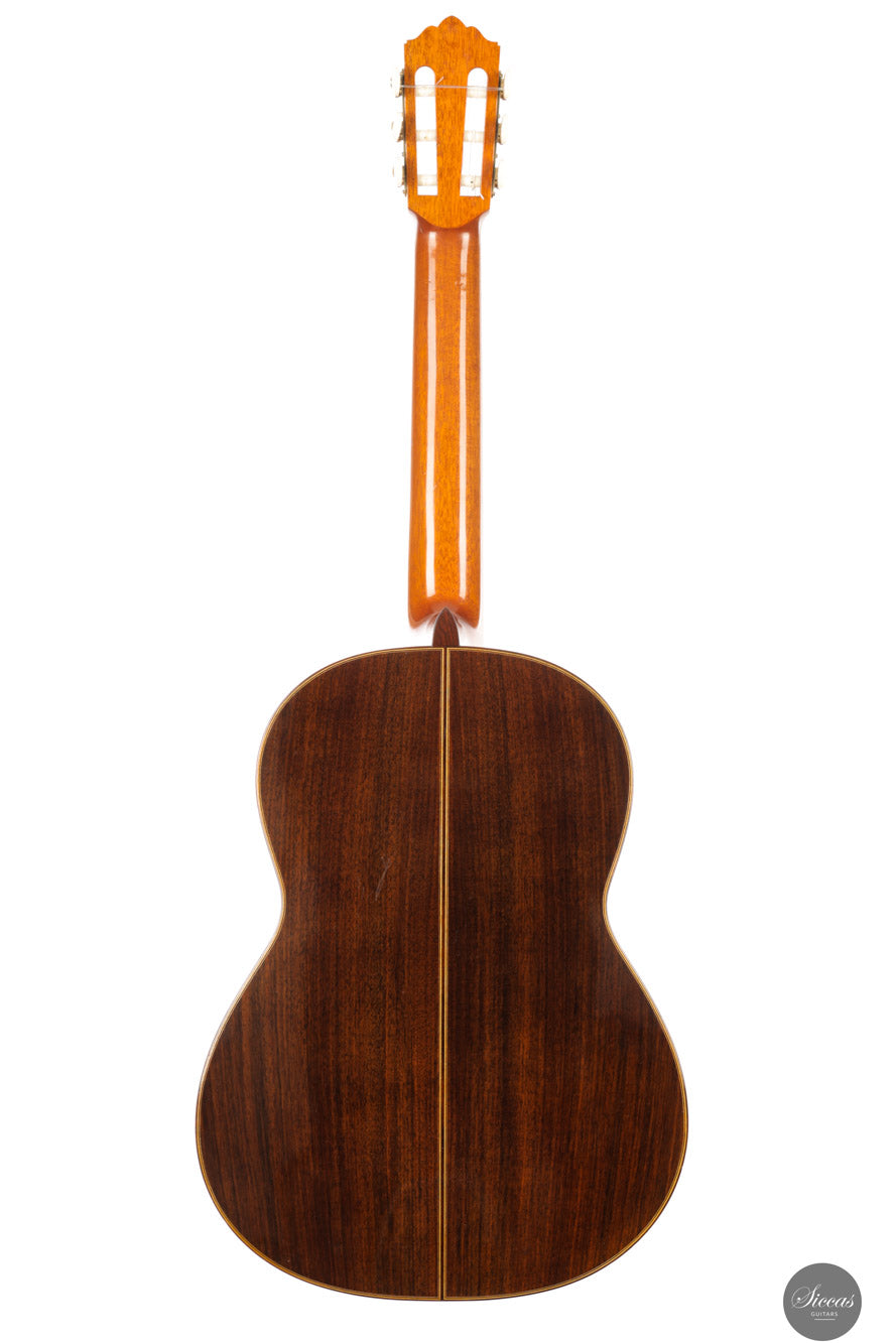 Diese im Jahr 1988 gebaute Gitarre ist ein hervorragendes Beispiel für die traditionelle Arbeit von Robert Ruck. Sie verfügt über eine Fichtendecke, Boden und Zargen aus Palisander und ein Nitrocellulose-Finish. Die Materialwahl steht für Eleganz und klangliche Raffinesse und bietet Klarheit, Projektion und Ausgewogenheit über alle Register. Mit einer Mensur von 650 mm und einer Sattelbreite von 53 mm bietet sie eine komfortable Spielbarkeit. Ergänzt wird dies durch Sloane-Mechaniken und eine Besaitung mit Knobloch EDC 34.0.