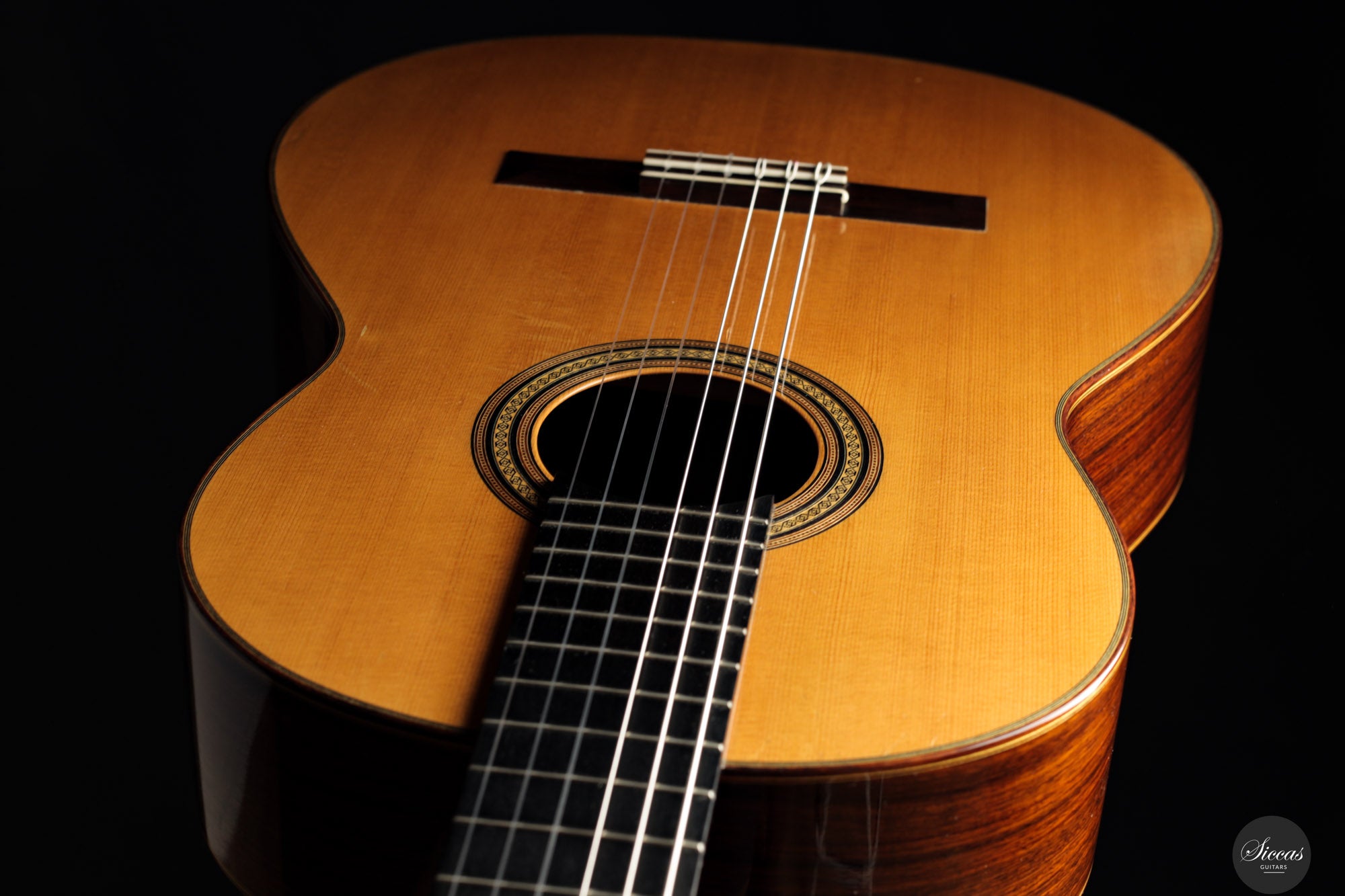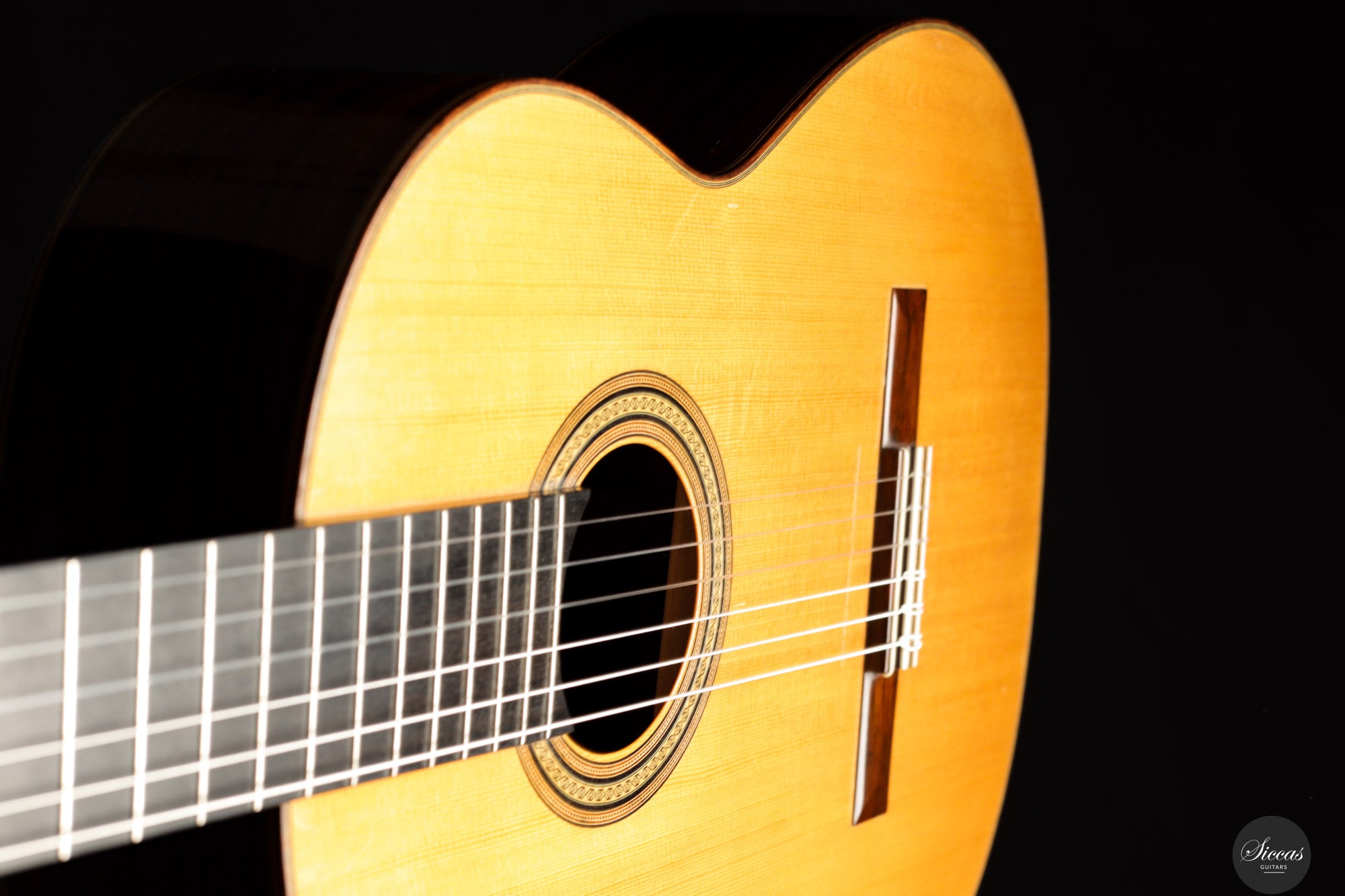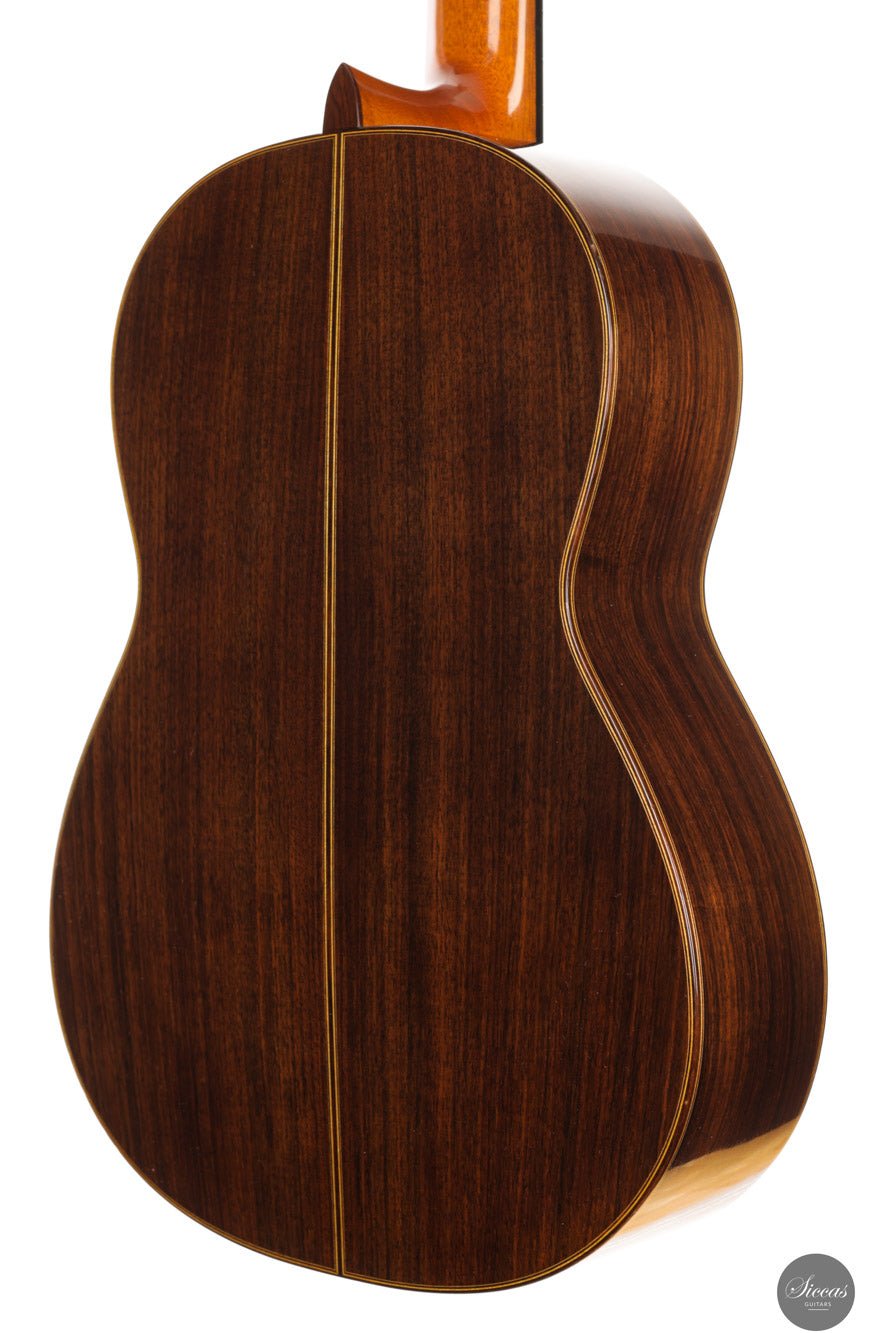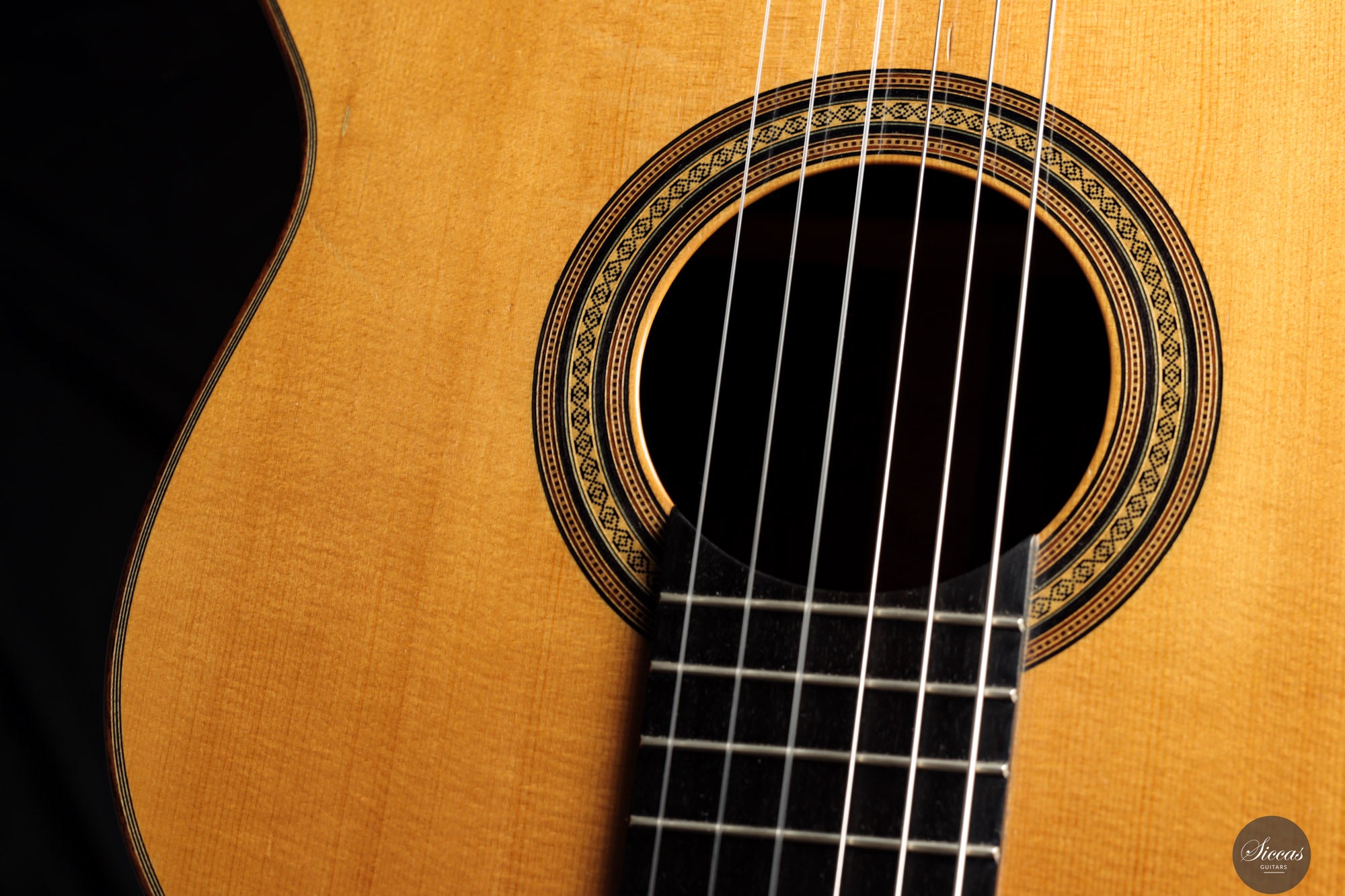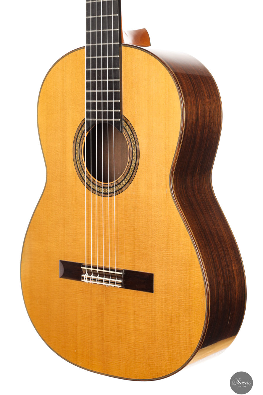 Diese im Jahr 1988 gebaute Gitarre ist ein hervorragendes Beispiel für die traditionelle Arbeit von Robert Ruck. Sie verfügt über eine Fichtendecke, Boden und Zargen aus Palisander und ein Nitrocellulose-Finish. Die Materialwahl steht für Eleganz und klangliche Raffinesse und bietet Klarheit, Projektion und Ausgewogenheit über alle Register. Mit einer Mensur von 650 mm und einer Sattelbreite von 53 mm bietet sie eine komfortable Spielbarkeit. Ergänzt wird dies durch Sloane-Mechaniken und eine Besaitung mit Knobloch EDC 34.0.