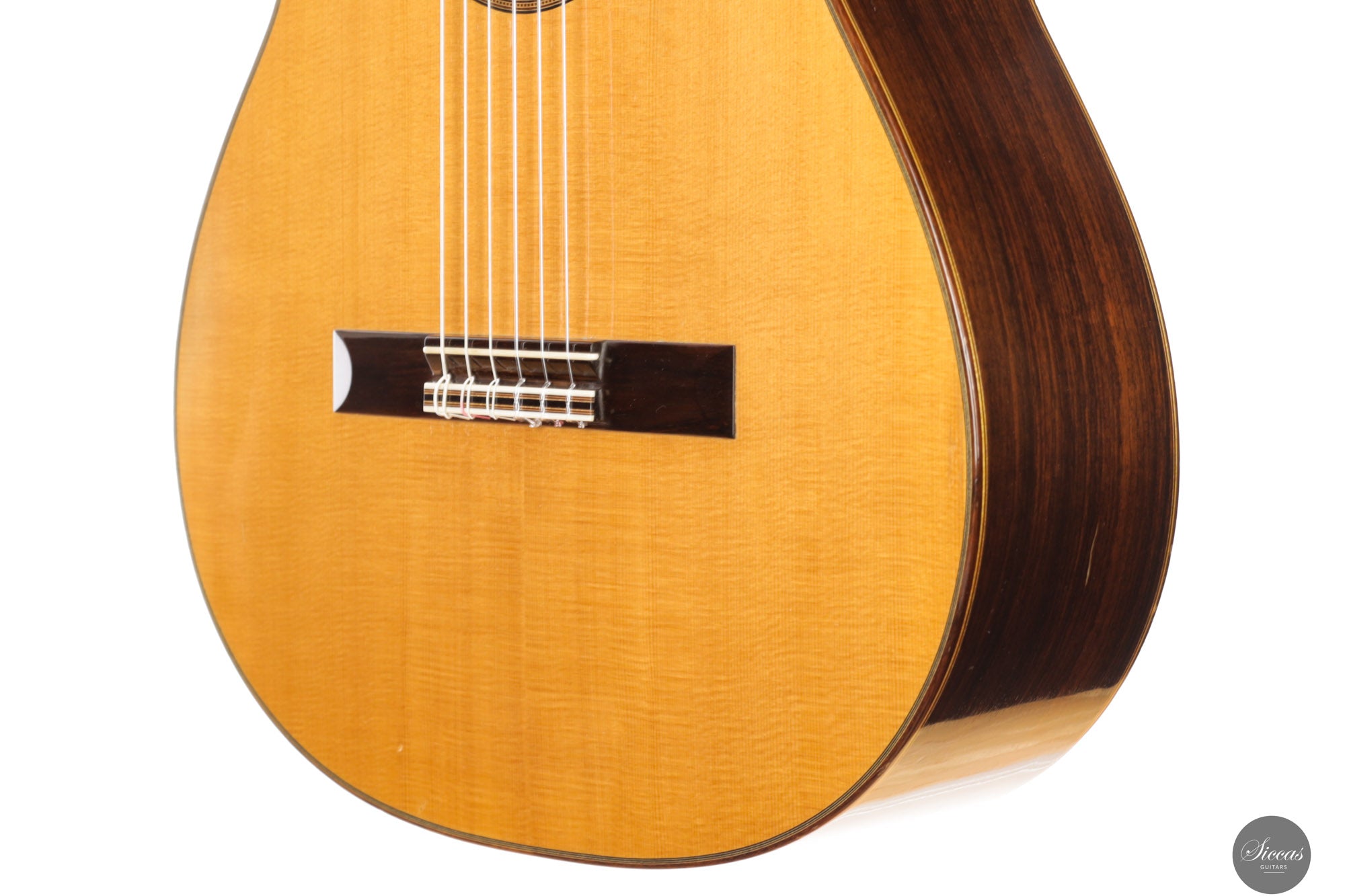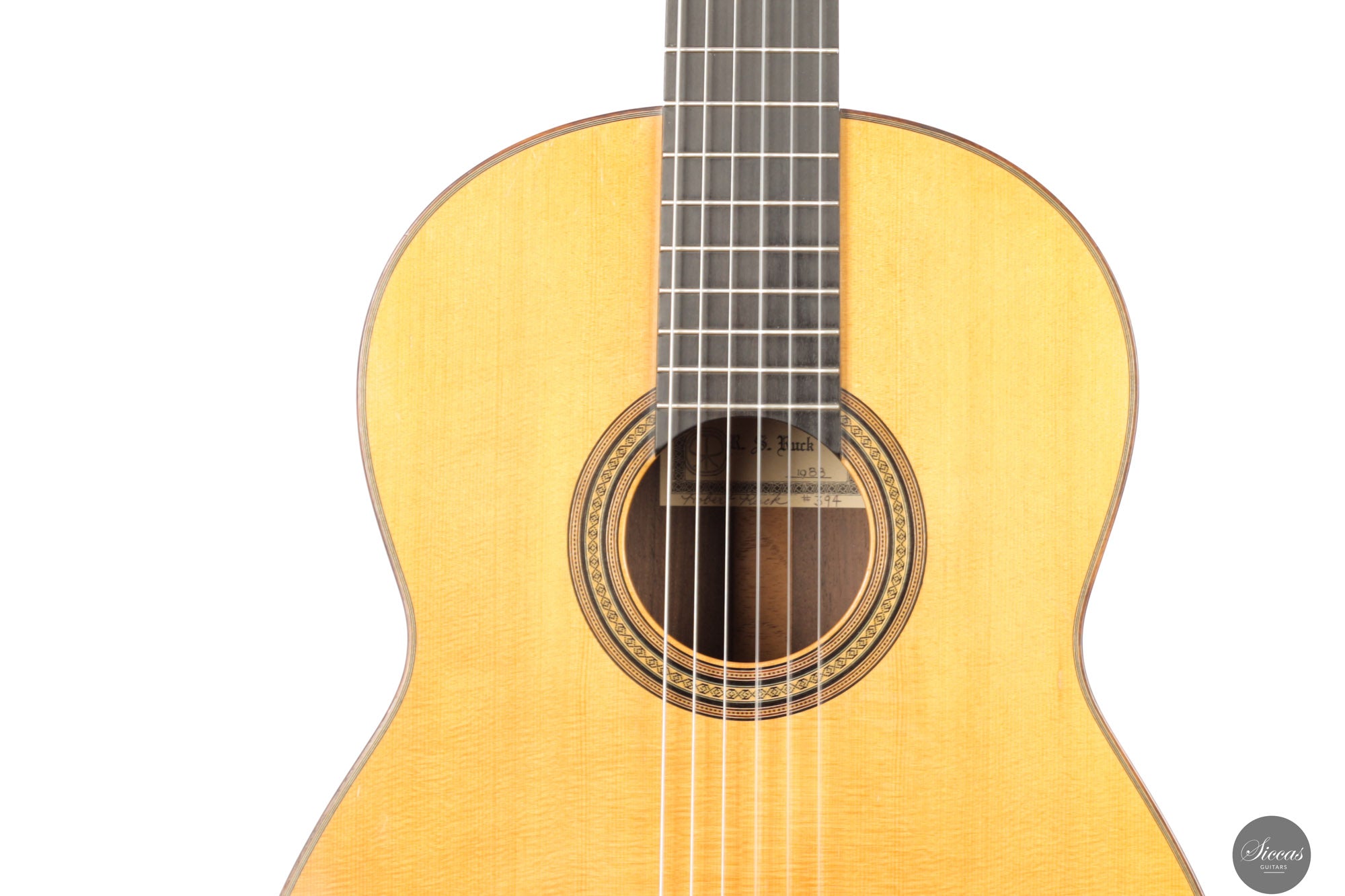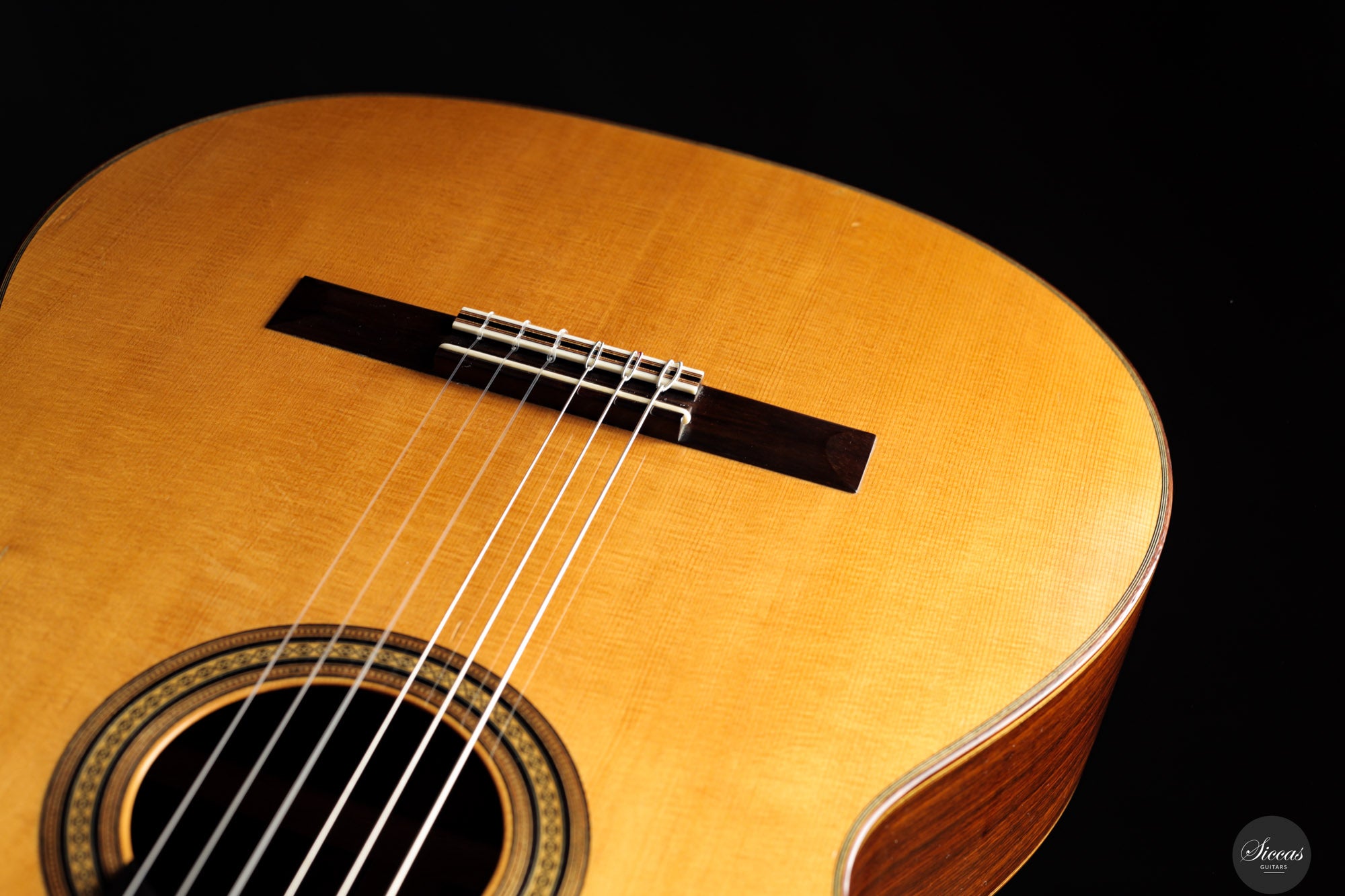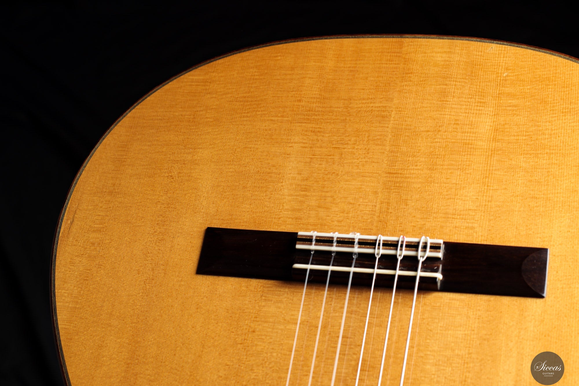 Diese im Jahr 1988 gebaute Gitarre ist ein hervorragendes Beispiel für die traditionelle Arbeit von Robert Ruck. Sie verfügt über eine Fichtendecke, Boden und Zargen aus Palisander und ein Nitrocellulose-Finish. Die Materialwahl steht für Eleganz und klangliche Raffinesse und bietet Klarheit, Projektion und Ausgewogenheit über alle Register. Mit einer Mensur von 650 mm und einer Sattelbreite von 53 mm bietet sie eine komfortable Spielbarkeit. Ergänzt wird dies durch Sloane-Mechaniken und eine Besaitung mit Knobloch EDC 34.0.
