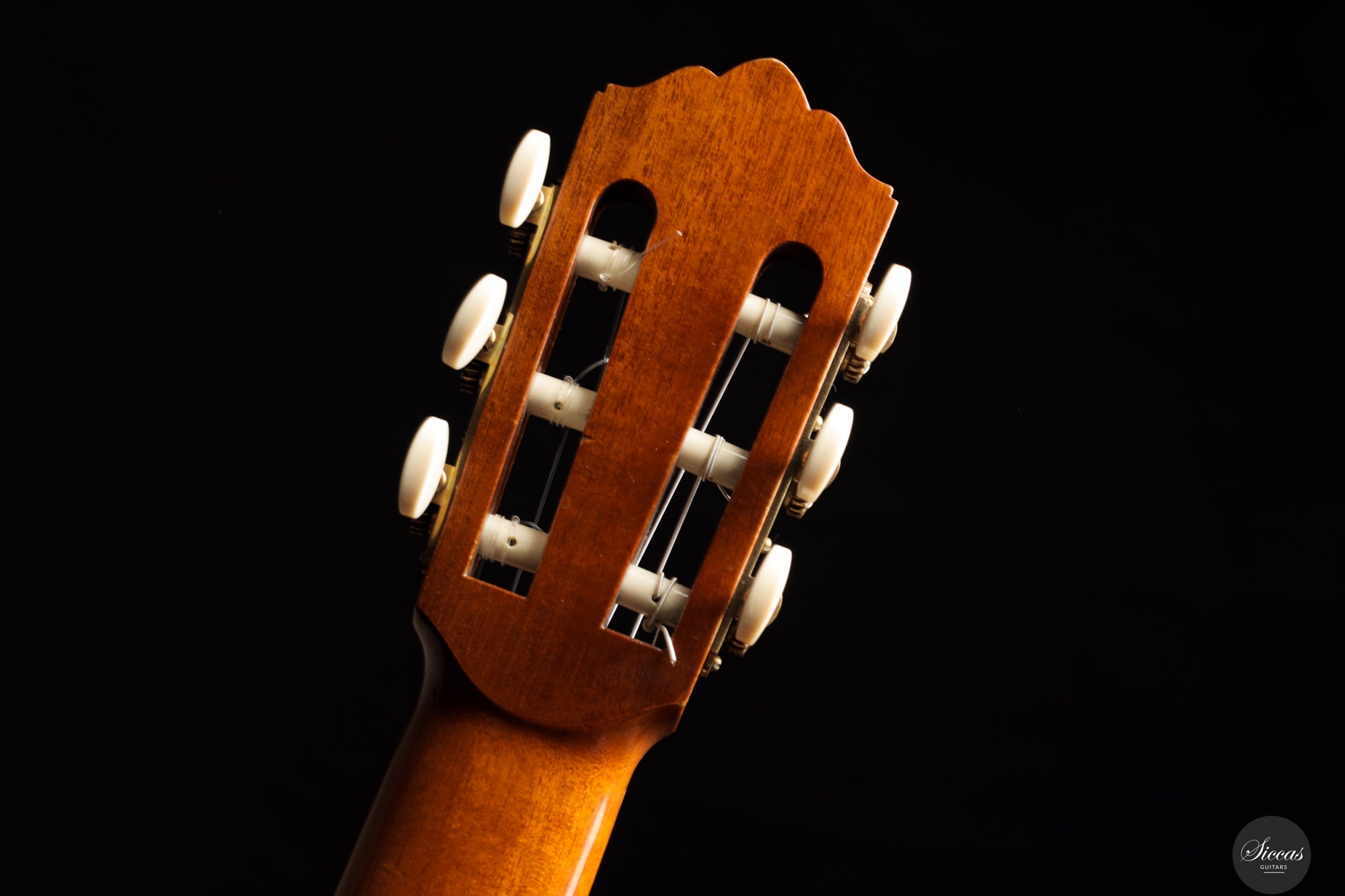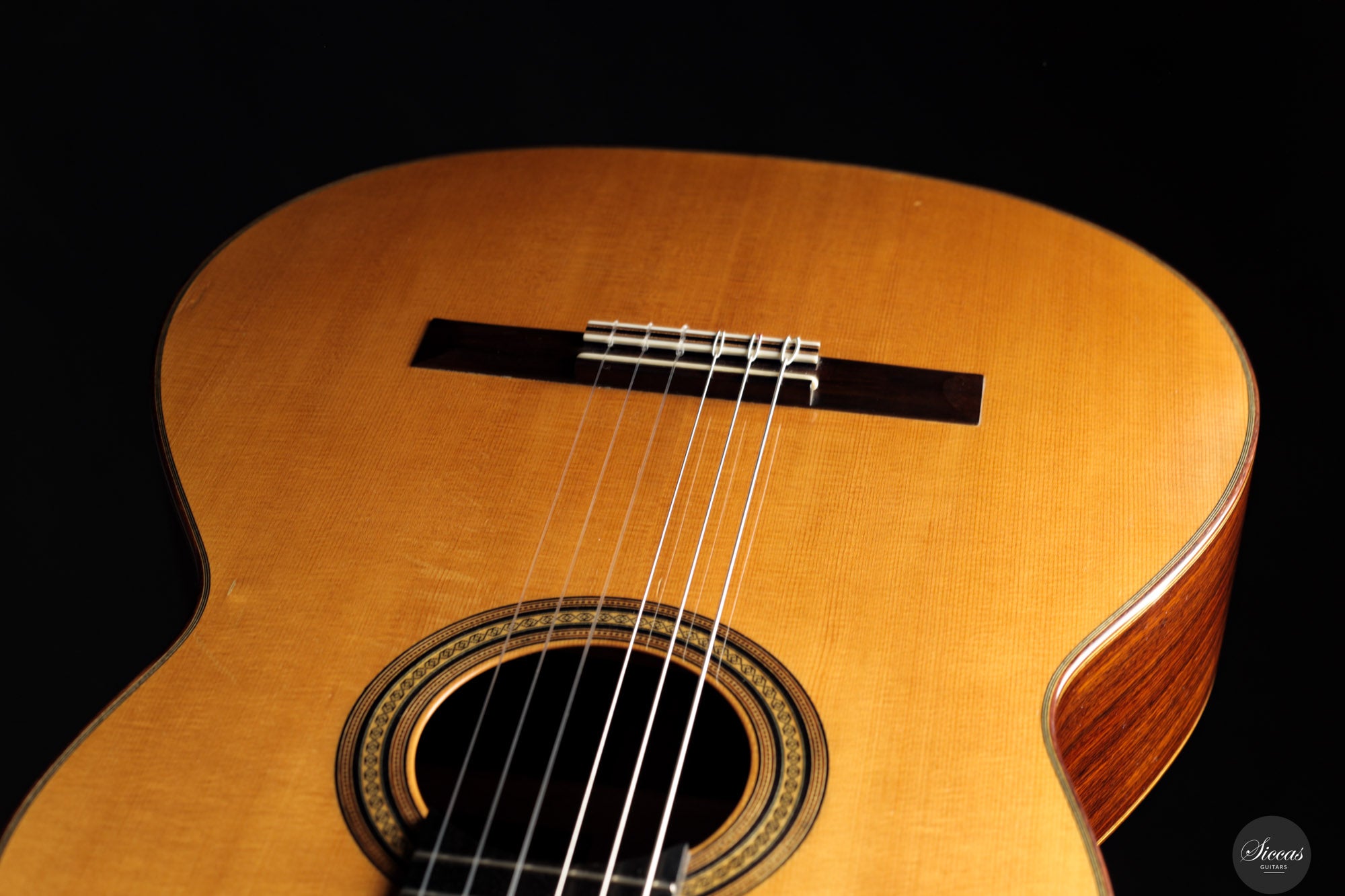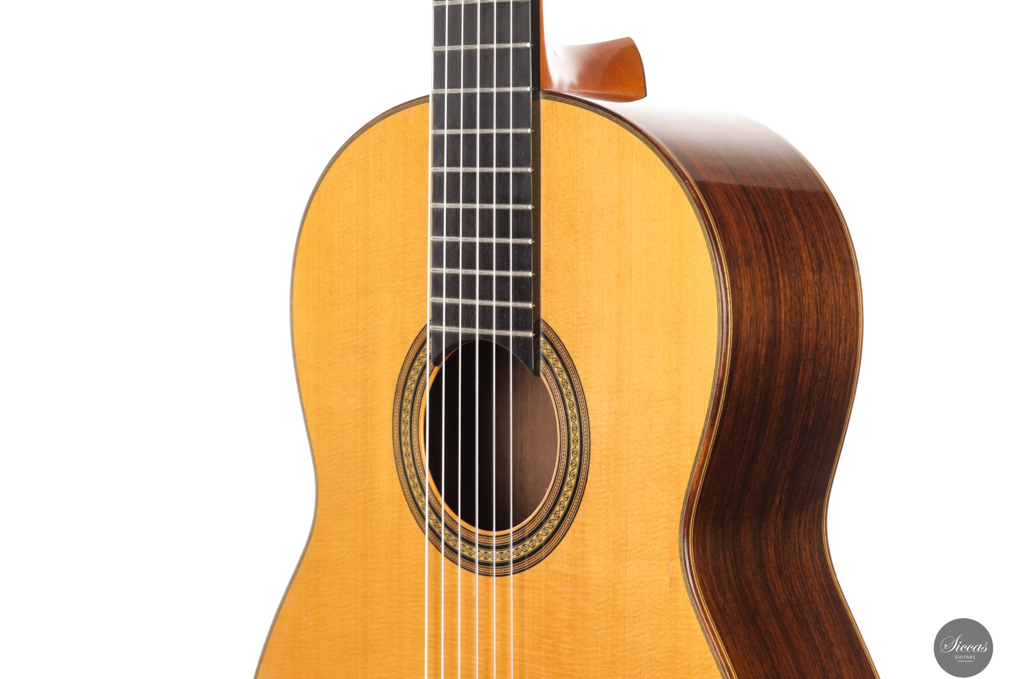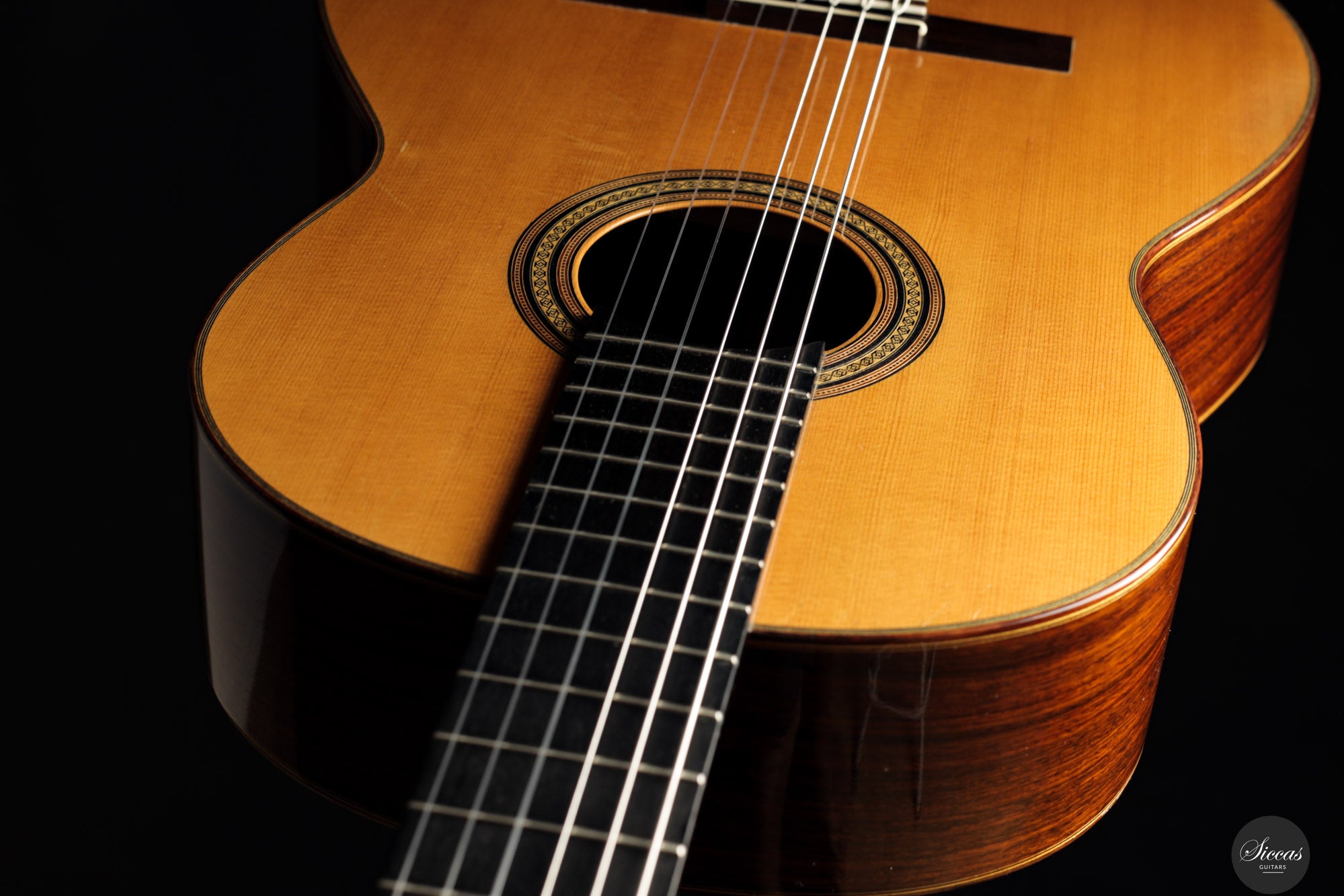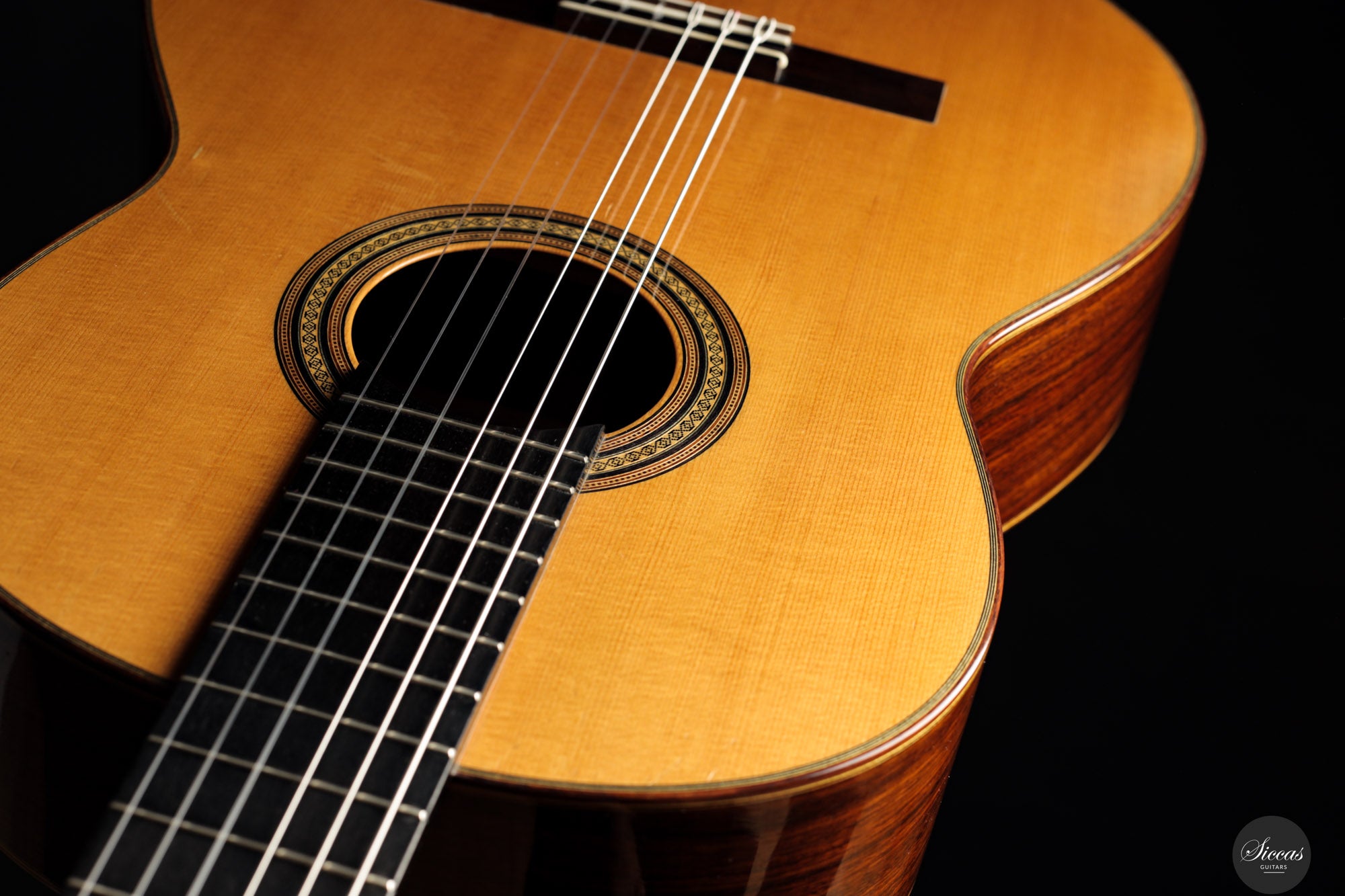 Diese im Jahr 1988 gebaute Gitarre ist ein hervorragendes Beispiel für die traditionelle Arbeit von Robert Ruck. Sie verfügt über eine Fichtendecke, Boden und Zargen aus Palisander und ein Nitrocellulose-Finish. Die Materialwahl steht für Eleganz und klangliche Raffinesse und bietet Klarheit, Projektion und Ausgewogenheit über alle Register. Mit einer Mensur von 650 mm und einer Sattelbreite von 53 mm bietet sie eine komfortable Spielbarkeit. Ergänzt wird dies durch Sloane-Mechaniken und eine Besaitung mit Knobloch EDC 34.0.