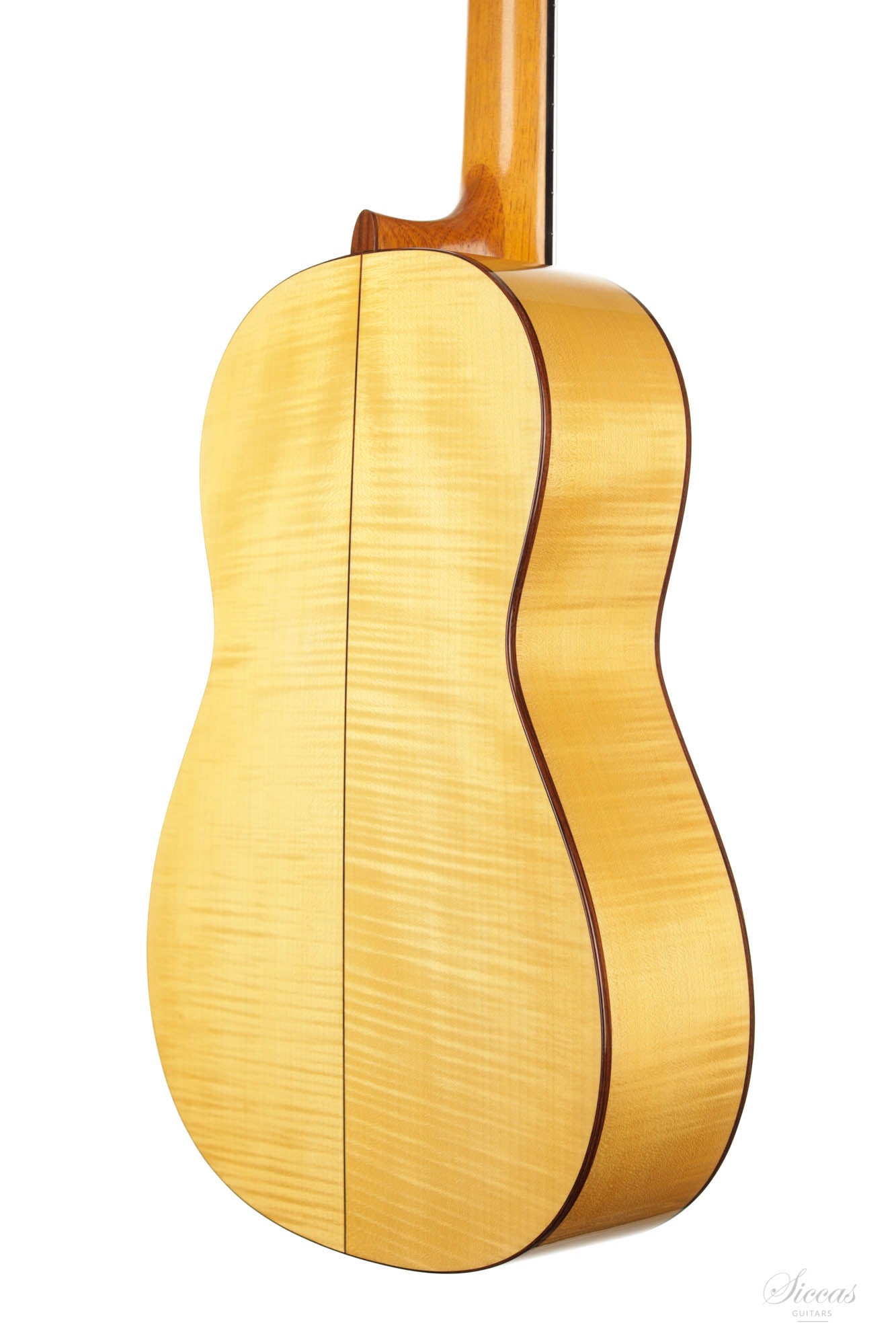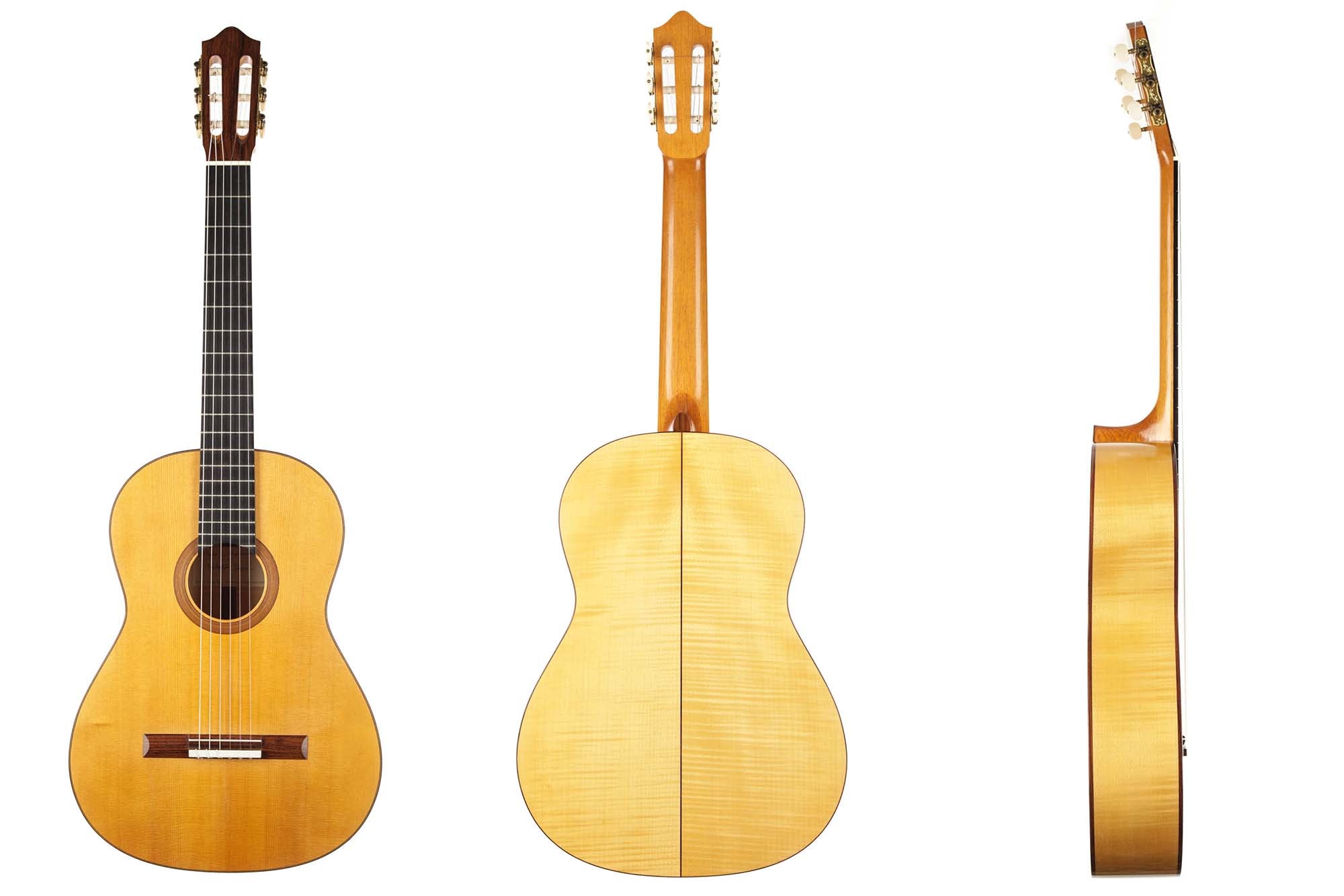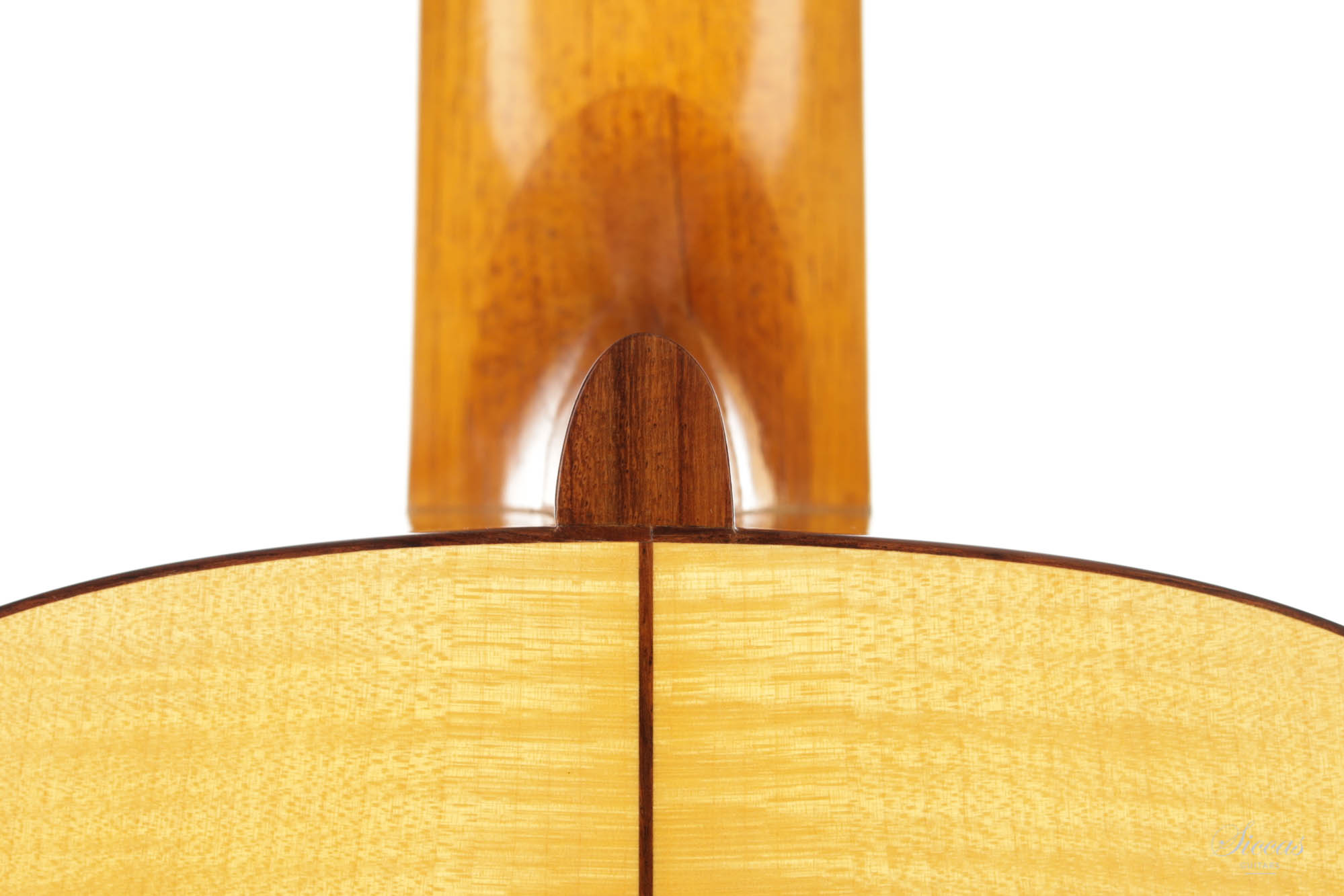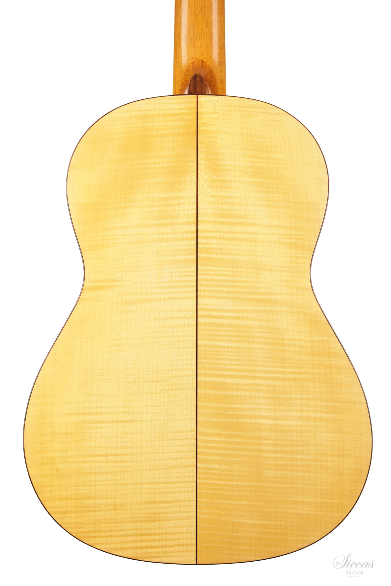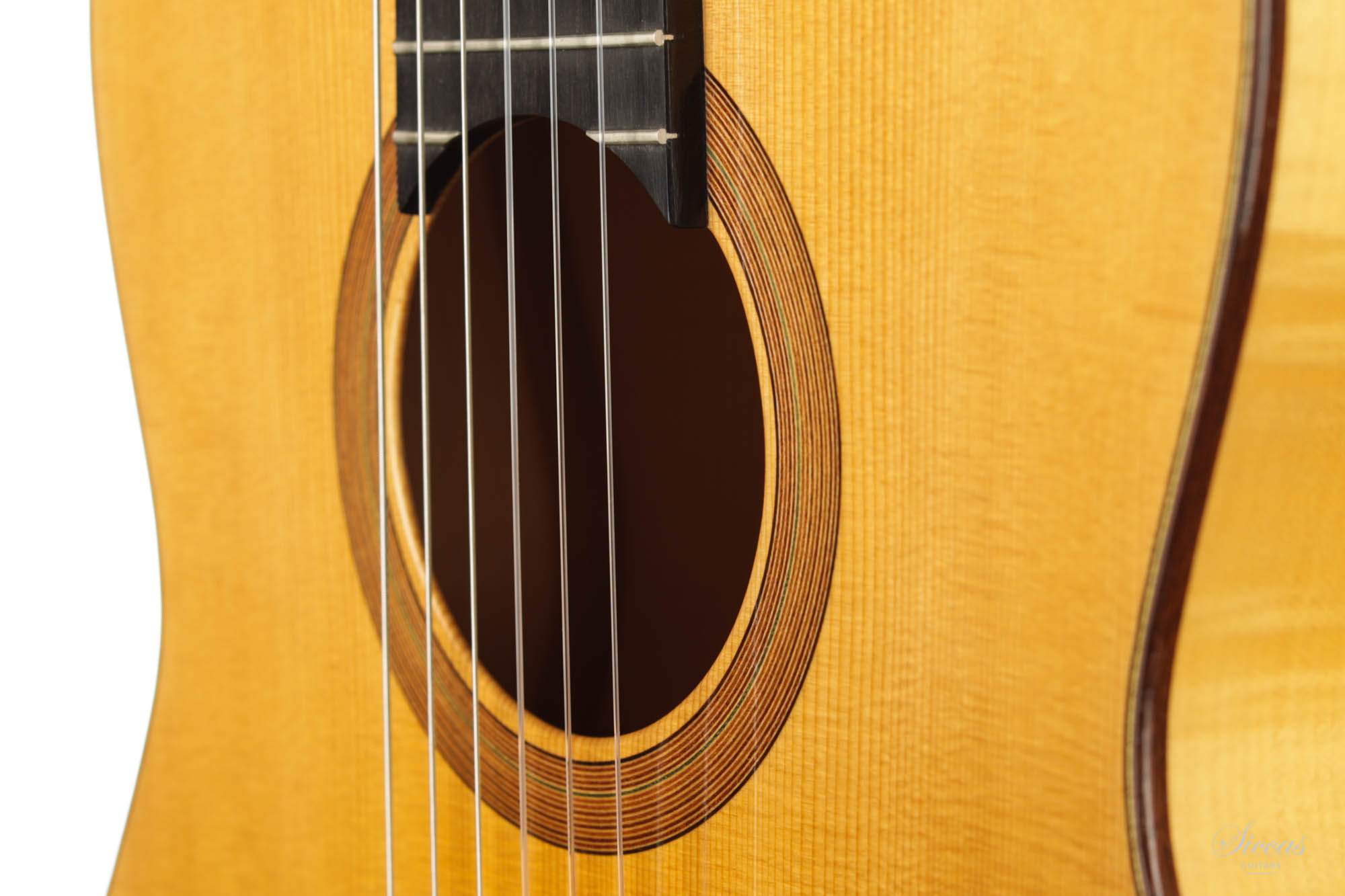This superb guitar built in 2005 is all about finesse and elegance. Its very light and traditional maple construction gives it a special charm. In addition, it has a sober but extremely elegant rosette with a two-tone fillet construction, and a pleasant highlight in the form of a green fillet that enhances the overall colour of the marquetry and catches the eye immediately. This guitar is in perfect playing condition and three perfectly repaired cracks are visible on the soundboard. Of course, the price of this guitar takes this into account and it is therefore a unique opportunity to obtain an instrument of such quality for a sensible price.