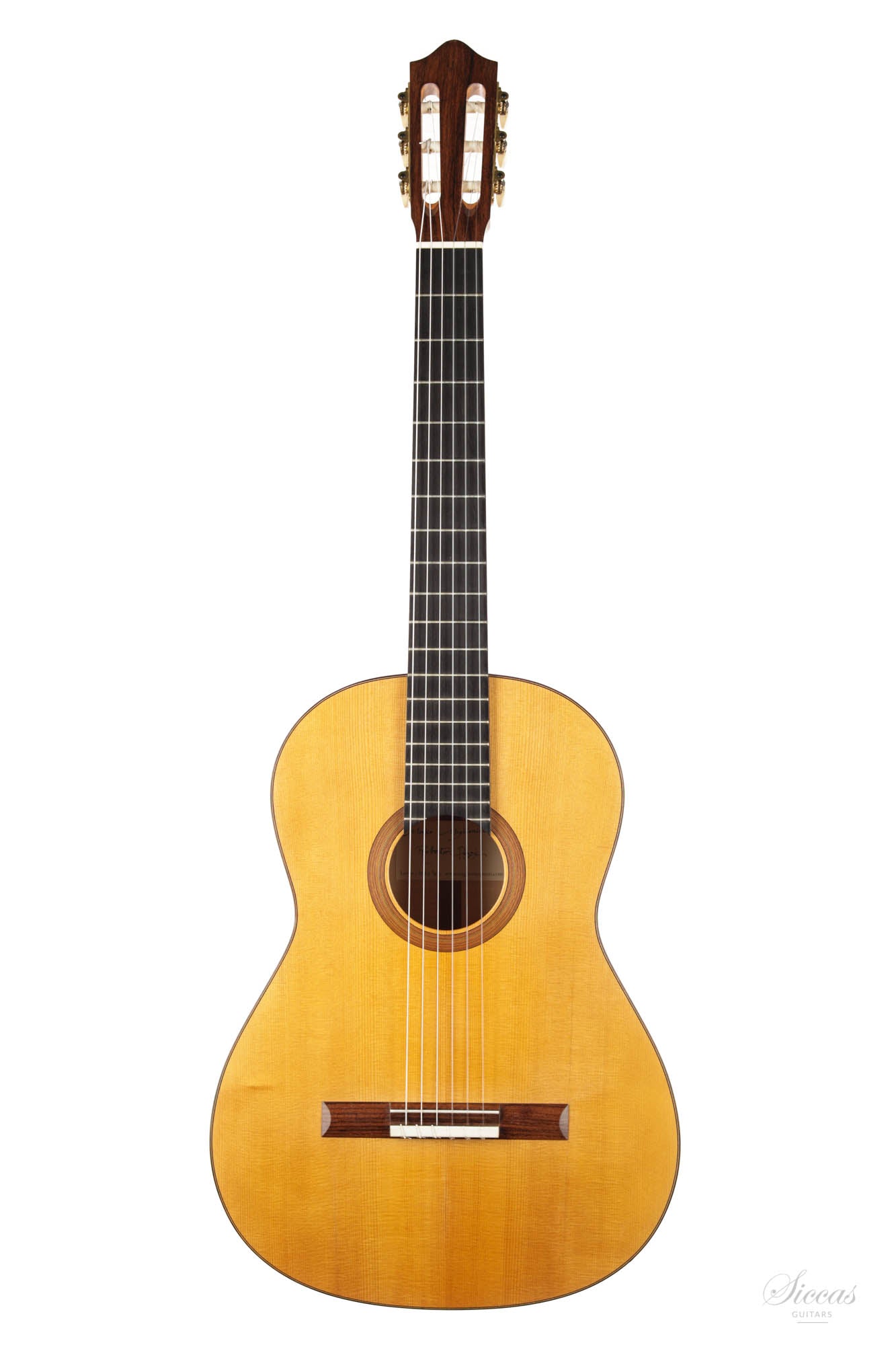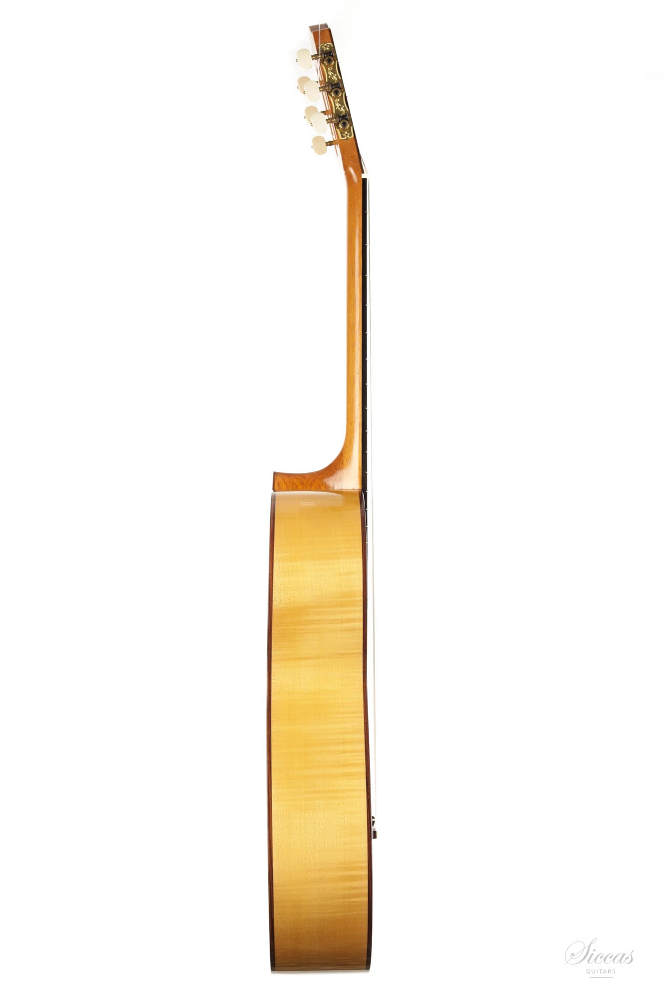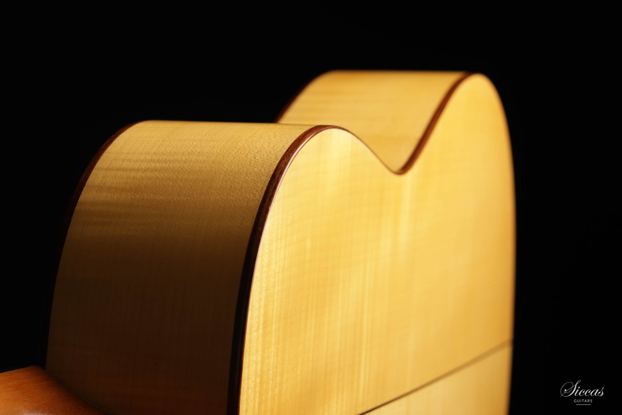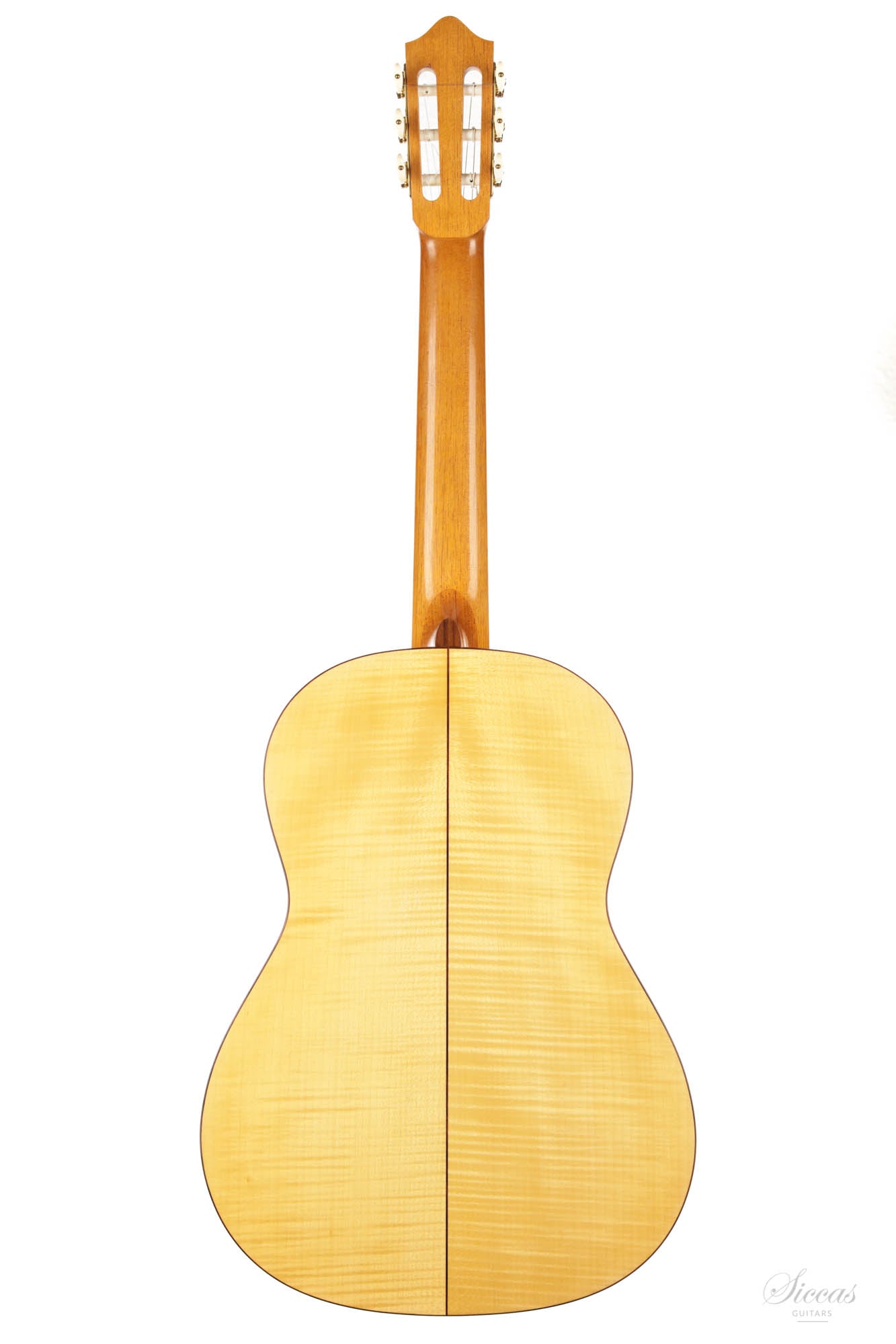 This superb guitar built in 2005 is all about finesse and elegance. Its very light and traditional maple construction gives it a special charm. In addition, it has a sober but extremely elegant rosette with a two-tone fillet construction, and a pleasant highlight in the form of a green fillet that enhances the overall colour of the marquetry and catches the eye immediately. This guitar is in perfect playing condition and three perfectly repaired cracks are visible on the soundboard. Of course, the price of this guitar takes this into account and it is therefore a unique opportunity to obtain an instrument of such quality for a sensible price.
