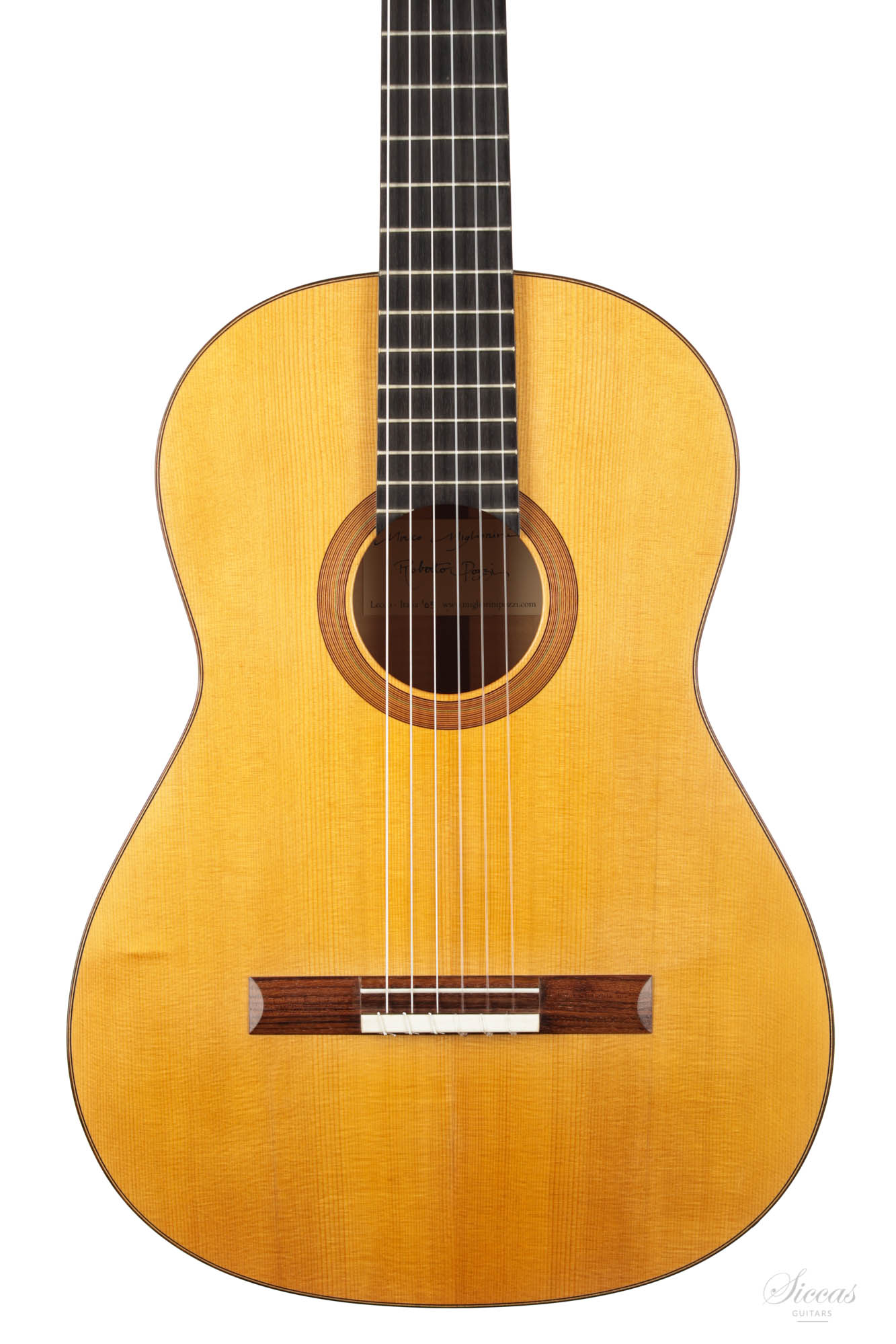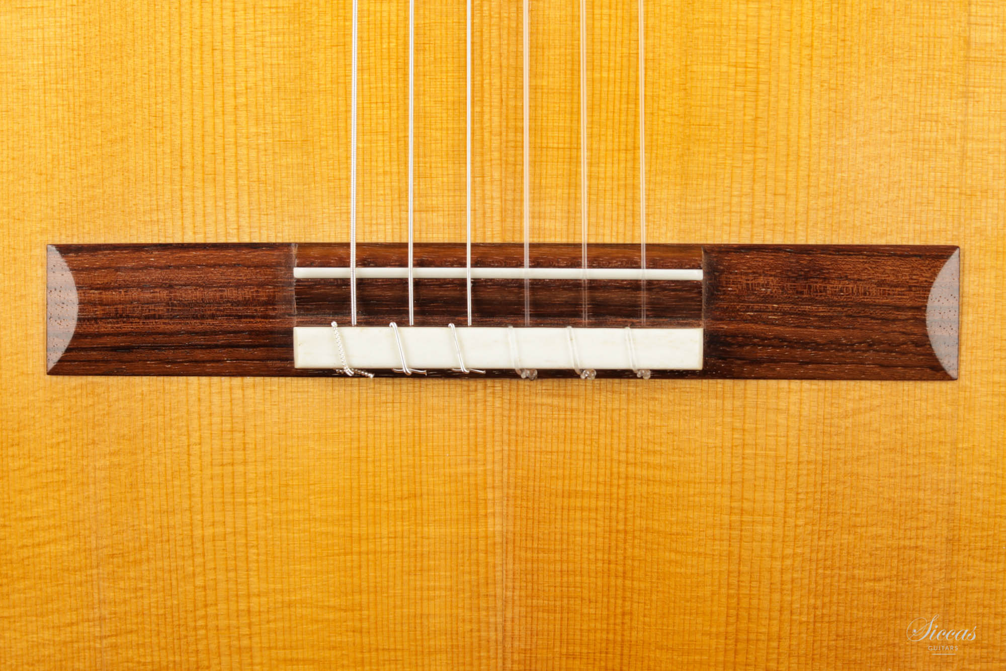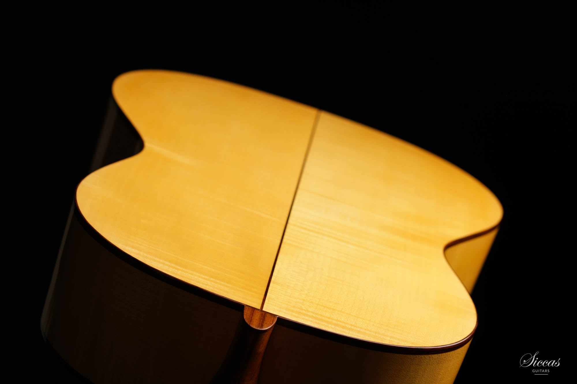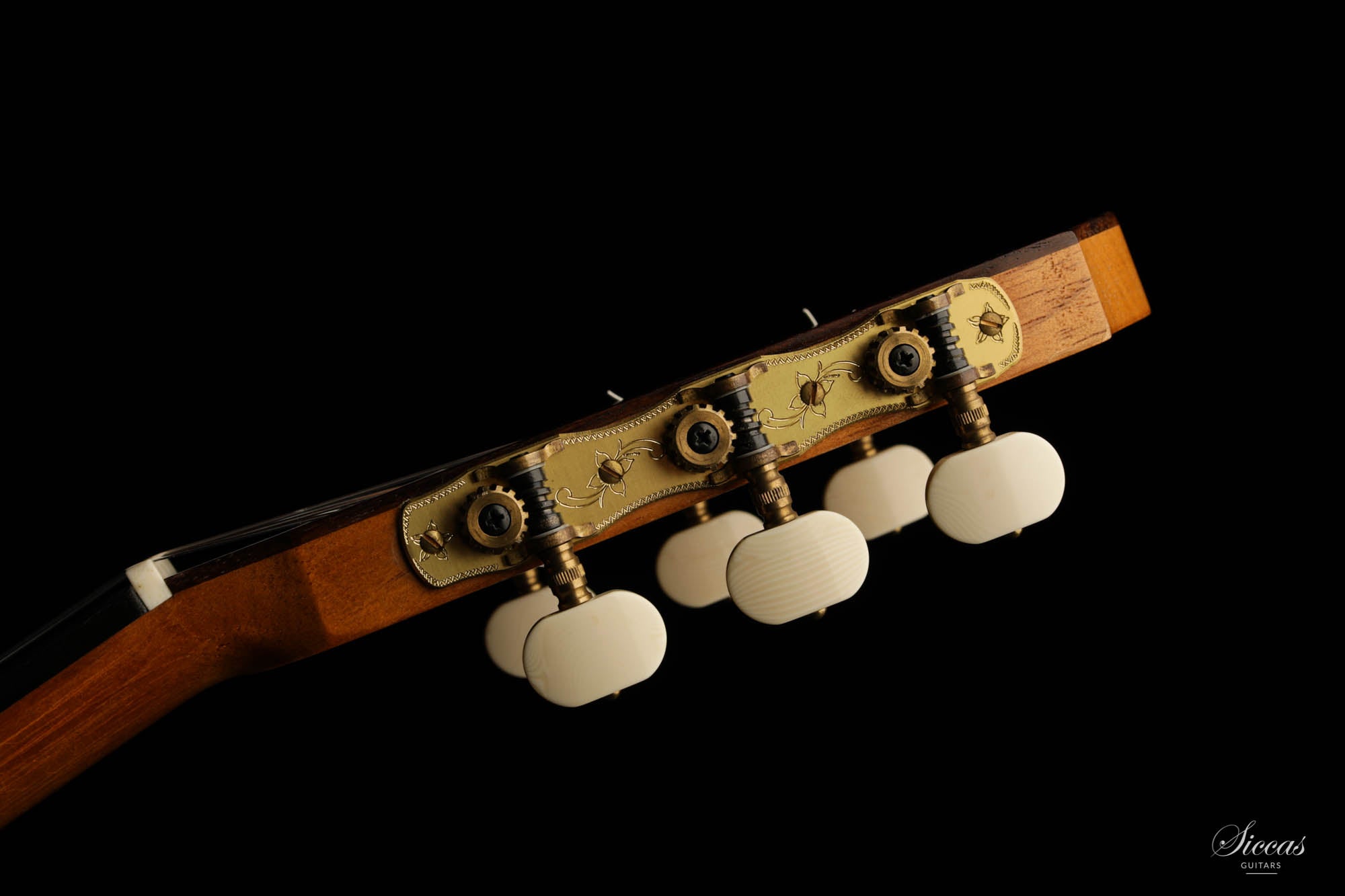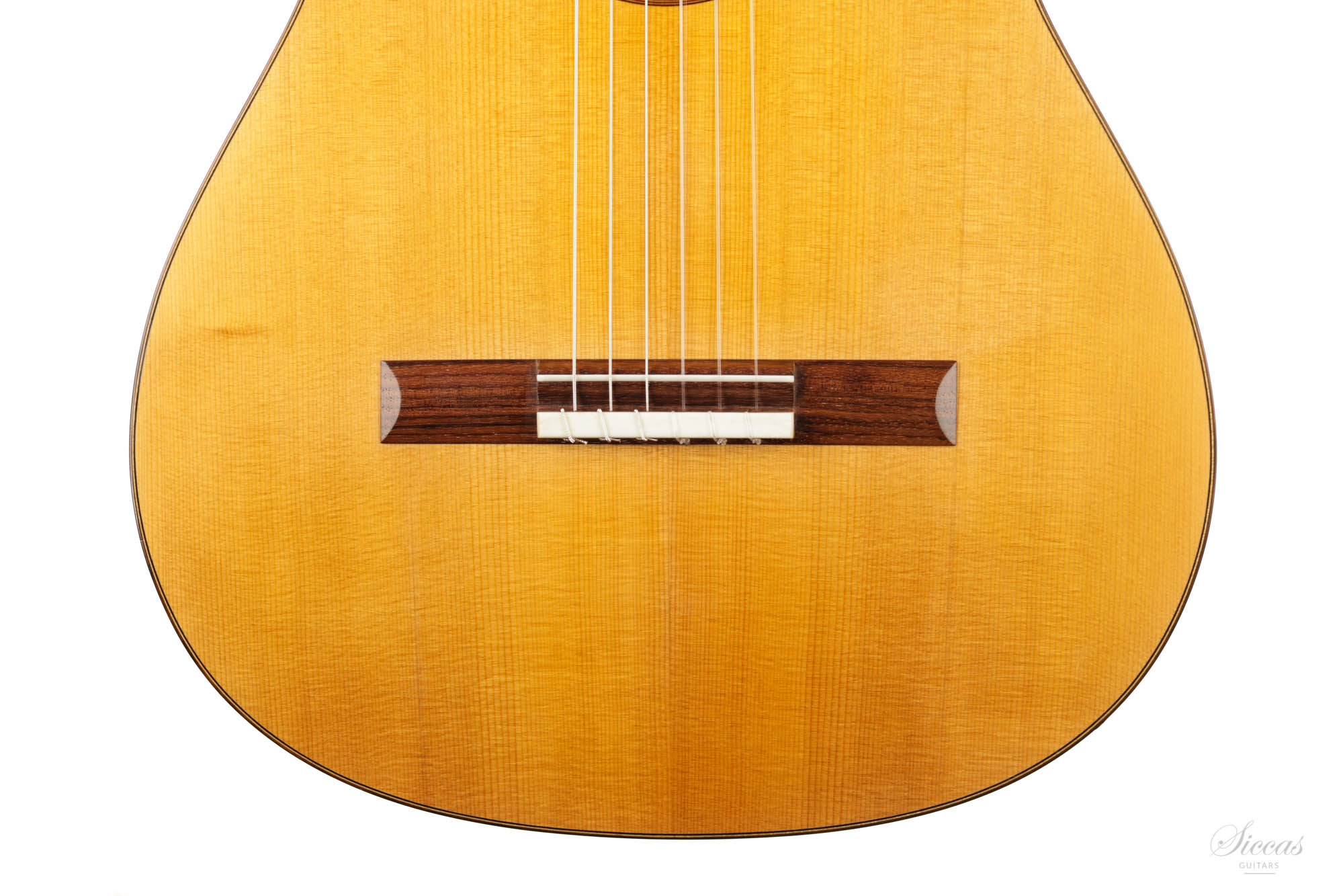 This superb guitar built in 2005 is all about finesse and elegance. Its very light and traditional maple construction gives it a special charm. In addition, it has a sober but extremely elegant rosette with a two-tone fillet construction, and a pleasant highlight in the form of a green fillet that enhances the overall colour of the marquetry and catches the eye immediately. This guitar is in perfect playing condition and three perfectly repaired cracks are visible on the soundboard. Of course, the price of this guitar takes this into account and it is therefore a unique opportunity to obtain an instrument of such quality for a sensible price.