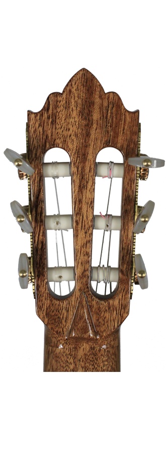 Diese wunderschöne Gitarre wurde in Zusammenarbeit mit Siccas Guitars entwickelt. Bei diesem Gitarrenmodell handelt es sich um eine Sonderserie, die nur bei Siccas Guitars erhältlich ist. Die Gitarre verfügt über eine Vielzahl von Besonderheiten (Design, Bevel, Maße,...), die so nur bei diesem Instrument zu finden sind. Dekorative Elemente wie Rosette und Randdekor wurden speziell von Roy Fankhänel entworfen und geben dem Instrument eine traditionelle und prächtige Optik. Der Kopf besitzt eine besonders aufwändig gestaltete Krone mit Schnitzerei, dessen Design extra für dieses Gitarrenmodell entworfen wurde. Perfekt in das Gesamtbild fügt sich der Steg mit 12-Loch-Bohrung ein. Er wird zusätzlich durch eine schöne Perlmutterumrandung am Knüpfblock verziert. Auffällig sind auch die Ränder aus Ovangkol, die den edlen Charakter der Gitarre unterstreichen. Das Innenleben (Klötzchen und Bodenleisten) besteht außer auf der Decke komplett aus Mahagoni. Die Deckenbeleistung besteht aus Fichte. Das erhöhte Griffbrett erleichtert das Spiel in den hohen Lagen und verbessert den Klang in diesem Bereich spürbar. Dieses neue Modelle hat zudem ein Bevel (Korpusabschrägung zur besseren Armauflage). Die Mechaniken sind von Alessi.