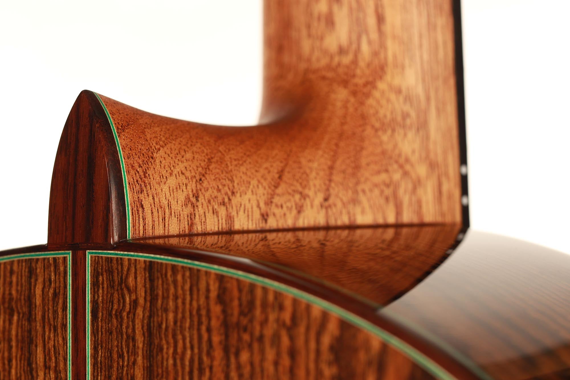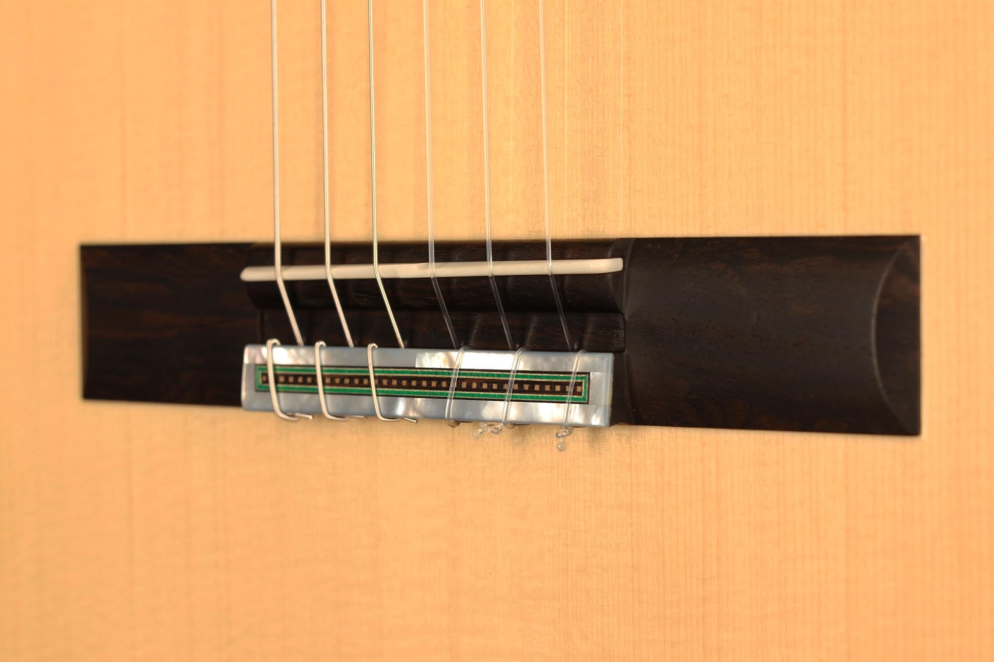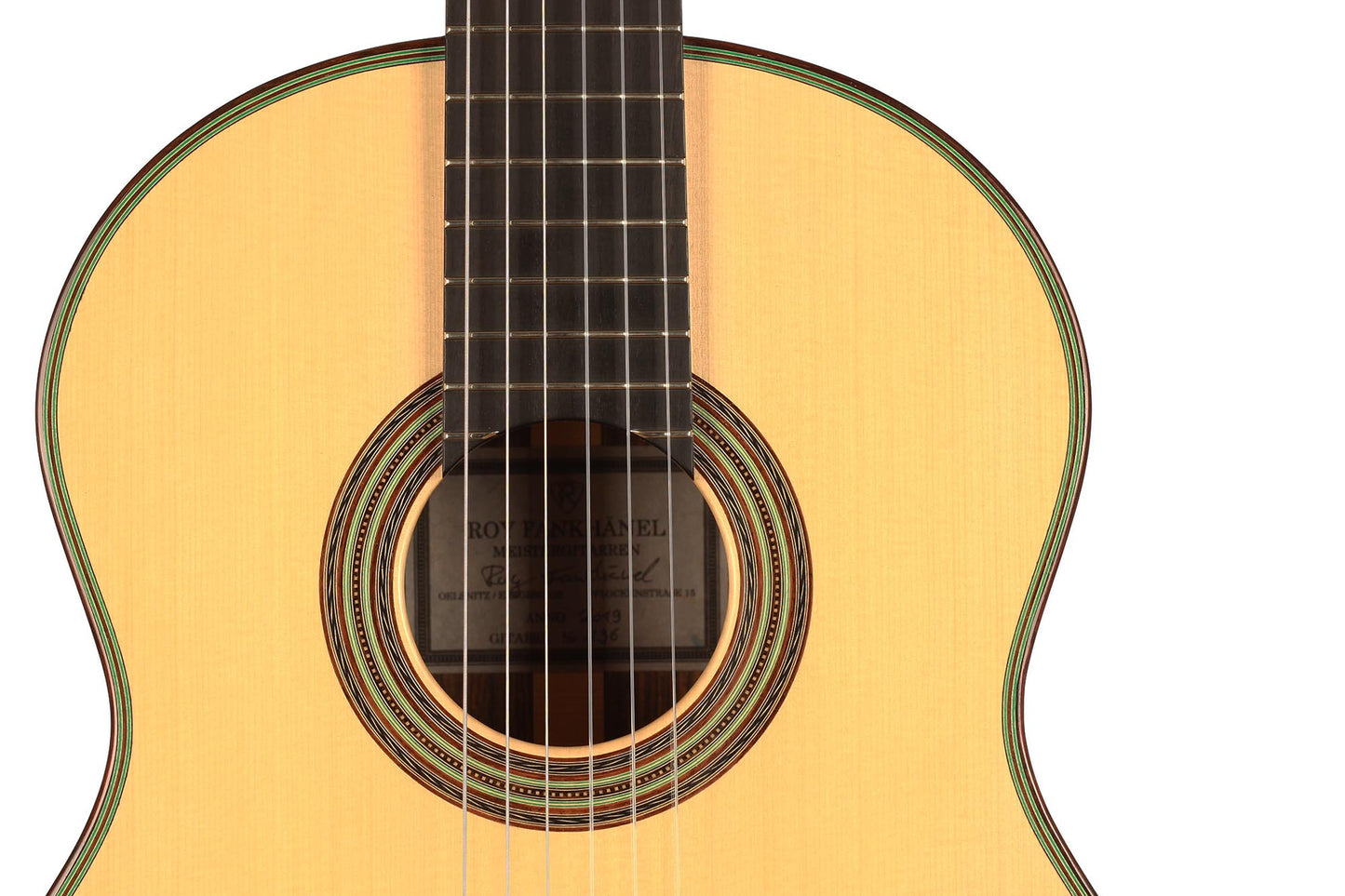 Diese Gitarre wurde von Antonio de Torres inspiriert und folgt der Idee einer modernen Interpretation der traditionellen spanischen Gitarre. Es handelt sich um ein Instrument mit einem feinen, farbenreichen Ton, das sehr sensibel auf den Anschlag reagiert und ein charmantes Timbre zum Ausdruck bringt. Dennoch erinnern uns einige Details daran, dass diese Gitarre ein zeitgenössisches Konzertinstrument ist, das Konzertsäle füllen kann und einige Elemente wie das erhöhte Griffbrett und der gewachste Hals wurden gebaut, um die Spielbarkeit zu optimieren. Roy ist auch bekannt dafür, kundenspezifische Instrumente zu bauen. Die klassische Gitarrisitin Heike Matthiesen beispielsweise spielt eine Gitarre von Roy Fankhänel. Und auch außerhalb der klassischen Gitarrenszene gehören Gitarristen, wie der Linkshänder „Kuddel" von den "Toten Hosen" oder der Gitarrist von Max Raabes Palastorchester zu seinen Kunden. Schöne Mechanik Alessi sorgen für die Stimmung.