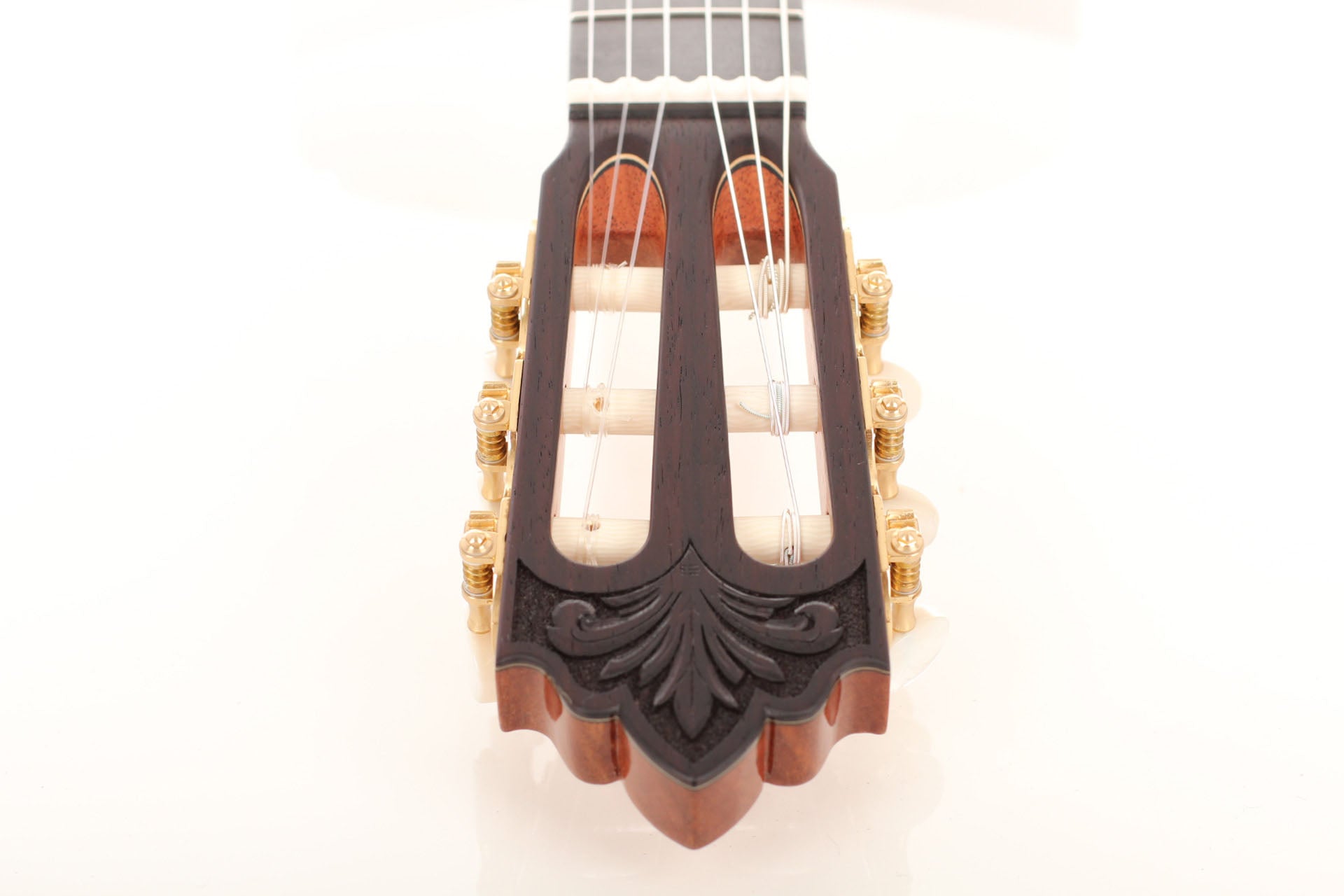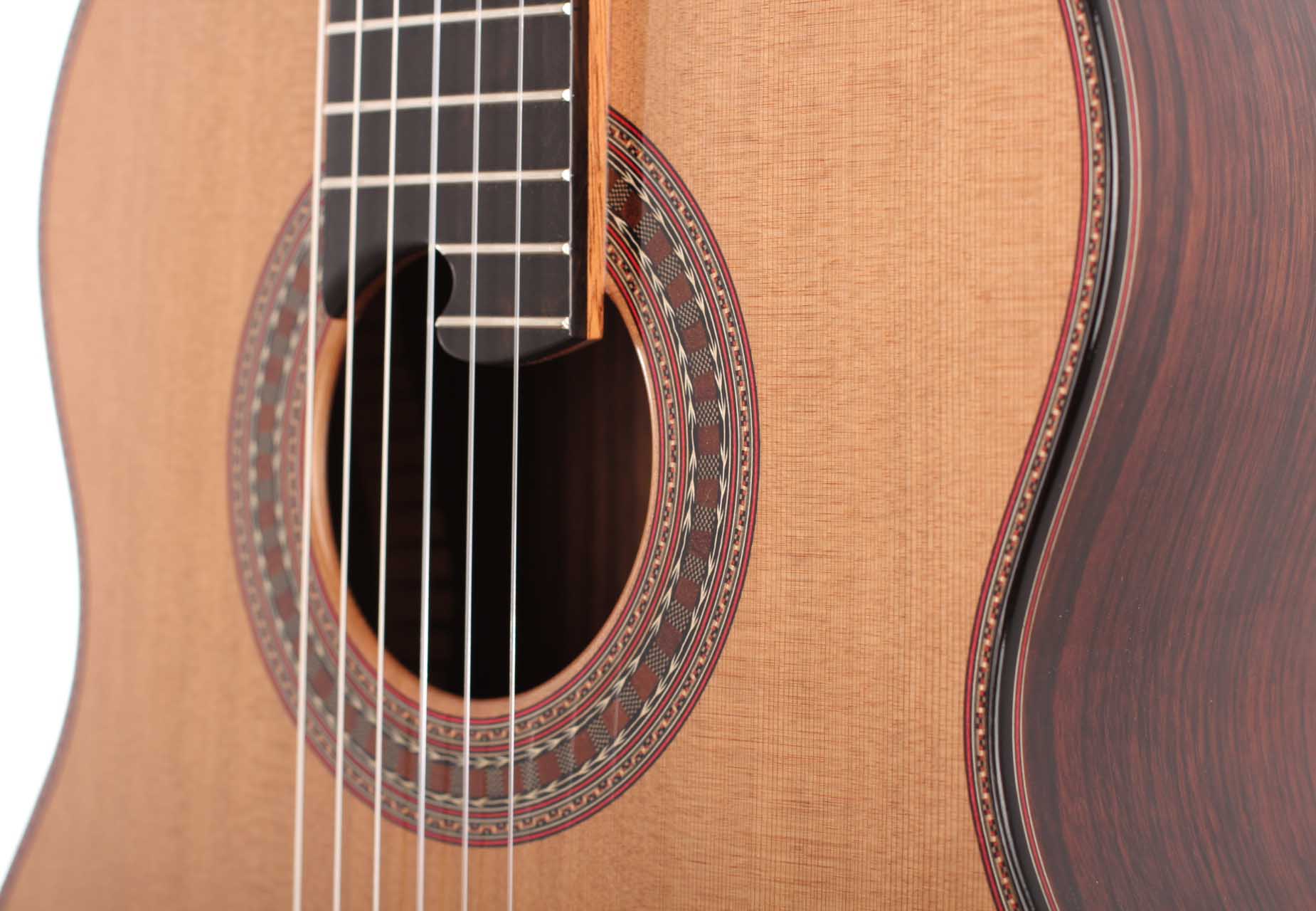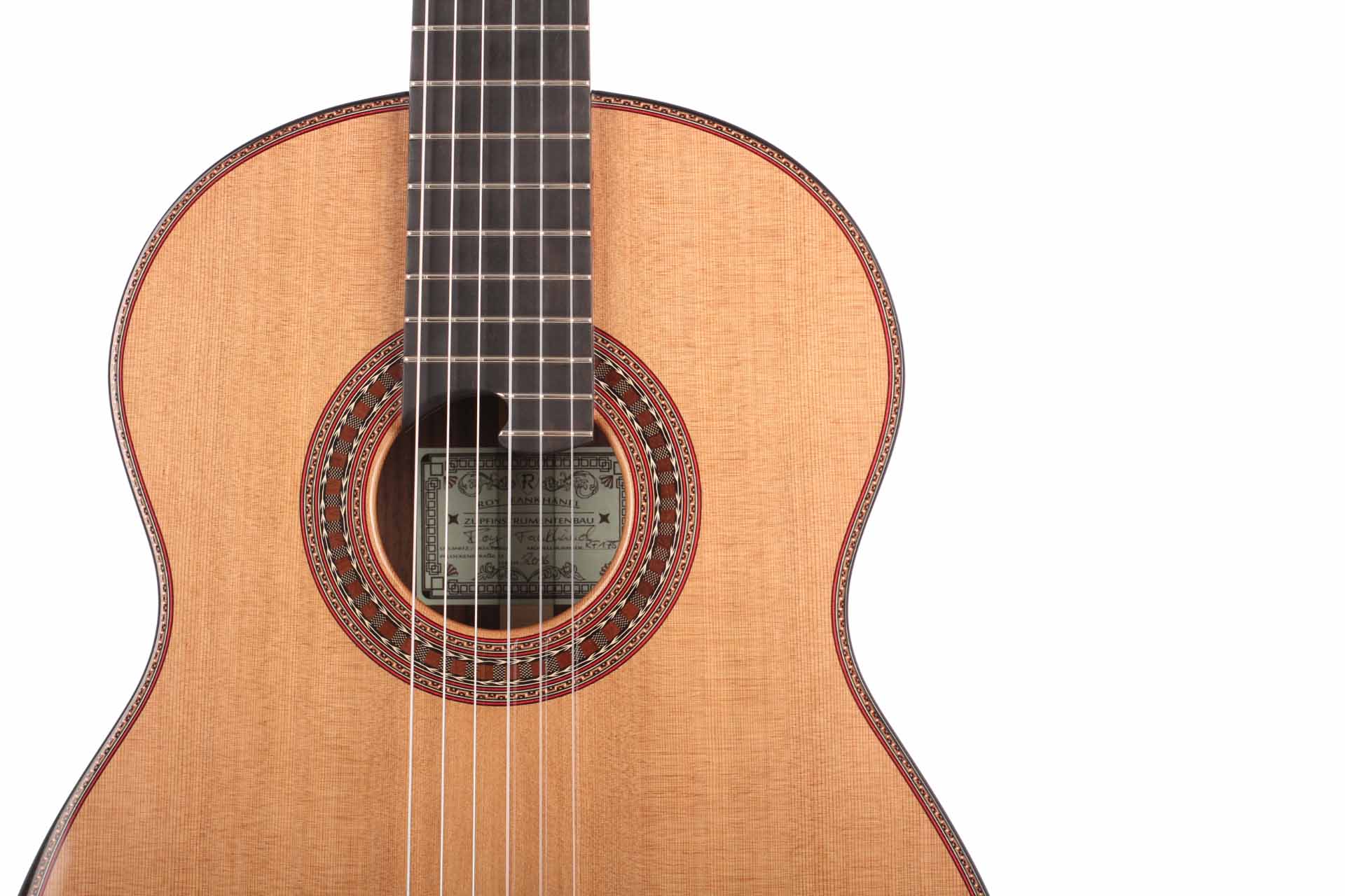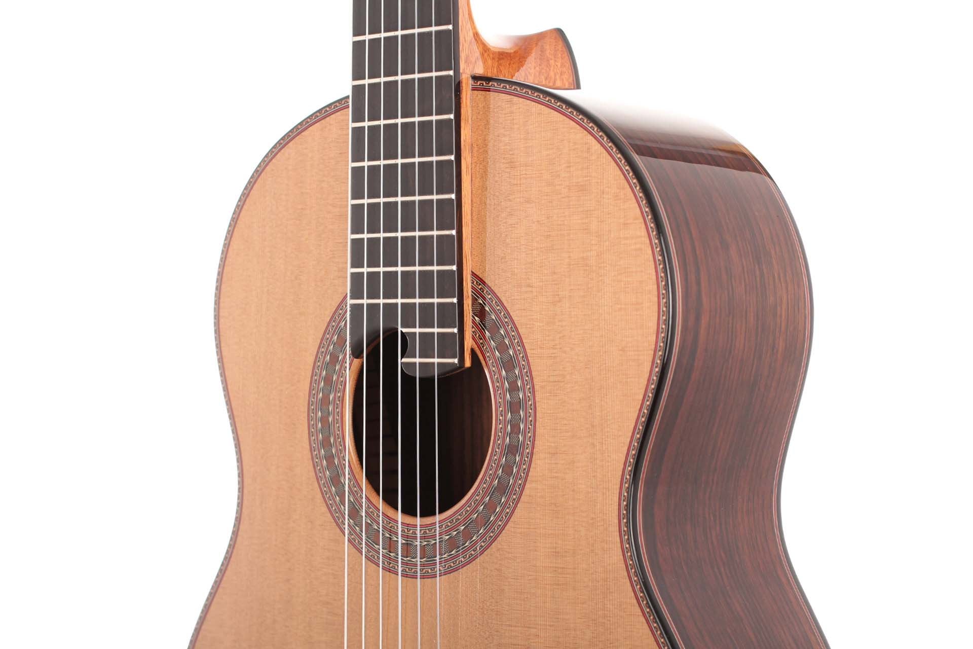Diese wunderschöne Gitarre wurde in Zusammenarbeit mit “Siccas Guitars” entwickelt. Bei diesem Gitarrenmodell handelt es sich um eine Sonderserie, die nur bei “Siccas Guitars” erhältlich ist. Die Gitarre verfügt über eine Vielzahl von Besonderheiten, die so nur bei diesem Instrument zu finden sind. Dekorative Elemente wie Rosette und die geschnitzte Kopfplatte und das Randdekor wurden speziell von Roy Fankhänel entworfen und geben dem Instrument eine traditionelle und prächtige Optik. Perfekt in das Gesamtbild fügt sich der Steg mit 12-Loch-Bohrung und das Bevel ein. Das Innenleben (Klötzchen und Bodenleisten) besteht außer auf der Decke komplett aus Mahagoni. Boden und Zargen bestehen aus karibischem Palisander und die Decke aus feinster Fichte. Die Deckenbeleistung besteht aus Zeder. Das erhöhte Griffbrett erleichtert das Spiel in den hohen Lagen und verbessert den Klang in diesem Bereich spürbar. Die Mechaniken sind von Rubner.