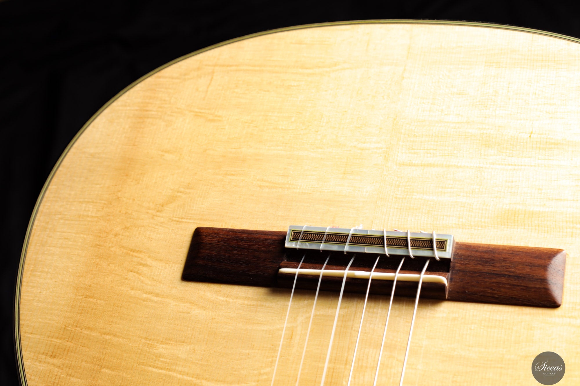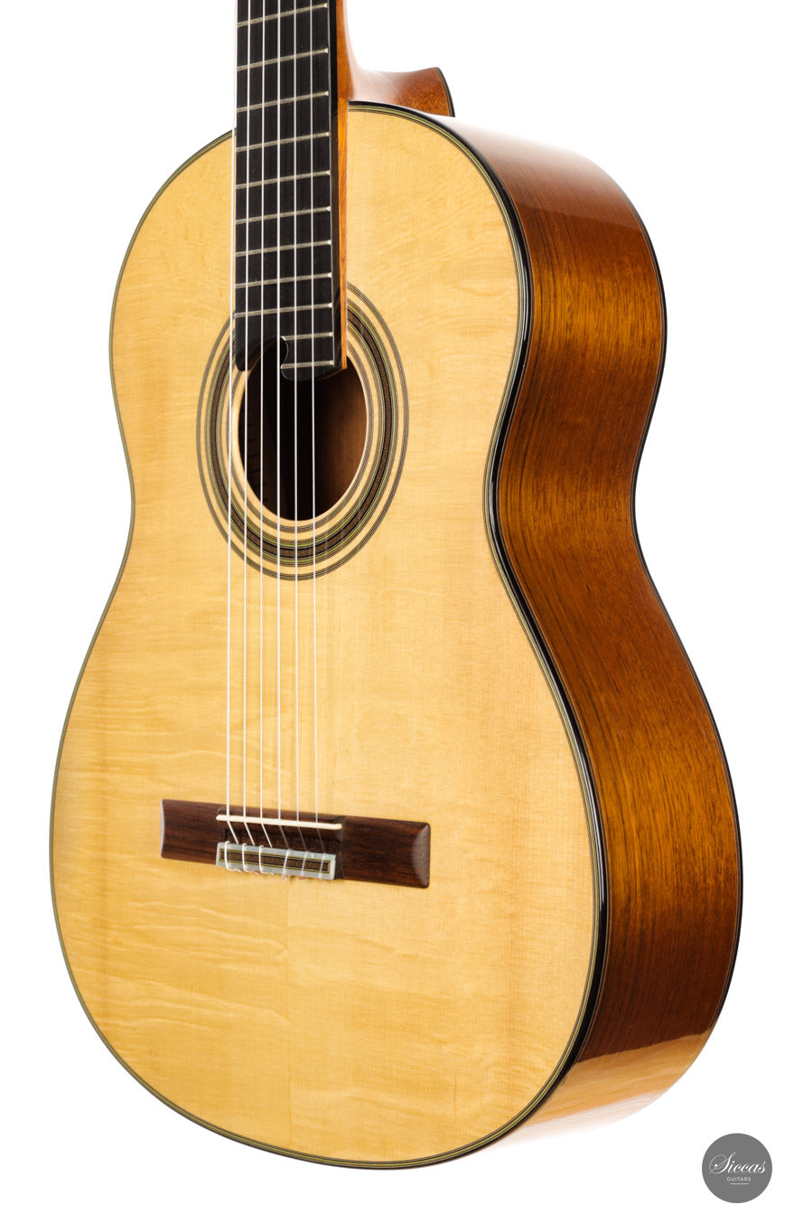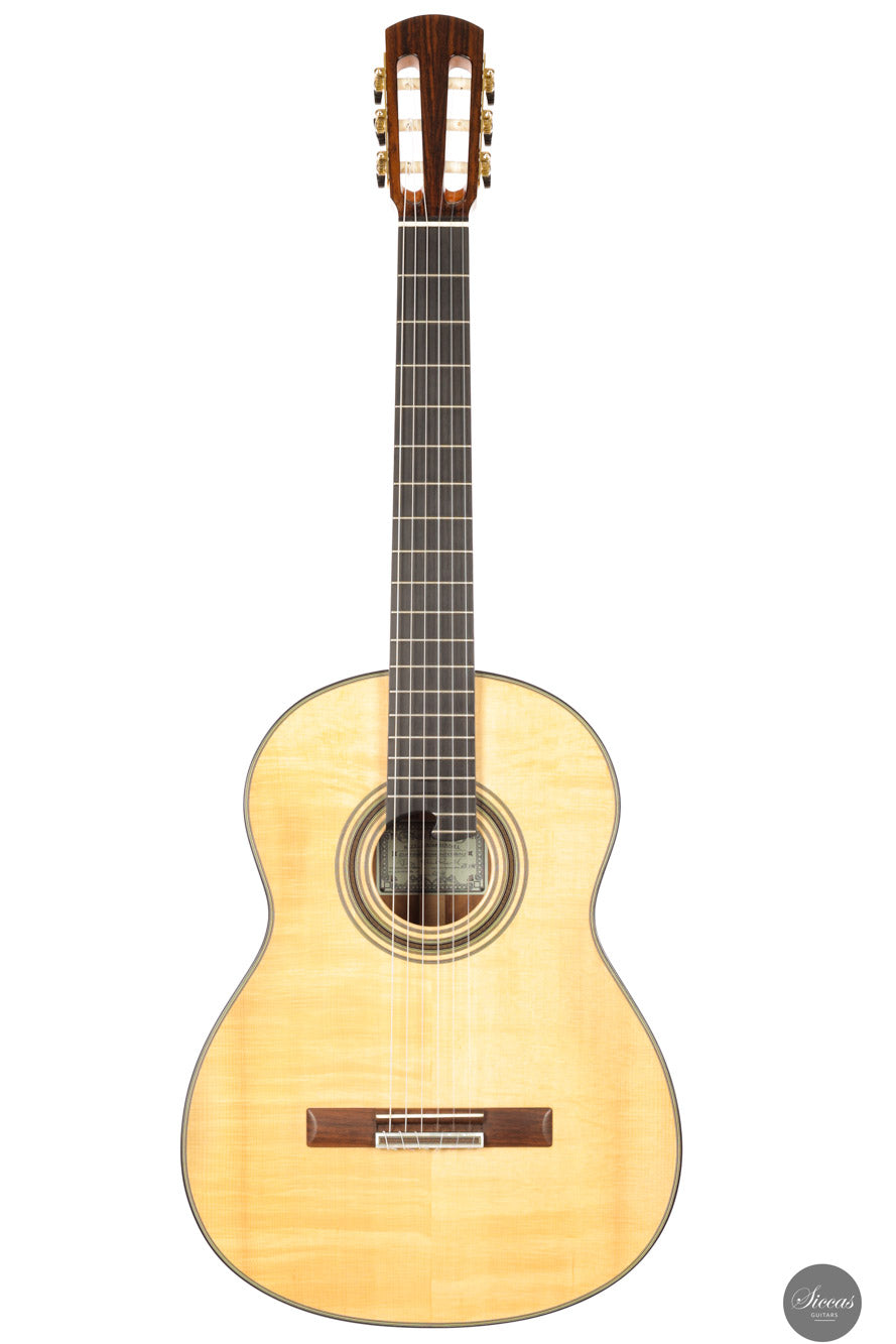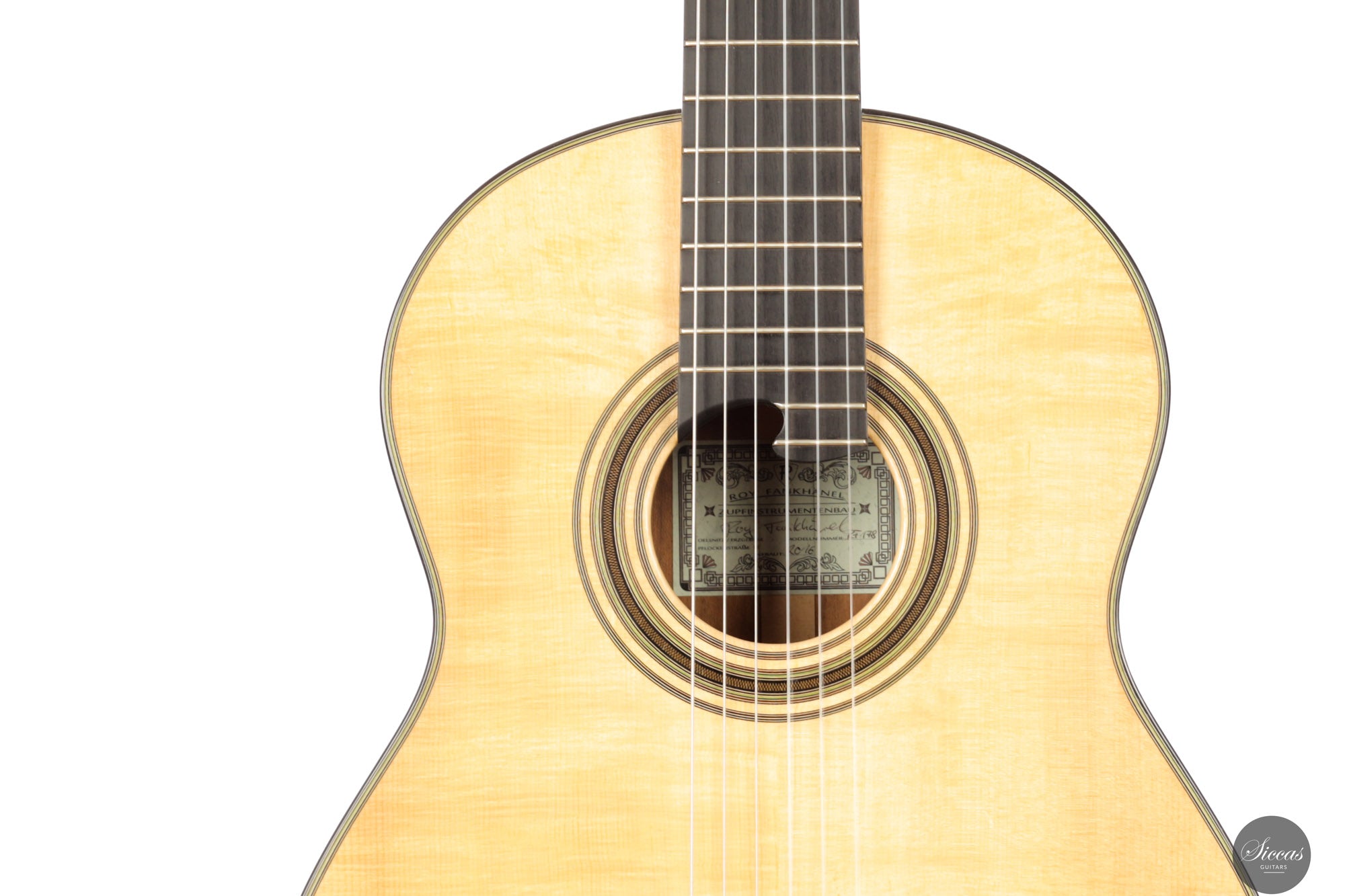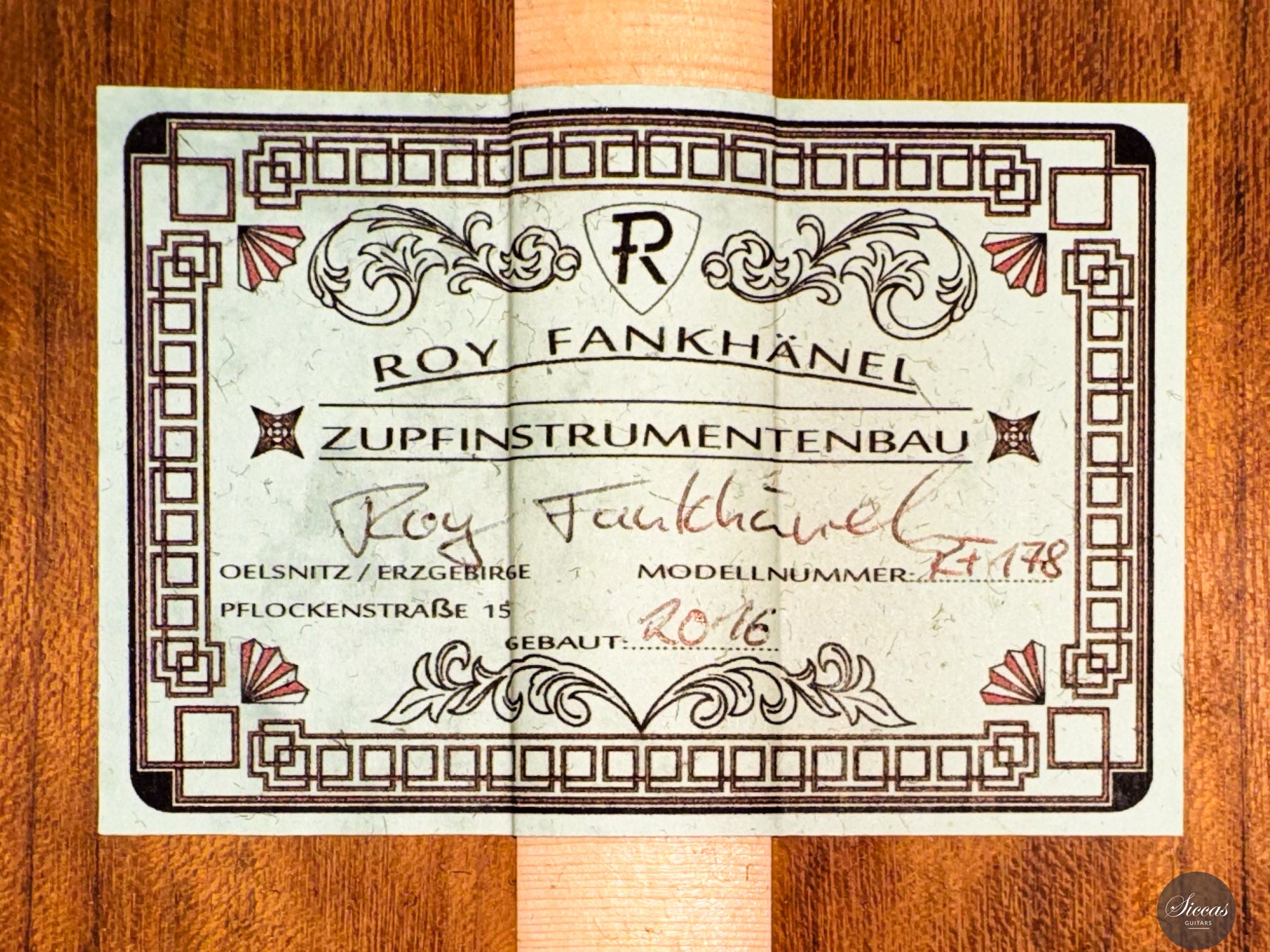 Roy Fankhänel builds guitars in Oelsnitz, Germany, drawing from the traditions of German lutherie while refining his own unmistakable style. His instruments are celebrated for their precise craftsmanship and tonal power. Distinctive construction elements such as the traditional V-joint, elevated fingerboard with a slight radius, and meticulous decorative work reflect his commitment to both function and aesthetics. Fankhänel’s guitars are known for their ease of playability, visual refinement, and their bold, lyrical voice that carries well in concert settings.About the guitar