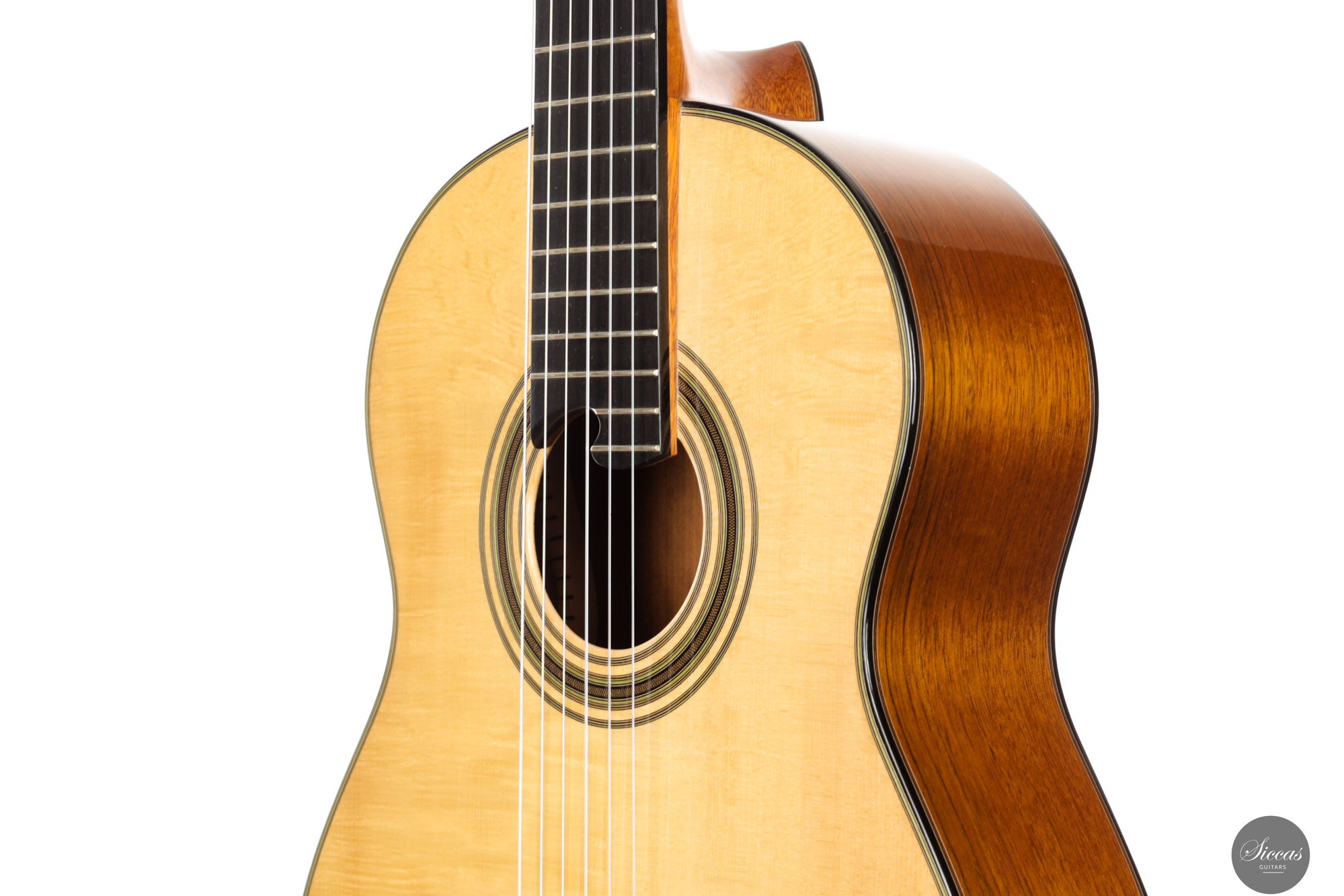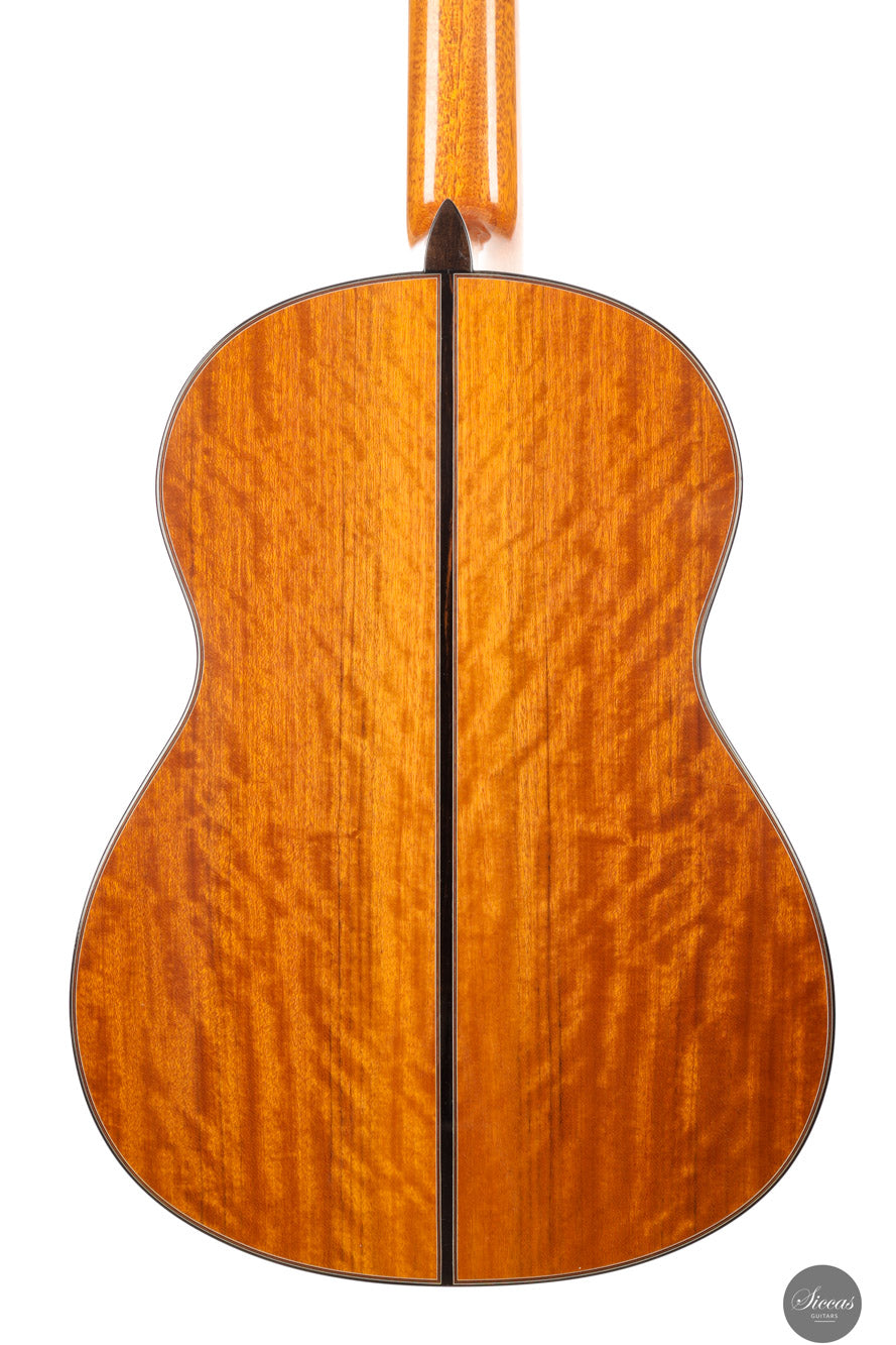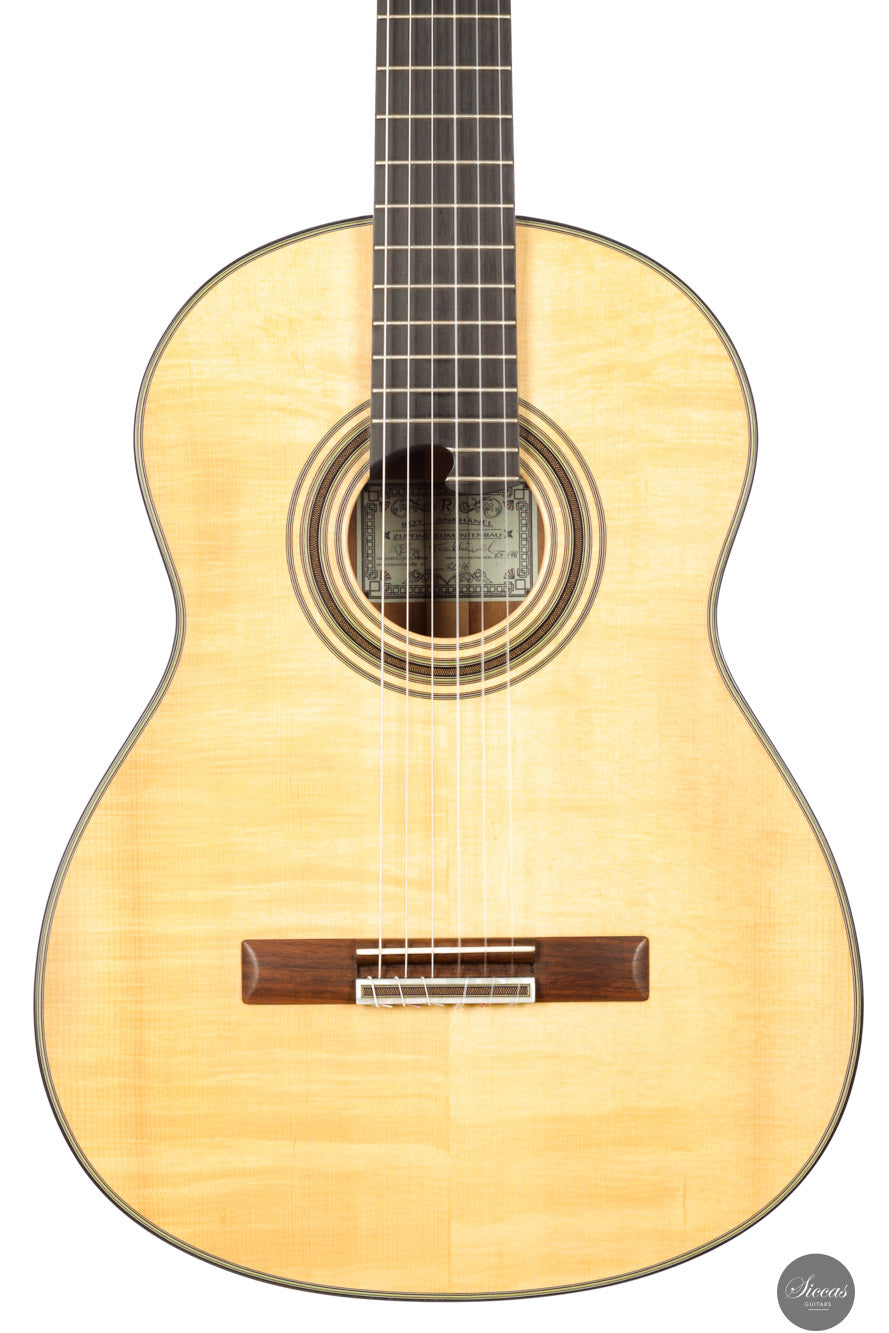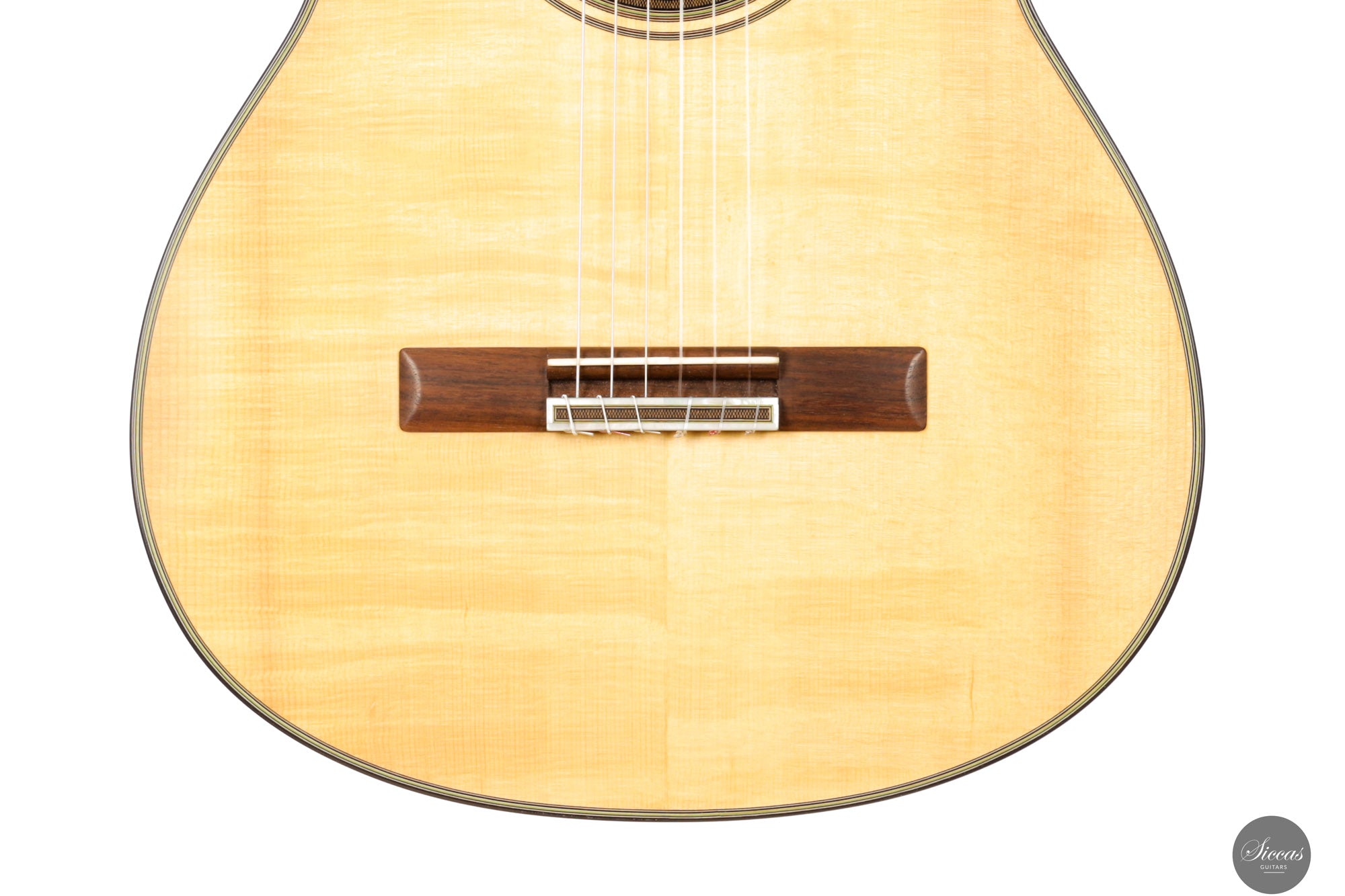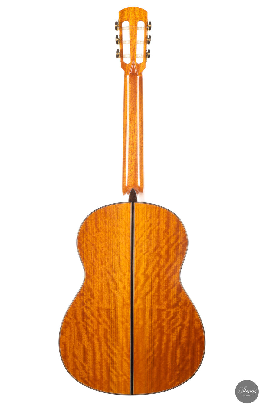 Roy Fankhänel builds guitars in Oelsnitz, Germany, drawing from the traditions of German lutherie while refining his own unmistakable style. His instruments are celebrated for their precise craftsmanship and tonal power. Distinctive construction elements such as the traditional V-joint, elevated fingerboard with a slight radius, and meticulous decorative work reflect his commitment to both function and aesthetics. Fankhänel’s guitars are known for their ease of playability, visual refinement, and their bold, lyrical voice that carries well in concert settings.About the guitar