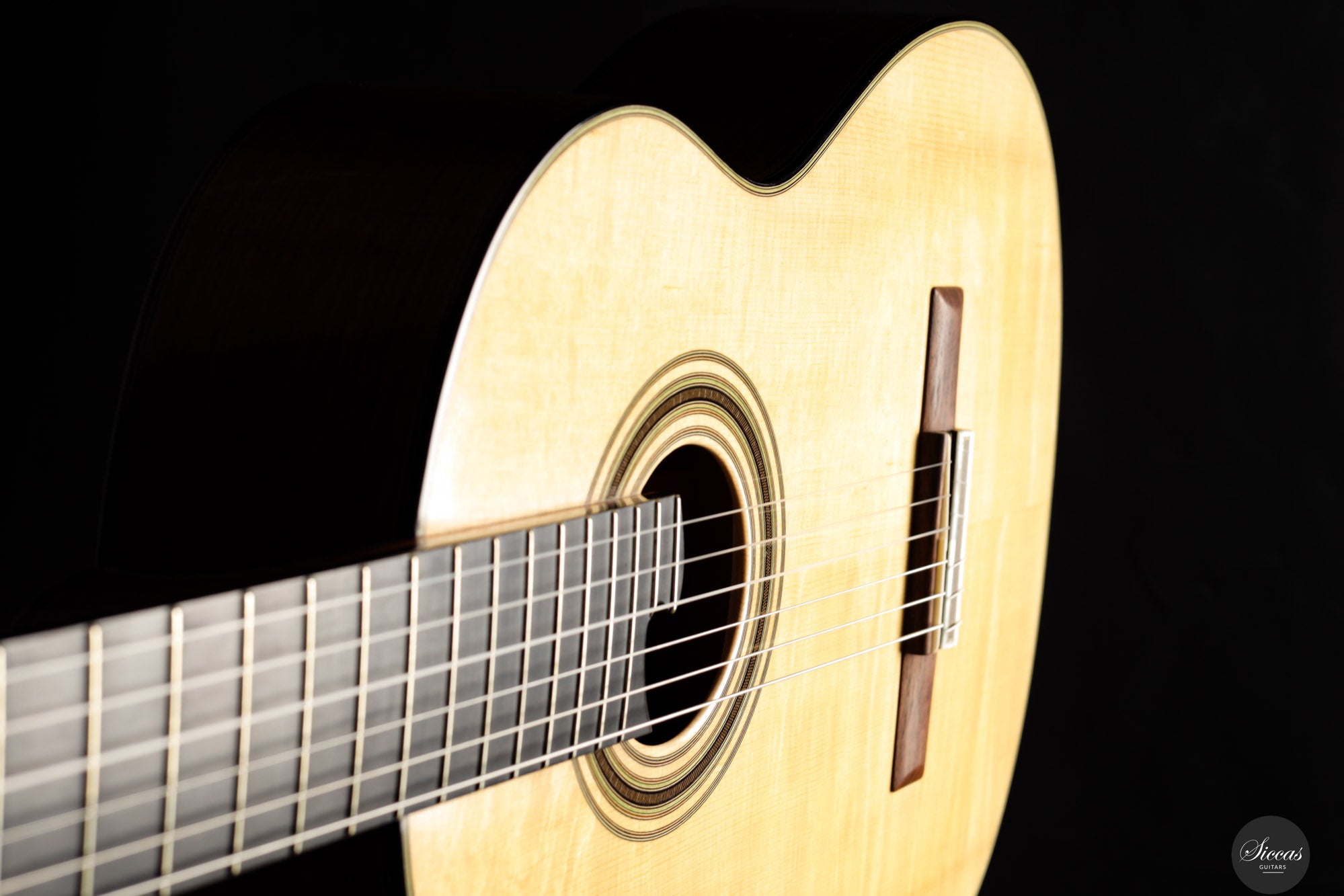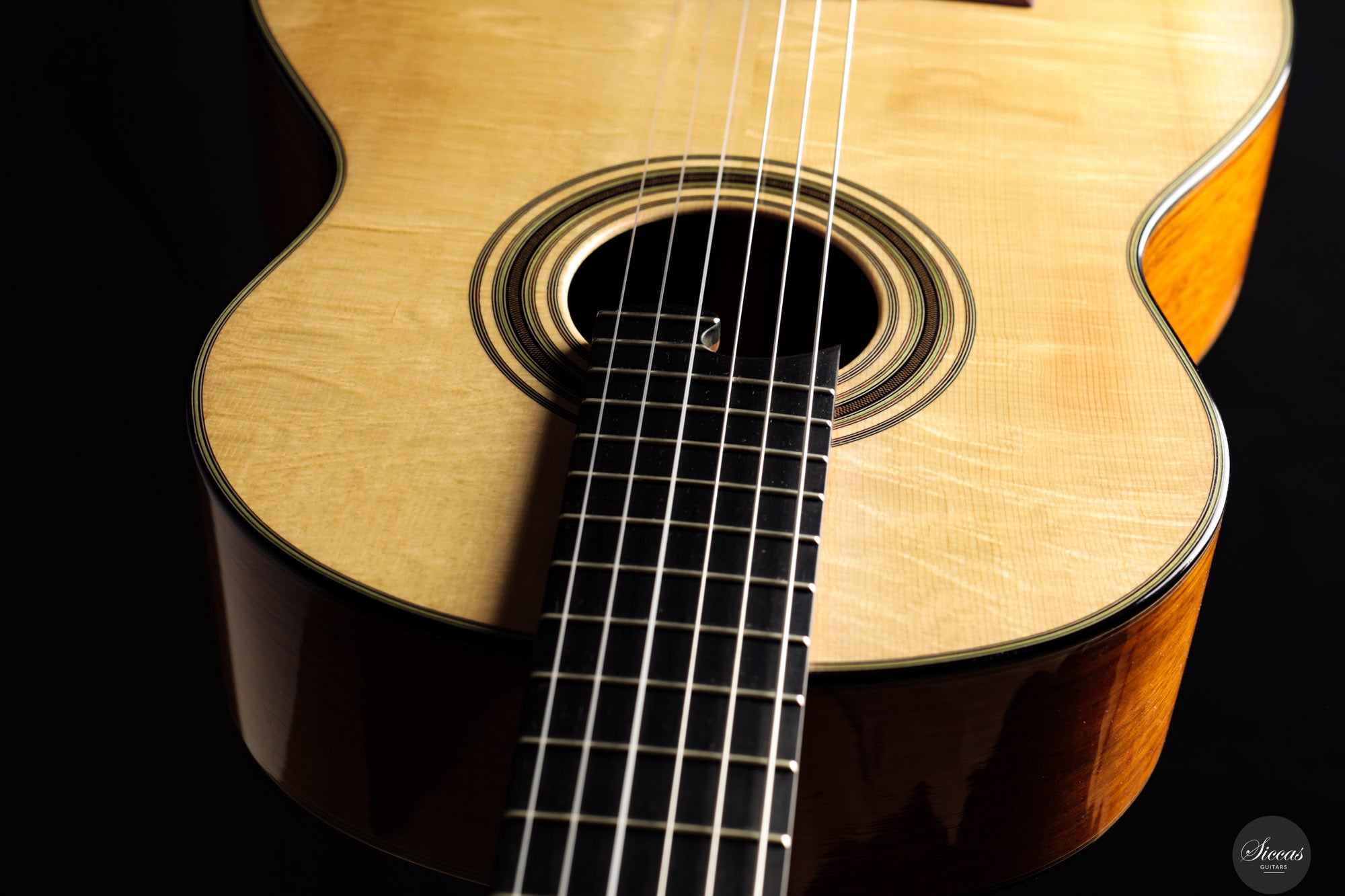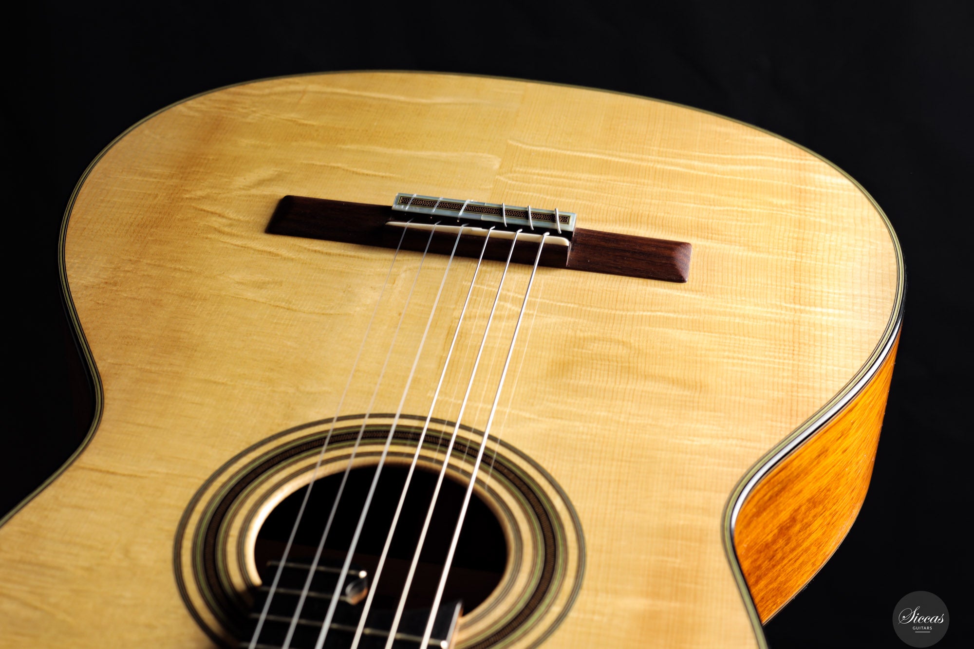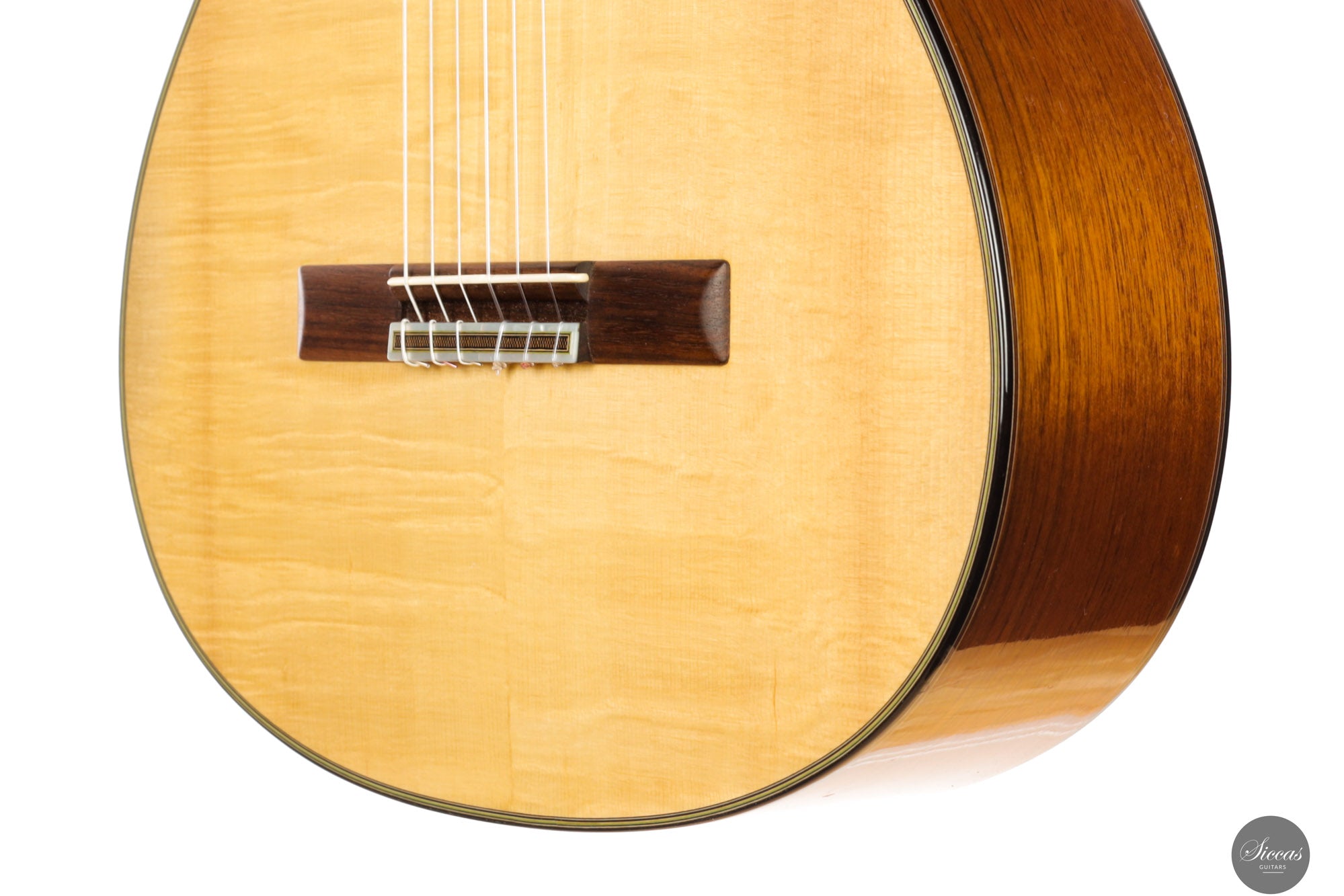 Roy Fankhänel builds guitars in Oelsnitz, Germany, drawing from the traditions of German lutherie while refining his own unmistakable style. His instruments are celebrated for their precise craftsmanship and tonal power. Distinctive construction elements such as the traditional V-joint, elevated fingerboard with a slight radius, and meticulous decorative work reflect his commitment to both function and aesthetics. Fankhänel’s guitars are known for their ease of playability, visual refinement, and their bold, lyrical voice that carries well in concert settings.About the guitar