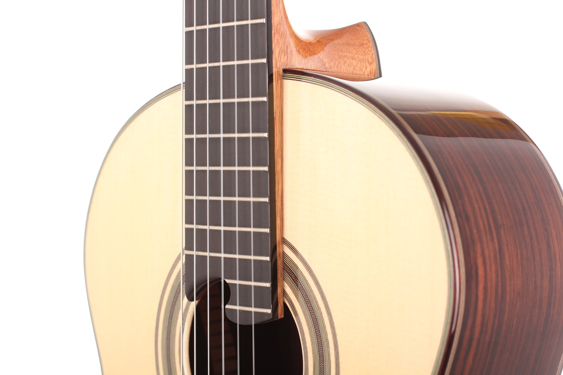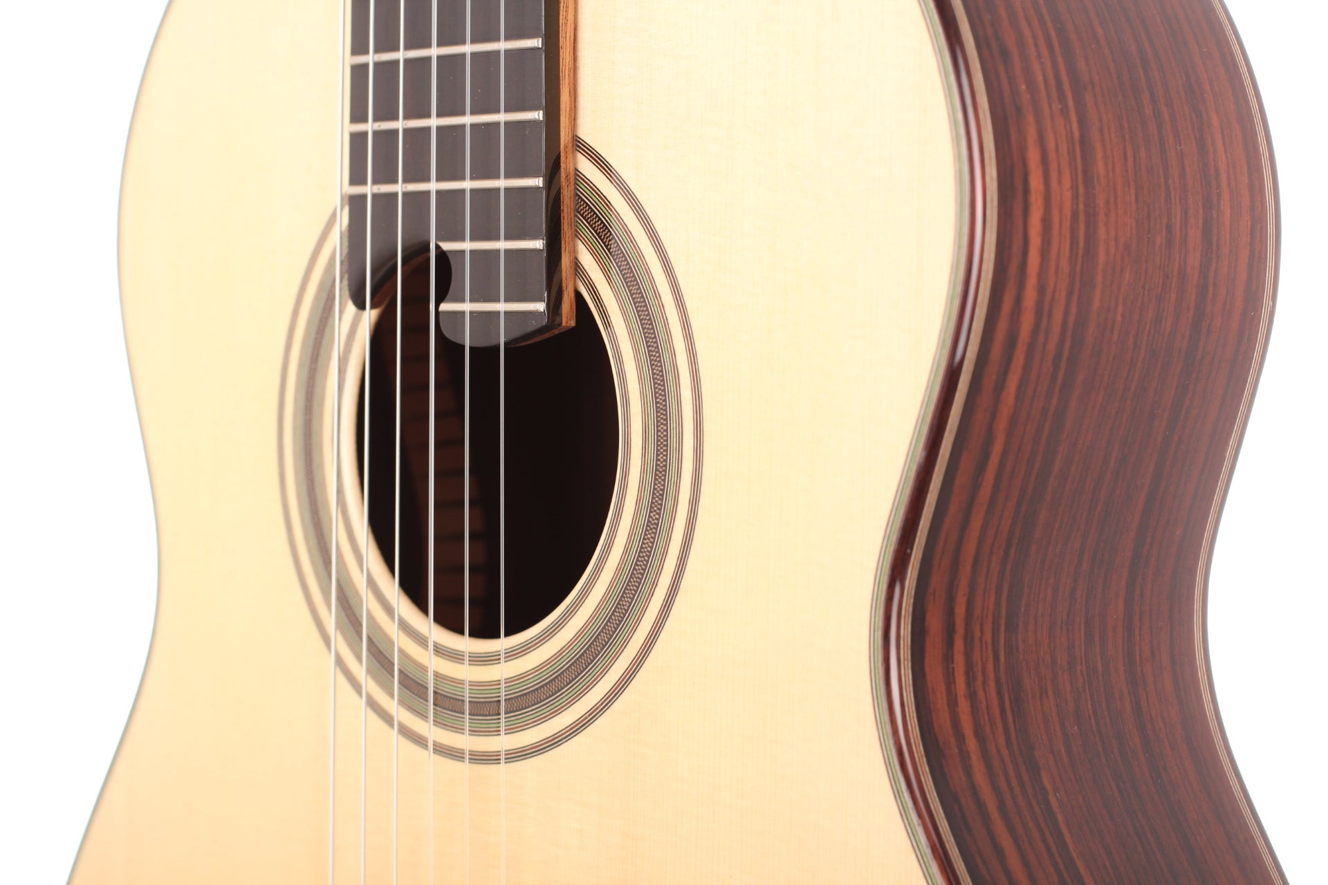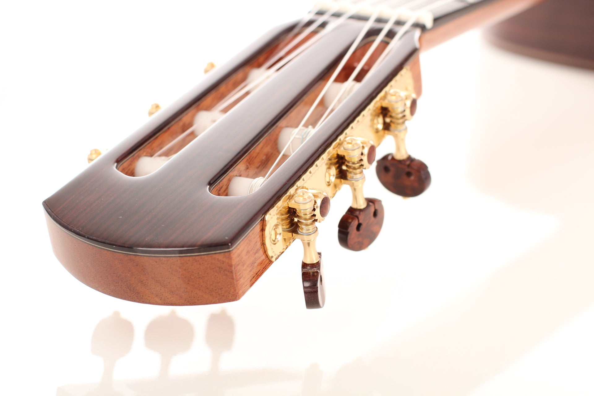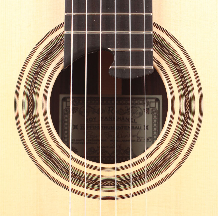 Diese edle Gitarre von Roy Fankhänel wurde Anfang Januar 2016 von Roy Fankhänel fertiggestellt. Dekorative Elemente, wie Rosette und das Binding, wurden von Roy Fankhänel entworfen und in Handarbeit gefertigt. Sie geben dem Instrument eine traditionelle und zugleich moderne Optik. Perfekt in das Gesamtbild fügt sich der Steg mit 12-Loch-Bohrung ein, welcher zusätzlich durch eine schöne Perlmutterumrandung am Knüpfblock verziert. Auffällig sind auch die Ränder aus Ovangkol, die den edlen Charakter der Gitarre unterstreichen. Das Innenleben (Klötzchen und Bodenleisten) besteht außer auf der Decke komplett aus Mahagoni. Die Deckenbeleistung besteht aus Fichte. Die Mechaniken sind von Rubner.