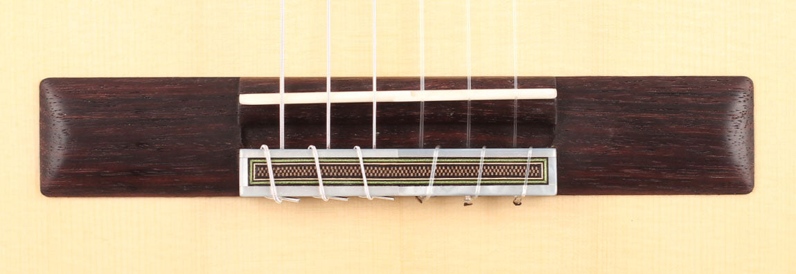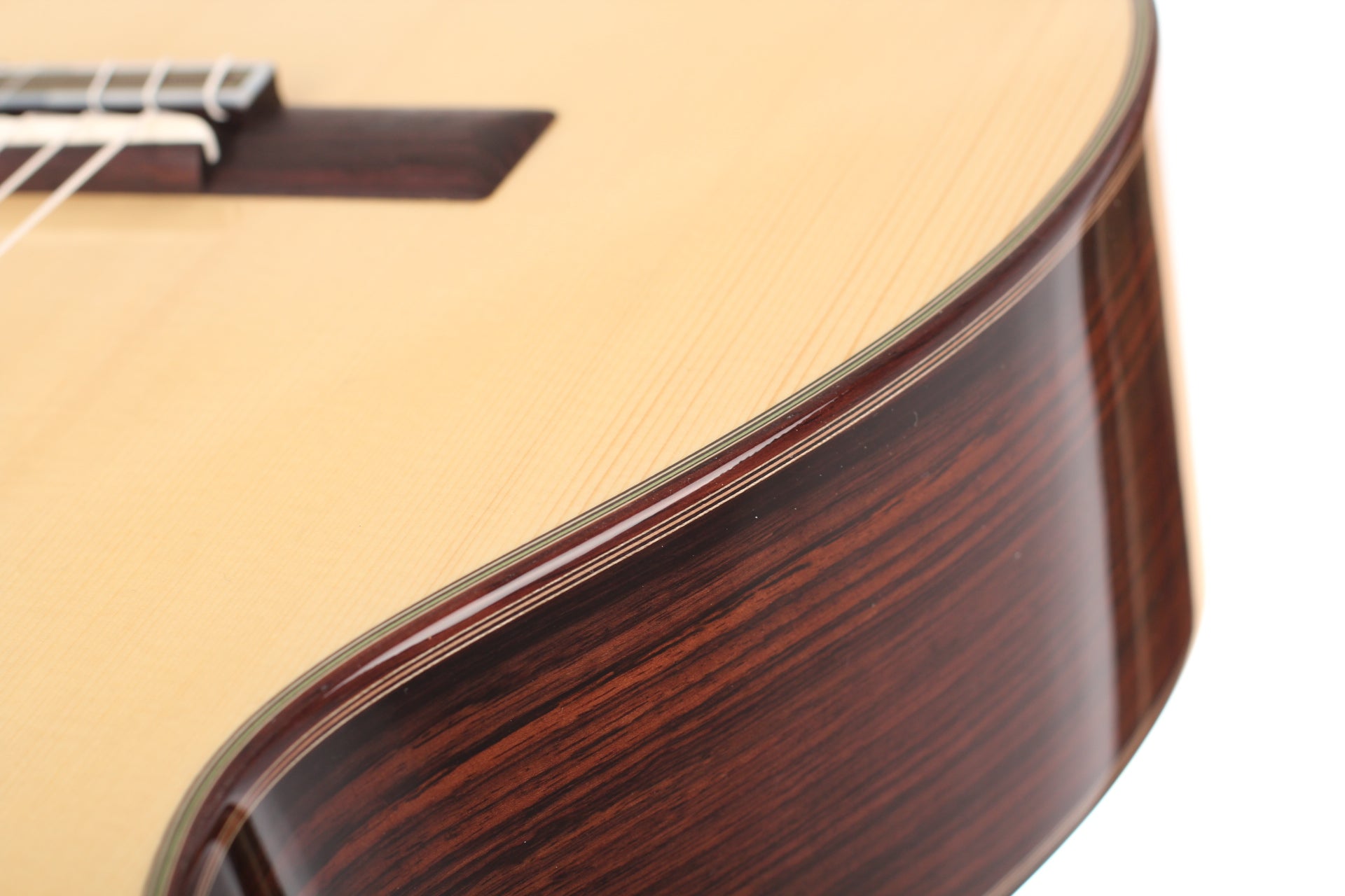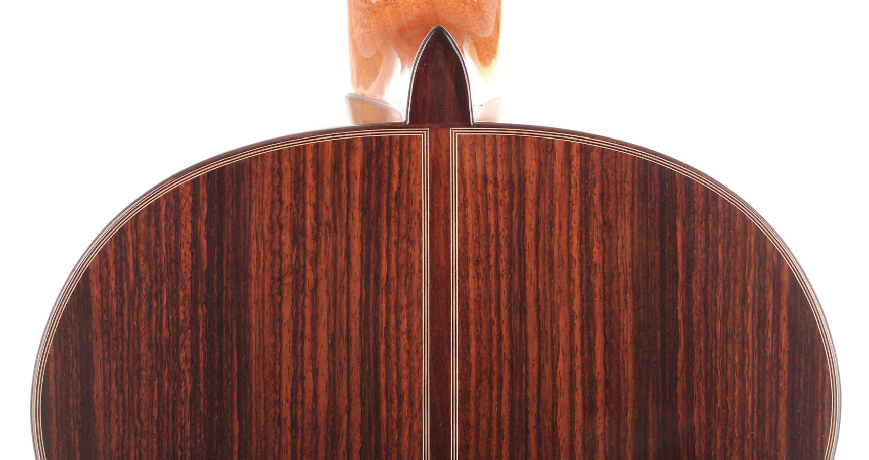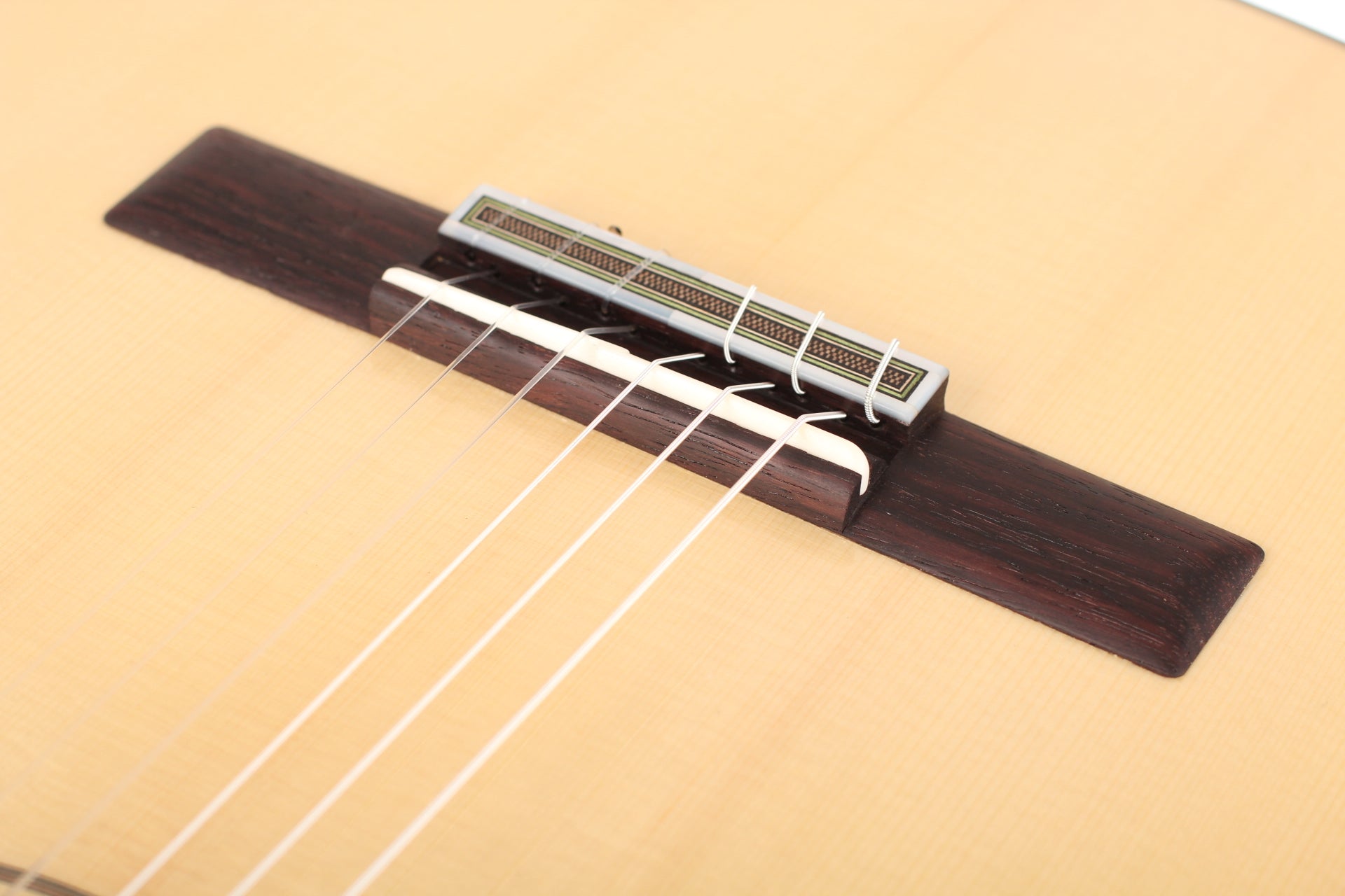 Diese edle Gitarre von Roy Fankhänel wurde Anfang Januar 2016 von Roy Fankhänel fertiggestellt. Dekorative Elemente, wie Rosette und das Binding, wurden von Roy Fankhänel entworfen und in Handarbeit gefertigt. Sie geben dem Instrument eine traditionelle und zugleich moderne Optik. Perfekt in das Gesamtbild fügt sich der Steg mit 12-Loch-Bohrung ein, welcher zusätzlich durch eine schöne Perlmutterumrandung am Knüpfblock verziert. Auffällig sind auch die Ränder aus Ovangkol, die den edlen Charakter der Gitarre unterstreichen. Das Innenleben (Klötzchen und Bodenleisten) besteht außer auf der Decke komplett aus Mahagoni. Die Deckenbeleistung besteht aus Fichte. Die Mechaniken sind von Rubner.