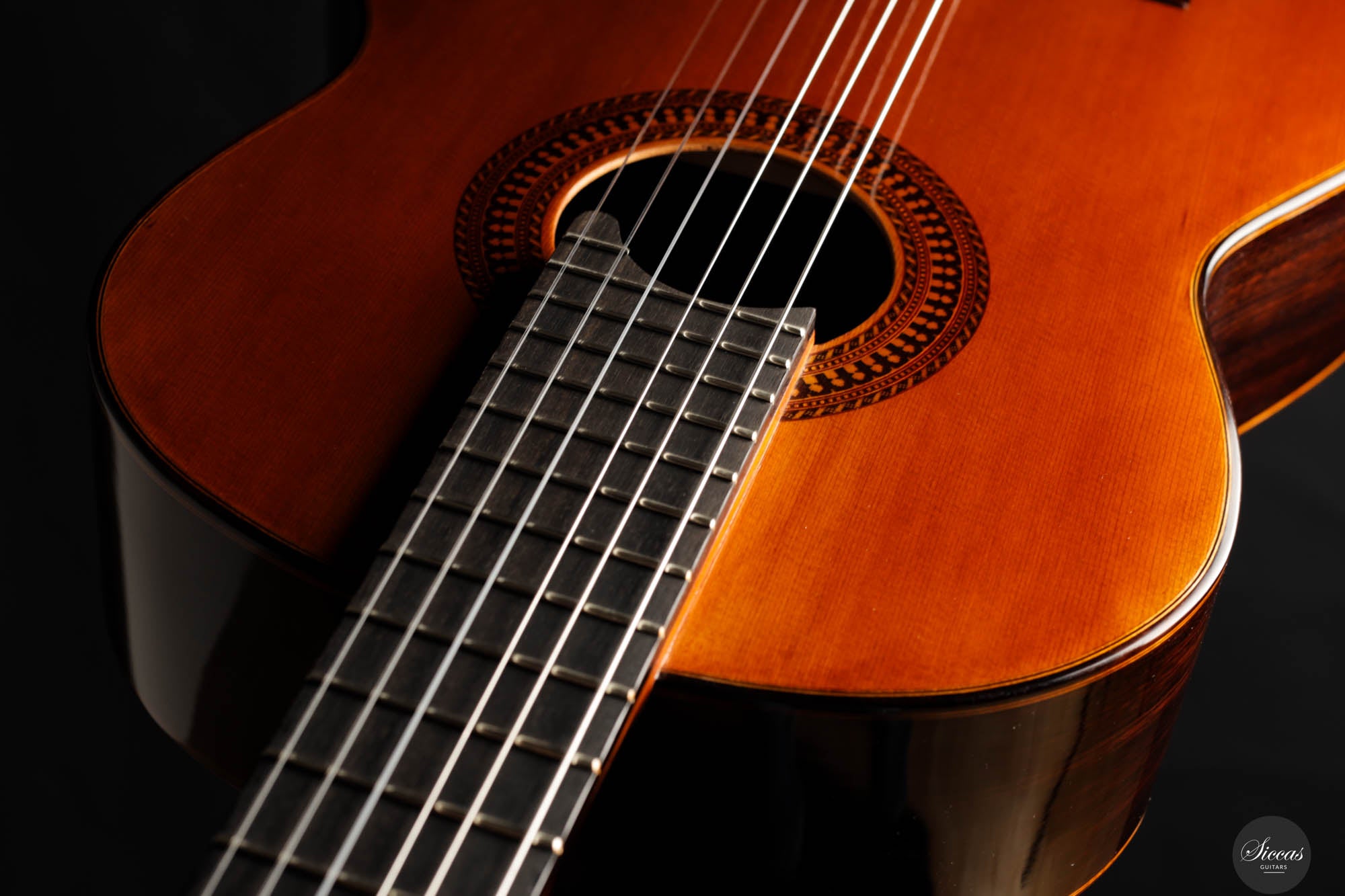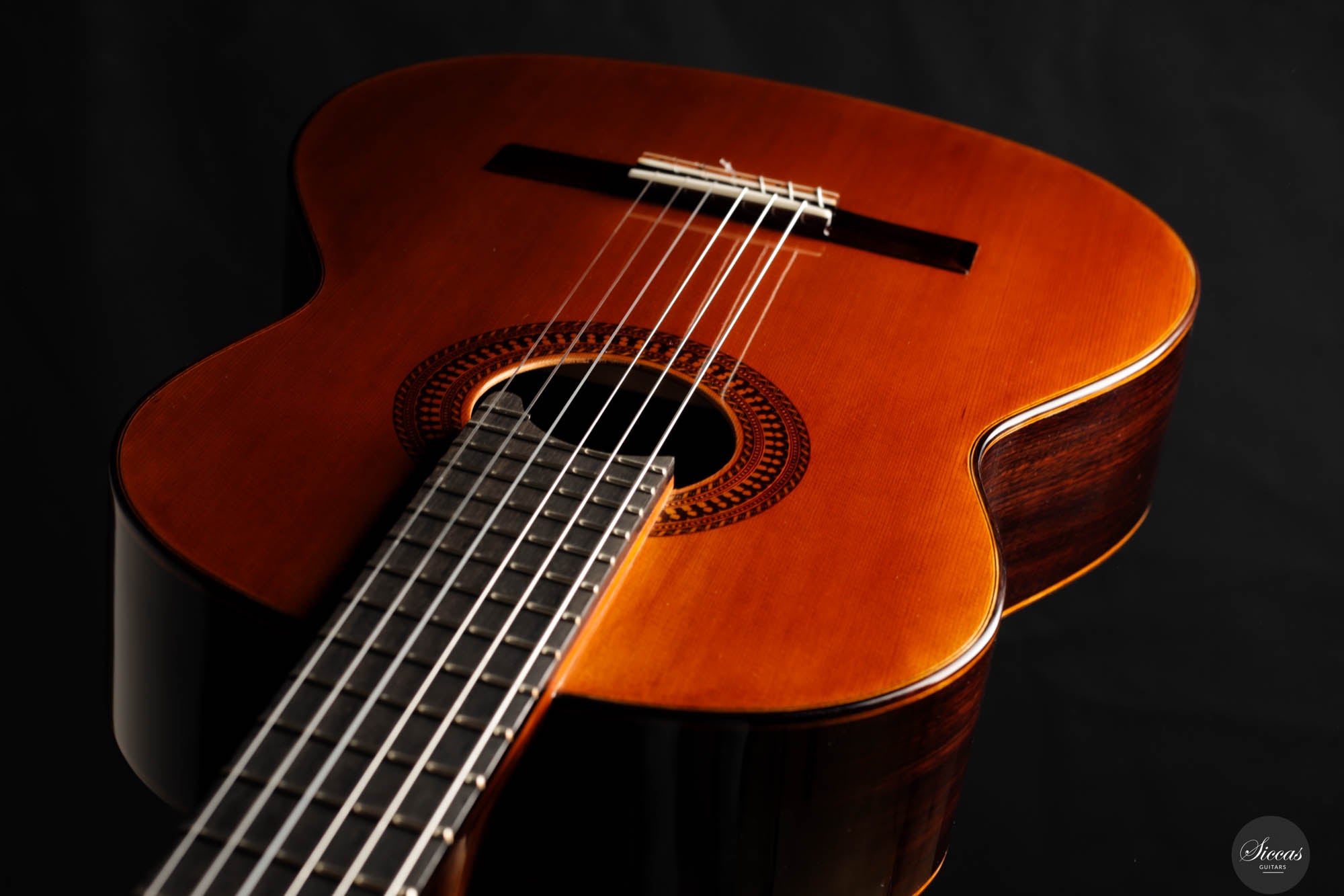Die klassische Gitarre mit ihren weichen Nylonsaiten und ihrem charakteristischen Timbre ist zum Symbol der Kammermusik, der spanischen Tradition und des Konzertrepertoires geworden. Ihre moderne Form prägte Antonio de Torres im 19. Jahrhundert, indem er den Standard für Korpus, Fächerbeleistung und die 65-Zentimeter-Mensur setzte, die bis heute verwendet werden. Instrumente dieser Kategorie eröffnen eine reiche Palette von den feinen romantischen Miniaturen Tárregas bis zu den majestätischen Konzerten Rodrigos. Hier finden Sie Gitarren, die historische Kontinuität bewahren und zugleich zu neuen Interpretationen anregen.