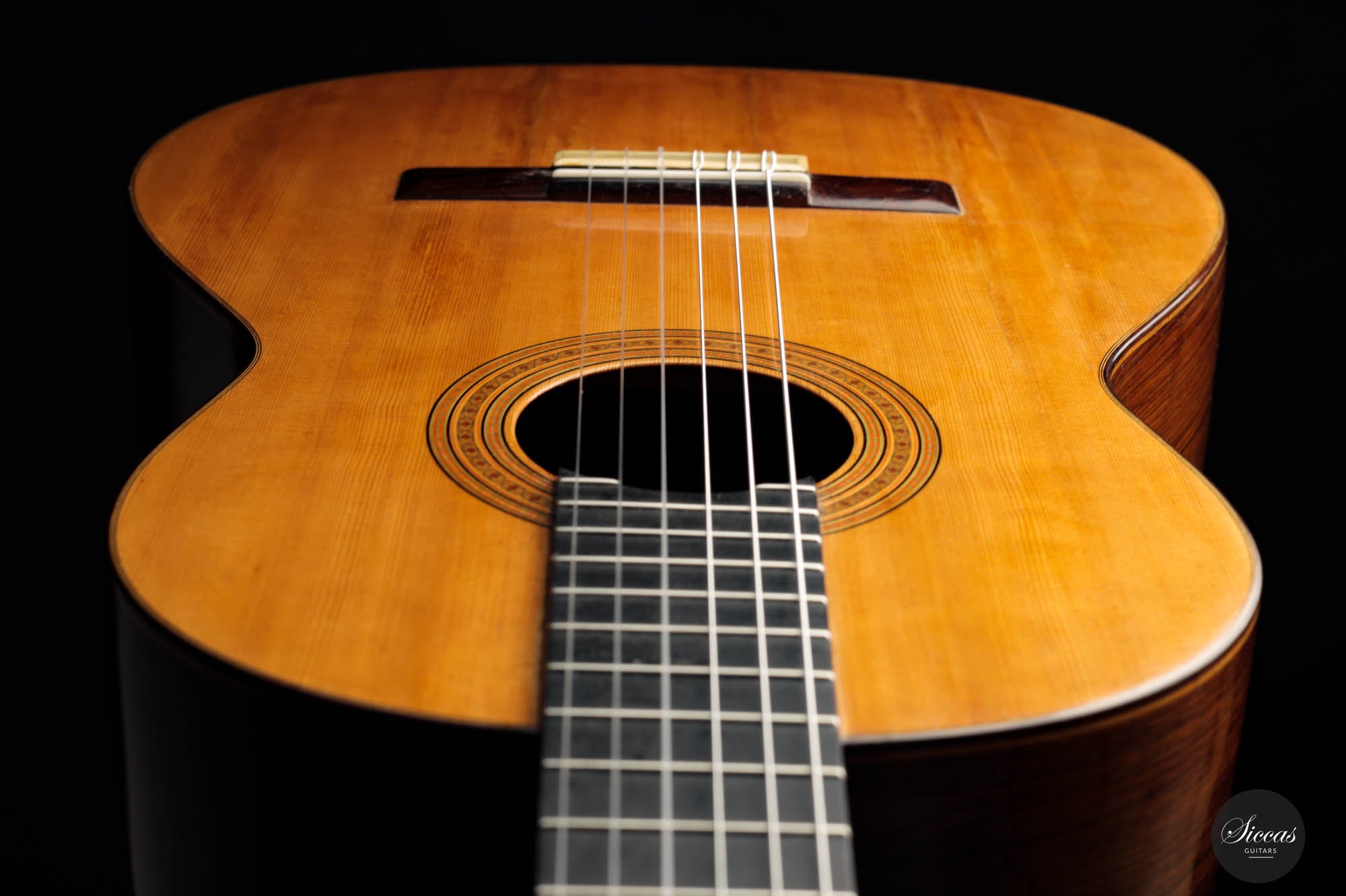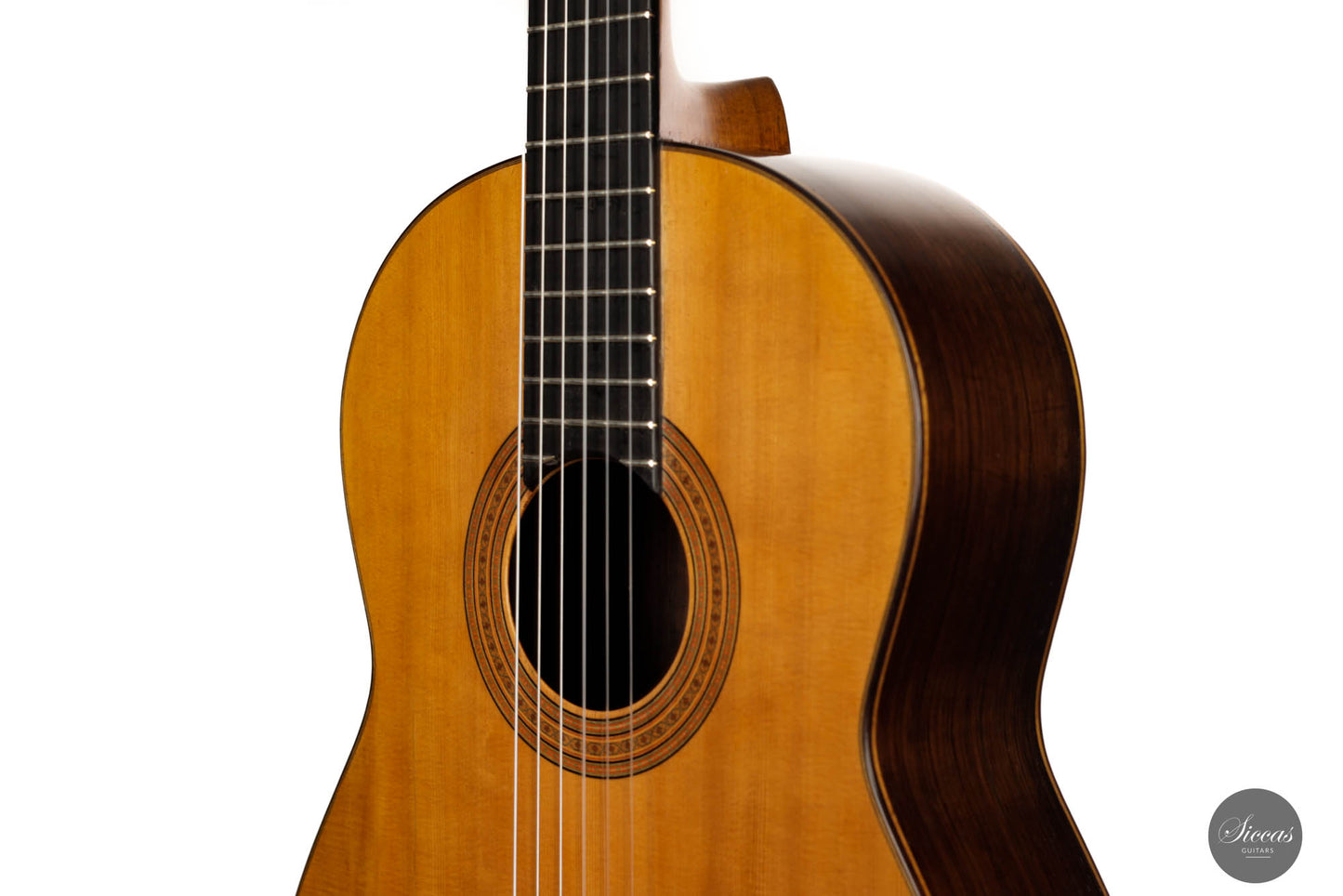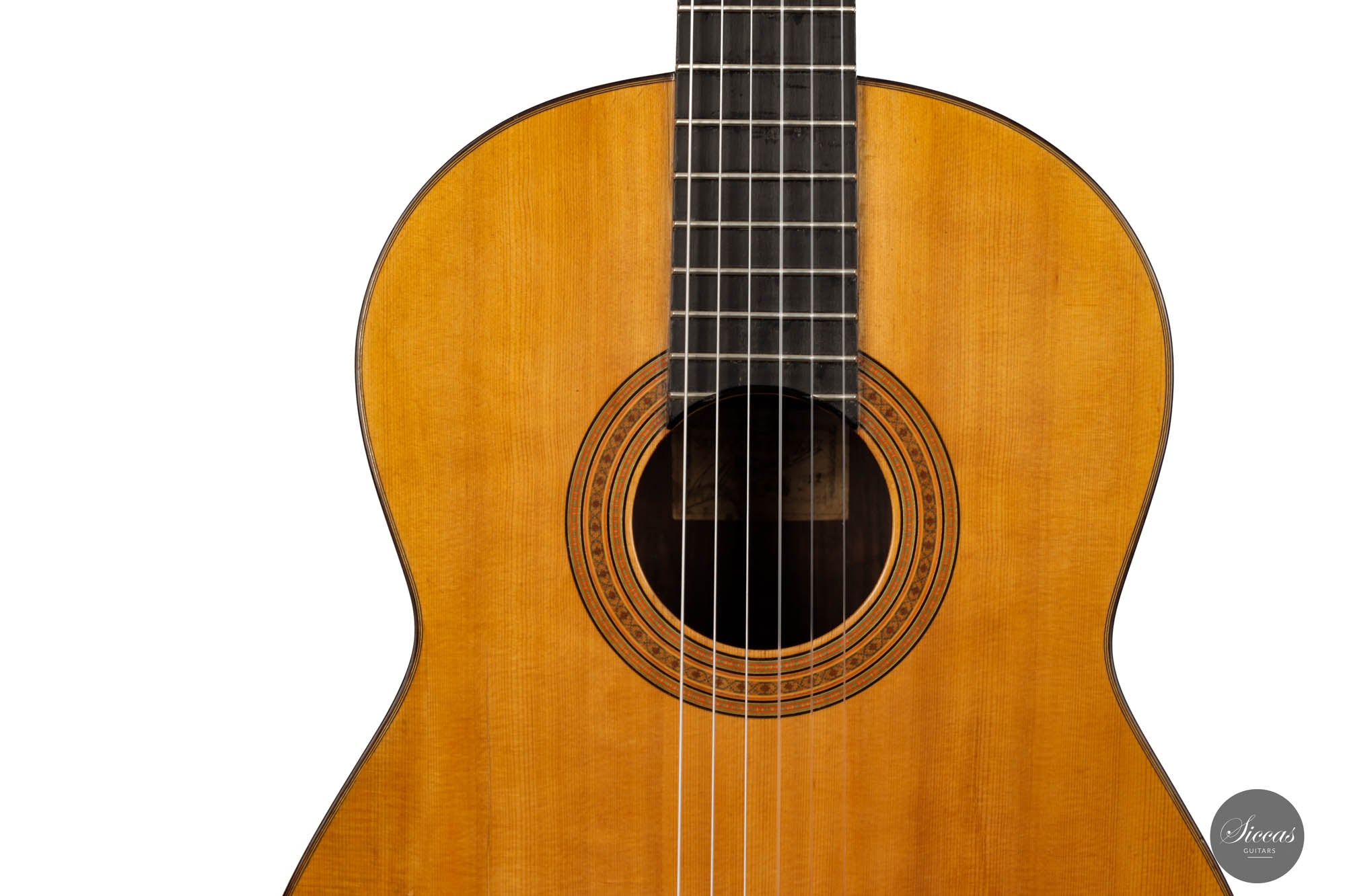 Santos Hernandez (Madrid, 1873-1943) started an apprenticeship very early in Valentin Viudes’s workshop and then moved to José Ortega’s Granadinian workshop. After moving to a few other workshops and serving as a soldier for Spain, he eventually took over Enrique Garcia’s position in Manuel Ramirez’s workshop in 1905. His involvement in building Andrés Segovia’s famous 1912 Manuel Ramirez sealed his reputation as an extraordinary luthier. He opened his first workshop in 1921 after working for Manuel Ramirez’s widow along with Domingo Esteso.