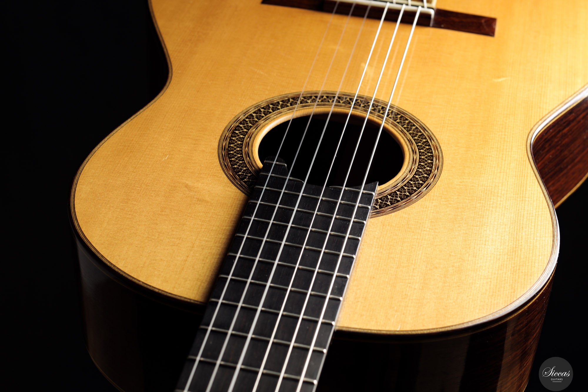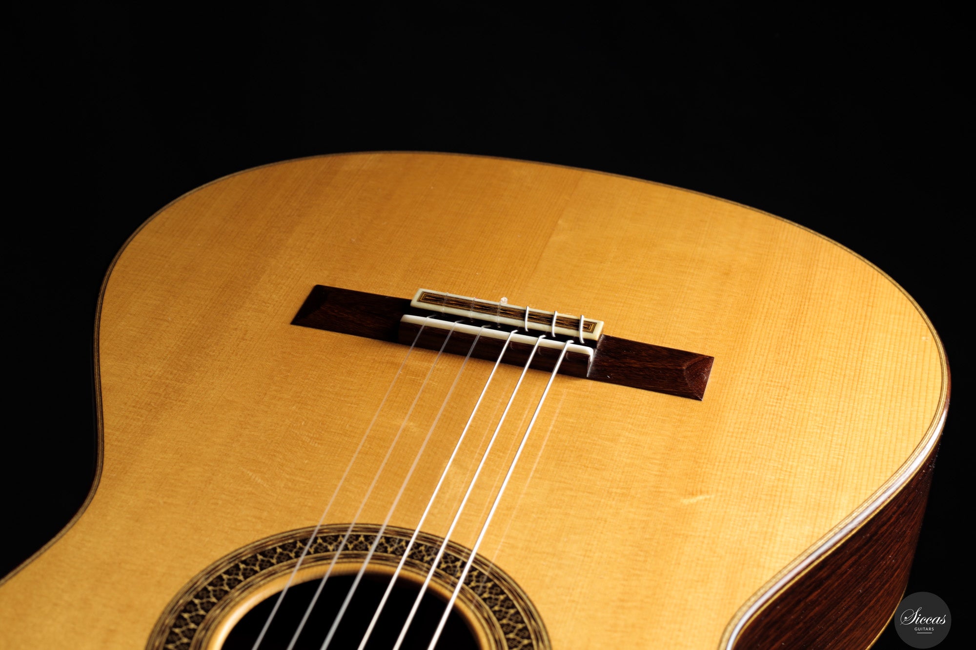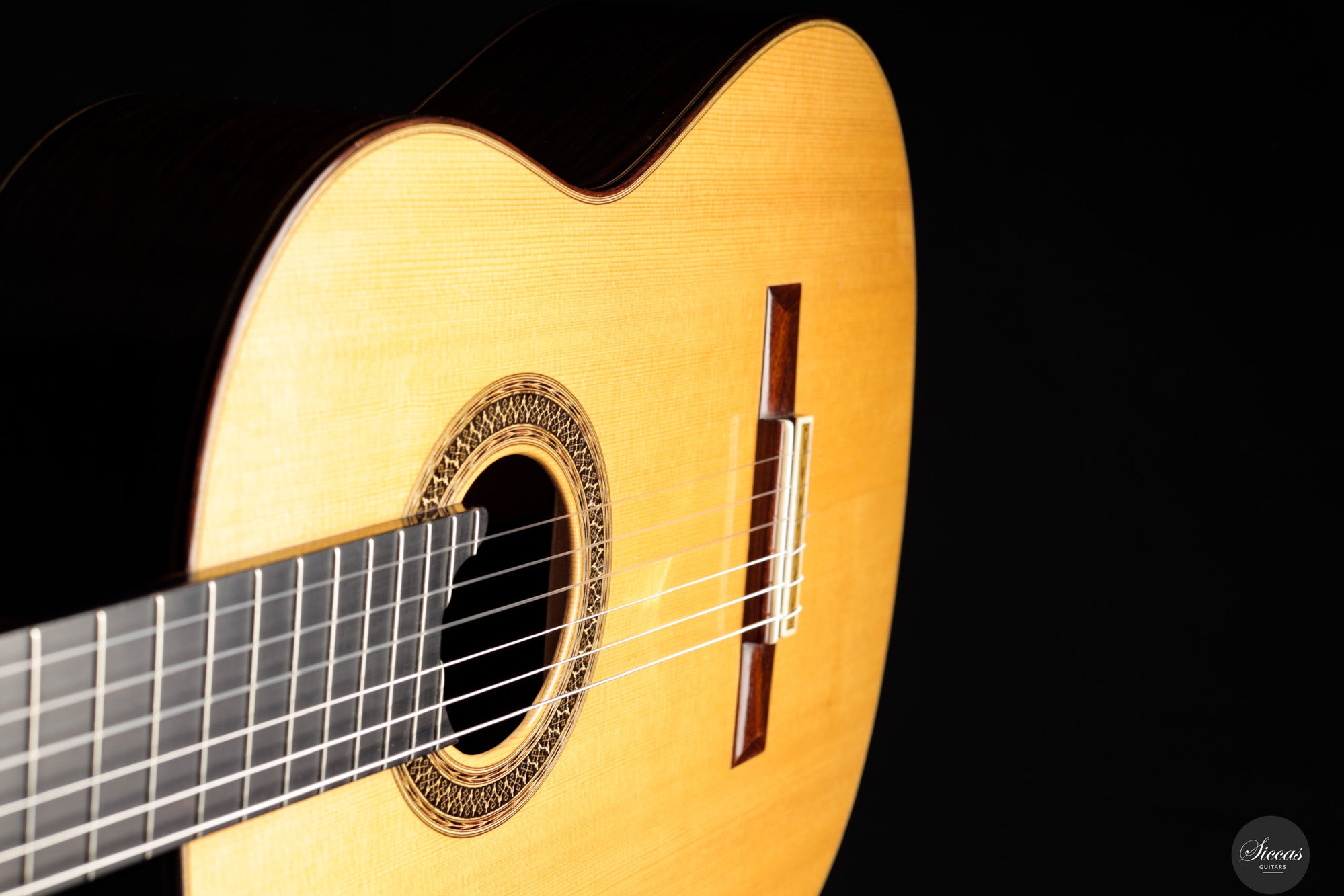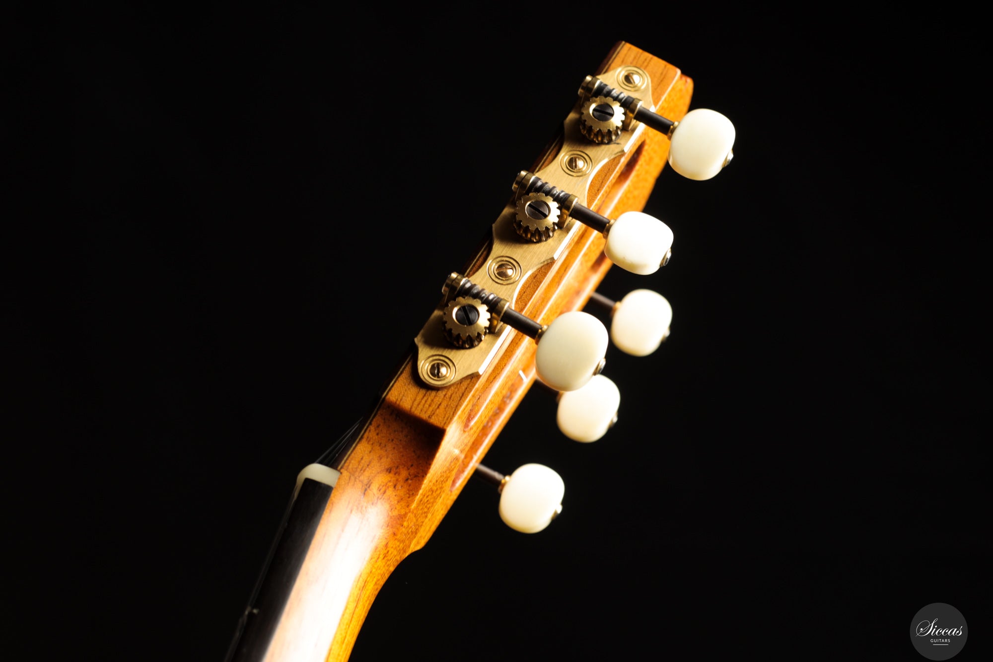 Klanglich überzeugt die Gitarre durch ihre weit tragenden, luftigen Bässe, die nicht nur im Raum, sondern auch direkt unter den Fingern spürbar sind – ein Markenzeichen von Stenzels Bauweise. Die Fichtendecke und der Korpus aus indischem Palisander sorgen für klare, gesangliche Höhen und ein stabiles, tragfähiges Mittelregister. Die Bässe reagieren äußerst sensibel und entfalten unter Druck ein reiches Volumen. Reischl-Mechaniken (ehemals Landstorfer) gewährleisten zuverlässige Funktionalität mit klassischem Bezug. Der minimalistisch gestaltete Halsfuß setzt einen modernen, eleganten Akzent. Die dünne Nitrozelluloselackierung bewahrt die klangliche Offenheit und betont zugleich die natürliche Ästhetik des Holzes.