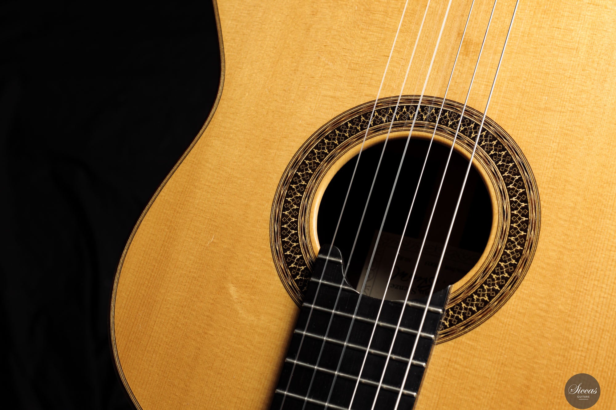 Diese Konzertgitarre von 2003, Nr. 83, basiert auf einem Hauser-inspirierten Konzept mit klanglich und ergonomisch durchdachten Eigenentwicklungen. Mit ihrer Mensur von 640 mm, einer Sattelbreite von 50 mm und einem Gewicht von nur 1,4 kg ist sie außergewöhnlich komfortabel. Die Spielbarkeit wird durch die leichte Ansprache und das gut ausbalancierte Setup nochmals gesteigert – ideal für Musiker, die klangliche Vielfalt mit hoher Spielergonomie verbinden möchten.