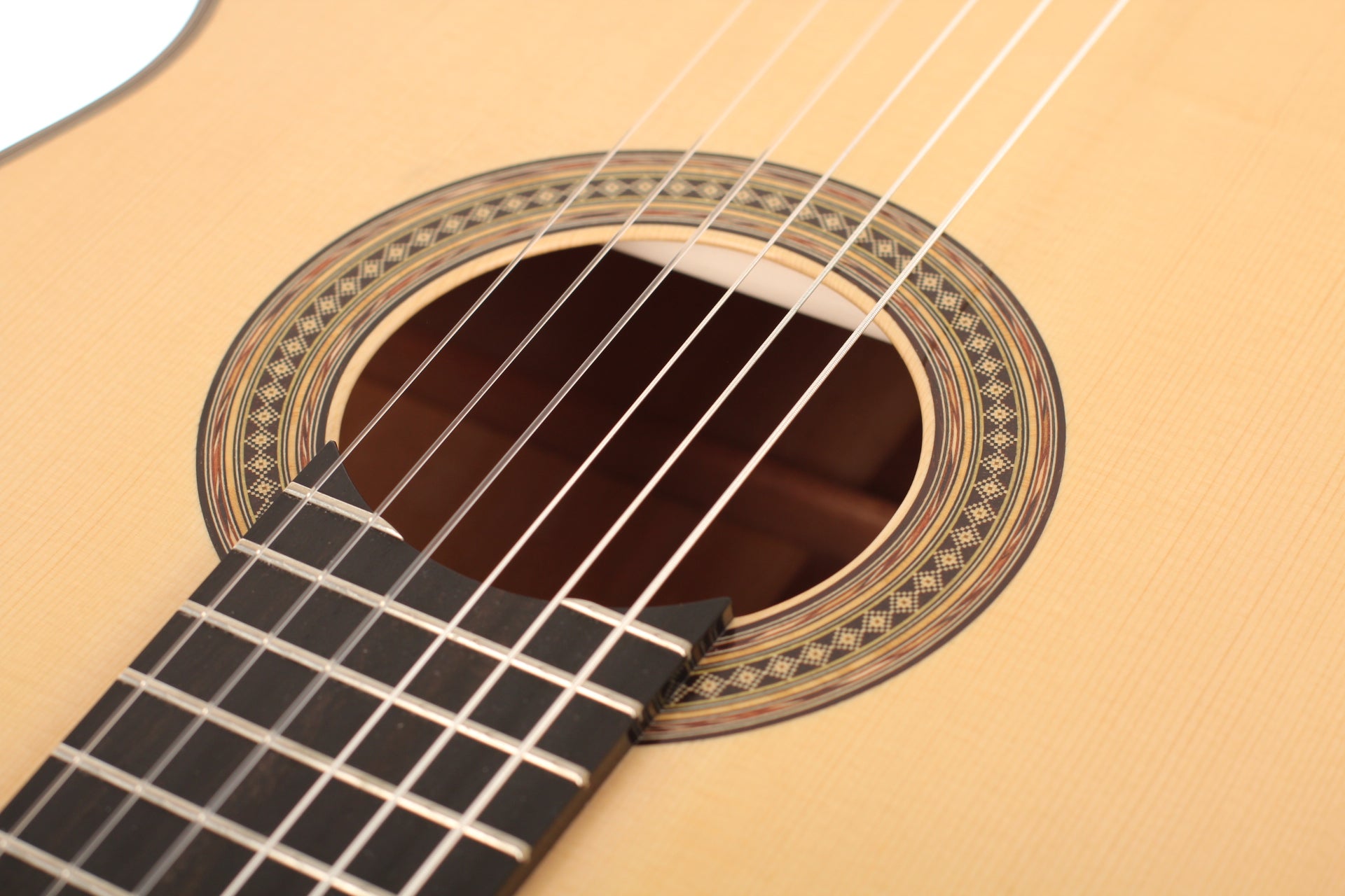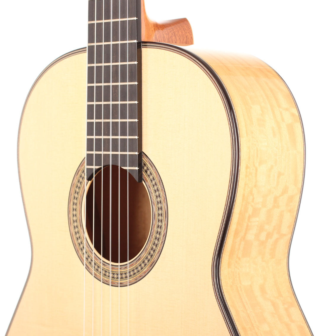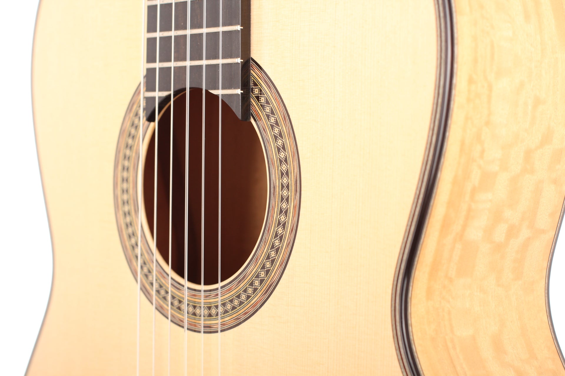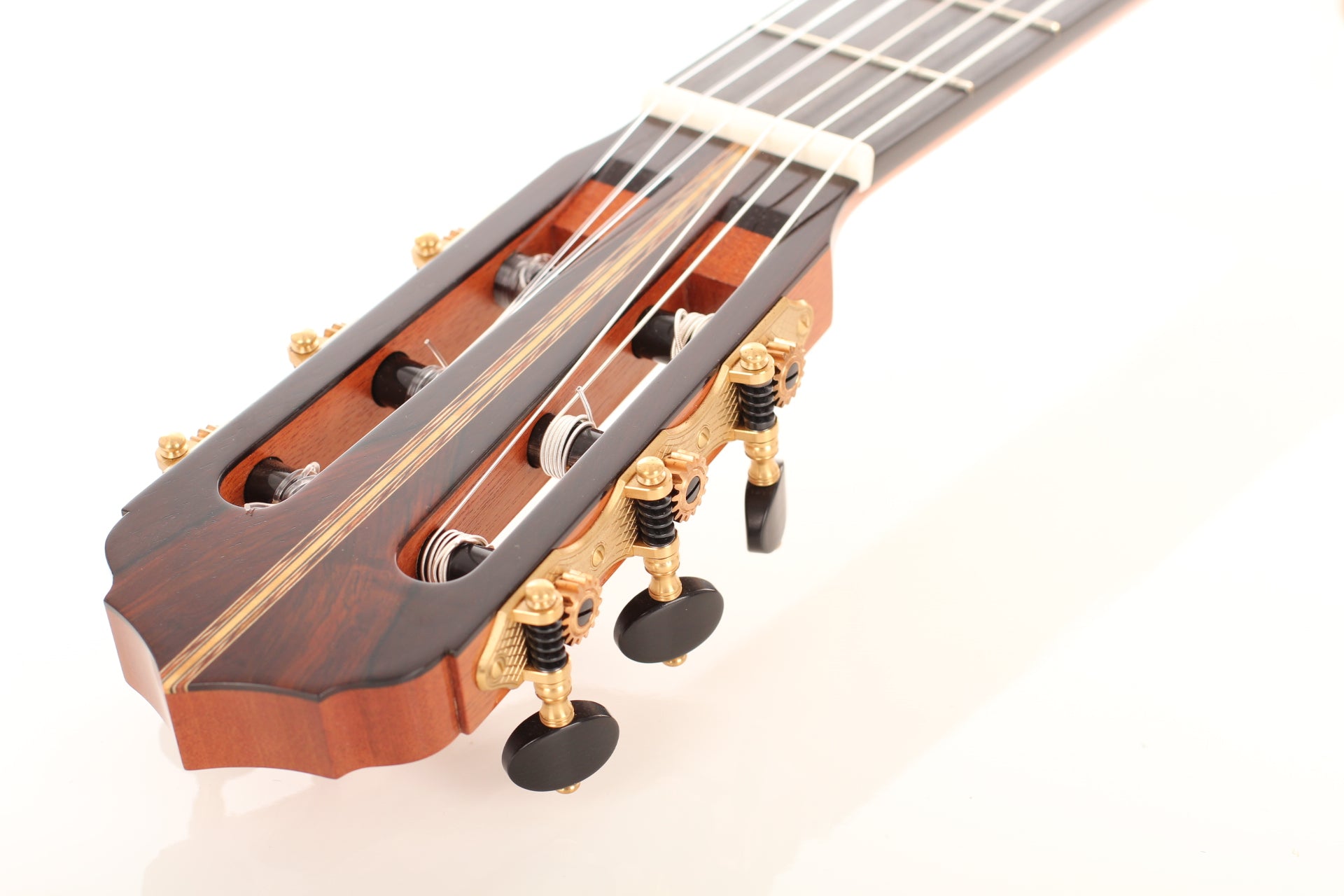 His concert guitars (like this one) owe their inspiration to the instruments of Antonio de Torres, the early 20th century Spanish makers. By combining design elements from wonderful makers with his own ideas he produces instruments which are traditional in style, lightly built and very responsive. He's aiming for a sound which has real beauty, with the notes evenly focused and well balanced across the whole musical spectrum. This guitar has Satinwood back and sides and a spruce wood top. The tuners of this guitar are made by Klaus Scheller. A hardshell case is included.