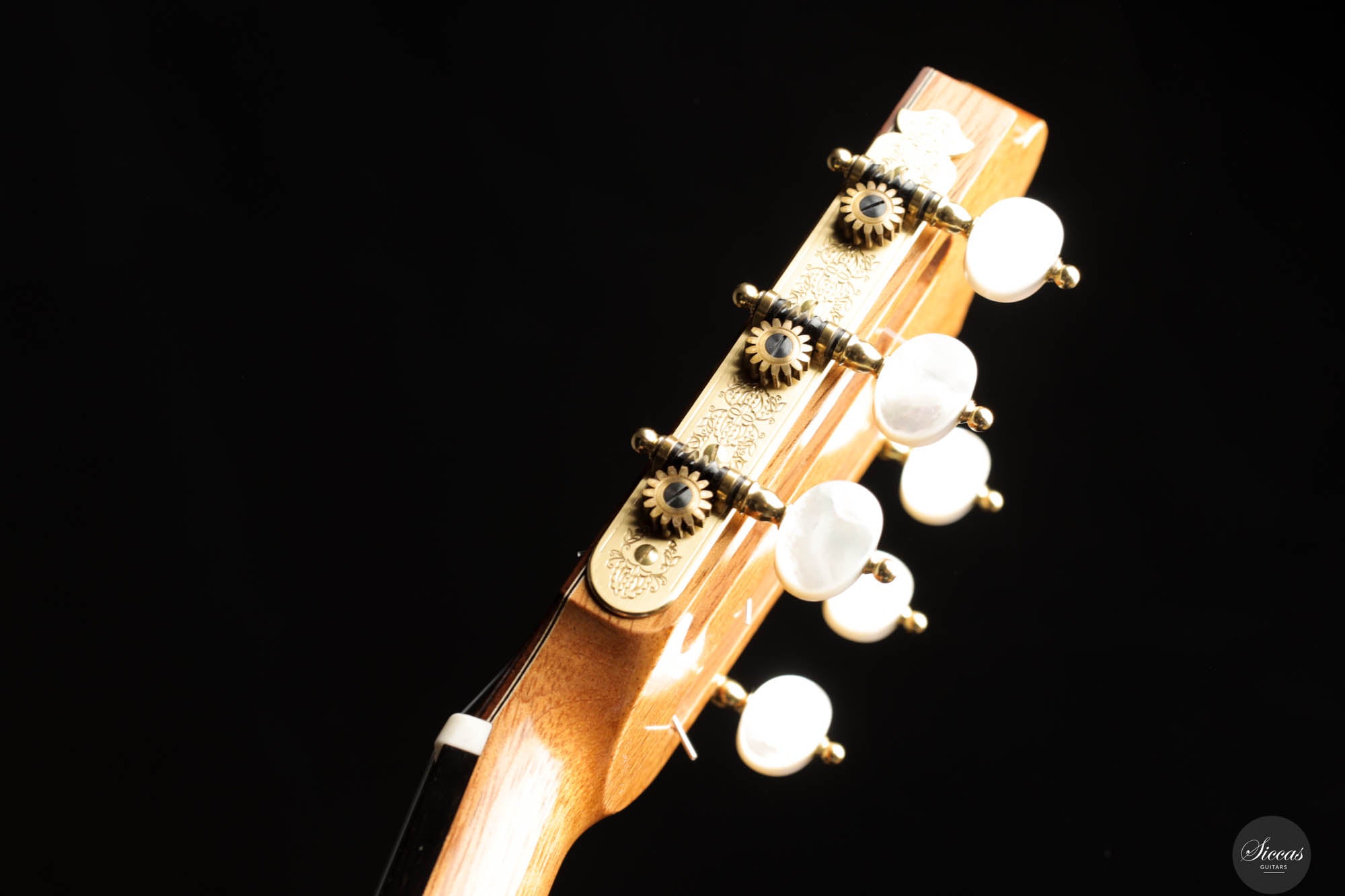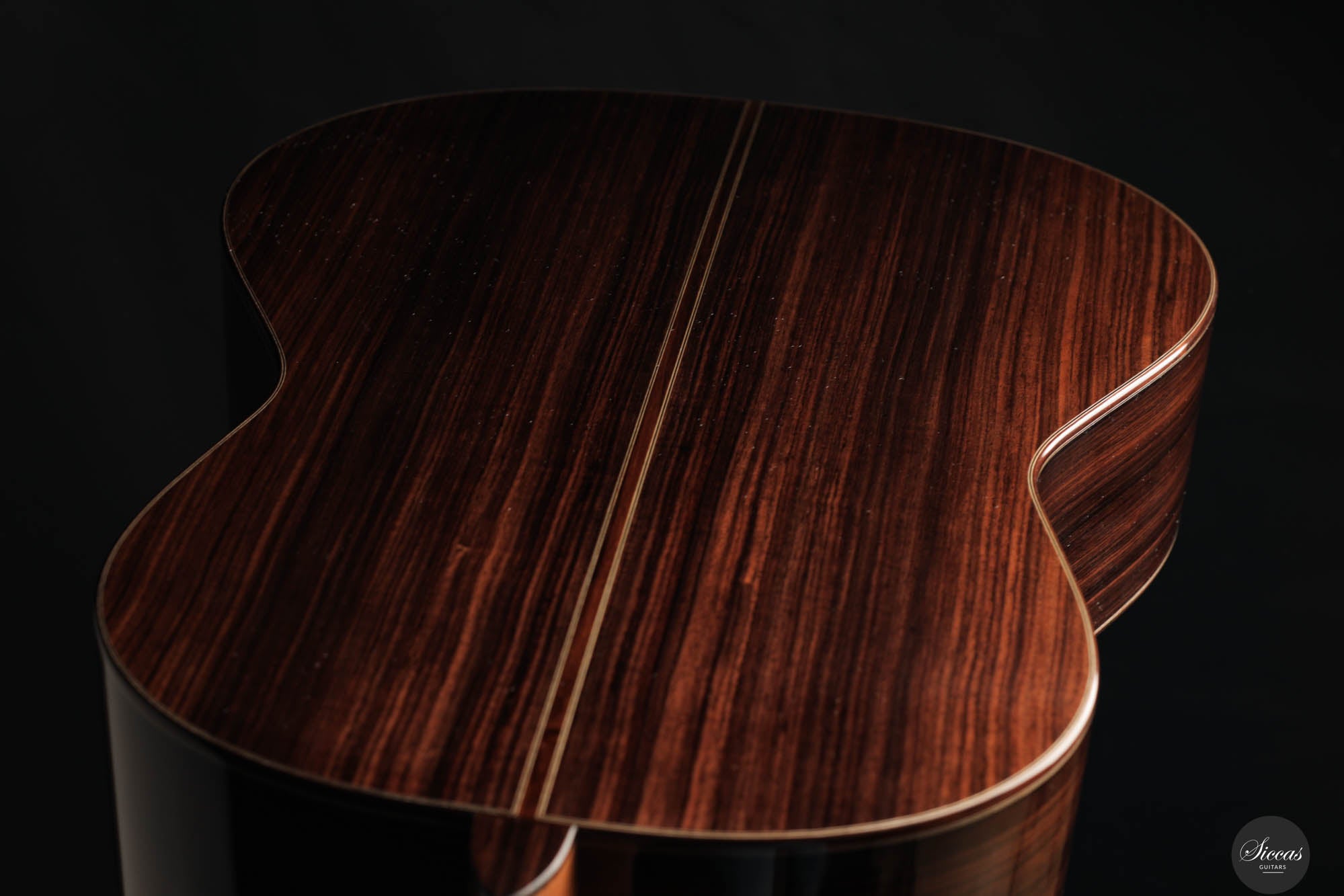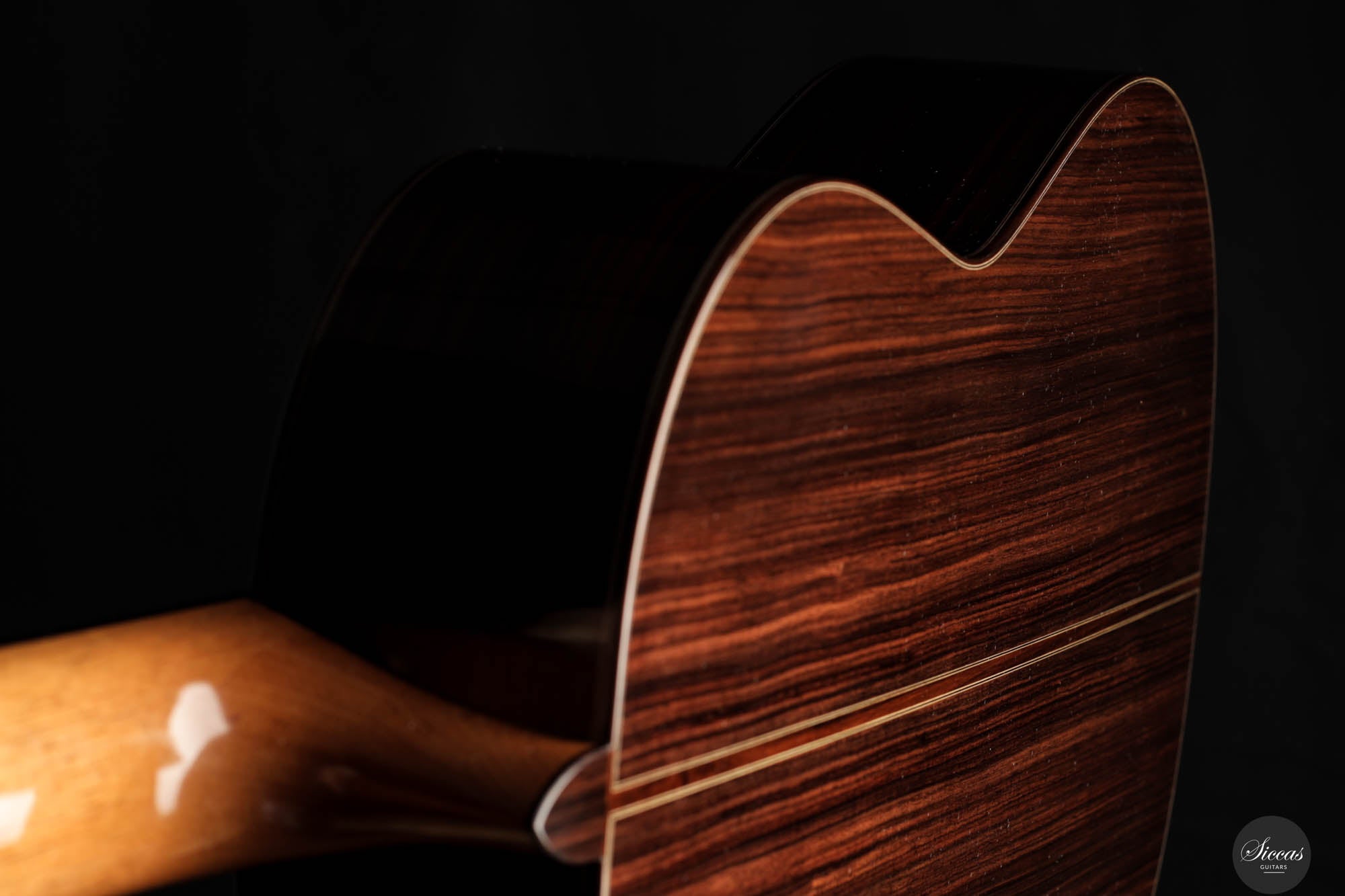 Diese exquisite Gitarre aus dem Jahr 2023 ist eine akribische Eins-zu-Eins-Kopie eines Meisterwerks von Daniel Friederich aus dem Jahr 1980, gefertigt mit der Hingabe, jedes ästhetische Detail des Originals einzufangen. Die visuelle Anziehungskraft der Gitarre ist eine Hommage an Friederichs klassisches Design und verkörpert die Eleganz und Zeitlosigkeit, für die seine Instrumente bekannt sind. Sie verfügt über eine Zedern-Schalldecke in Kombination mit atemberaubendem indischen Palisander für Rücken und Seiten, eine Kombination, die nicht nur ihre visuelle Anziehungskraft verstärkt, sondern auch erheblich zu ihren akustischen Eigenschaften beiträgt. Die Wahl von Zeder für die Schalldecke, bekannt für ihre warme Klangqualität, wird ergänzt durch das ikonische Friederich-7-Fächerstreben-System. Dieses System ist entscheidend, um die tonale Essenz der Gitarren von Daniel Friederich nachzubilden, und stellt sicher, dass diese zeitgenössische Kreation mit dem gleichen reichen und ausdrucksstarken Klang wie ihr historisches Gegenstück resoniert.