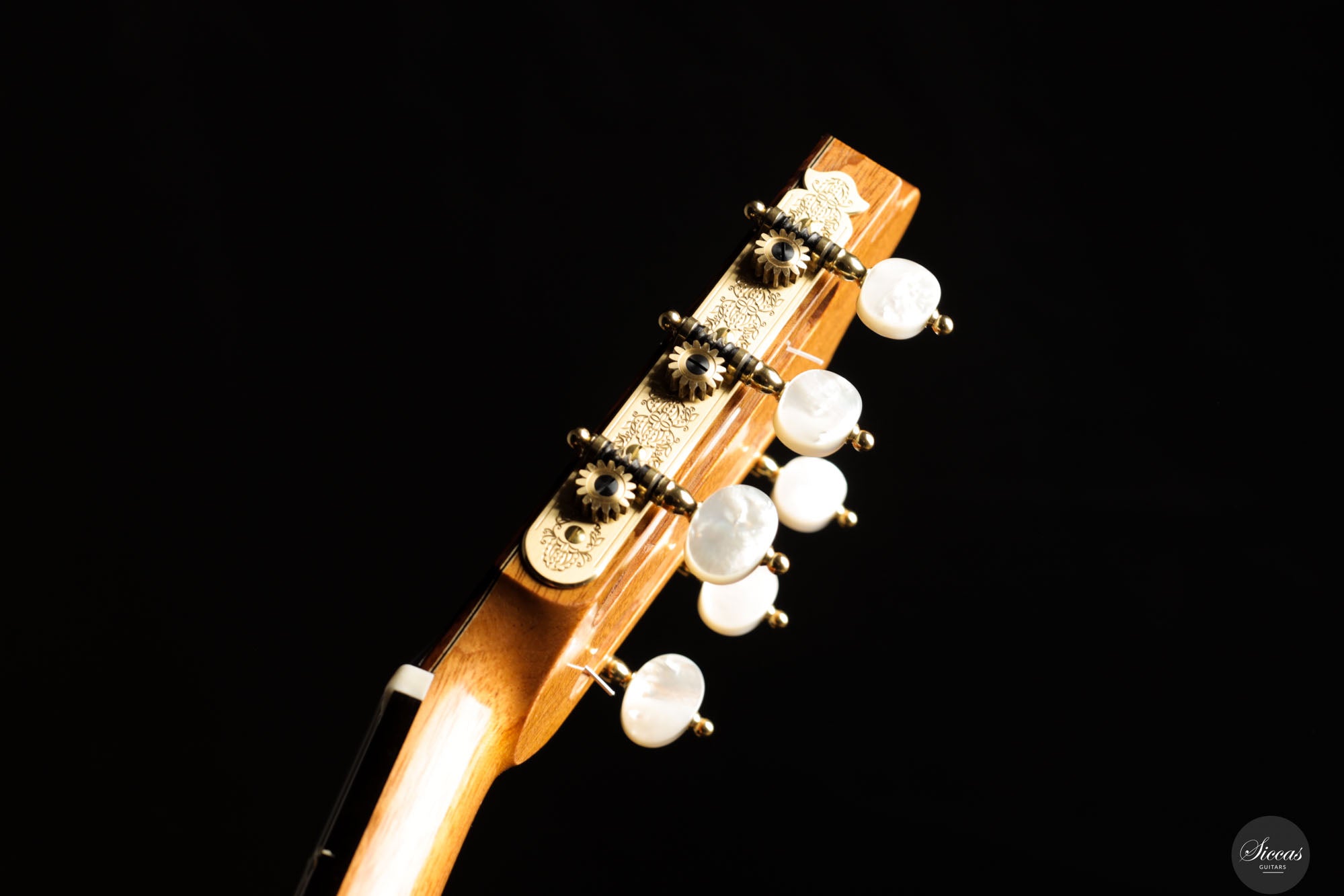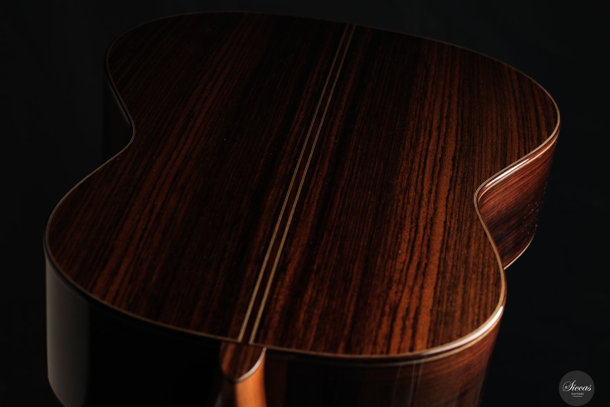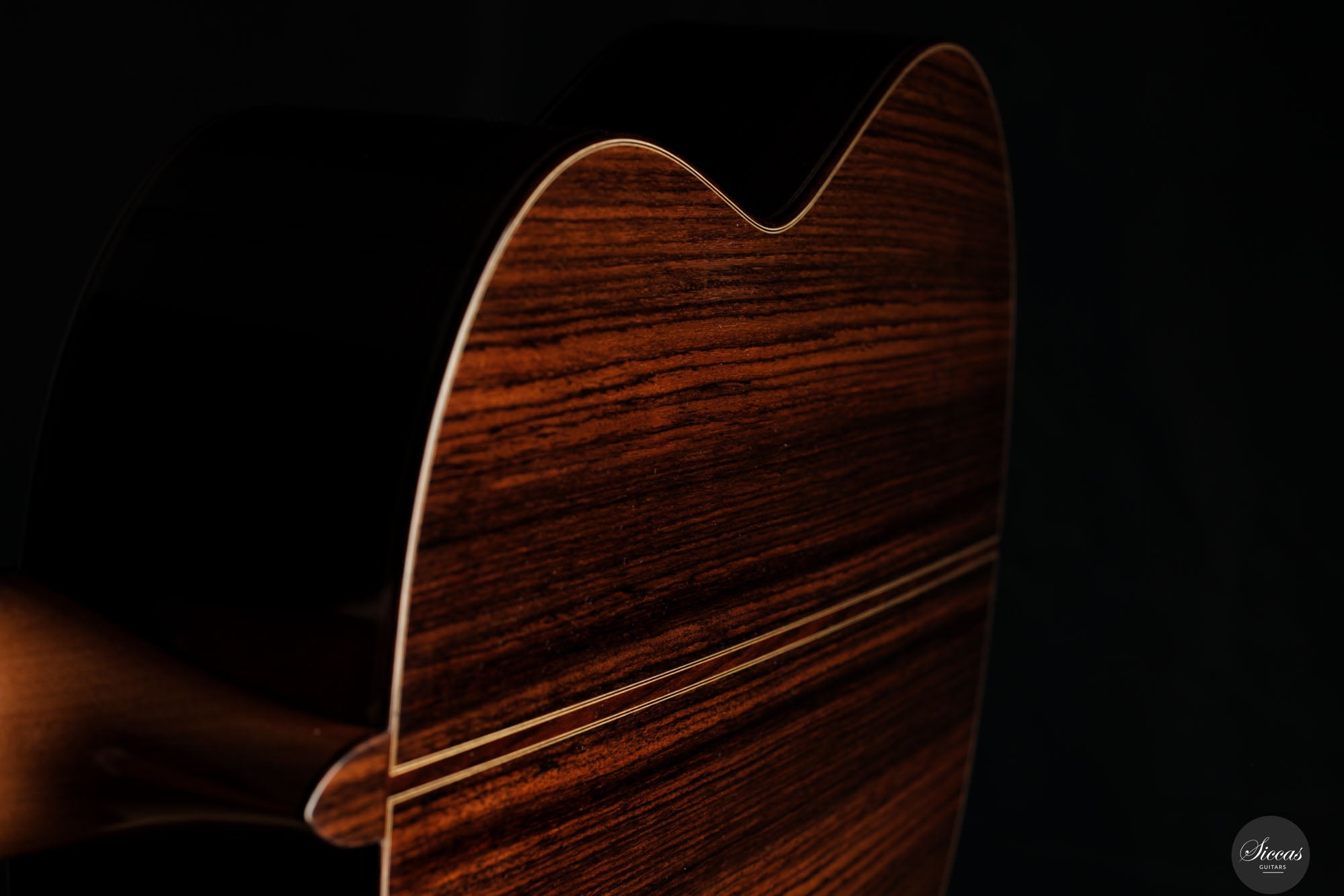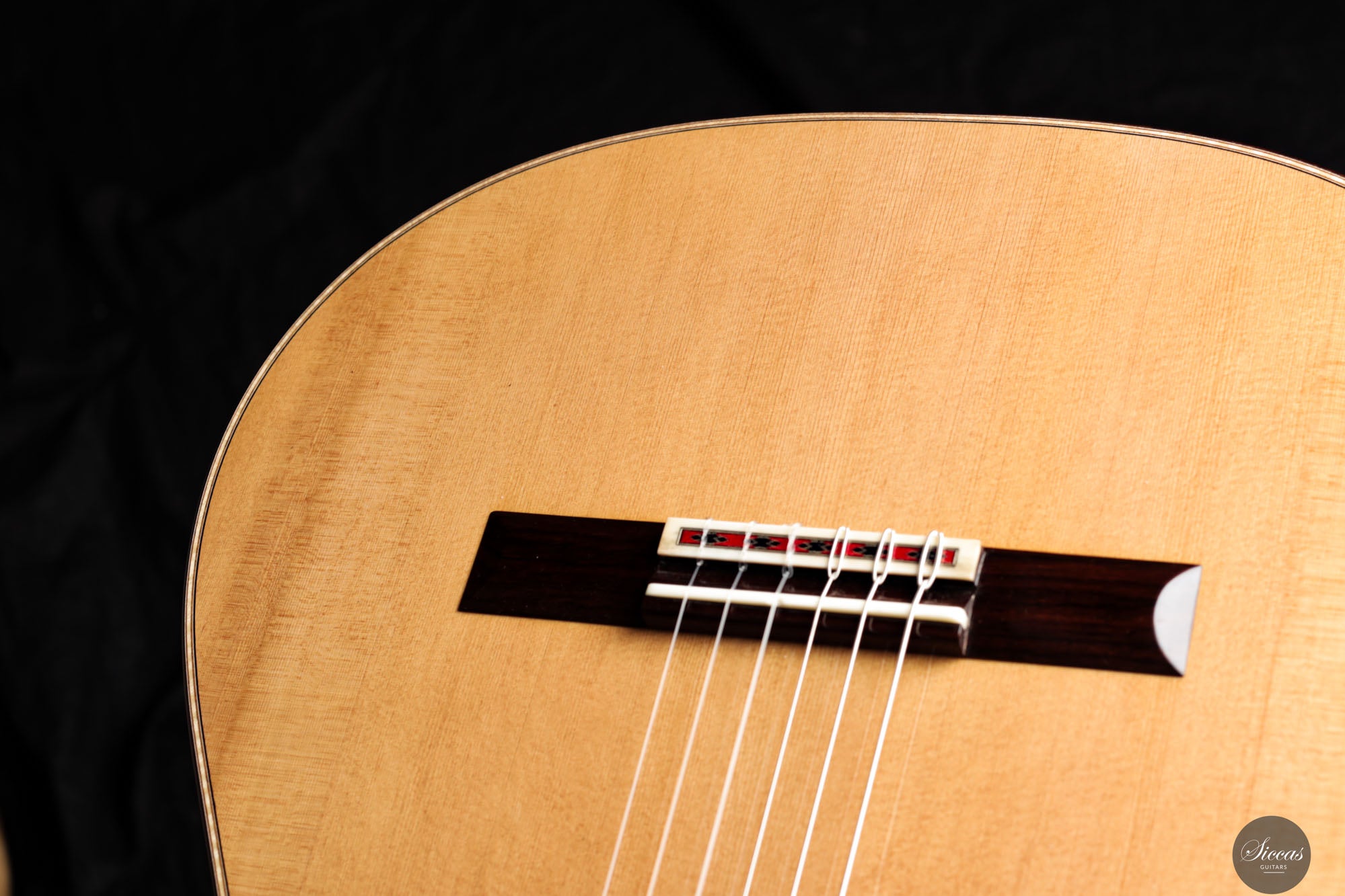 Diese Gitarre aus dem Jahr 2025 ist eine sorgfältig gefertigte Nachbildung des renommierten Modells von Daniel Friederich aus dem Jahr 1980, die jedes Detail des visuellen und strukturellen Designs originalgetreu wiedergibt. Sie verfügt über eine Zederndecke, kombiniert mit atemberaubendem indischen Palisander für Boden und Zargen, und verkörpert die ästhetische Eleganz und den akustischen Reichtum des Originals. Ein besonderes Merkmal dieses Modells ist Friederichs charakteristisches 7-Fächer-Bracing-System, das aus Zeder statt aus dem traditionell verwendeten Fichtenholz gefertigt ist. Diese durchdachte Wahl verbessert die strukturelle Integrität der Gitarre, ohne unnötiges Gewicht hinzuzufügen, und trägt wesentlich zu ihrem bemerkenswerten Klangvolumen und ihrer Resonanz bei.