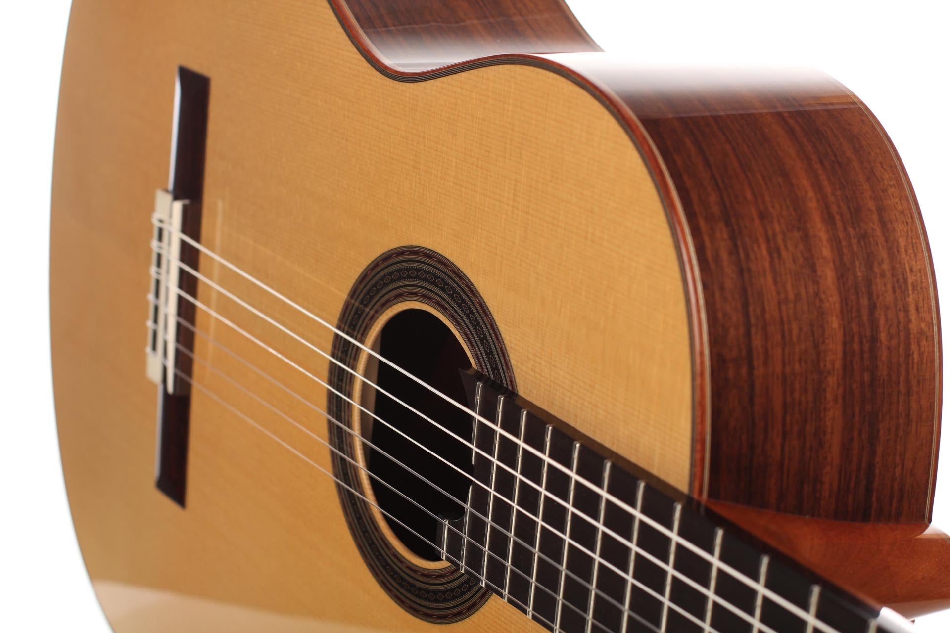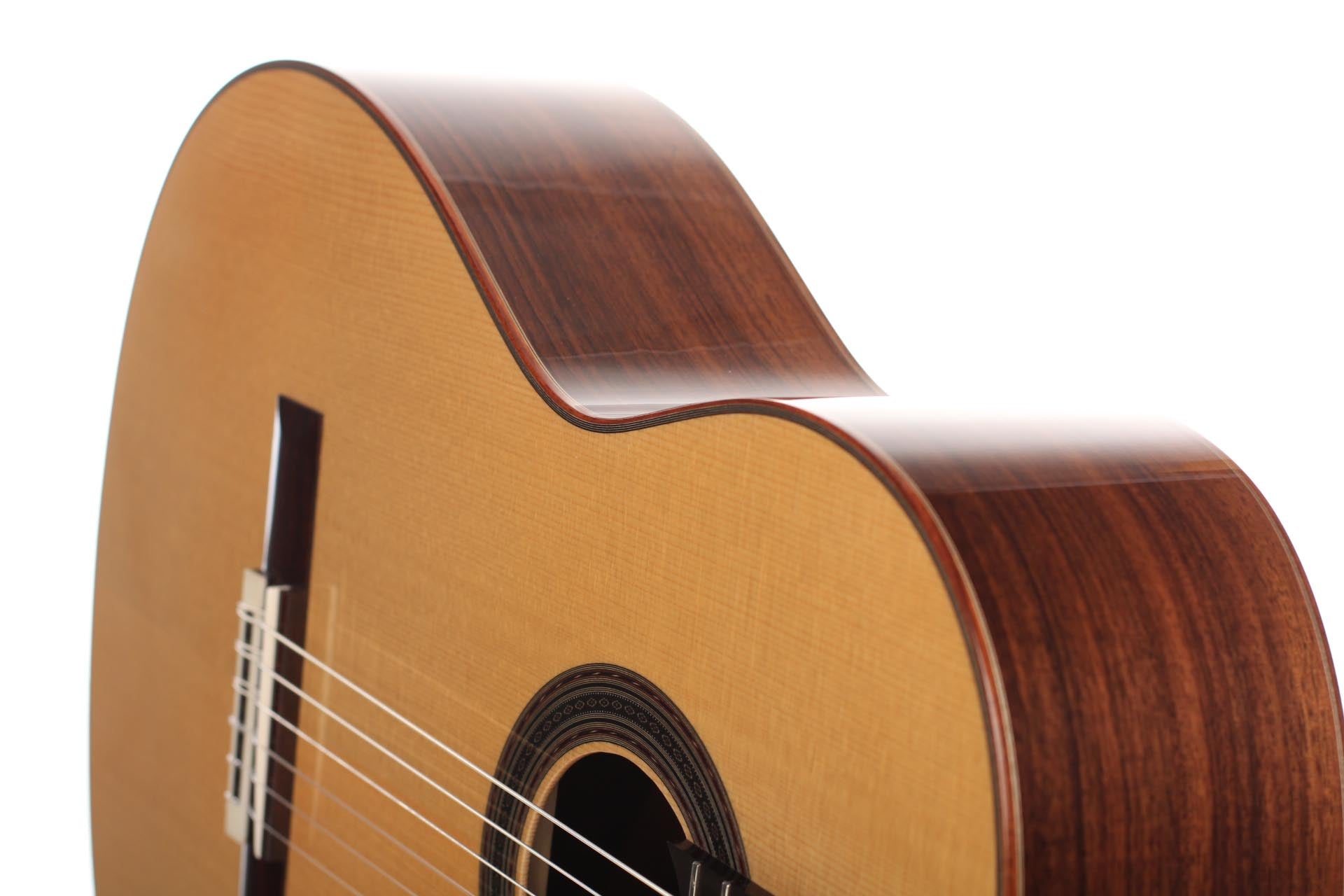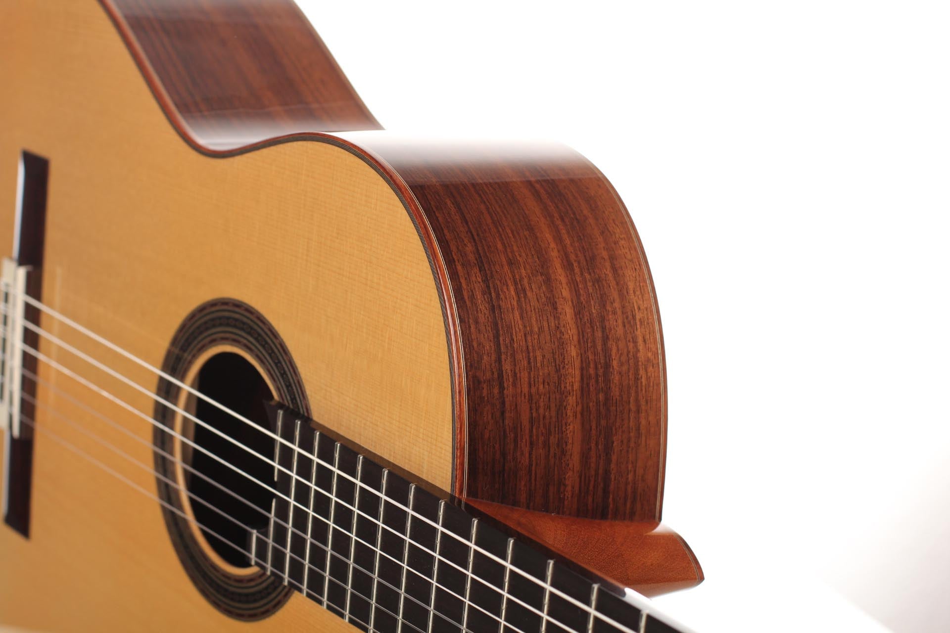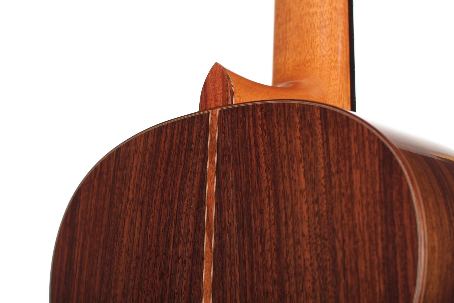 This 2018 guitar, comes as a result of a solid and deep understanding of the art of guitar making and reflects his ideal of sound, aesthetics and playability. This instrument is designed to fill concert halls, projecting a rich direct sound pleasing the player as well as the audience. A 40 years dried ebony fingerboard is used as well as a first quality spruce top and thoroughly selected Indian rosewood back and sides. The rosette and marquetry details are tremendously fine, with only a few tenth of millimetre sized elements. One of the most remarkable part of his guitars is probably one of the subtlest: the perfectly even and clear French polish that seals the wood and gives these refined deep colours and reflects to the top, back and sides. Definitely an amazing concert instrument from a promising guitar maker who will surely mark a turn in the French guitar-making tradition.