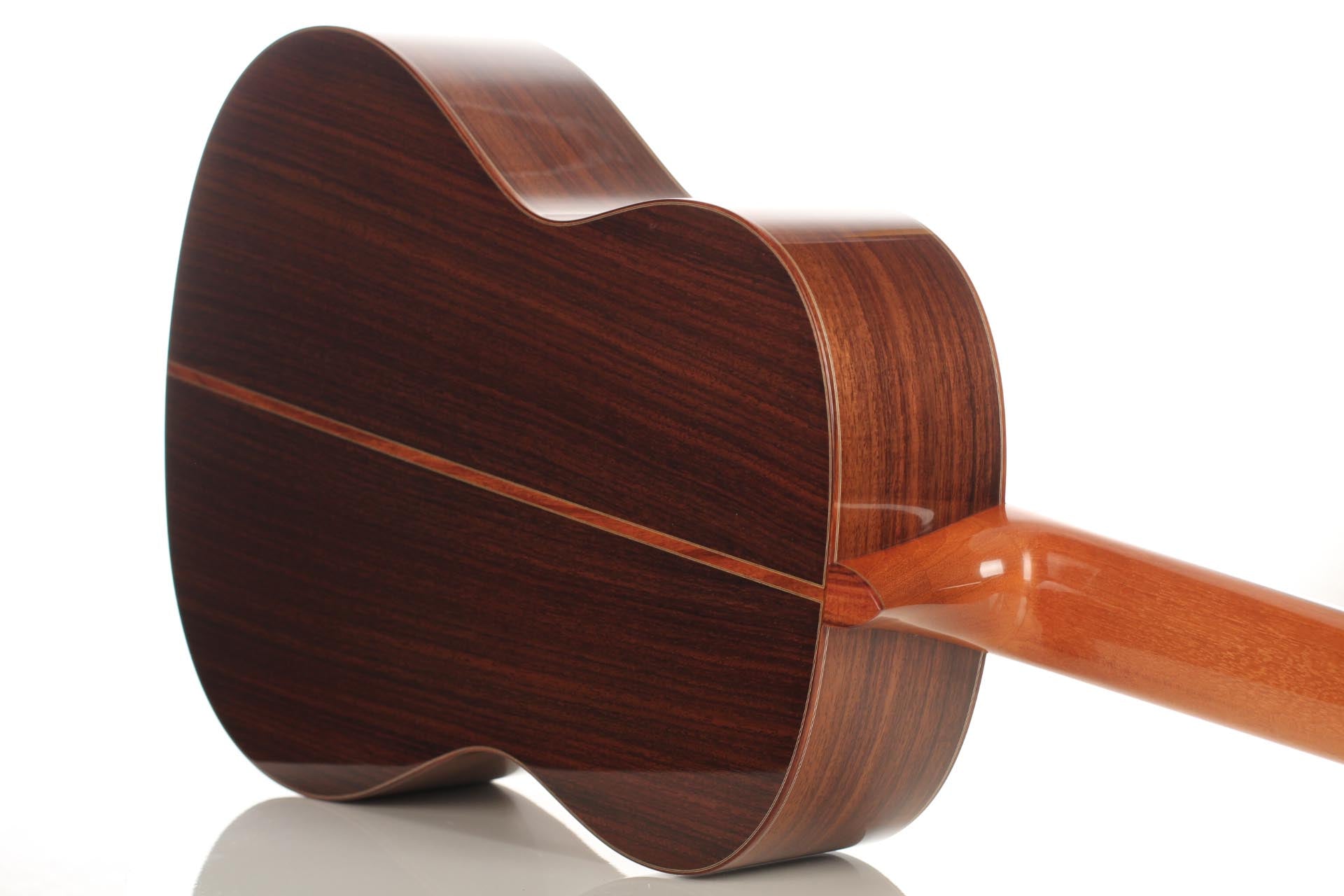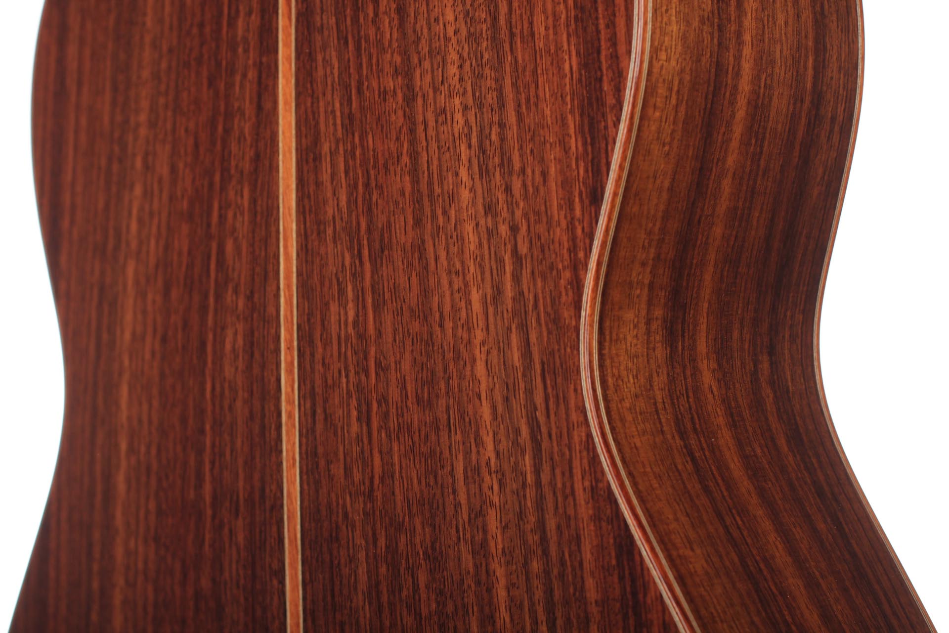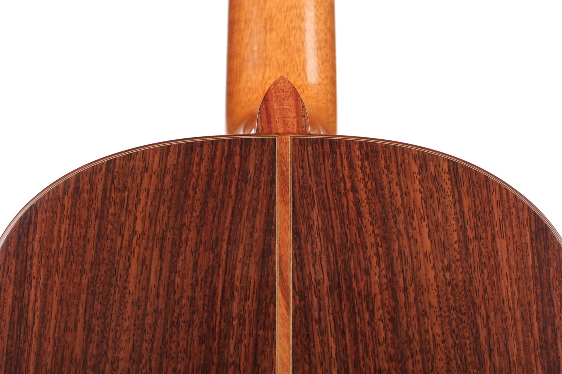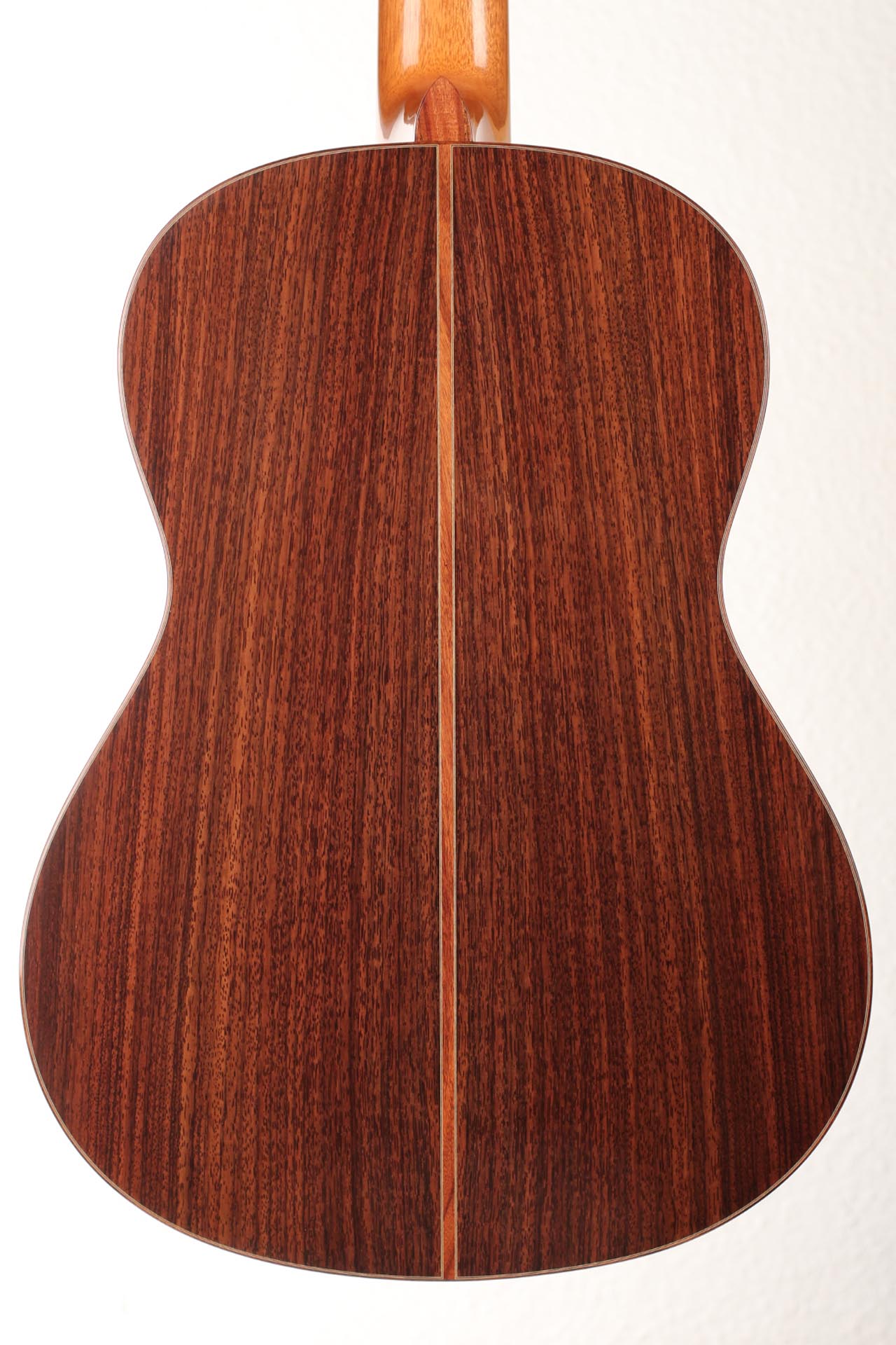 This 2018 guitar, comes as a result of a solid and deep understanding of the art of guitar making and reflects his ideal of sound, aesthetics and playability. This instrument is designed to fill concert halls, projecting a rich direct sound pleasing the player as well as the audience. A 40 years dried ebony fingerboard is used as well as a first quality spruce top and thoroughly selected Indian rosewood back and sides. The rosette and marquetry details are tremendously fine, with only a few tenth of millimetre sized elements. One of the most remarkable part of his guitars is probably one of the subtlest: the perfectly even and clear French polish that seals the wood and gives these refined deep colours and reflects to the top, back and sides. Definitely an amazing concert instrument from a promising guitar maker who will surely mark a turn in the French guitar-making tradition.