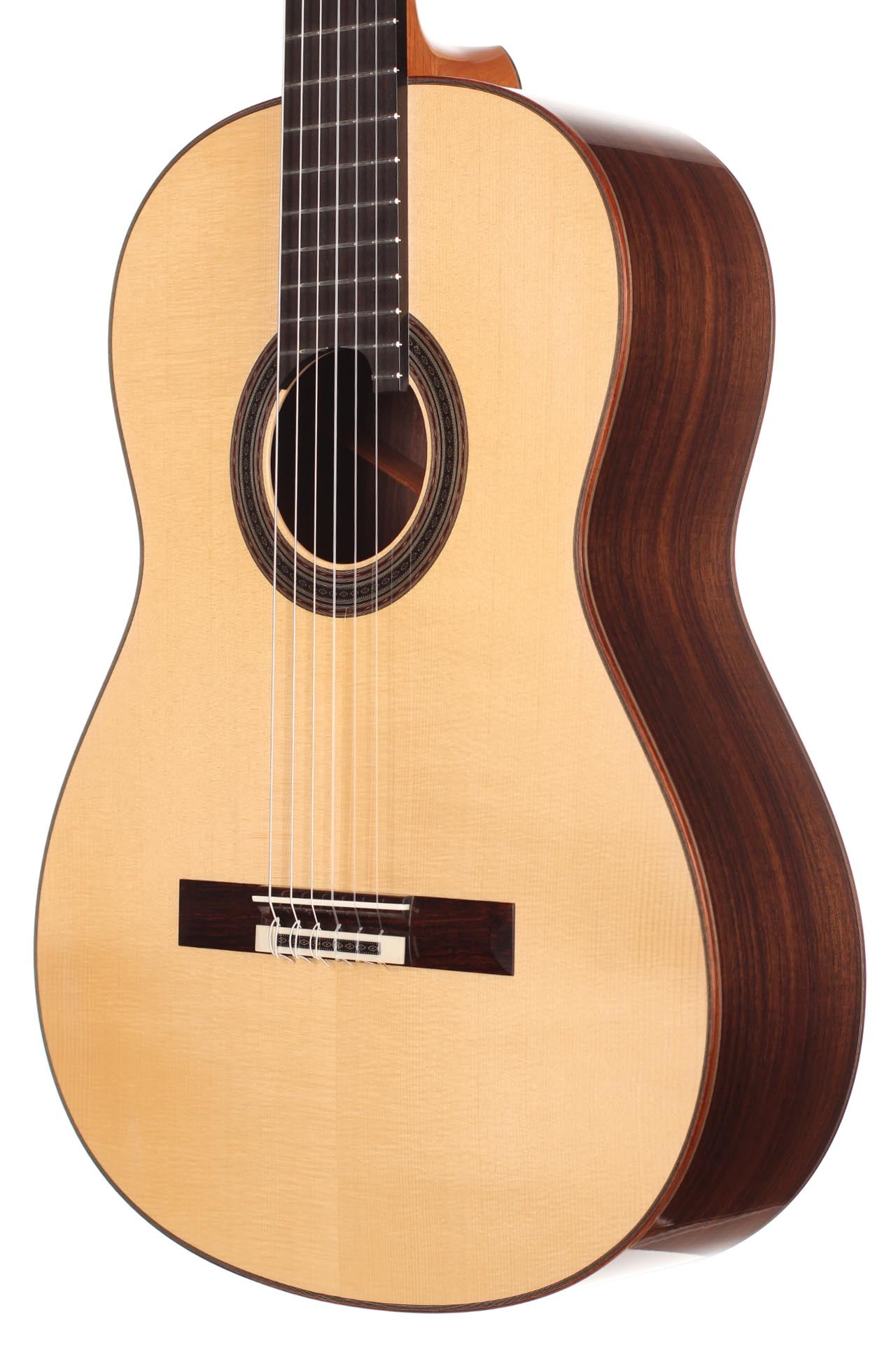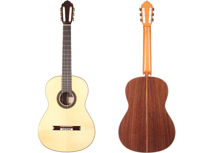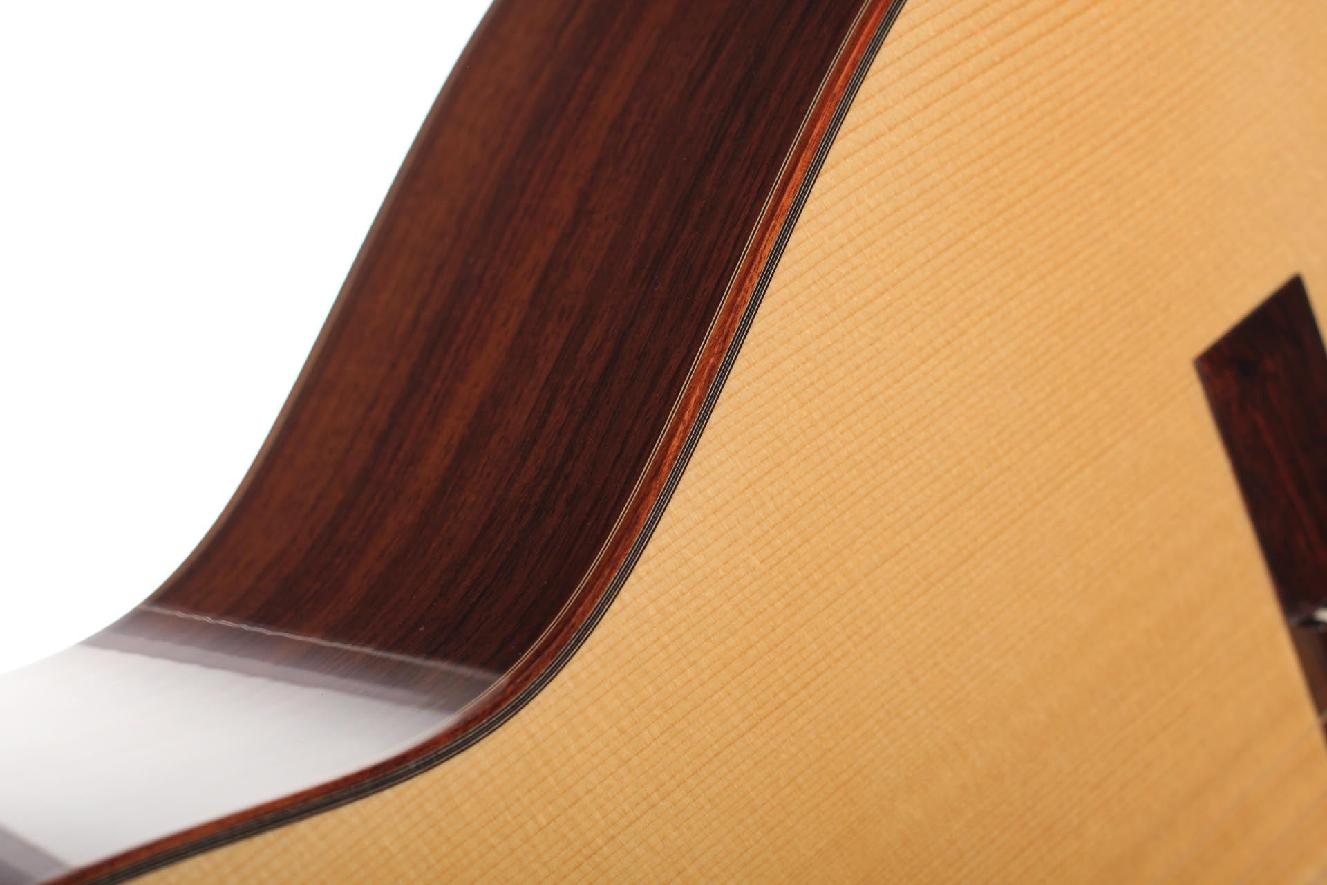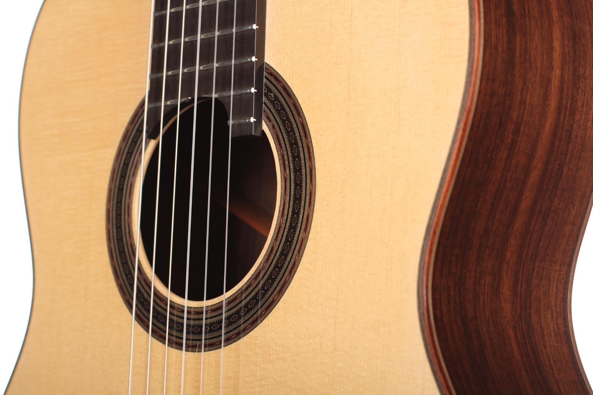 This 2018 guitar, comes as a result of a solid and deep understanding of the art of guitar making and reflects his ideal of sound, aesthetics and playability. This instrument is designed to fill concert halls, projecting a rich direct sound pleasing the player as well as the audience. A 40 years dried ebony fingerboard is used as well as a first quality spruce top and thoroughly selected Indian rosewood back and sides. The rosette and marquetry details are tremendously fine, with only a few tenth of millimetre sized elements. One of the most remarkable part of his guitars is probably one of the subtlest: the perfectly even and clear French polish that seals the wood and gives these refined deep colours and reflects to the top, back and sides. Definitely an amazing concert instrument from a promising guitar maker who will surely mark a turn in the French guitar-making tradition.