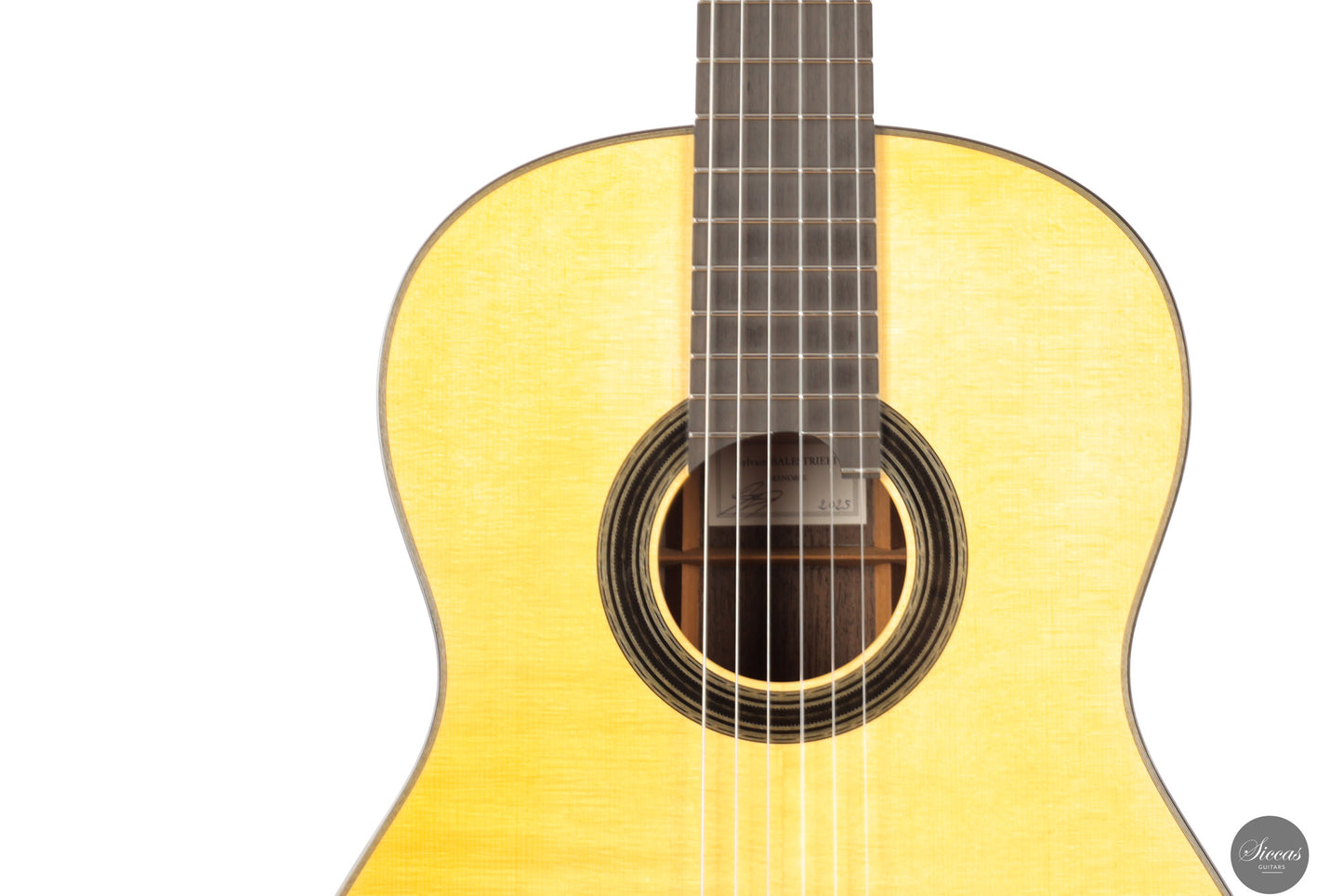 Diese Konzertgitarre aus dem Jahr 2025 verkörpert Sylvain Balestrieris Bestreben, die klangliche Fülle der französischen Gitarrentradition mit der Kraft, Tragfähigkeit und Ansprache zu verbinden, die auf modernen Konzertbühnen gefordert werden. Im Zentrum des Instruments steht eine Fichtendecke mit Sylvains eigener Rautenbeleistung, die von der klassischen Sieben-Fächer-Struktur inspiriert ist. Ziel dieser Konstruktion ist es, das Verhältnis von Steifigkeit zu Gewicht zu optimieren und dadurch eine dünnere, reaktionsfreudigere Decke mit längerer Tonhaltedauer, besserer Projektion und hervorragender Empfindlichkeit für den Anschlag zu erzielen.