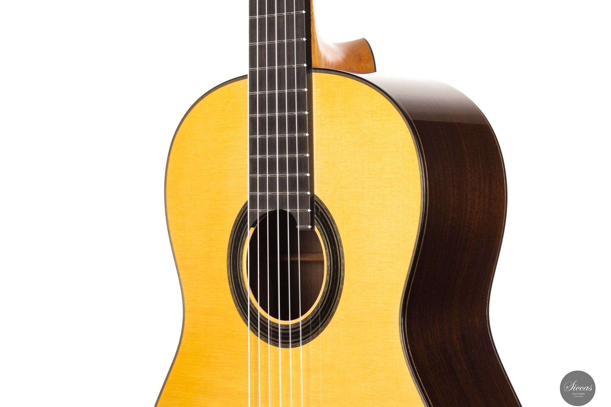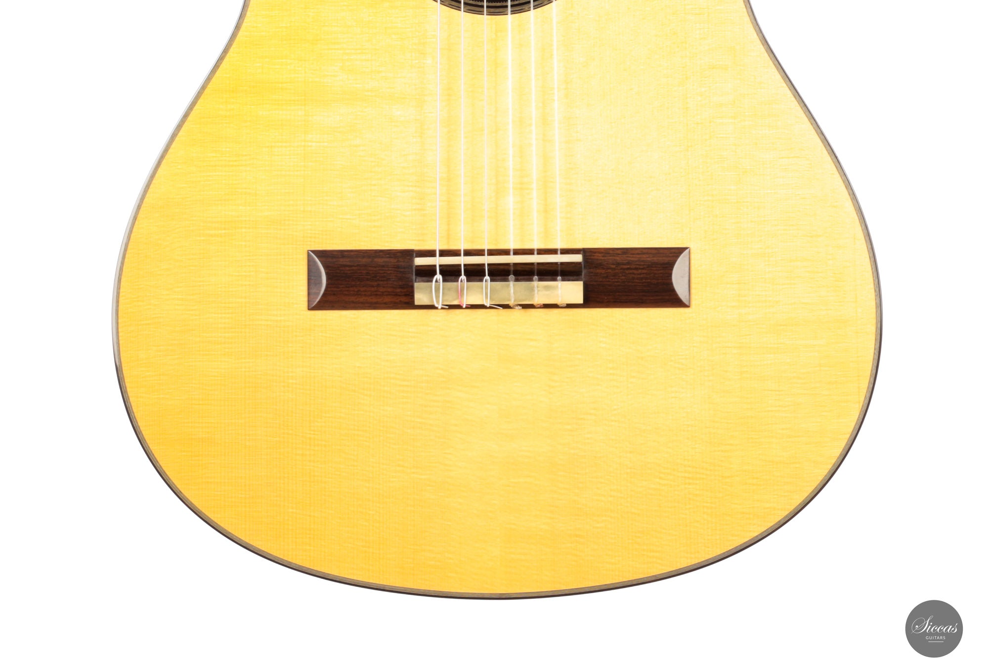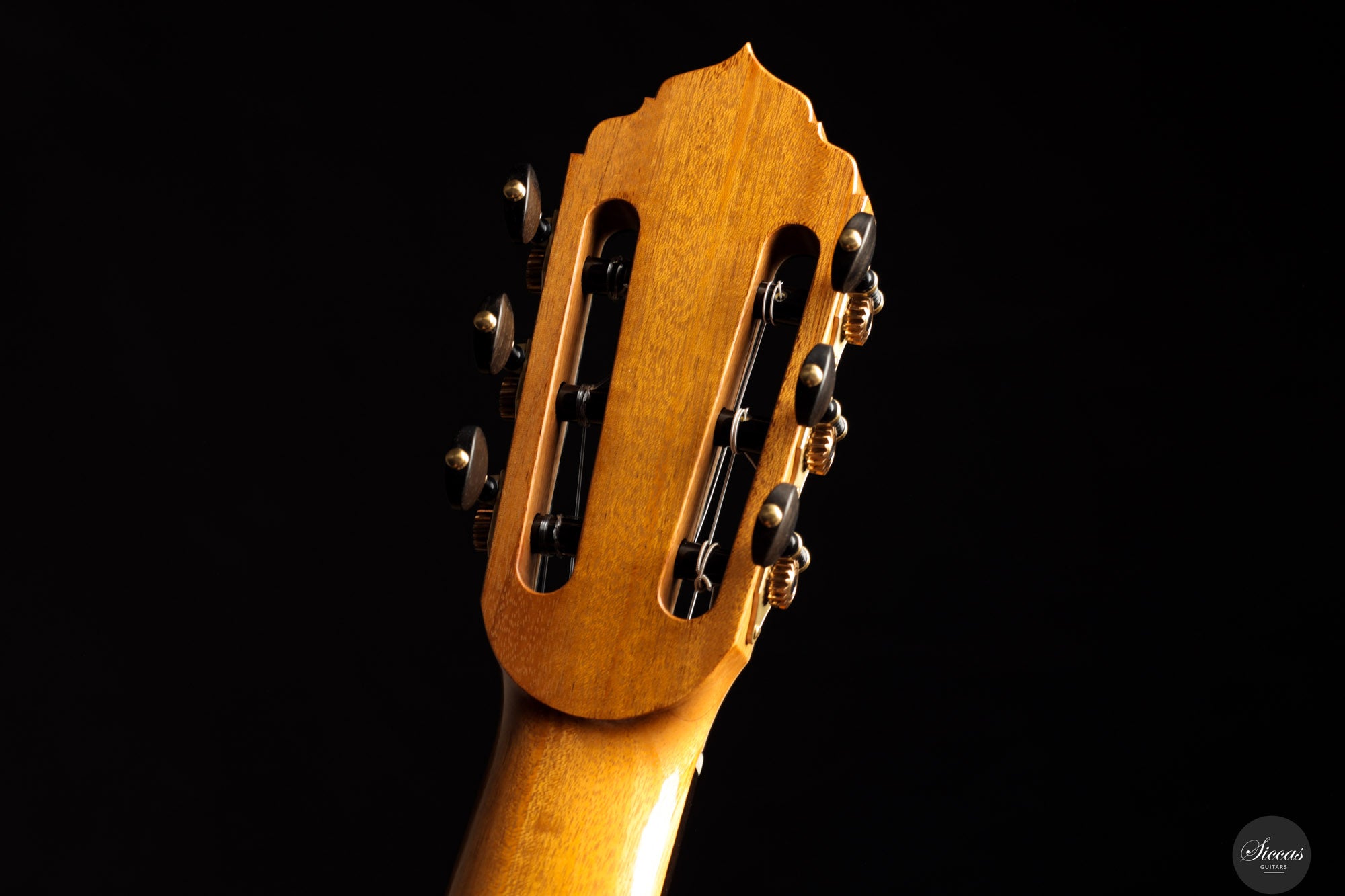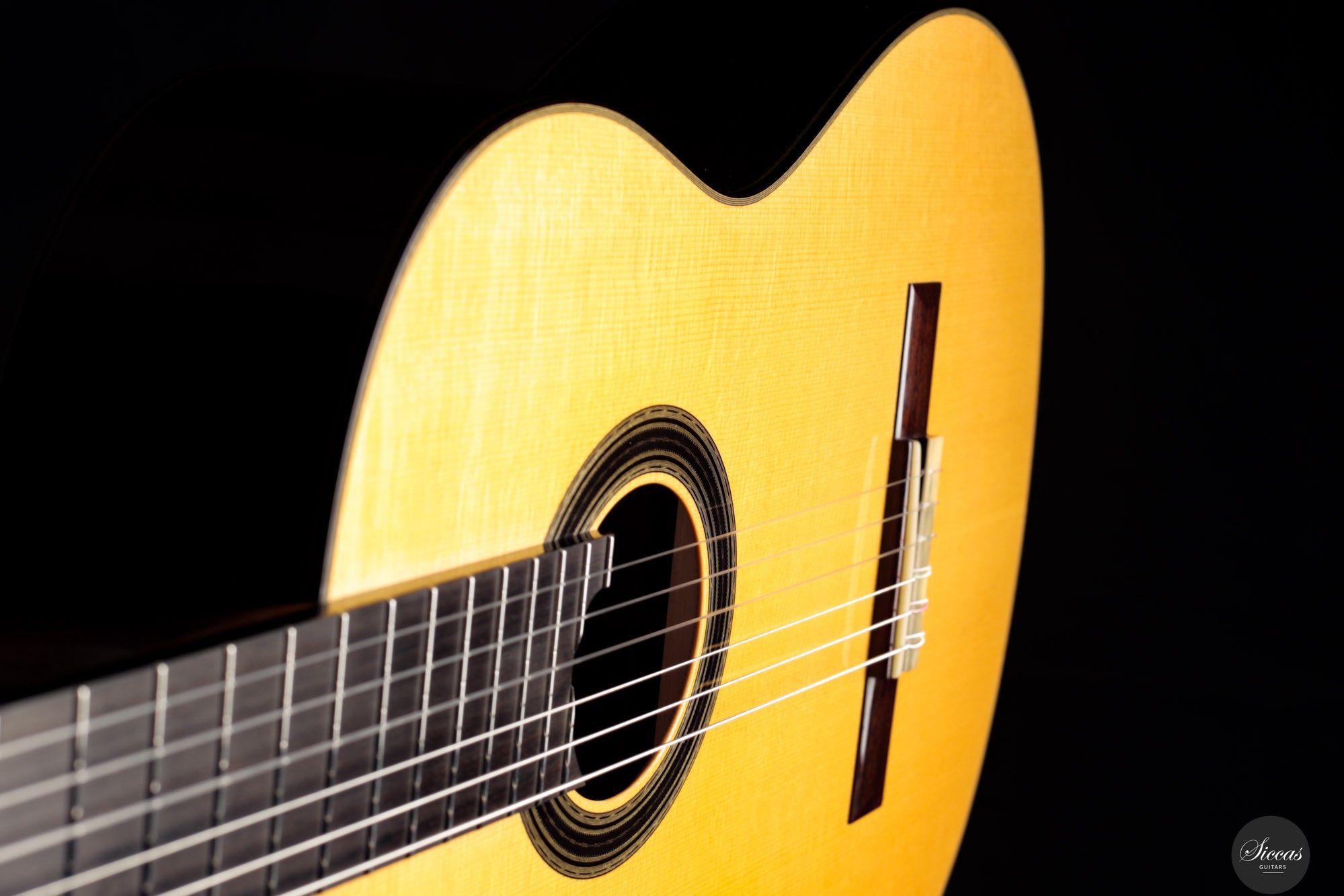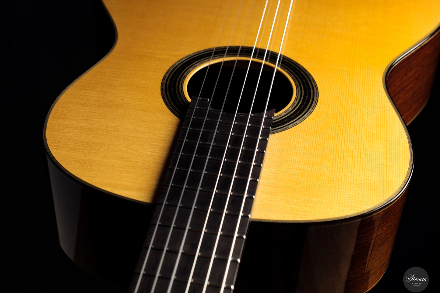Klanglich ist die Gitarre farbenreich und gesanglich, mit ausgezeichneter Trennung der Stimmen und müheloser Tragfähigkeit. Sie zeigt über den gesamten Dynamikbereich hinweg eine bemerkenswerte Ausgewogenheit und eignet sich sowohl für ausdrucksstarke Solopassagen als auch für komplexe Polyphonie. Die Edelstahlbünde tragen nicht nur zur Langlebigkeit bei, sondern verleihen dem Diskant auch eine dezente Brillanz, die insbesondere in den oberen Lagen zur Geltung kommt.