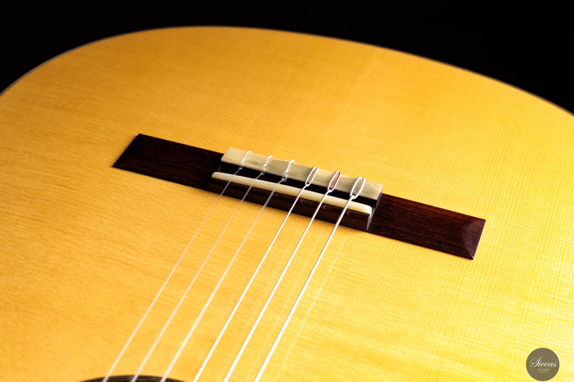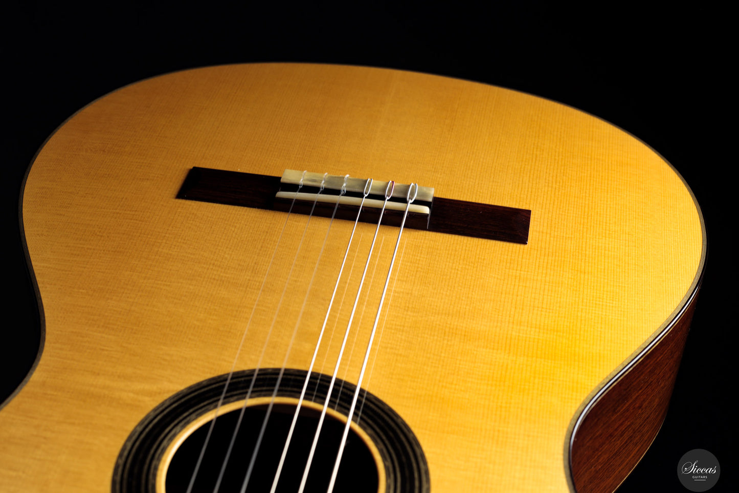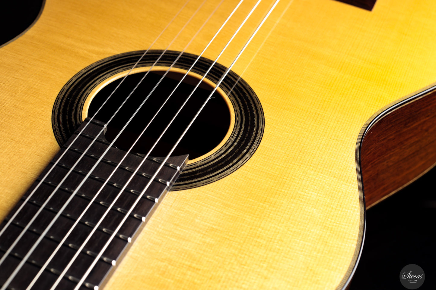 Sylvains Arbeit ist tief in der französischen Gitarrenbautradition verwurzelt und wird durch den Einfluss von Robert Bouchet, Daniel Friederich und Dominique Field geprägt. In der Tradition von Friederich verfolgt Sylvain einen wissenschaftlich fundierten, präzisen Ansatz. Er misst sorgfältig die Dichte, das Gewicht und die Verformung der Decke unter Druck, sowohl längs als auch quer, in verschiedenen Phasen des Baus. Dieses analytische Vorgehen ermöglicht es ihm, Instrumente von gleichbleibend hoher Qualität zu schaffen und gleichzeitig kontinuierlich neue Grenzen auszuloten.
