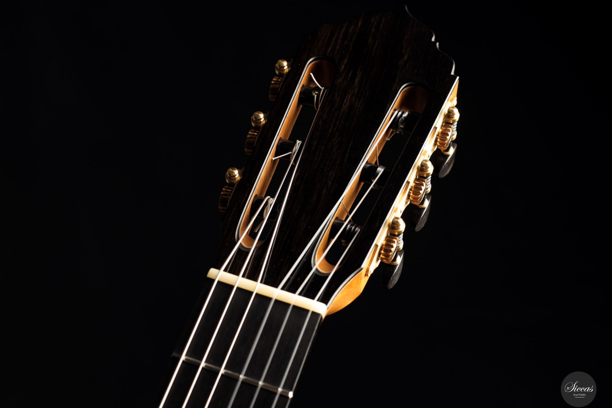Ebenso beeindruckend ist die visuelle Eleganz dieses Instruments. Für Sylvain sind Form und Klang untrennbare Elemente künstlerischen Ausdrucks. Die Gitarre zeichnet sich durch harmonische Proportionen aus, vom fein konturierten Korpus bis zur abgestimmten Kopfplatte. Die zurückhaltende Rosette aus Schwarz-Weiß-Motiven bildet zusammen mit der Einfassung ein stimmiges Gesamtbild, ergänzt durch polierte Stimmwirbel aus schwarzem Büffelhorn. Aus der Nähe offenbart sich die außergewöhnliche Präzision der Details: Einlagen mit nur 0,18 mm Breite, ein fein skaliertes Fischgrätmuster und doppelte Punktkränze aus 0,3 mm starken Furnieren. Jedes Detail wurde mit dem Ziel gestaltet, klangliche und visuelle Harmonie zu schaffen.