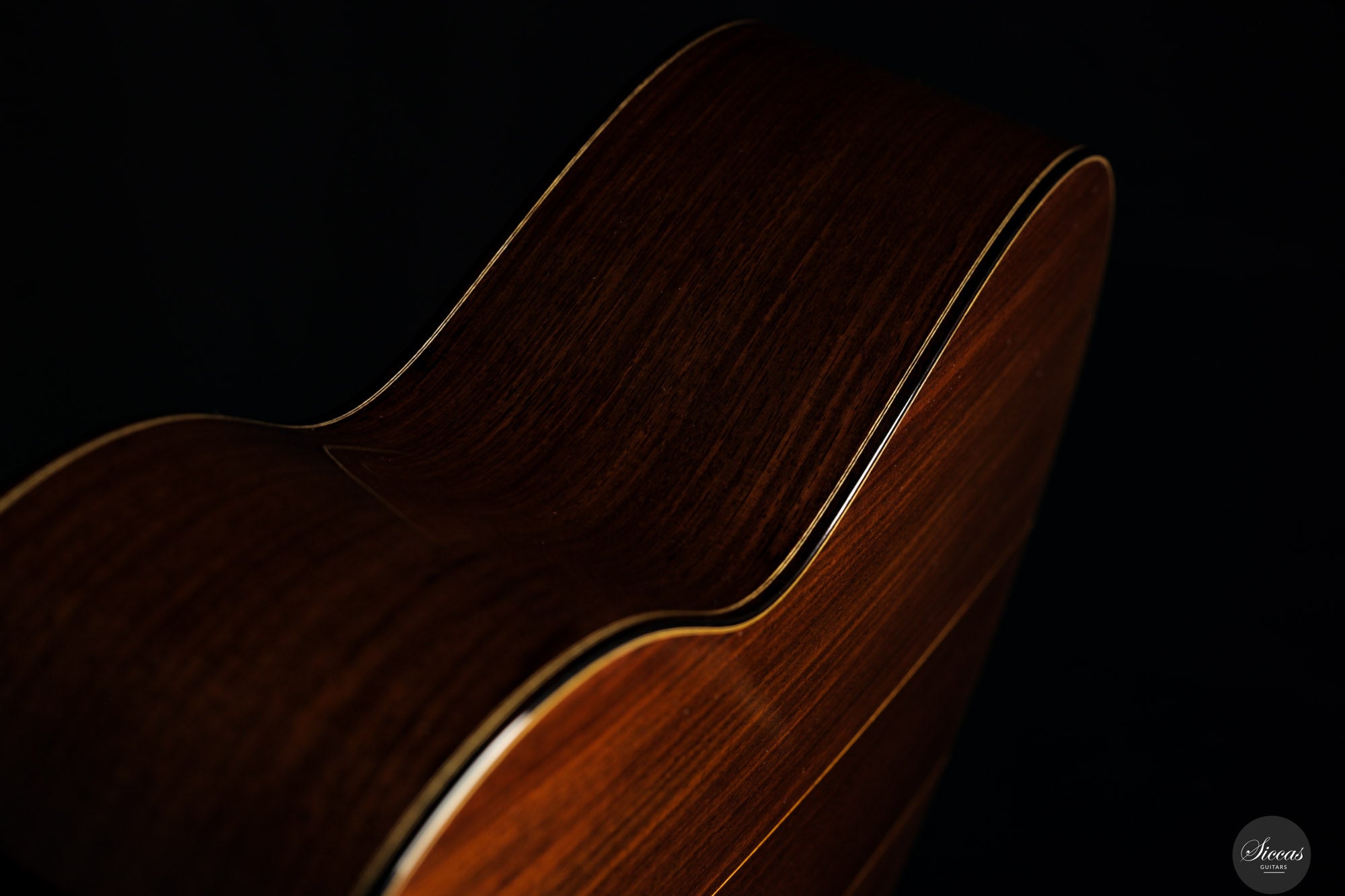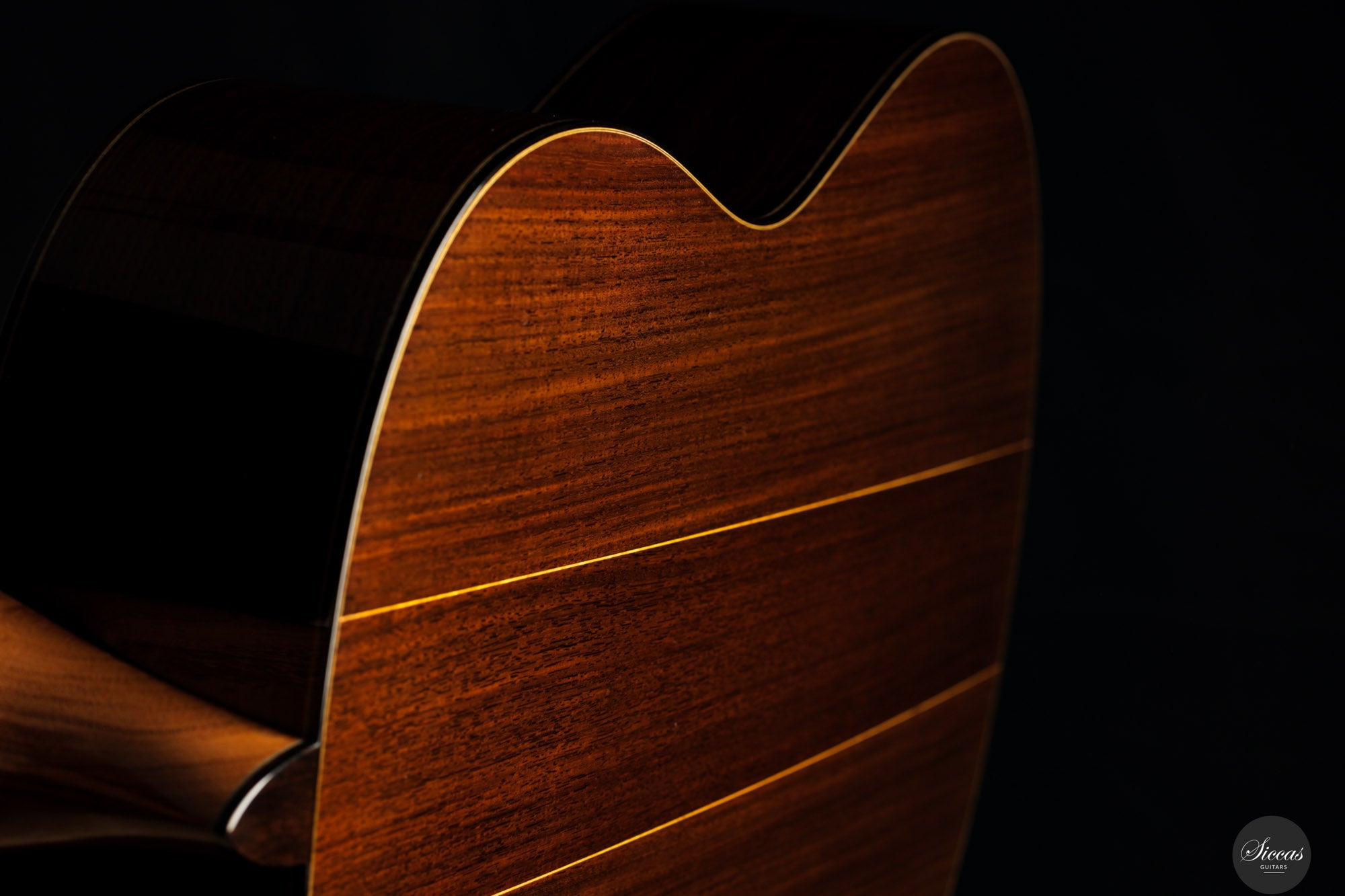 Boden und Zargen sind mit einer komplexen internen Struktur versehen. Der Boden verfügt über neun Verstrebungen, hoch und schmal in Querrichtung, die die hohen Obertöne anreichern, dabei aber leicht genug bleiben, um hohe Frequenzen mitschwingen zu lassen. Die Zargen folgen demselben Prinzip: Anstelle einer doppelten Wand setzt Sylvain auf eine feingliedrige, leichte Verstrebung, die Transparenz, Stimmtrennung und Resonanz über das gesamte Frequenzspektrum hinweg fördert. Diese aufgeteilte Bauweise unterstützt die polyphone Klangstruktur und verleiht der Gitarre eine tiefe, räumliche Klangwirkung, vergleichbar mit der akustischen Funktion segmentierter Wände in einem Konzertsaal.