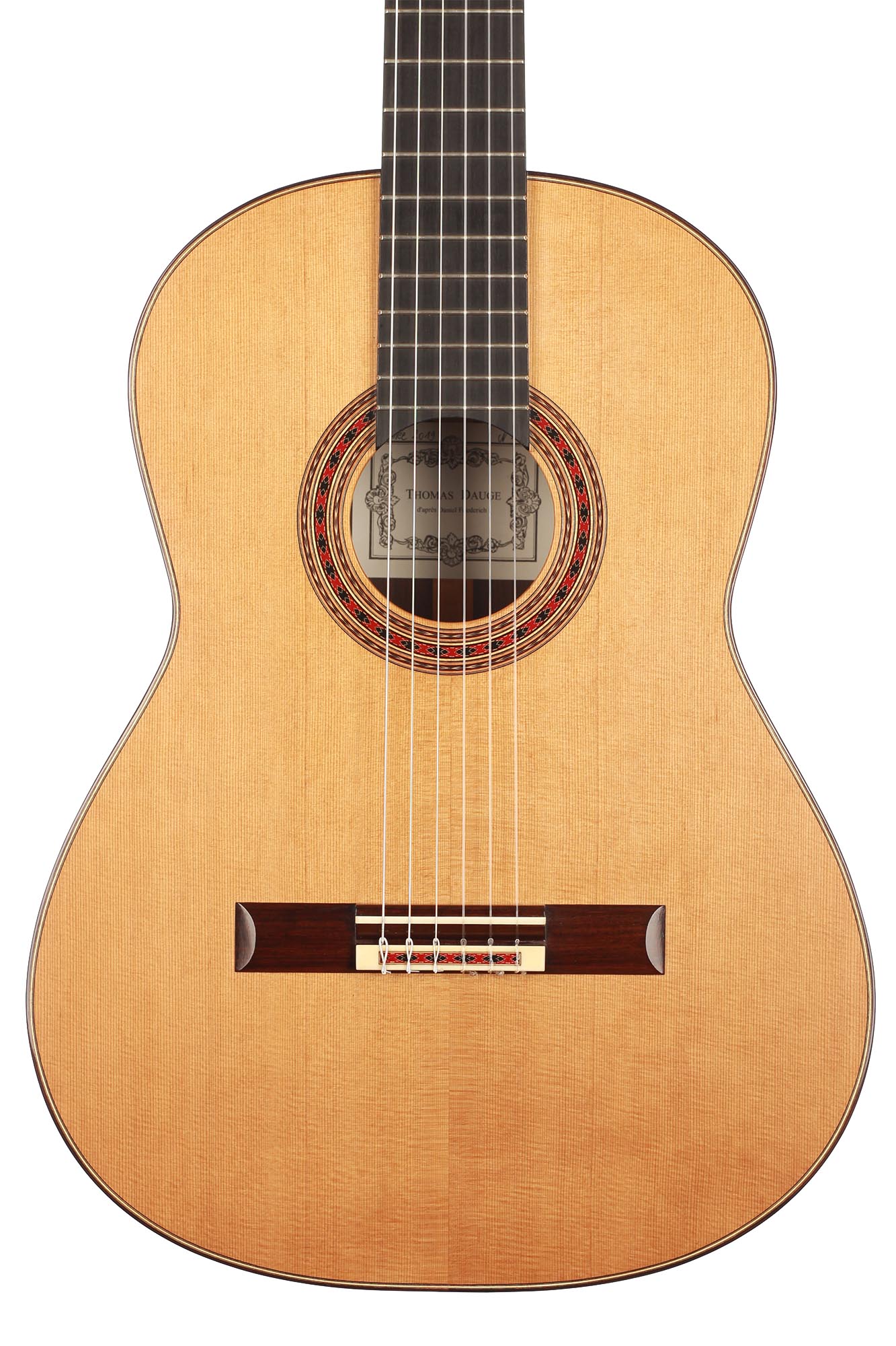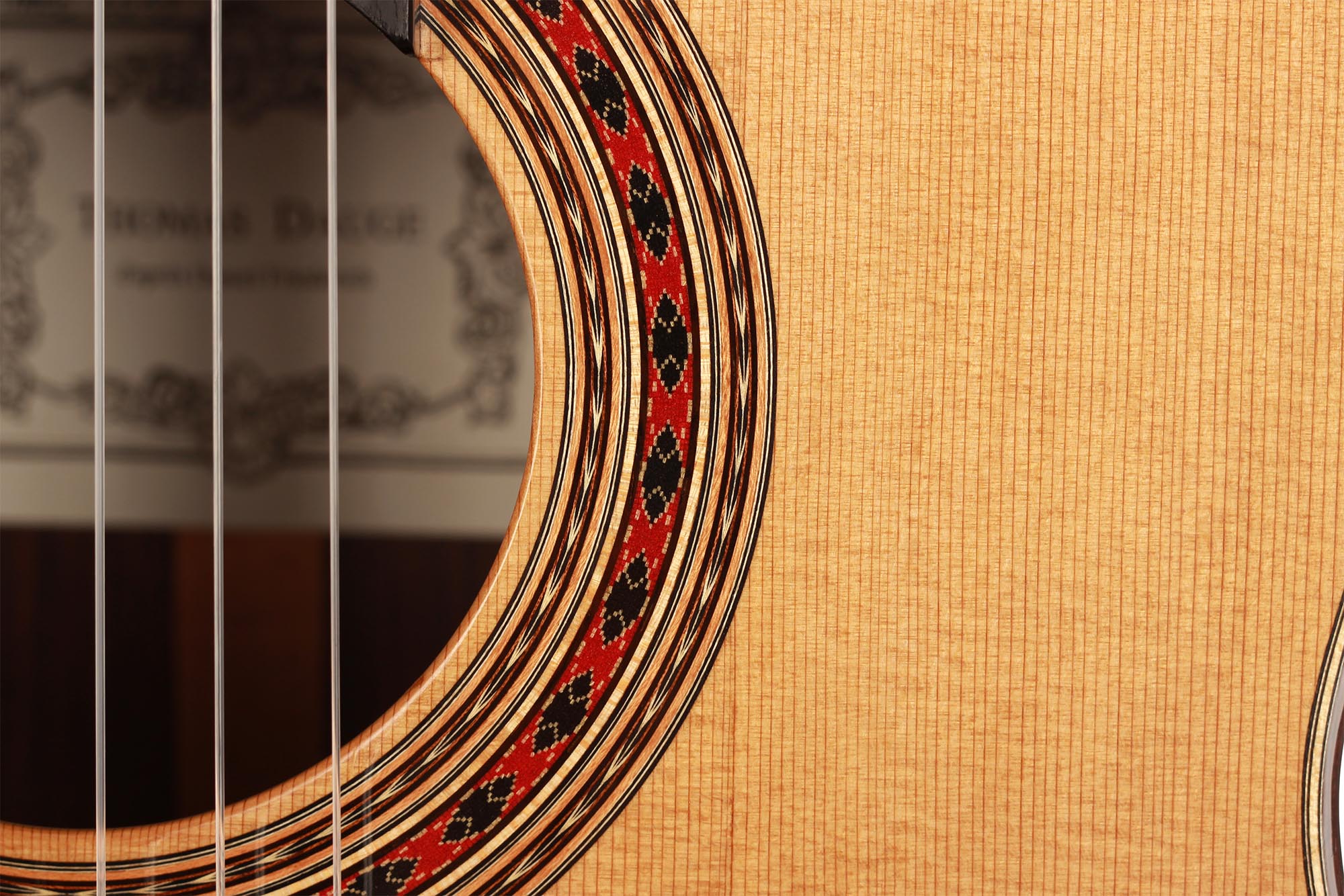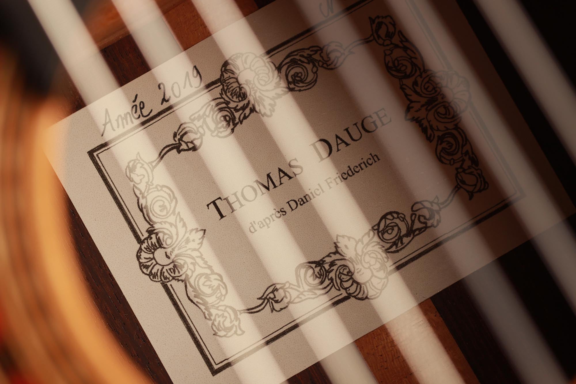 Thomas Dauge is a French guitar maker based in Bordeaux. He follows the French tradition of guitar making and proves great skills in the design and construction of the rosette and other marquetry elements. Thomas Dauge pays great attention to every detail of the instrument, such as the choice of wood, the quality of shellac polish, the clean execution of the joints and, above all, the sound characteristics of his guitars. He succeeds in building very well-balanced instruments with complex timbre and excellent playability.
