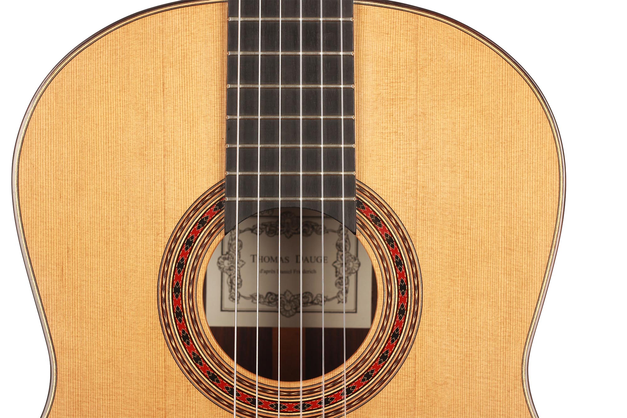 With this guitar, which he built as a tribute to Daniel Friederich, Thomas Dauge has once again achieved an absolute masterpiece. This exact copy corresponds to the original in every detail. Both in the quality of the woods and the inlay work, as well as in the perfect execution of the varnish. Also in terms of sound, it is amazingly close to the instruments of the master Daniel Friederich.
