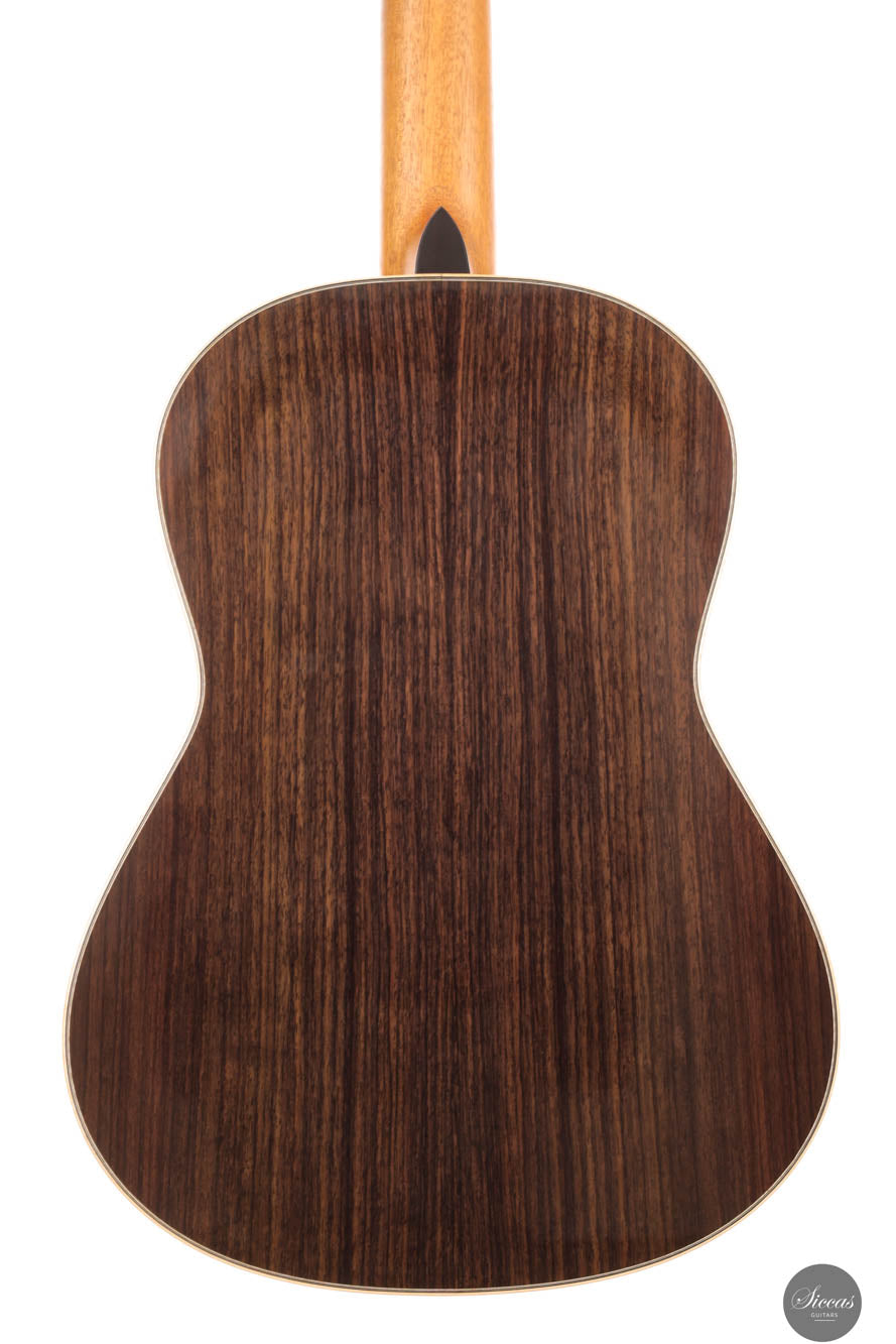 Die Gitarre von Toby Rzepka aus dem Jahr 2024 zeigt diese Philosophie eindrucksvoll und verbindet nahtlos Tradition und Moderne. Auf den ersten Blick fällt die klassische Korpusform ins Auge, die die zeitlosen Designkonventionen des Gitarrenbaus ehrt. Bei näherer Betrachtung erkennt man jedoch innovative Details wie die von Toby entwickelte Lattice-Versteifung. Anders als viele australische Gitarrenbauer, die dünnere Decken und kohlefaserverstärkte Leisten verwenden, setzt Toby auf eine robuste Decke ohne Kohlenstoffverstärkungen, was dem Instrument eine einzigartige Klangidentität verleiht. Mit einer Fichtendecke für klare Höhen und indischem Palisander für reiche, resonante Tiefen erzeugt diese Gitarre einen natürlichen und ausgewogenen Klang. Sie ist mehr als nur ein Instrument – sie ist ein Zeugnis von Tobys Handwerkskunst und seiner Fähigkeit, Tradition mit zukunftsweisendem Design zu vereinen.
