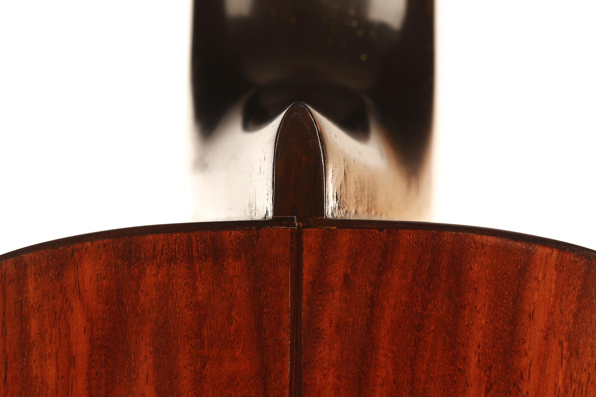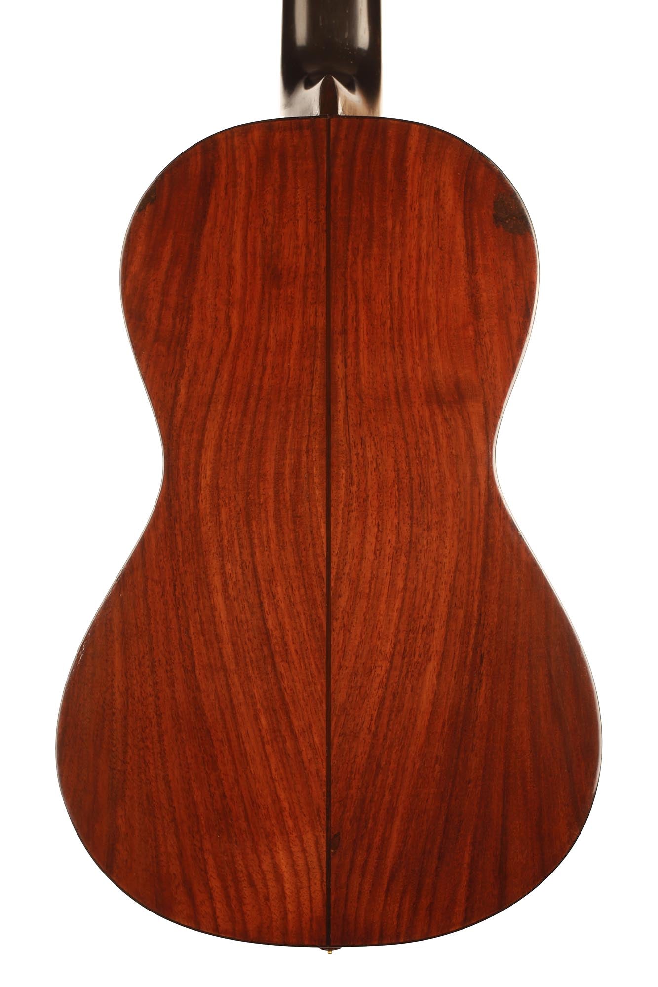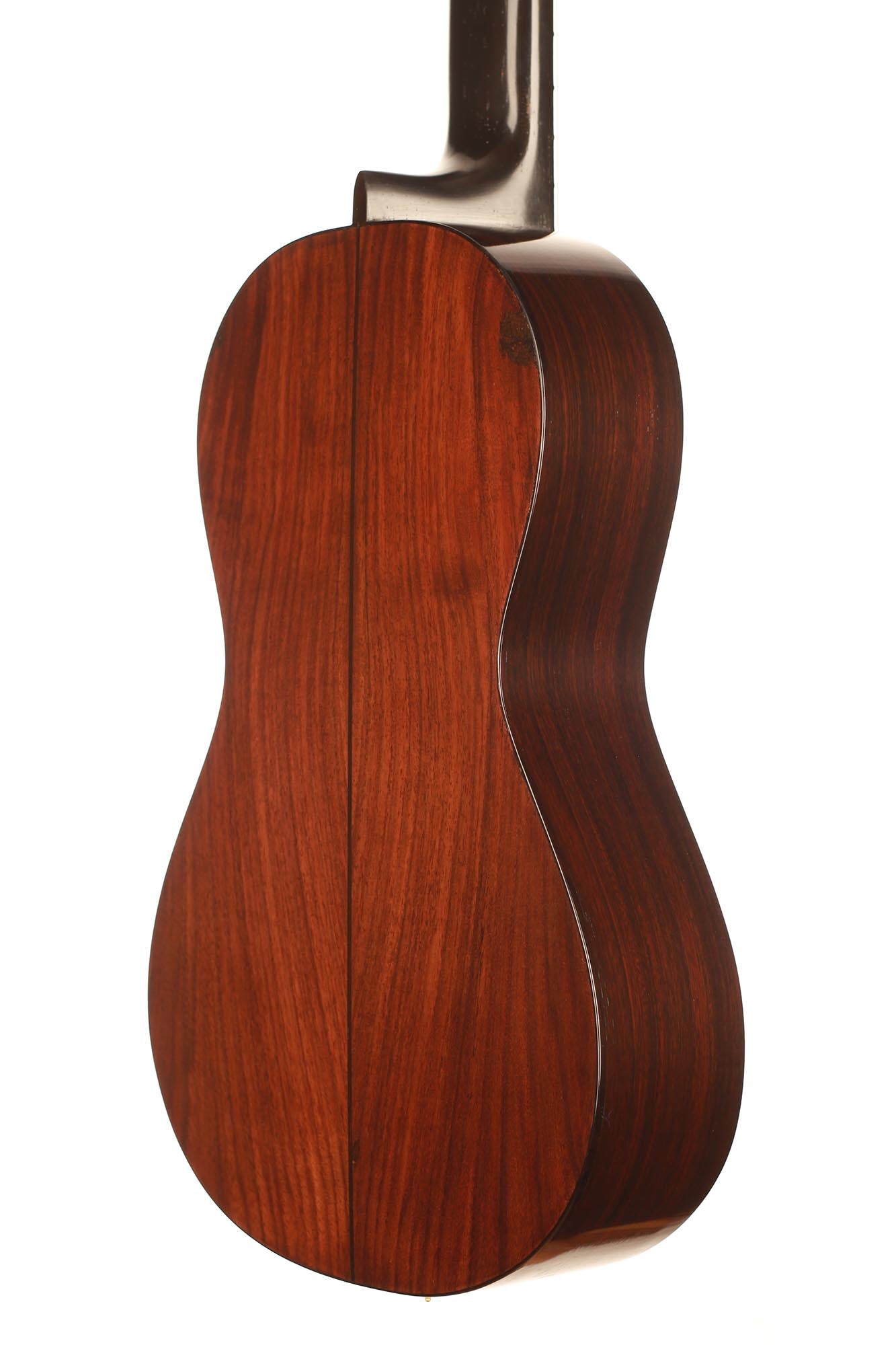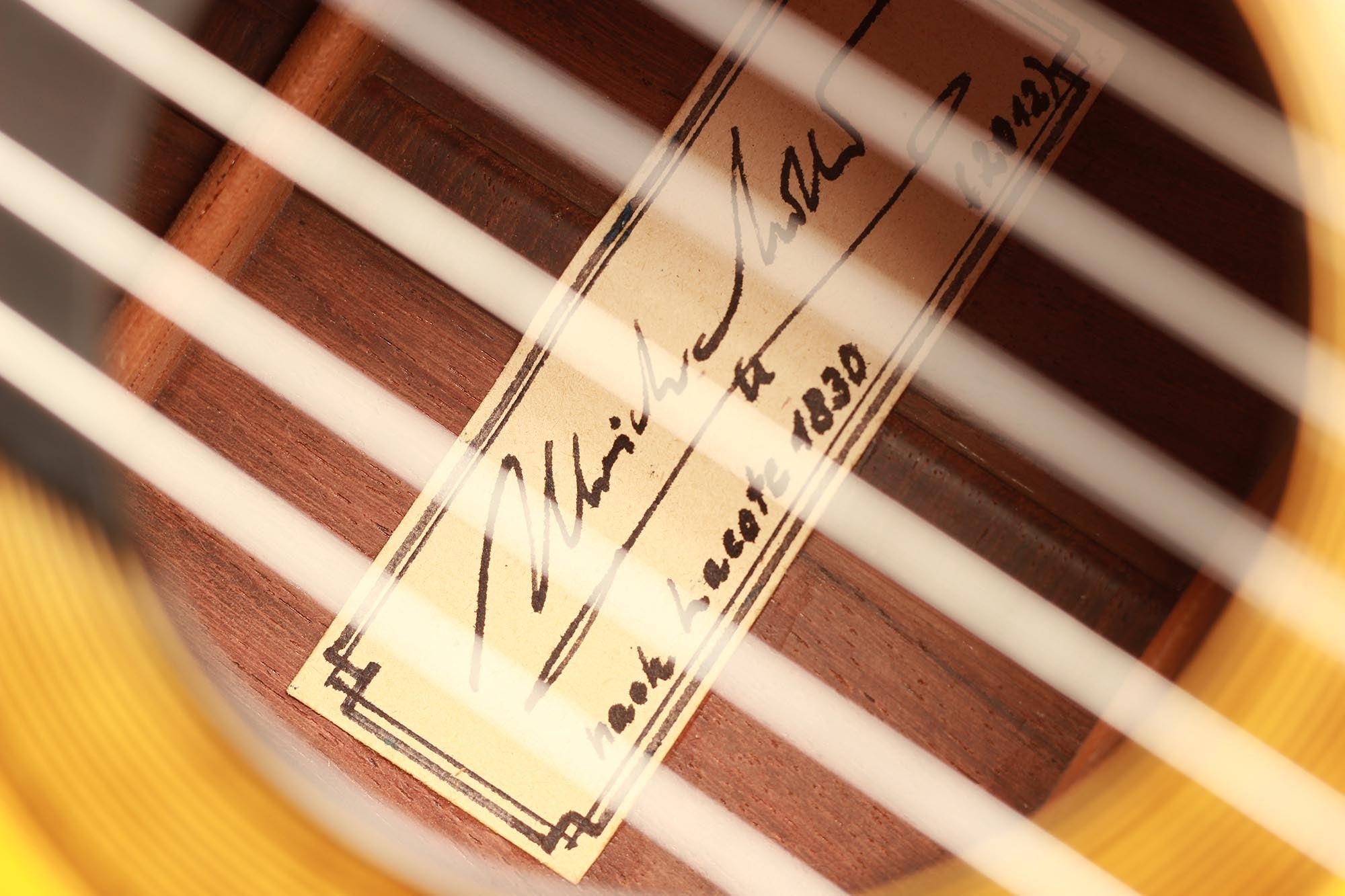 Was für ein schönes 1830er René Lacôte Modell des deutschen Gitarrenbauers Ulrich Müller. Diese sehr schöne romantische Gitarre hat einige ganz besondere Eigenschaften, die die dem modernen Gitarristen entgegenkommen. Zum Beispiel ist der Sattel 48 mm breit, was der normalen Größe der klassischen Gitarre sehr nahe kommt. Dies ist ein echter Segen für Gitarristen mit großen Händen, im Vergleich zu dem üblichen kleinen Saitenabstand der romantischen Gitarren. Nur wenige oberflächliche Spielspuren sind auf der Decke sichtbar. Abgesehen davon ist diese Gitarre in einem ausgezeichneten Zustand.