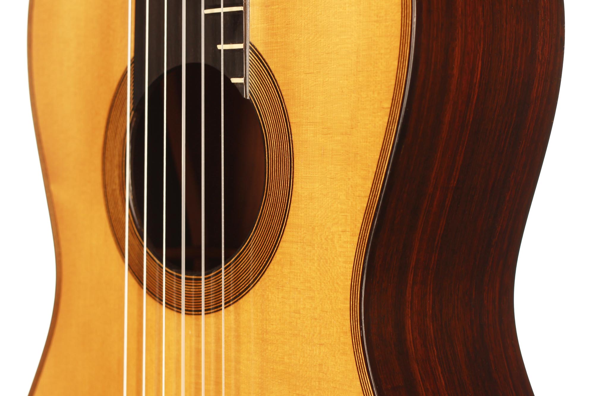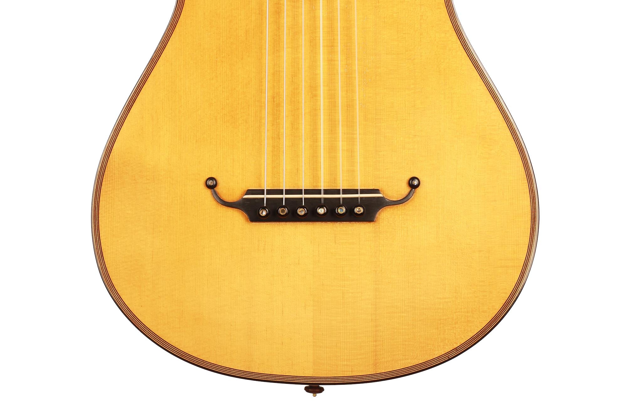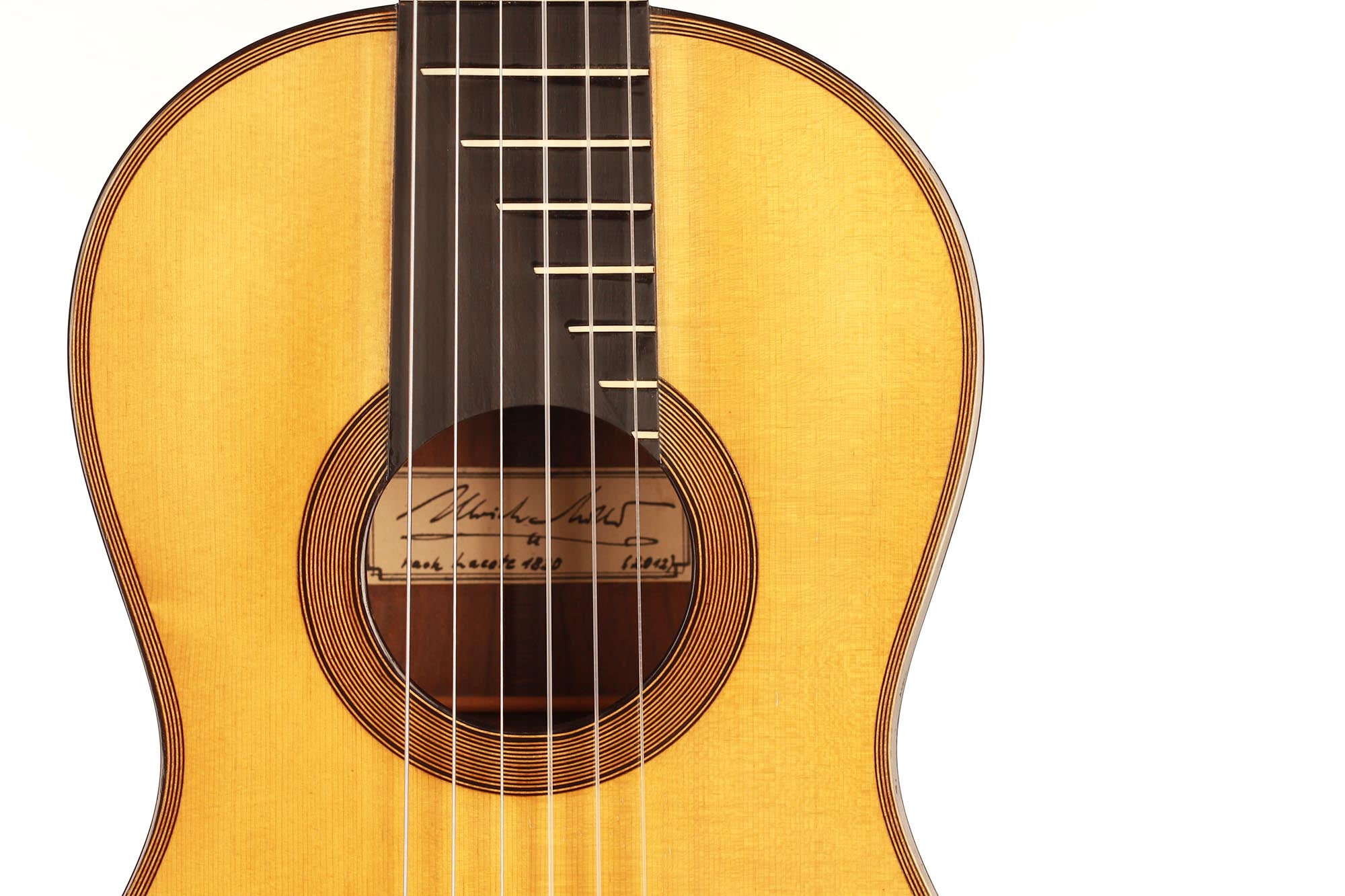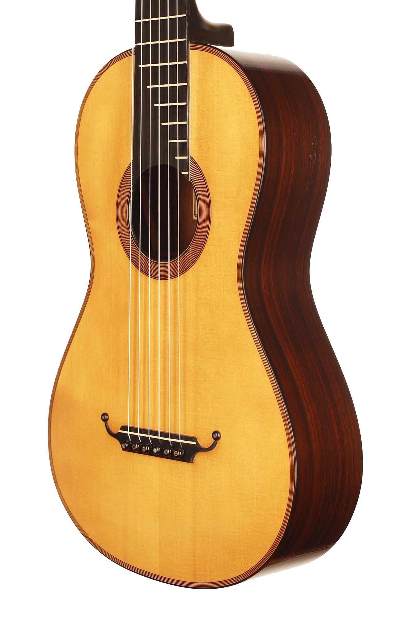 Der Klang ist wunderschön, sehr rein und elegant. Lacôte Replika Mechaniken von Alessi sorgen für eine Feinabstimmung und das Setup ist perfekt. Diese sehr leichte Gitarre wiegt weniger als ein Kilogramm. Die sehr schnelle Ansprache passt perfekt zu ihrem kristallinen und authentischen Klang. Dieses vielschichtige Instrument ist ideal für jeden Liebhaber der romantischen Epoche.