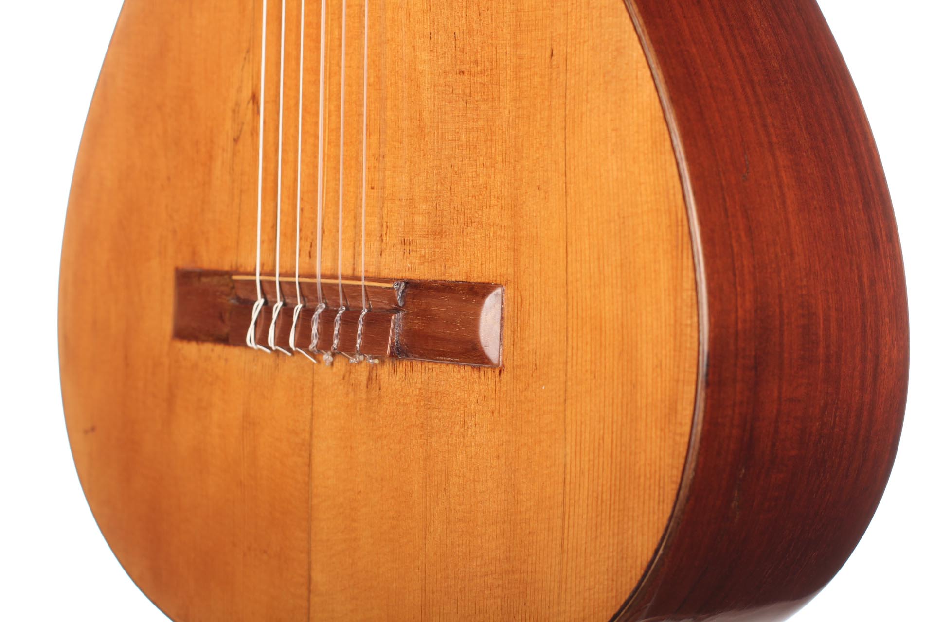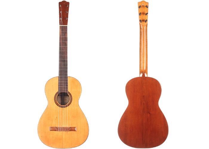 This instrument was built in 1874 and the overall condition is great for such an antique guitar! The pictures are showing faithfully the few repaired cracks on the top, the back, and the side patch. The guitar is now perfectly stable, set up and delightful to play.