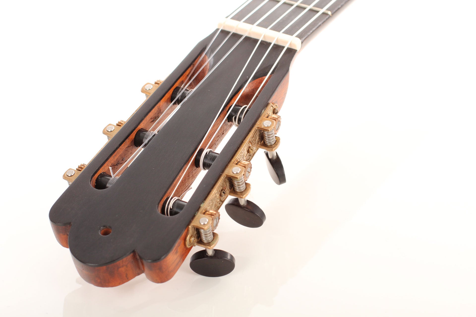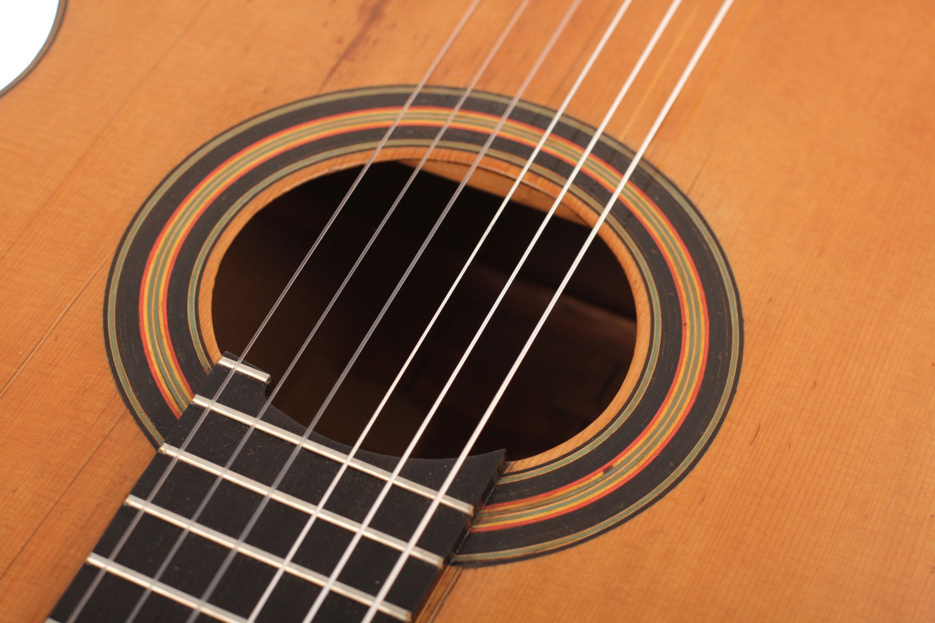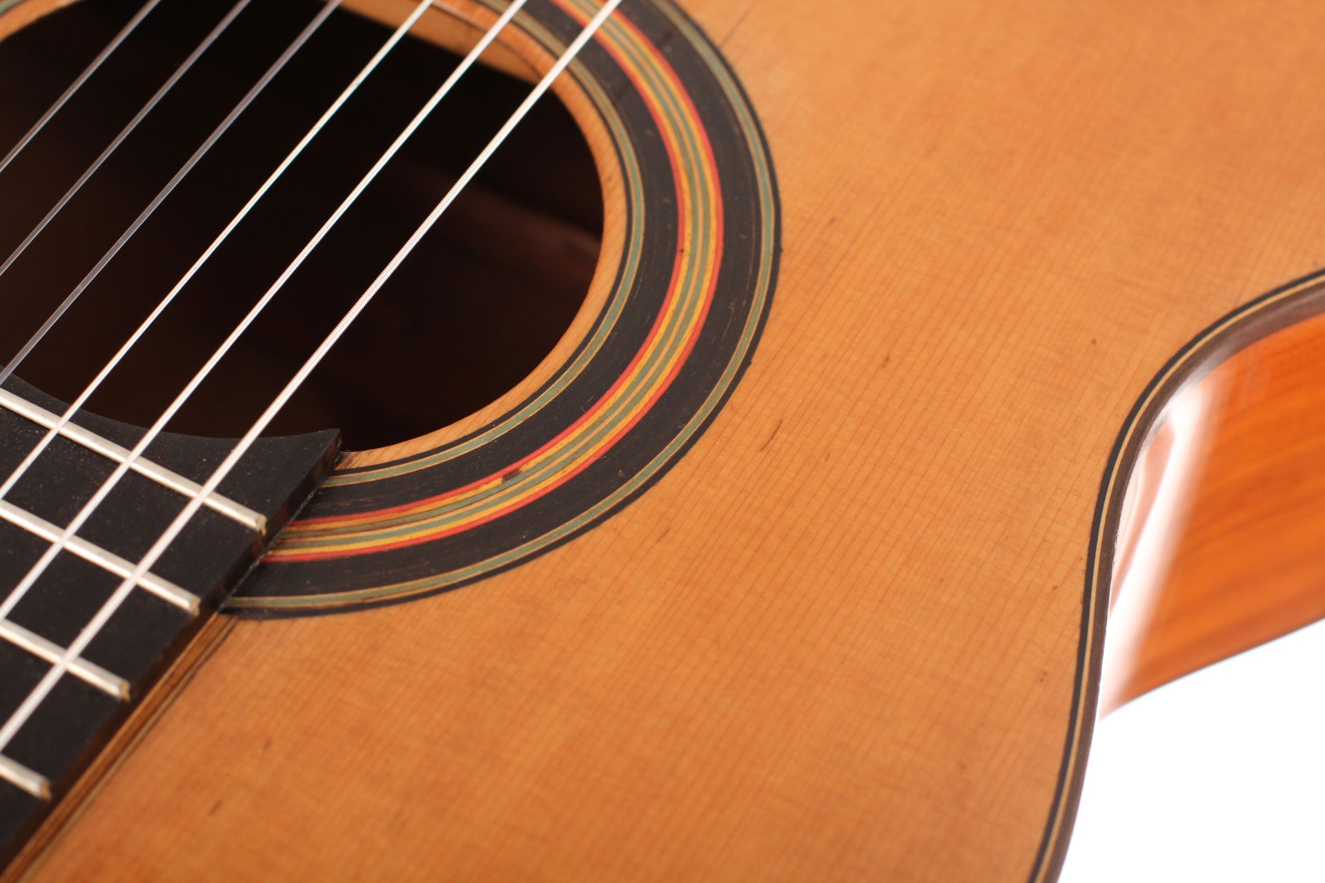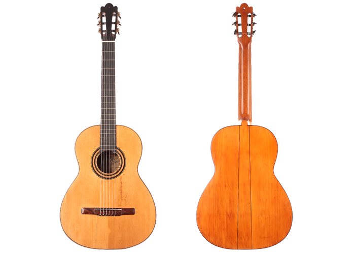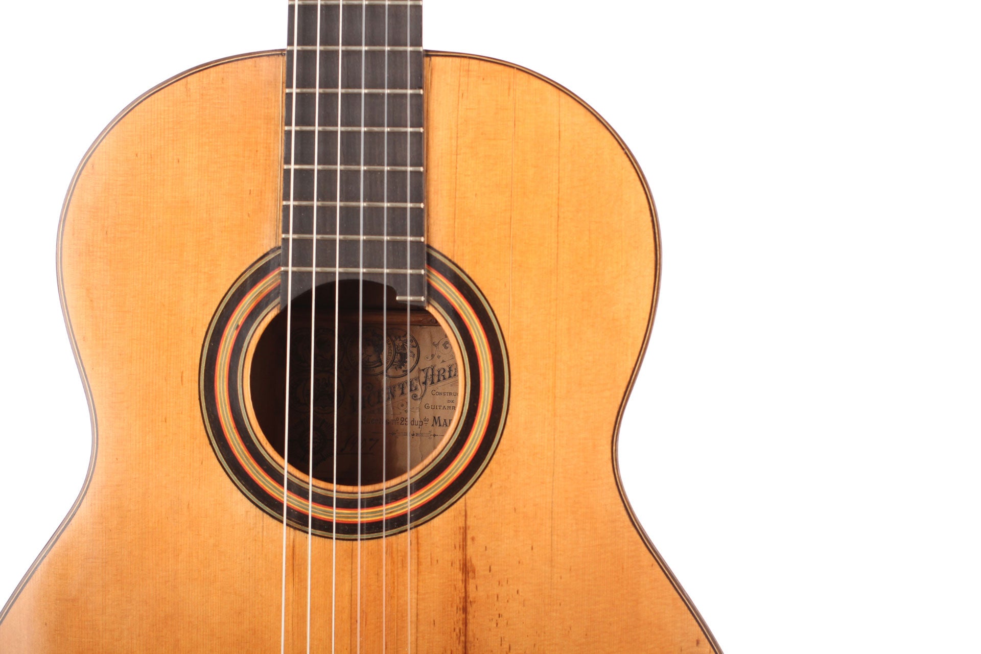 Vicente Arias (1833-1914) wurde in Ciudad Real, südlich von Madrid geboren. Wie auch Antonio de Torres war er ursprünglich ein Tischler, der autodidaktisch den Gitarrenbau erlernte. Wahrscheinlich begann er um 1860 Gitarren zu bauen. Während seiner Karriere gewann er viele bedeutende Preise rund um den Globus, wie z.B. in Buenos Aires, Madrid, Brüssel und Barcelona. Der wohl berühmteste Gitarrist, der seine Gitarren spielte, ist Francisco Tárrega. Diese hier vorgestellte Gitarre mit Fichtendecke wurde 1901 gebaut und befindet sich in einem für das Alter beeindruckend gutem Zustand. Diese Gitarre hat eine große Plantilla und einen Lippensteg, wie es seine großen Konzertgitarren hatten. Die Decke weißt kleinere Reparaturen auf, ist aber für das Alter von 115 Jahren in einem sehr gutem Zustand. Das Griffbrett und die Bünde sind original. The dünne Kopfplatte aus Ebenholz wurde ersetzt wie auch die Mechaniken, die nun von Sloane sind. Insgesamt ist diese Gitarre ist ein wunderbares Instrument. Es macht große Freude all die vielen Klangfarben zu entdecken und bietet dem Spieler großartige Möglichkeiten sich künstlerisch auszuleben. Ein Hartschalenkoffer ist inklusive.