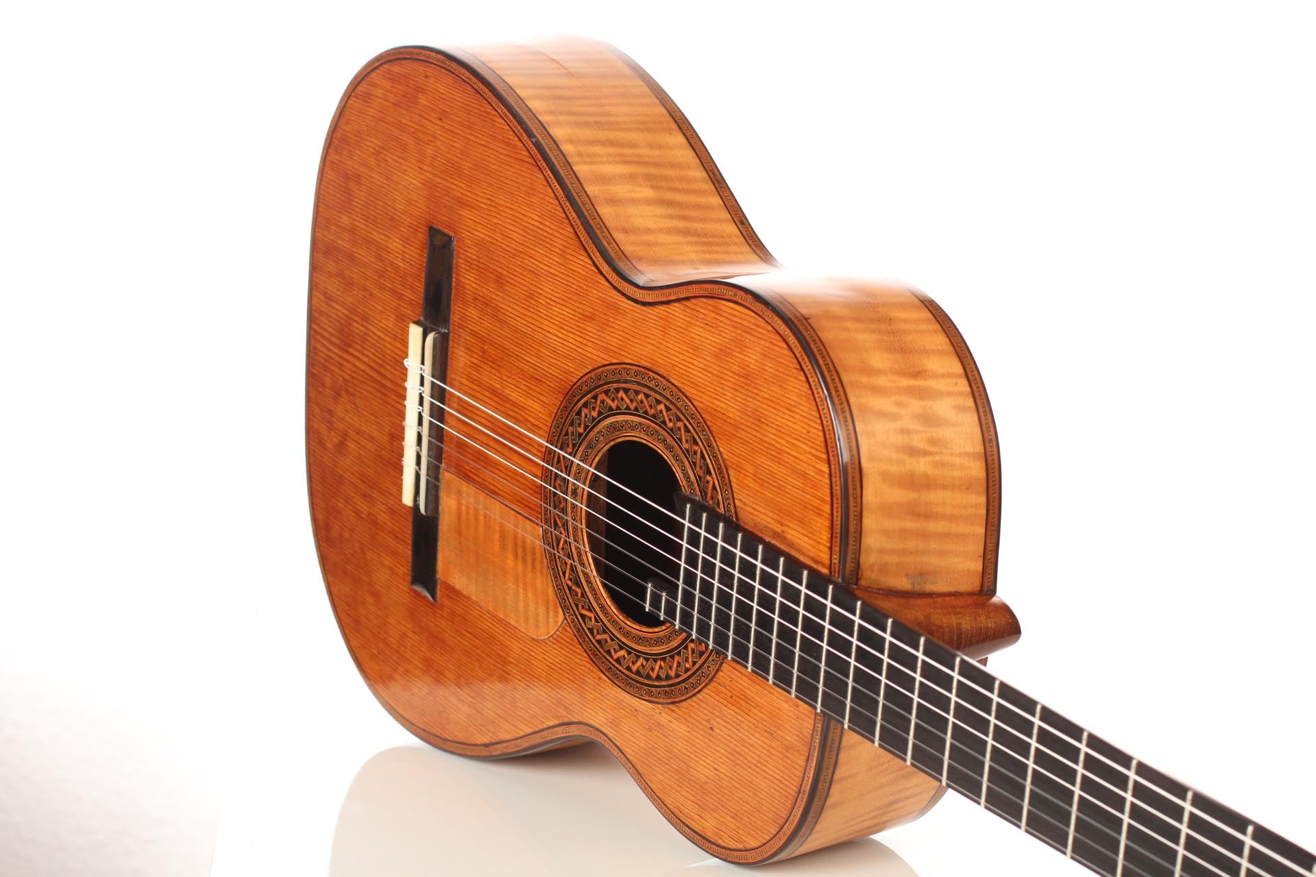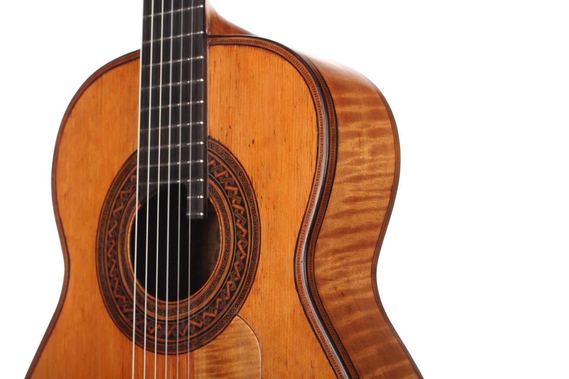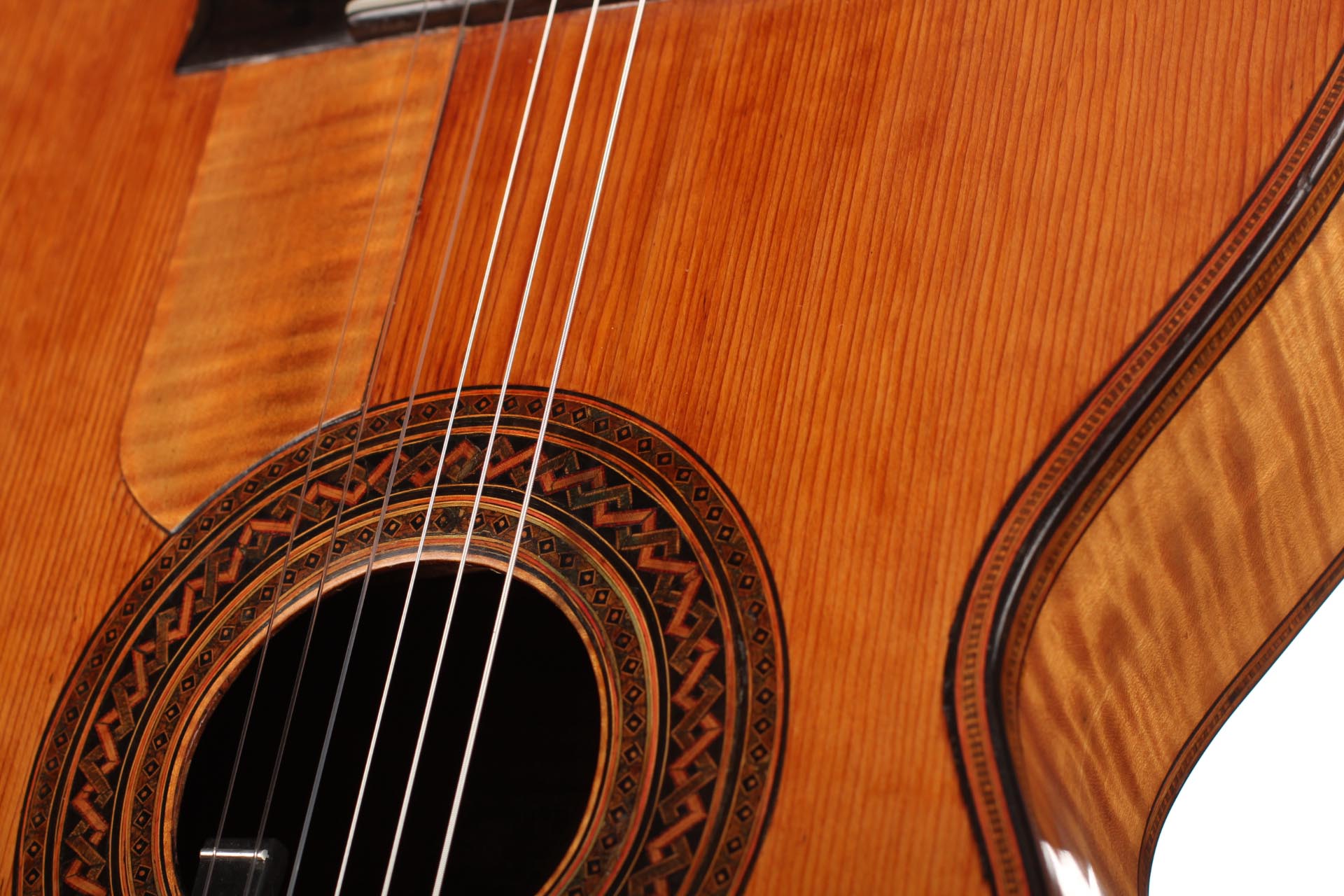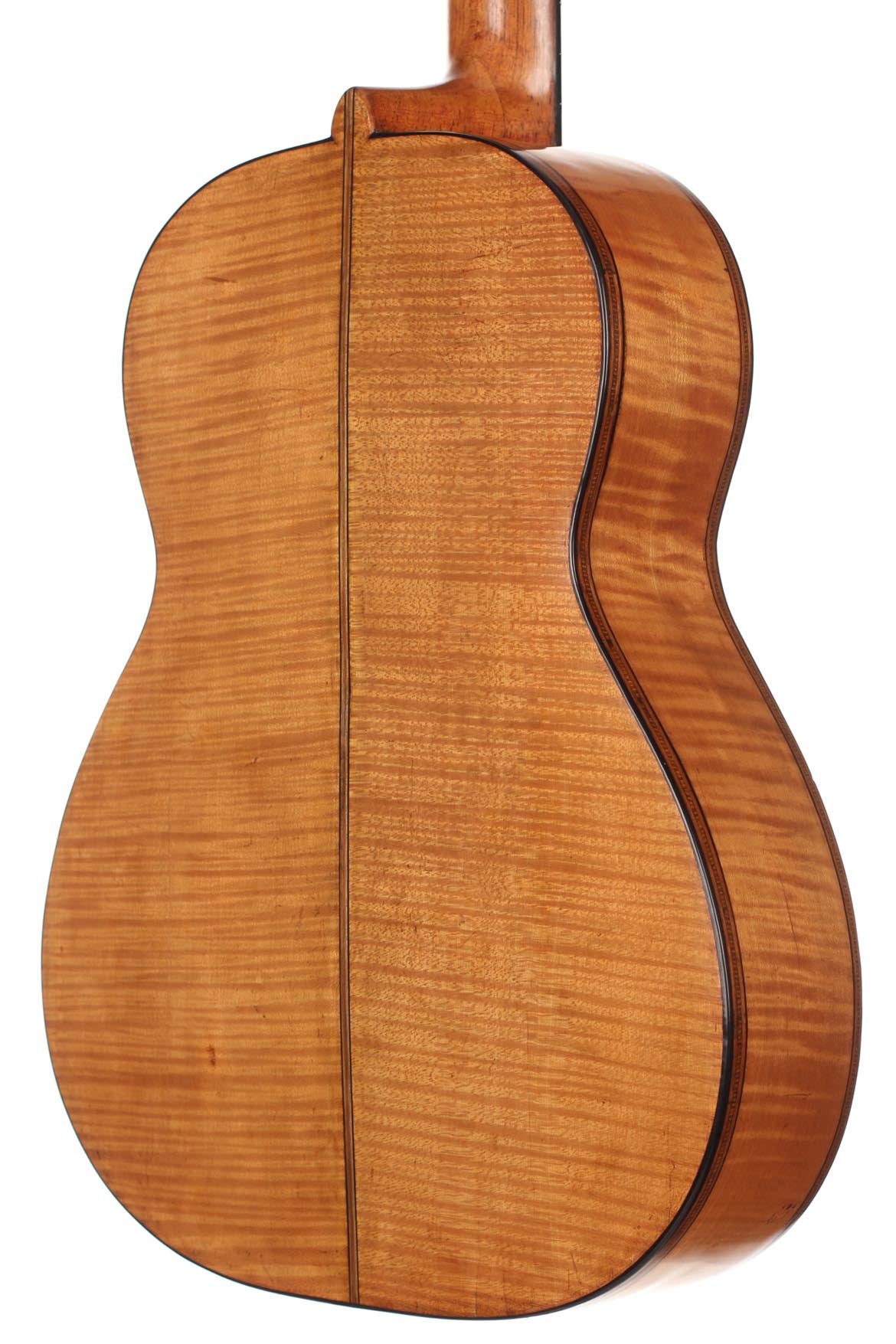 Dieses Instrument wurde 1913 gebaut und ist reichlich dekoriert. Es handelt sich um ein großes Konzert-Model mit Boden und Zargen aus sehr schönem geflammten Ahorn. Ein interessantes Merkmal diese Gitarre ist der originale Ahorn-Schlagschutz (Golpeador) auf der Decke. Die Gitarre ist sehr gut abgestimmt und wunderbar zu spielen. Das Klangbild ist sehr ausgewogen. Diese Arias verfügt über einen sehr vielfältigen und verlockenden Klang, einen reichhaltigen Diskant und schöne tiefe Bässe. Ein Hartschalenkoffer ist inklusive.