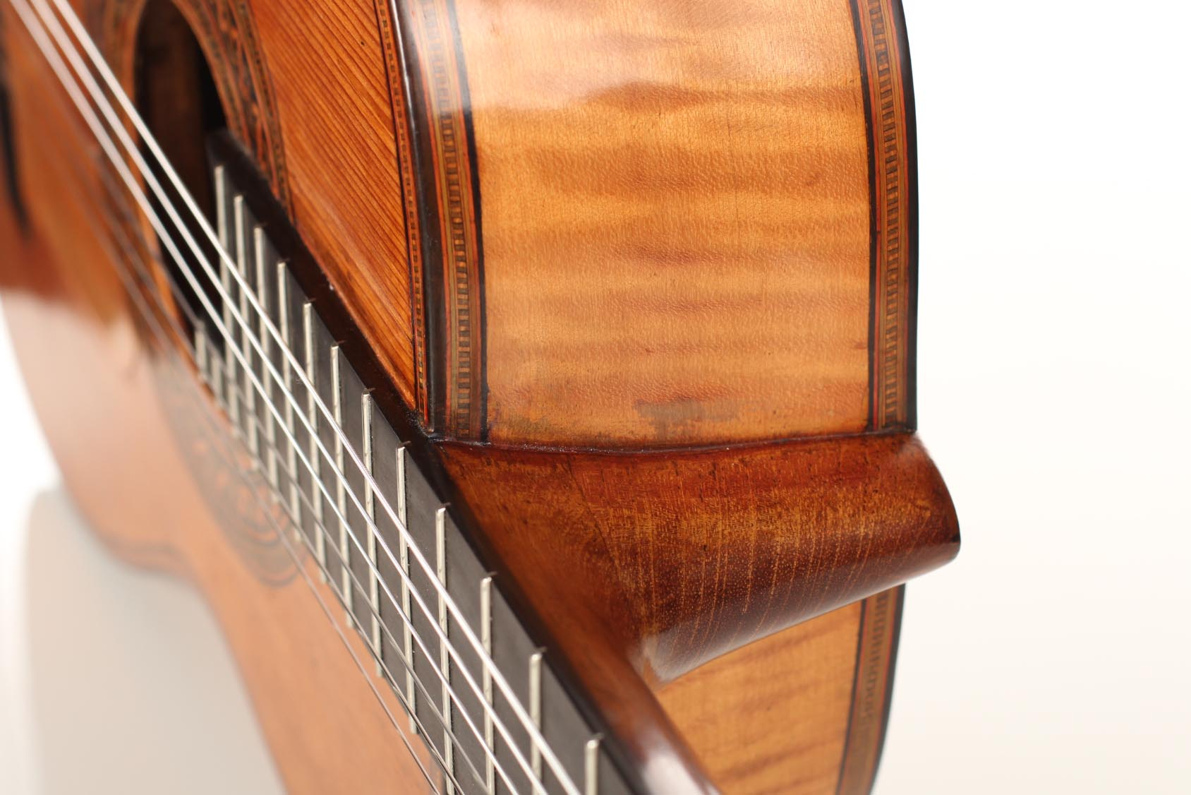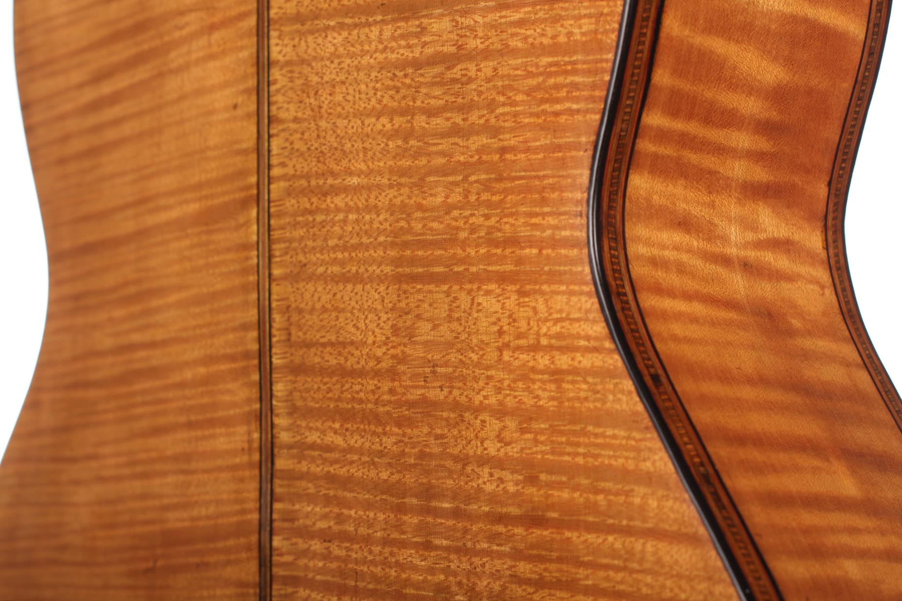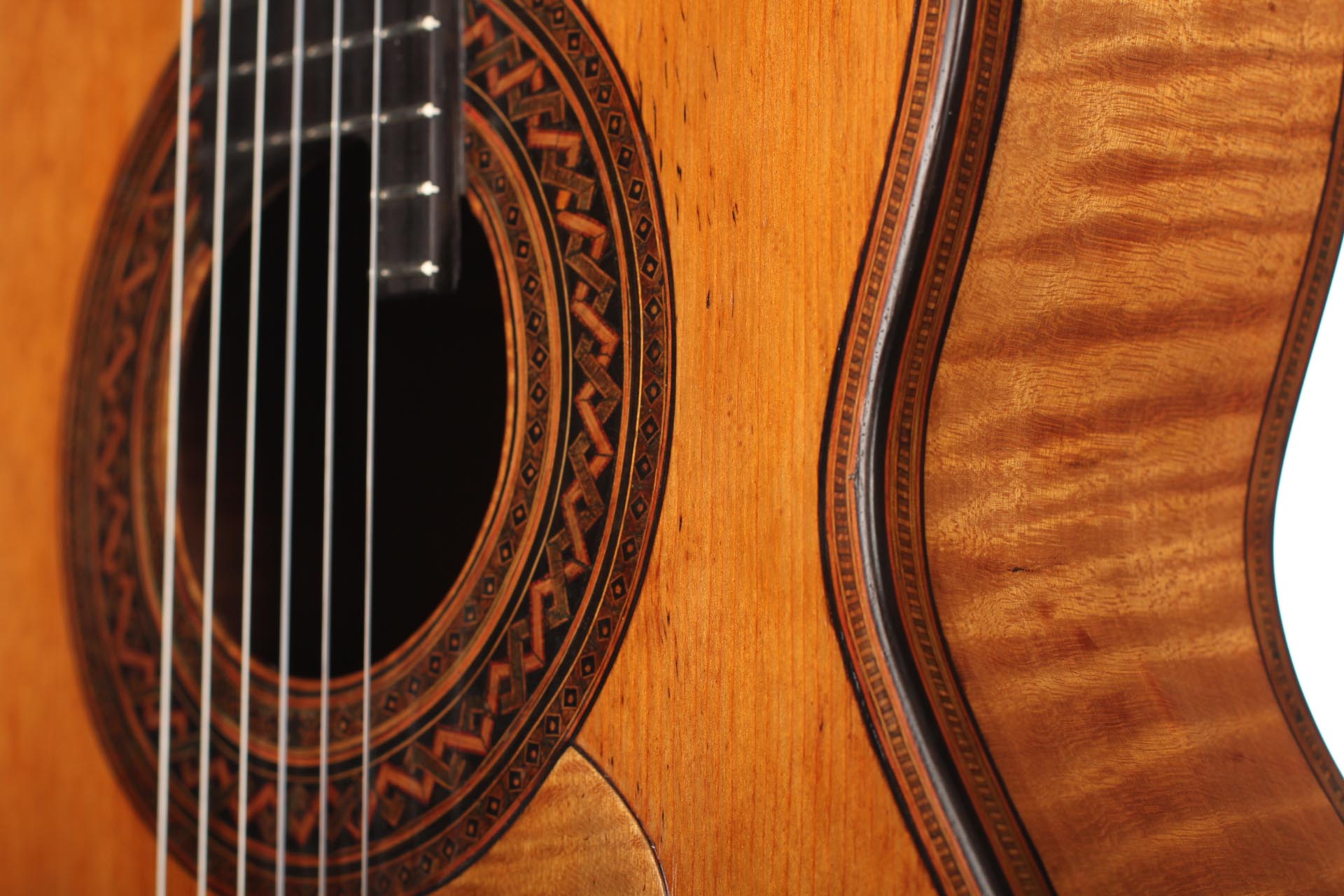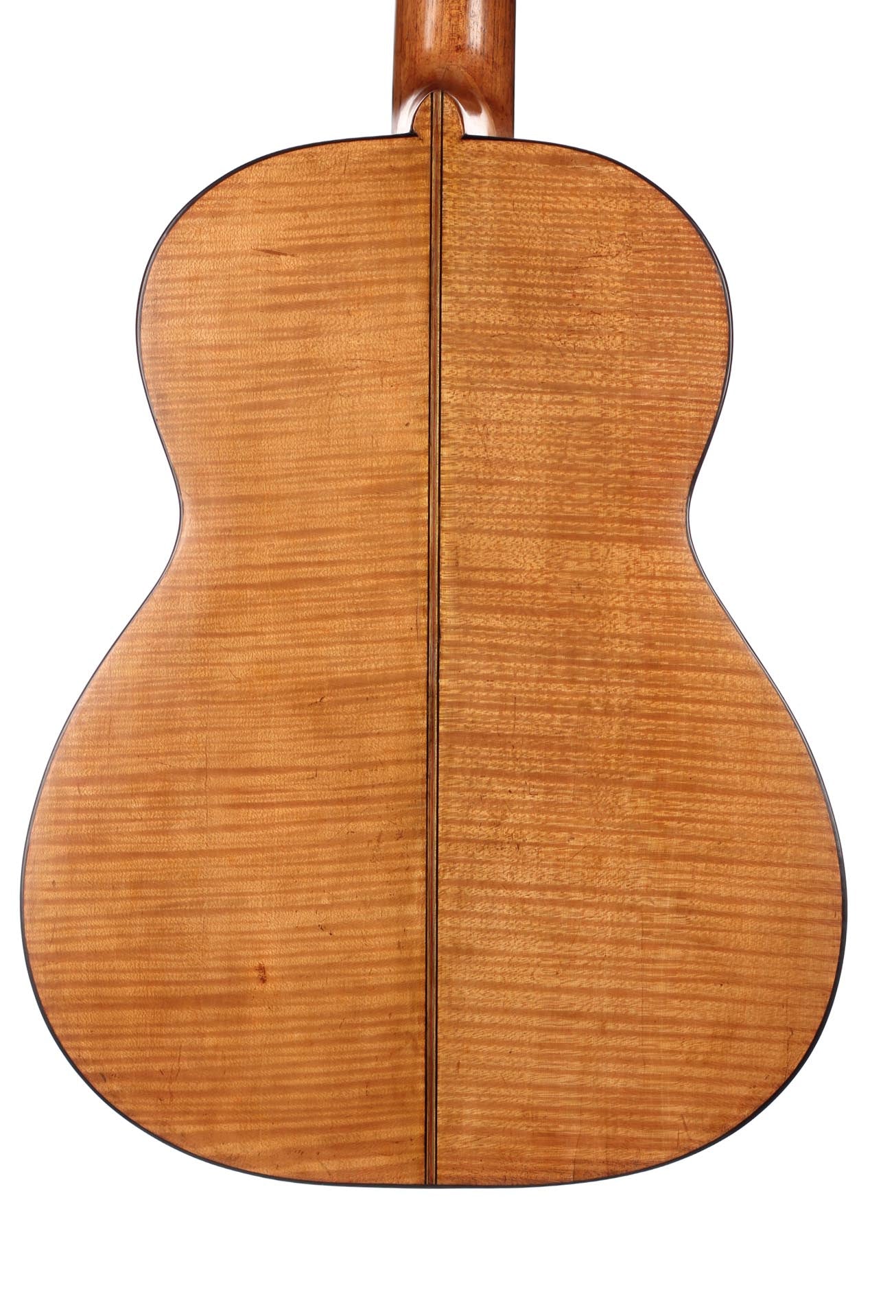Dieses Instrument wurde 1913 gebaut und ist reichlich dekoriert. Es handelt sich um ein großes Konzert-Model mit Boden und Zargen aus sehr schönem geflammten Ahorn. Ein interessantes Merkmal diese Gitarre ist der originale Ahorn-Schlagschutz (Golpeador) auf der Decke. Die Gitarre ist sehr gut abgestimmt und wunderbar zu spielen. Das Klangbild ist sehr ausgewogen. Diese Arias verfügt über einen sehr vielfältigen und verlockenden Klang, einen reichhaltigen Diskant und schöne tiefe Bässe. Ein Hartschalenkoffer ist inklusive.