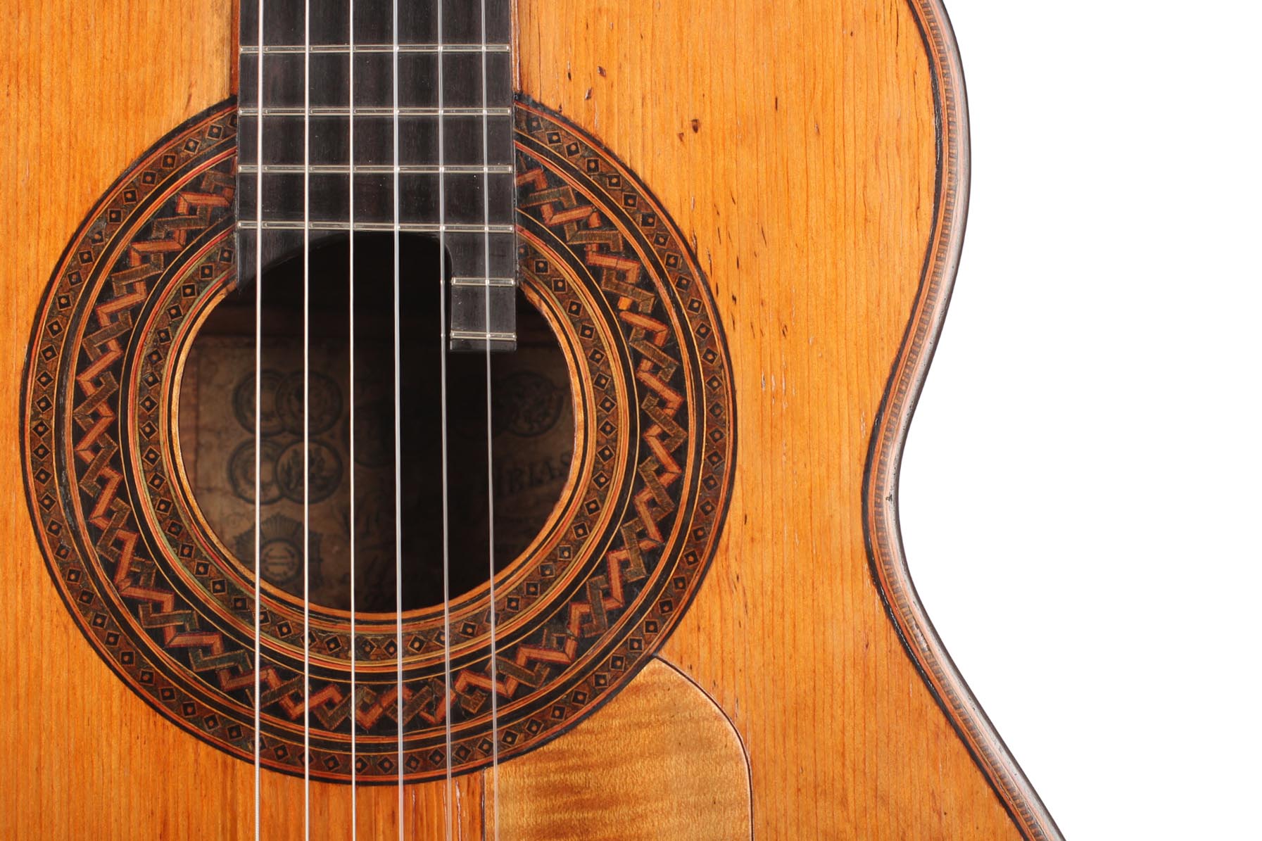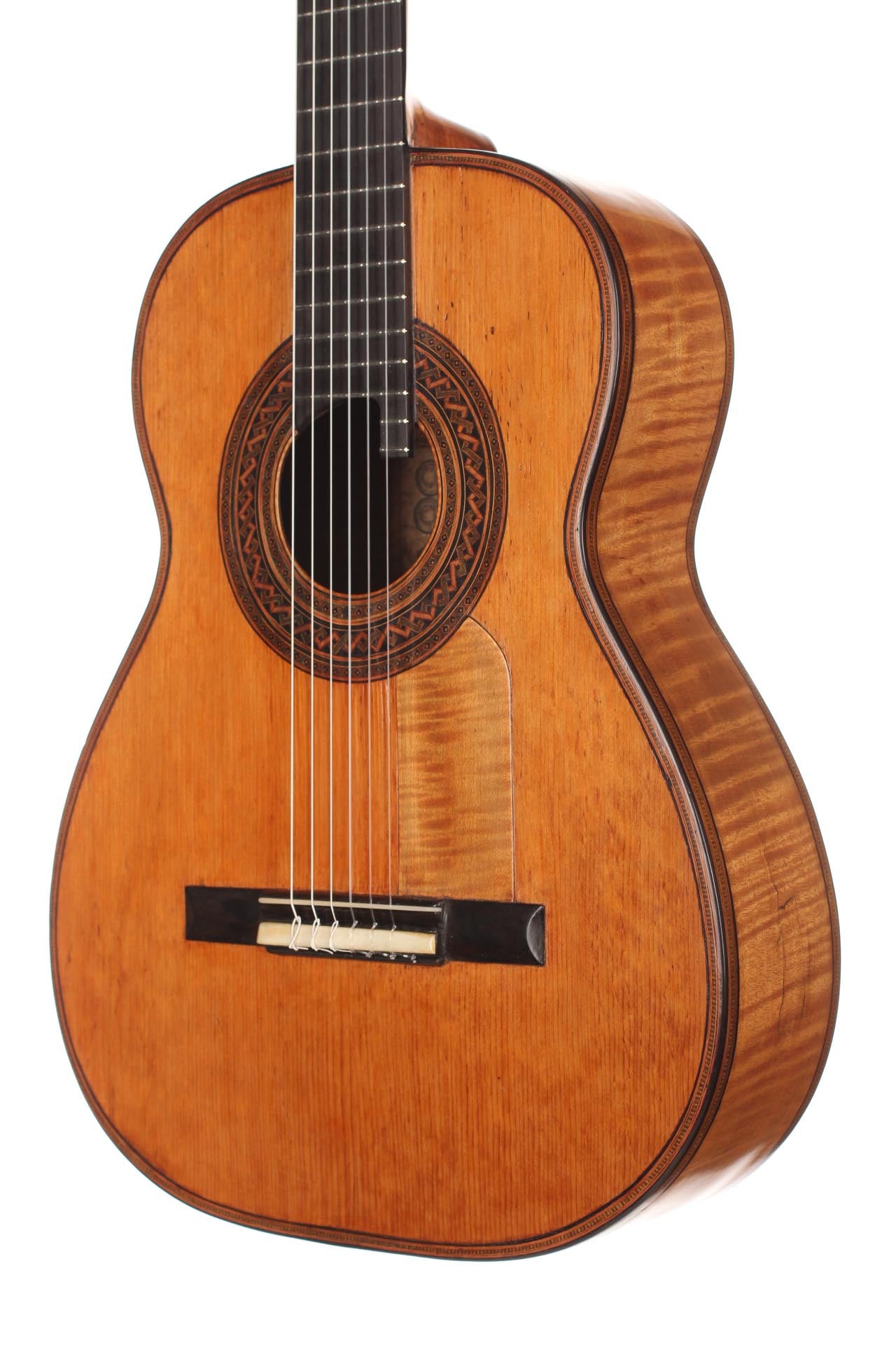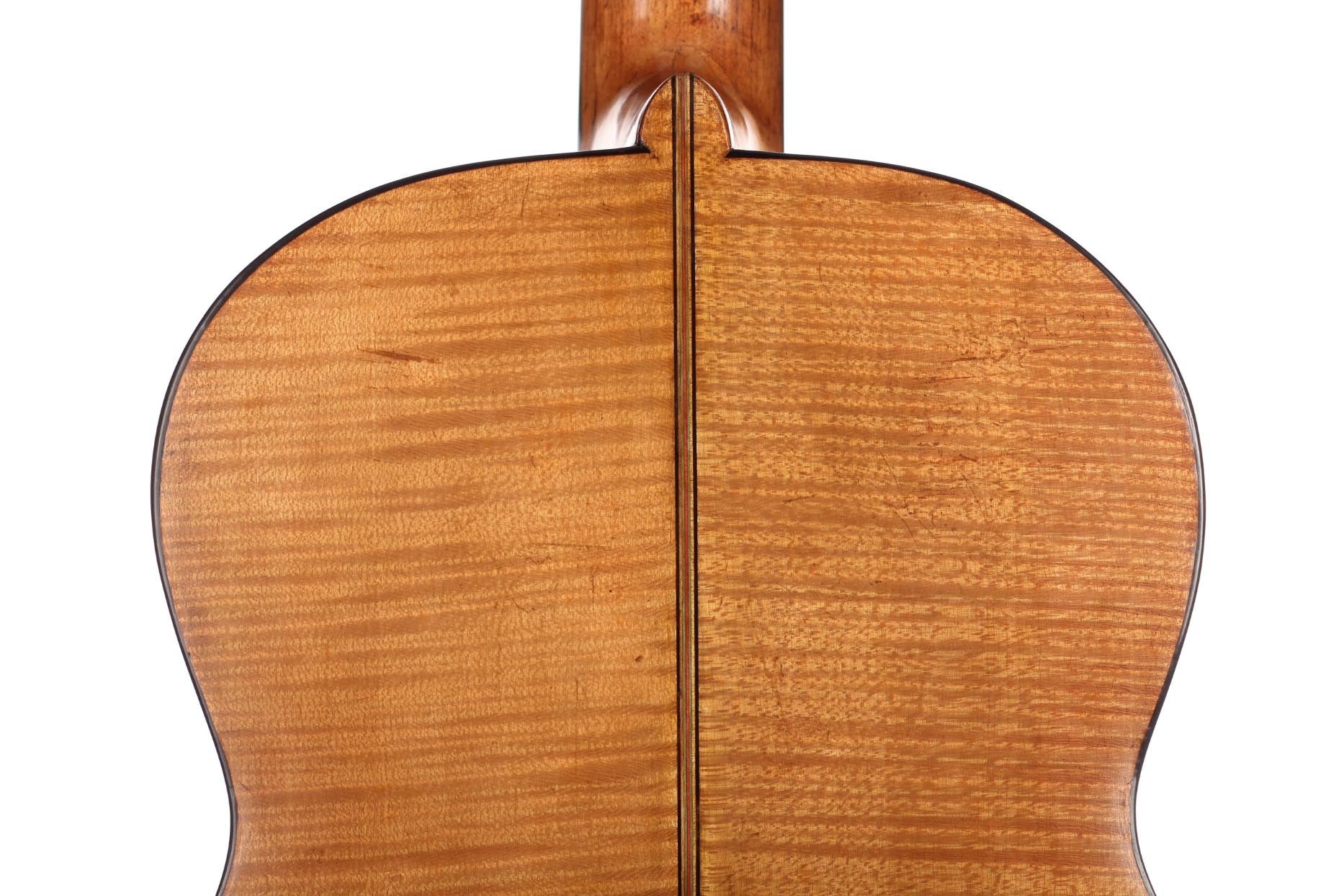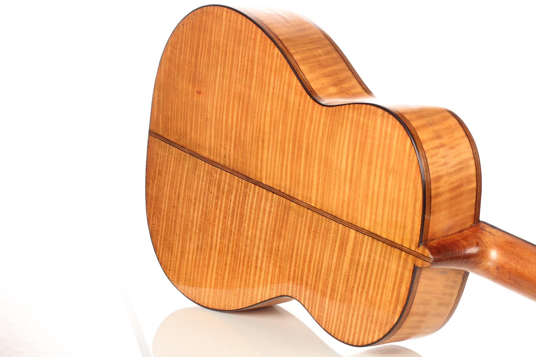 Dieses Instrument wurde 1913 gebaut und ist reichlich dekoriert. Es handelt sich um ein großes Konzert-Model mit Boden und Zargen aus sehr schönem geflammten Ahorn. Ein interessantes Merkmal diese Gitarre ist der originale Ahorn-Schlagschutz (Golpeador) auf der Decke. Die Gitarre ist sehr gut abgestimmt und wunderbar zu spielen. Das Klangbild ist sehr ausgewogen. Diese Arias verfügt über einen sehr vielfältigen und verlockenden Klang, einen reichhaltigen Diskant und schöne tiefe Bässe. Ein Hartschalenkoffer ist inklusive.